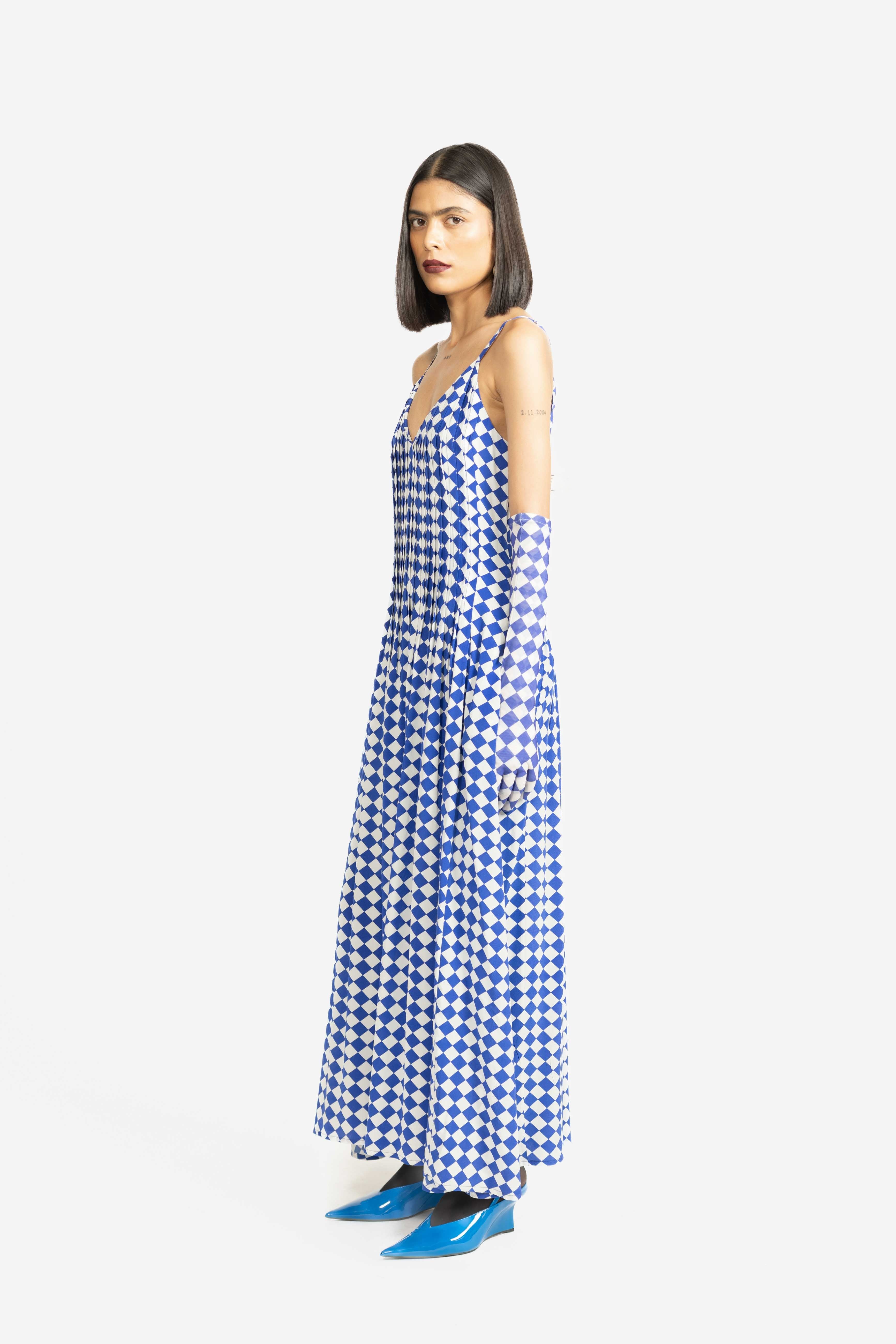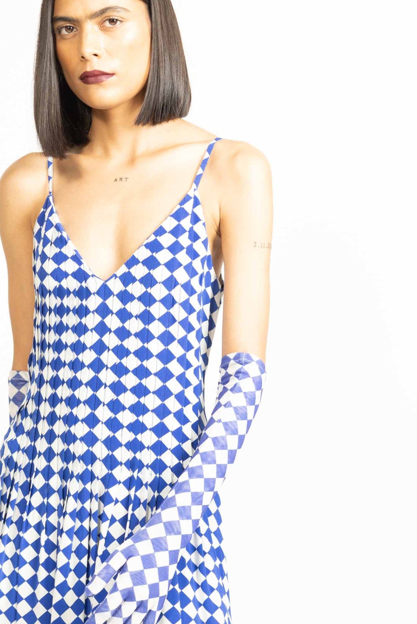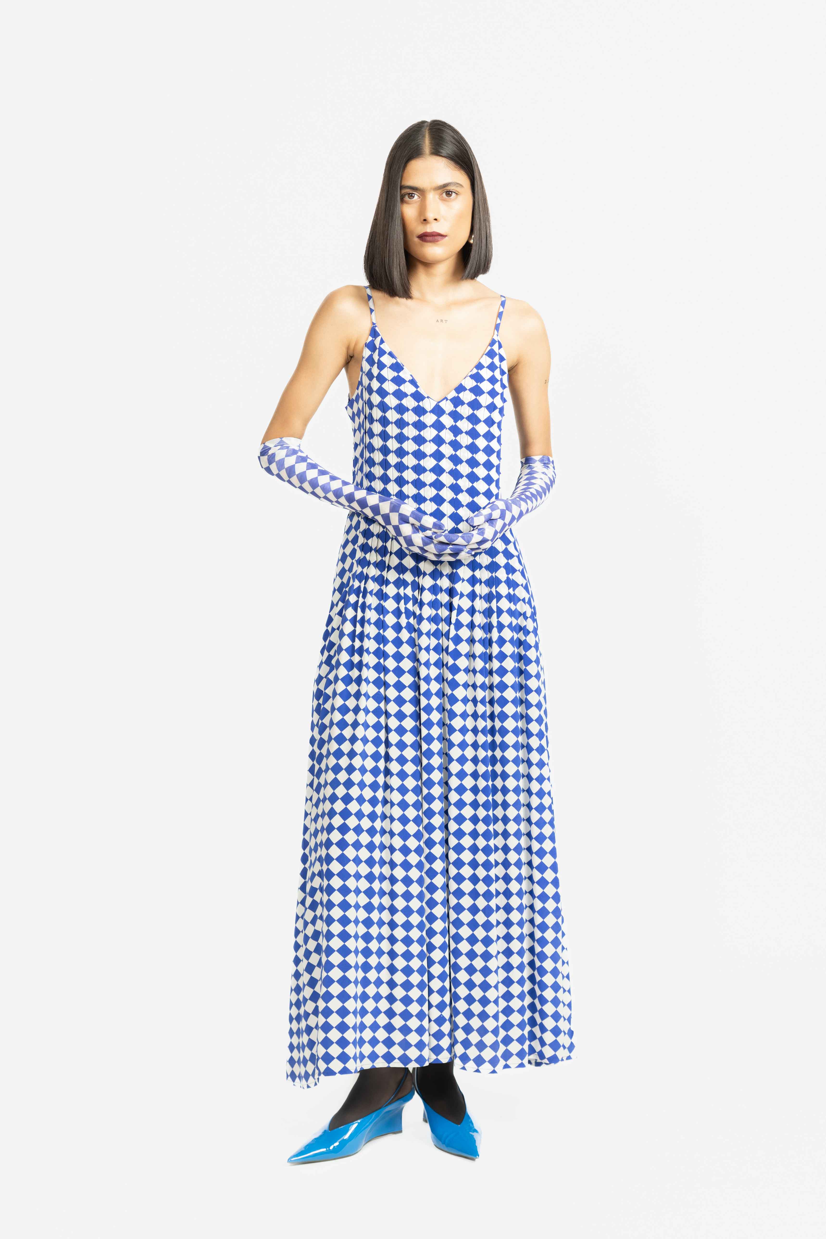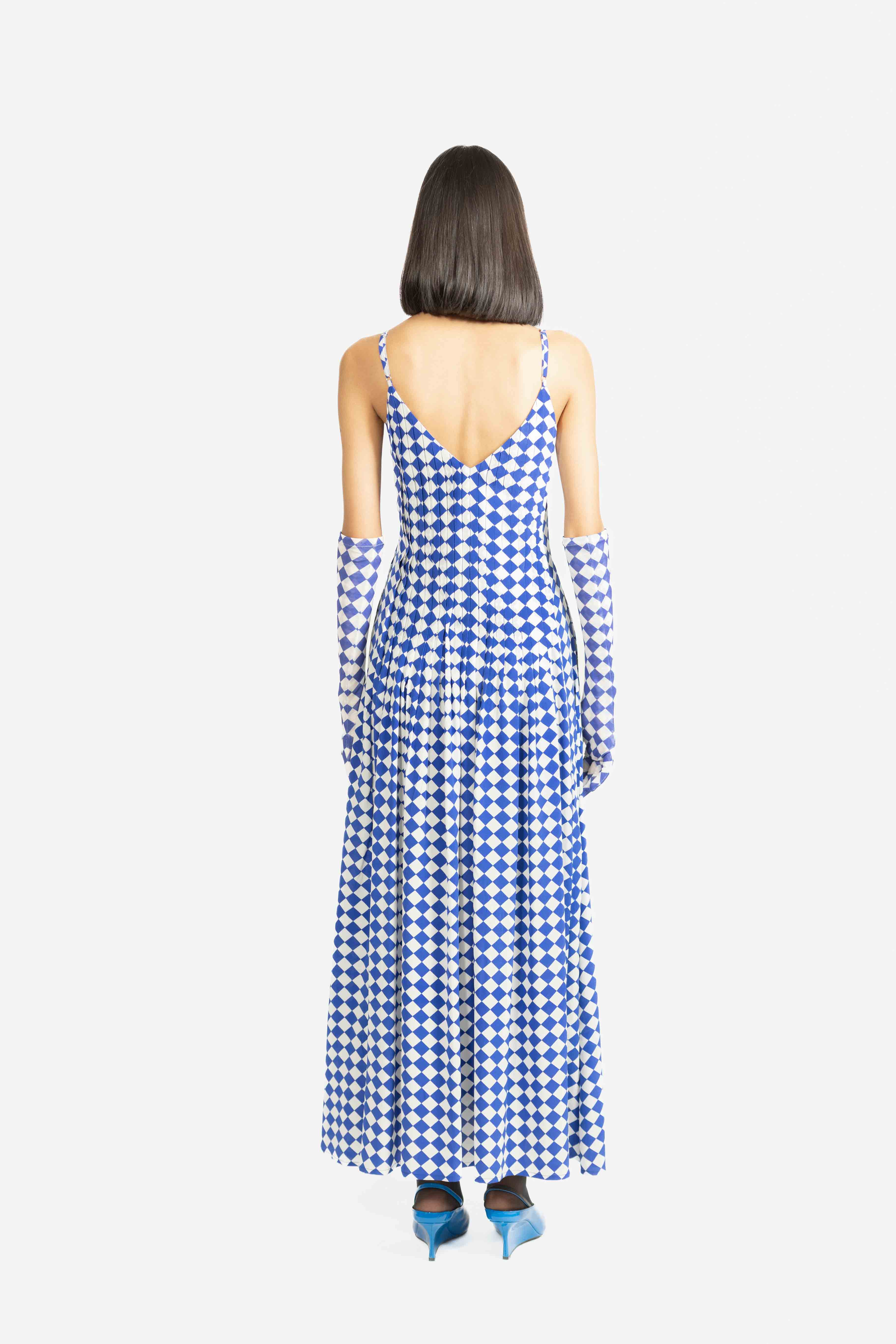 A checkerboard strappy dress designed with a flattering flared silhouette.