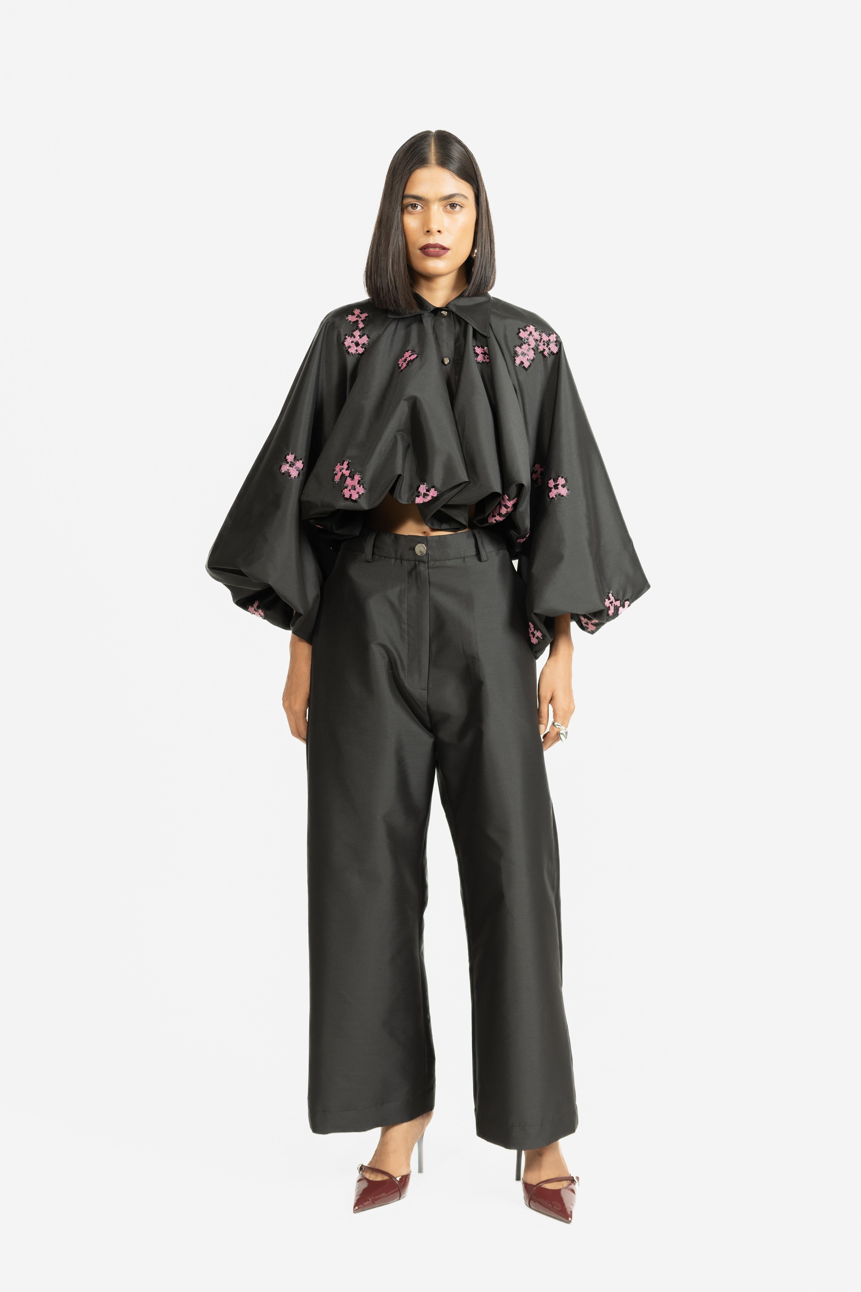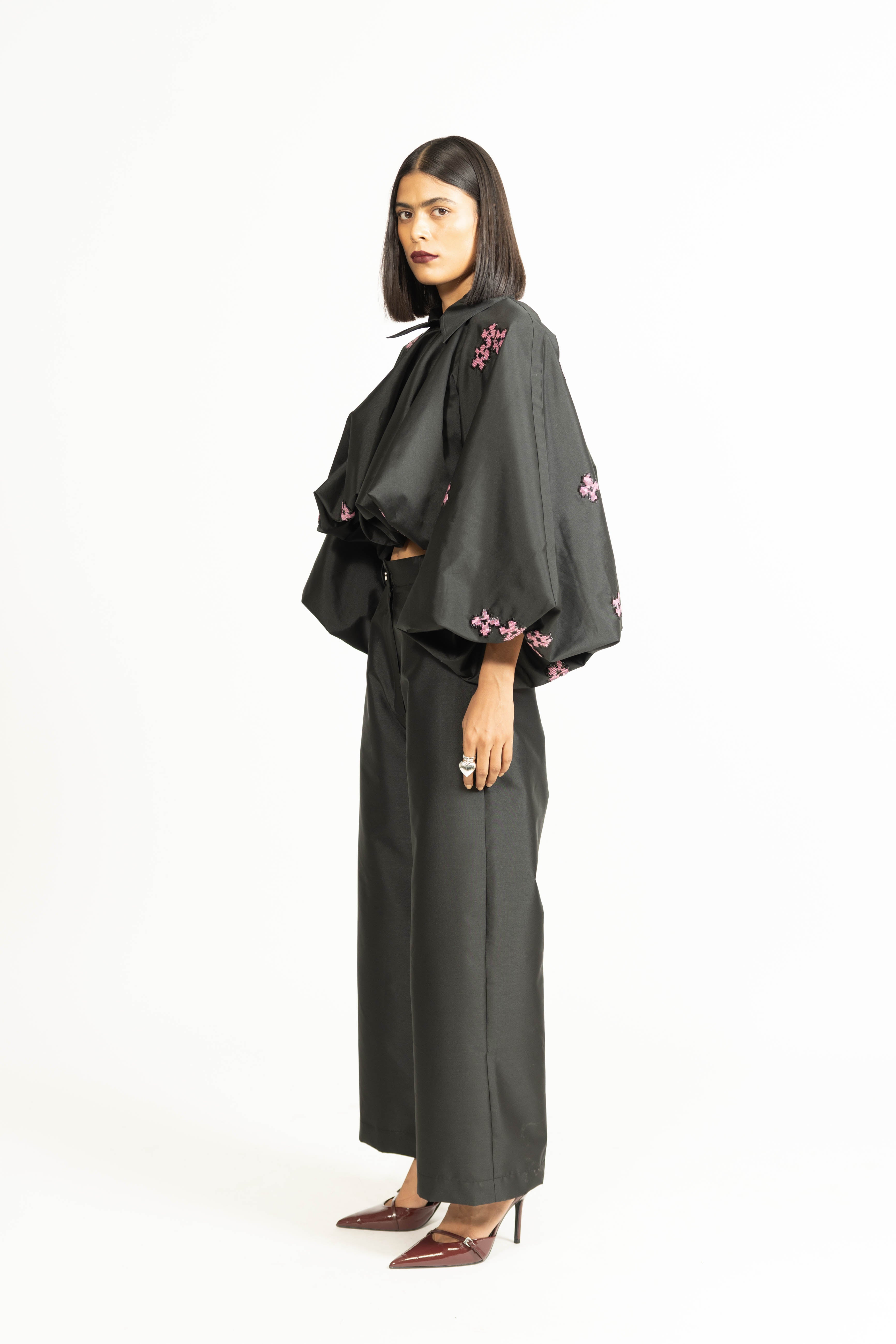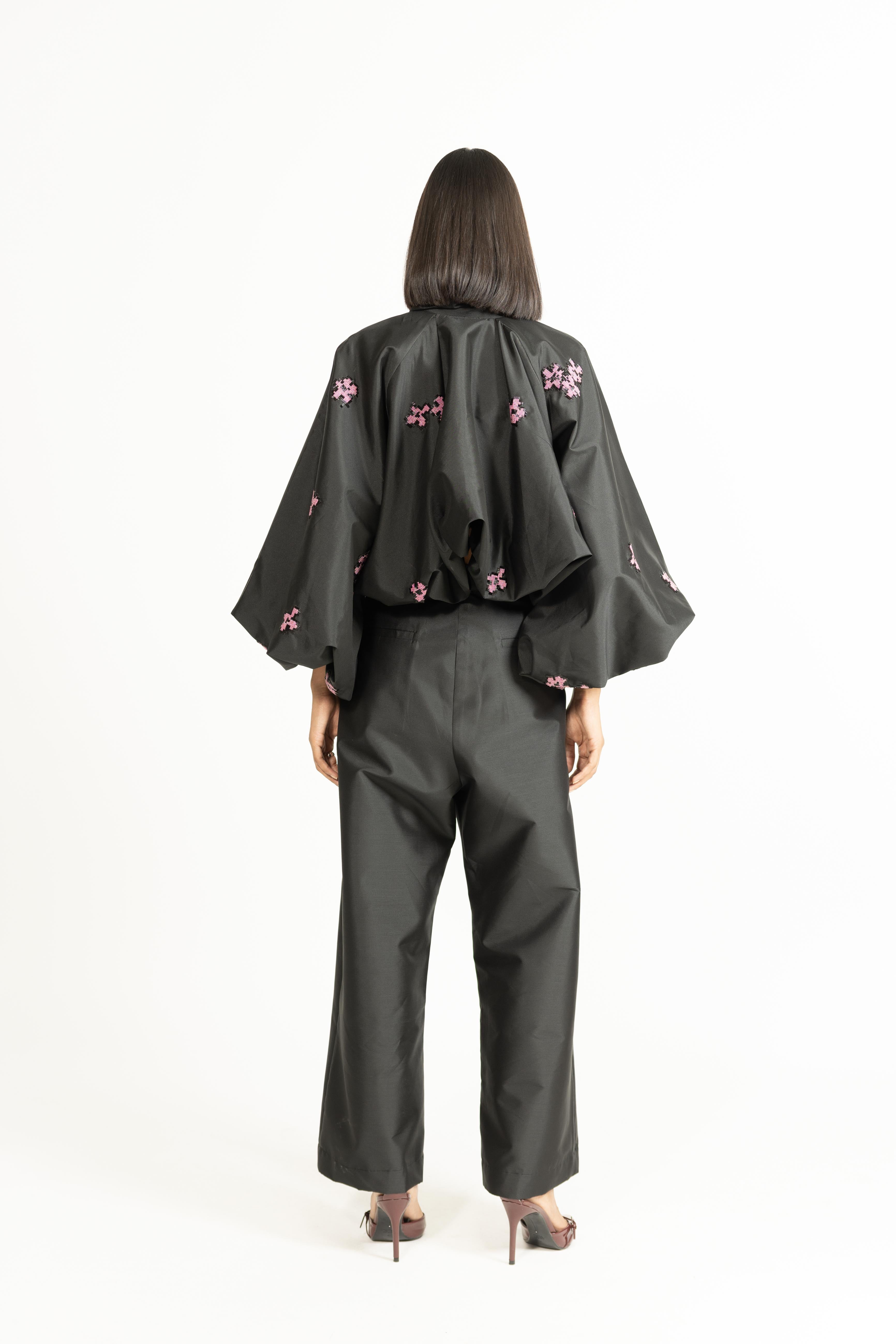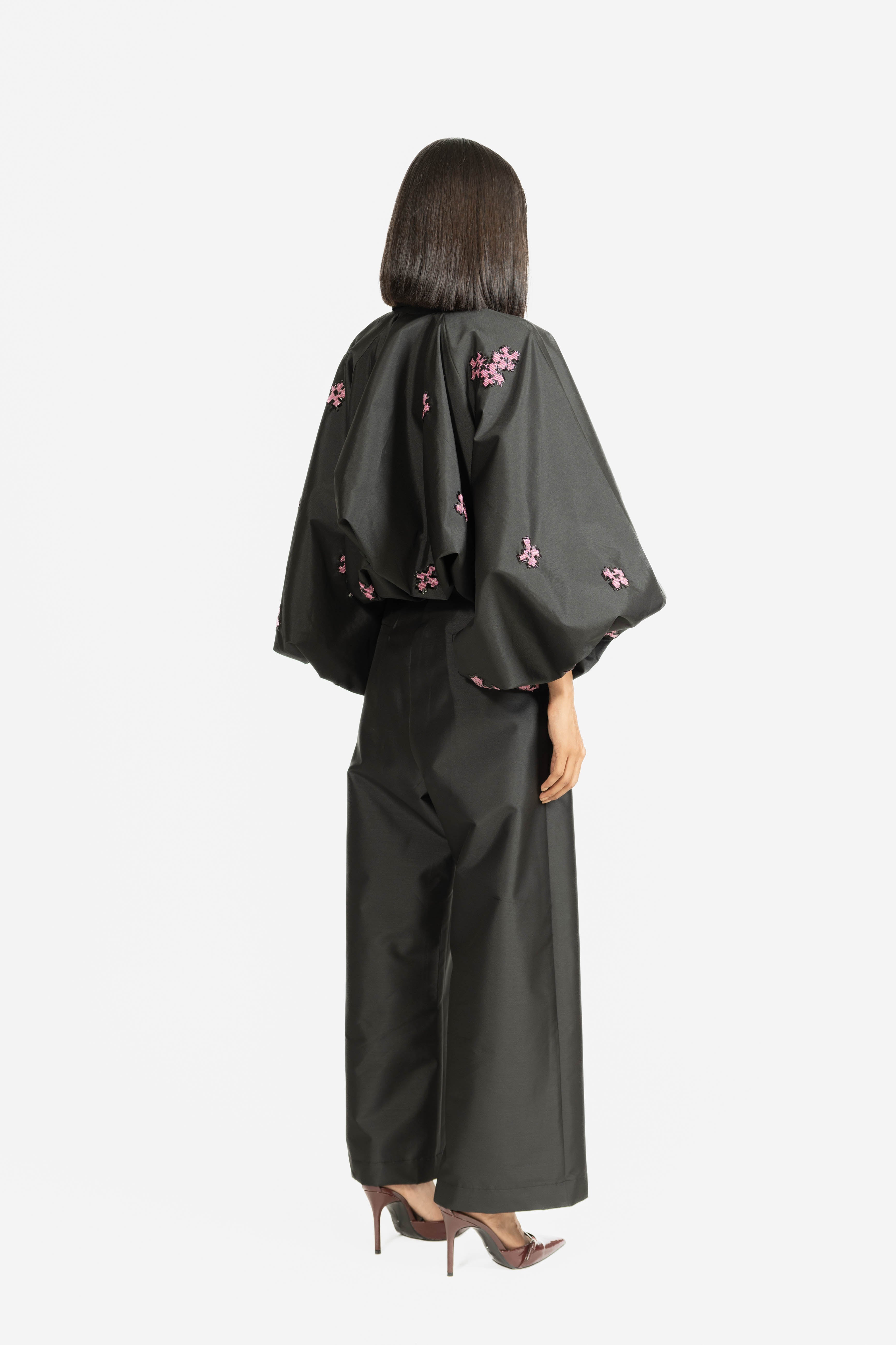 This balloon jacket, adorned with embroidery, brings a whimsical and feminine touch to outerwear. The voluminous silhouette adds drama and a romantic edge, while the adjustable tie at the hem offers customizable styling for added versatility. Perfect as a statement layer, it effortlessly combines sparkle, style, and personality.