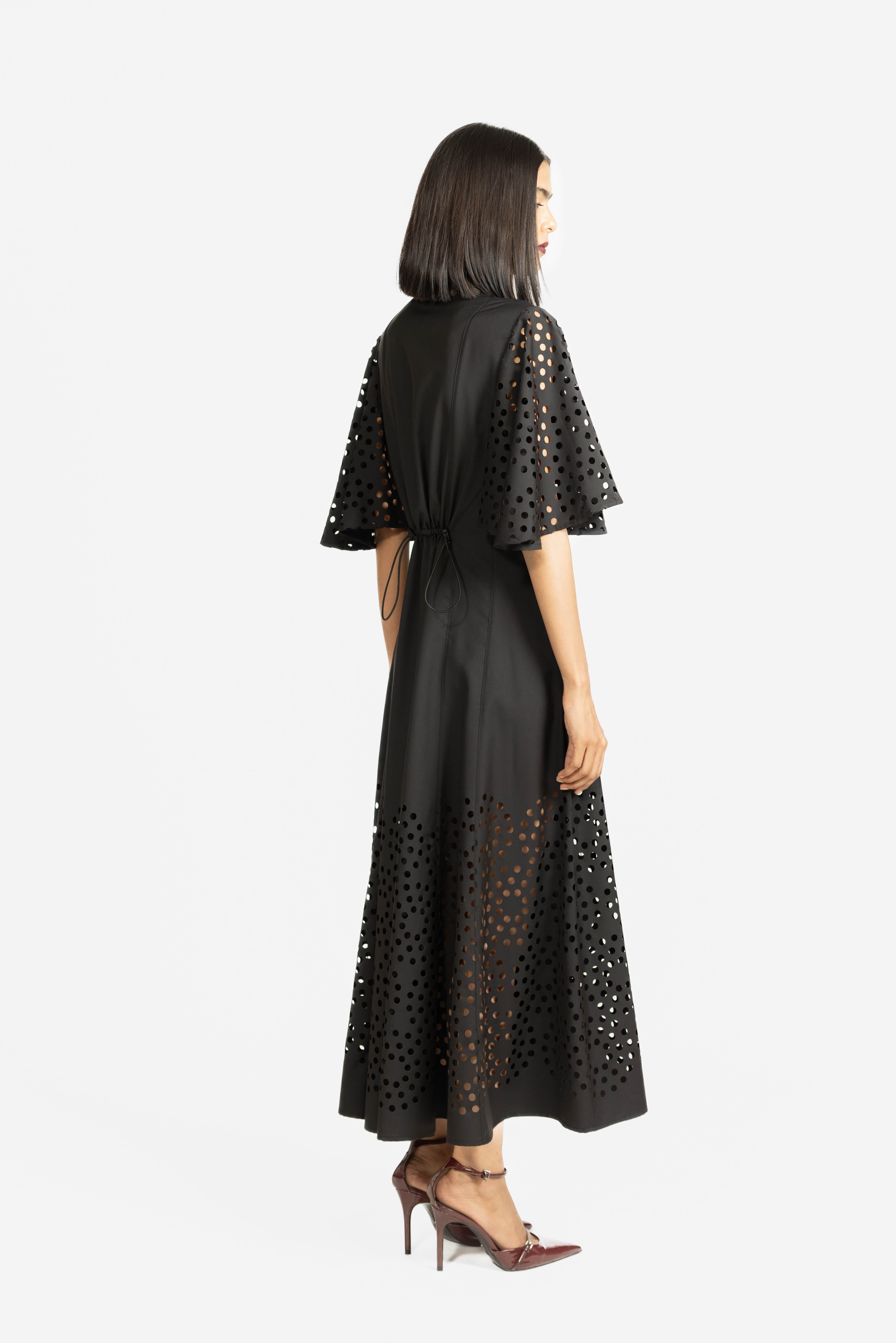 A striking shirt dress featuring intricate laser-cut detailing and dramatic flare sleeves.