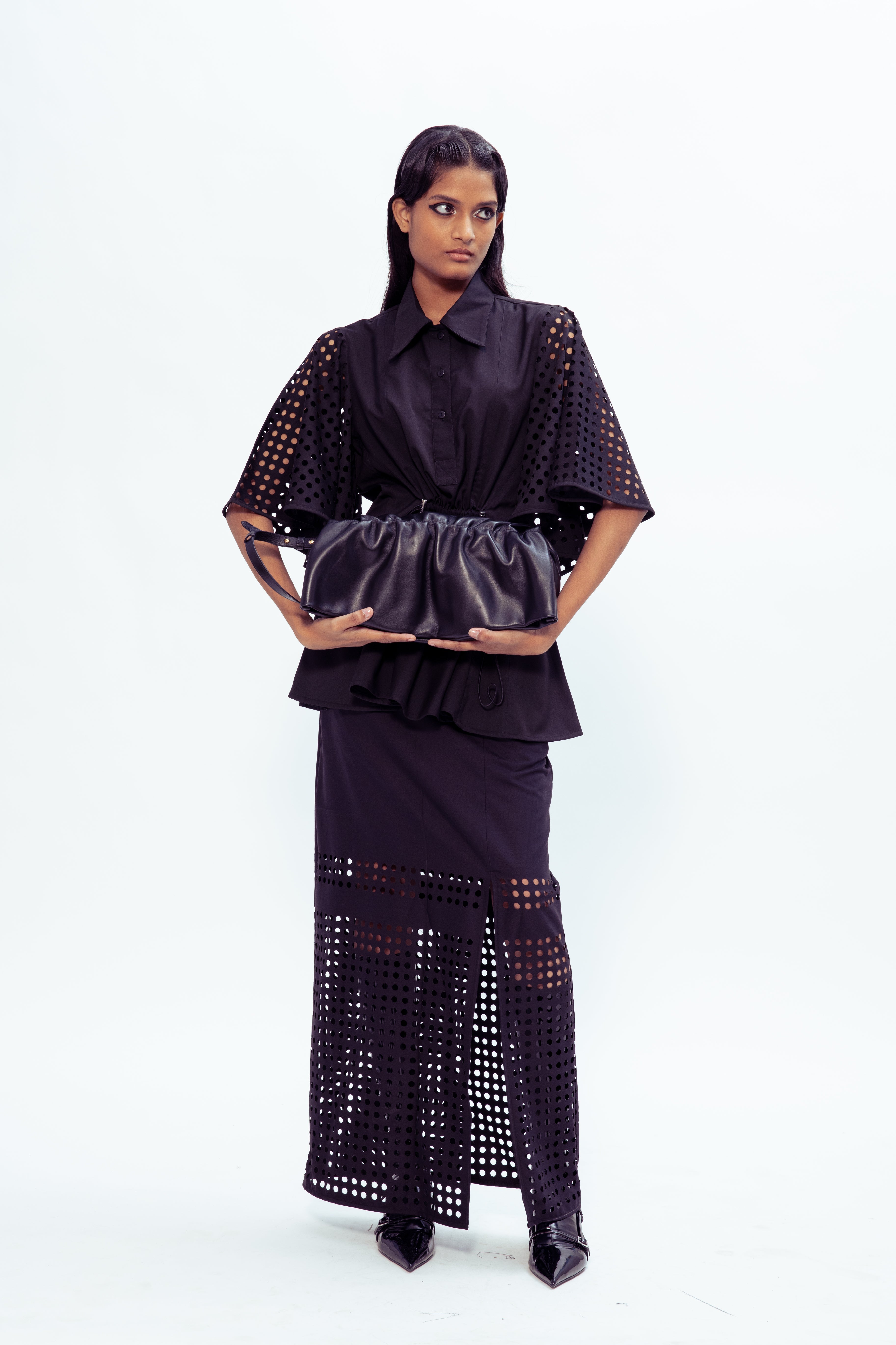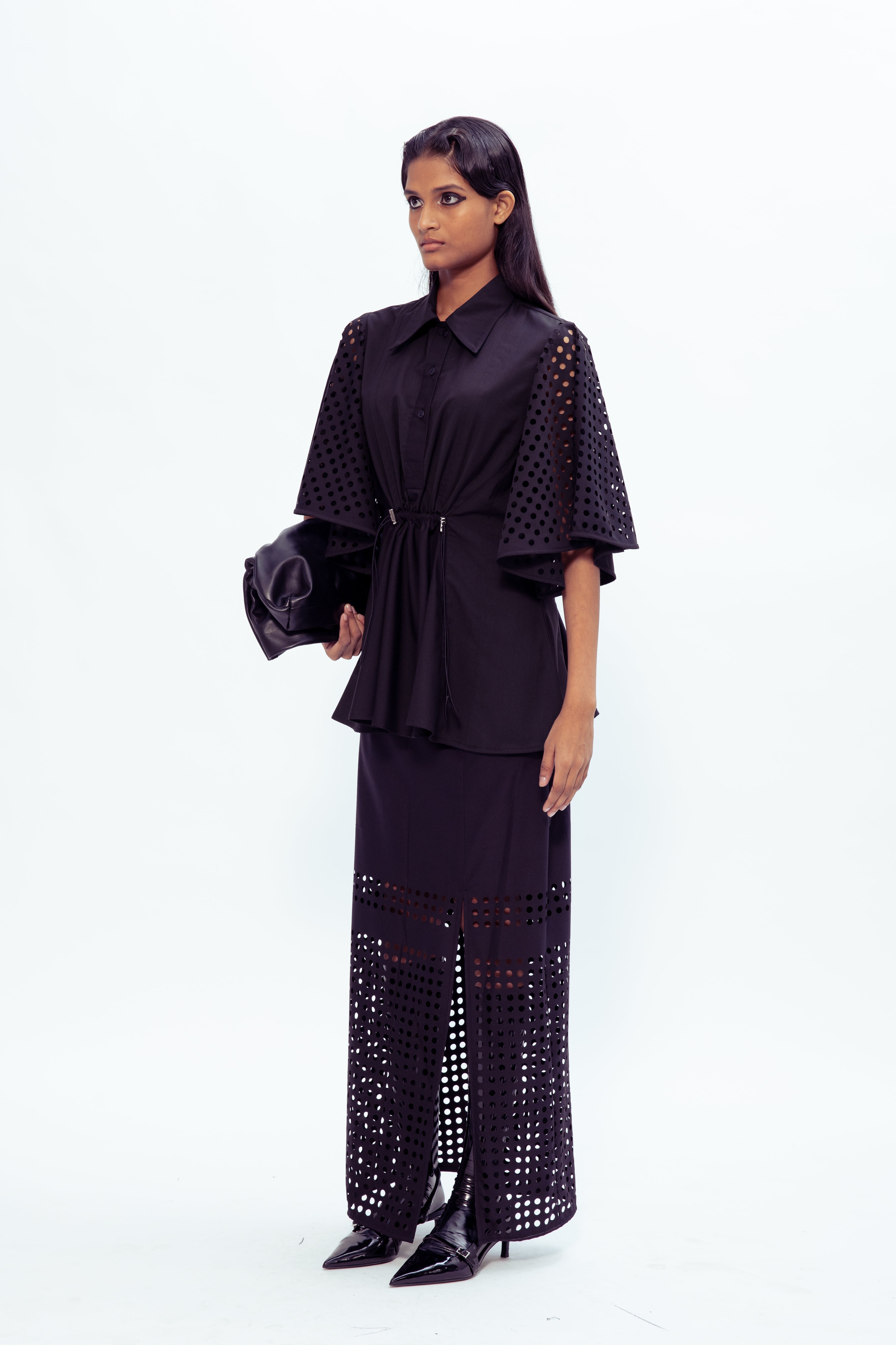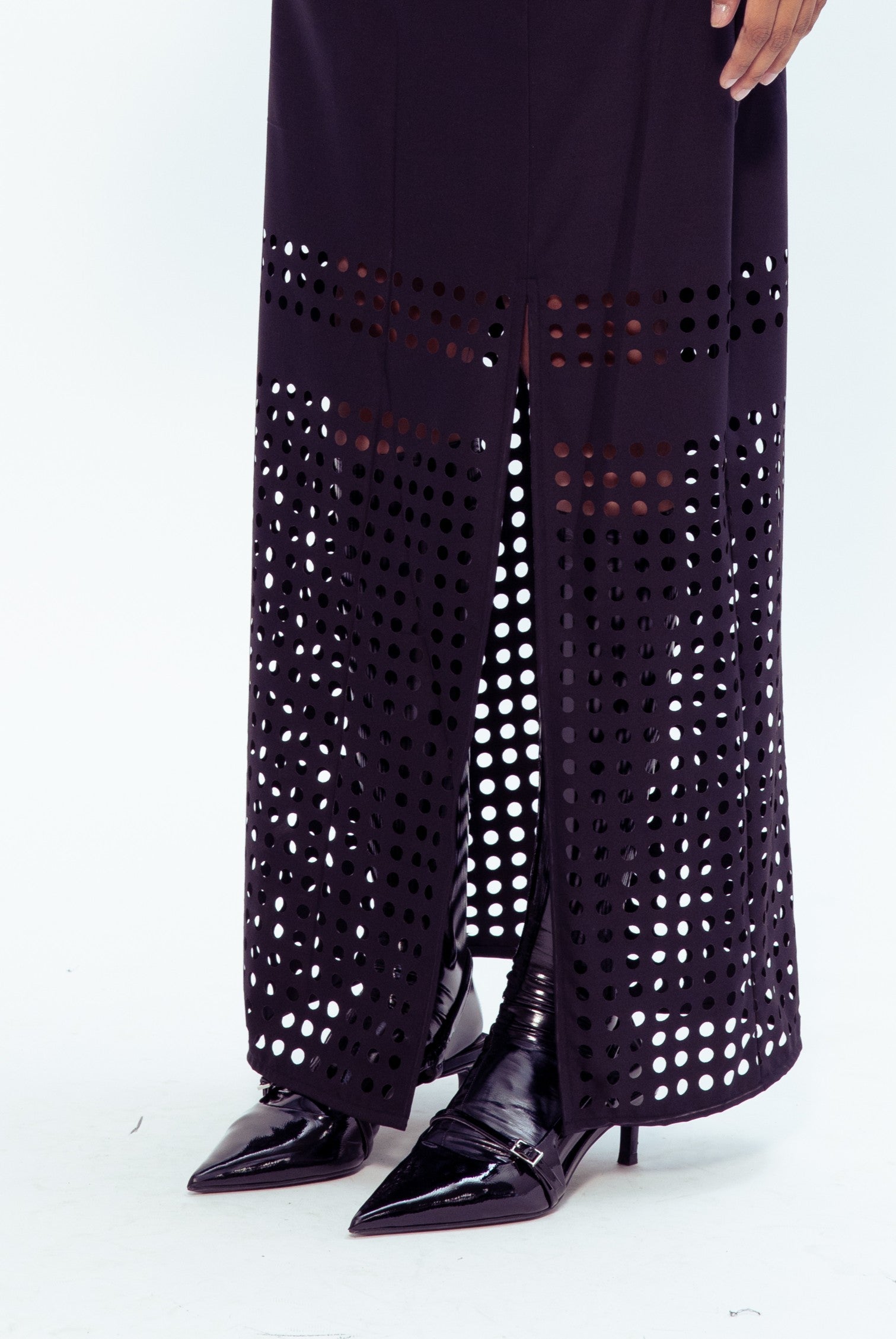 A modern laser mesh midi skirt featuring single pleats for subtle movement and texture. Lightweight, edgy, and effortlessly chic.