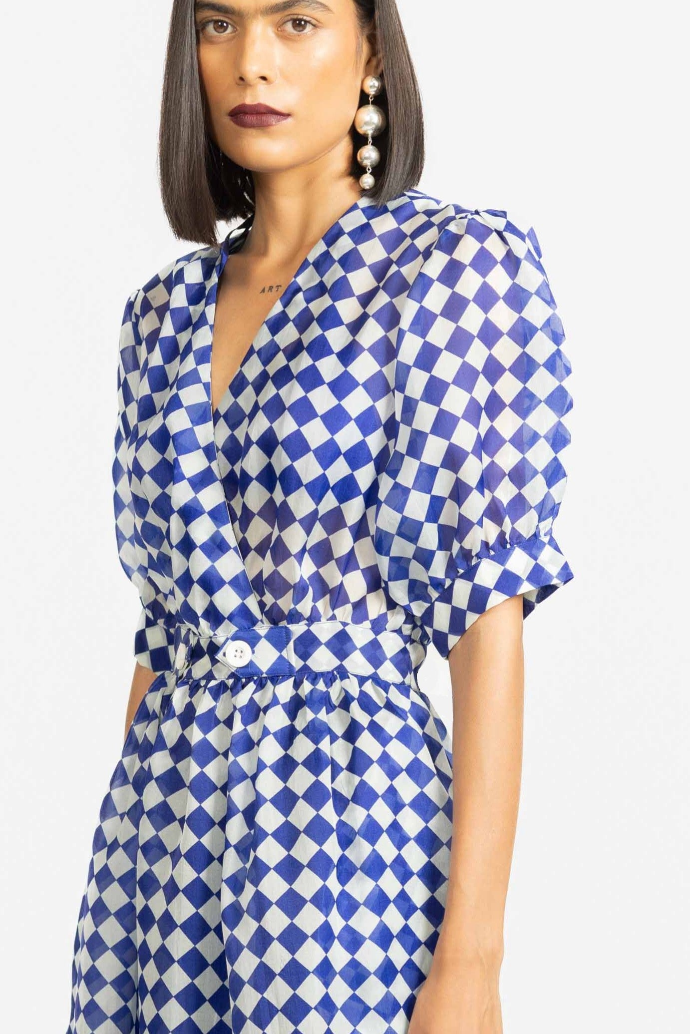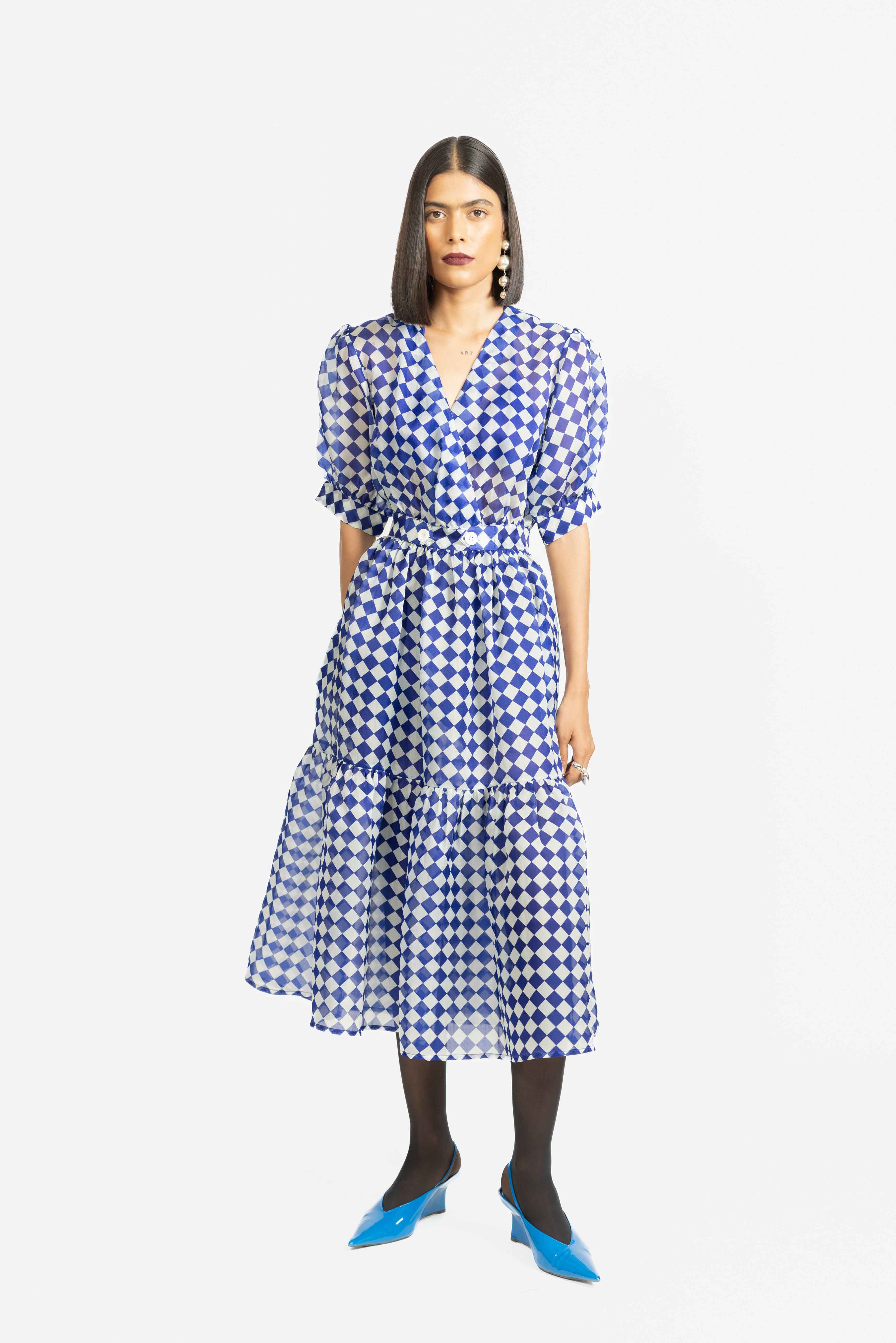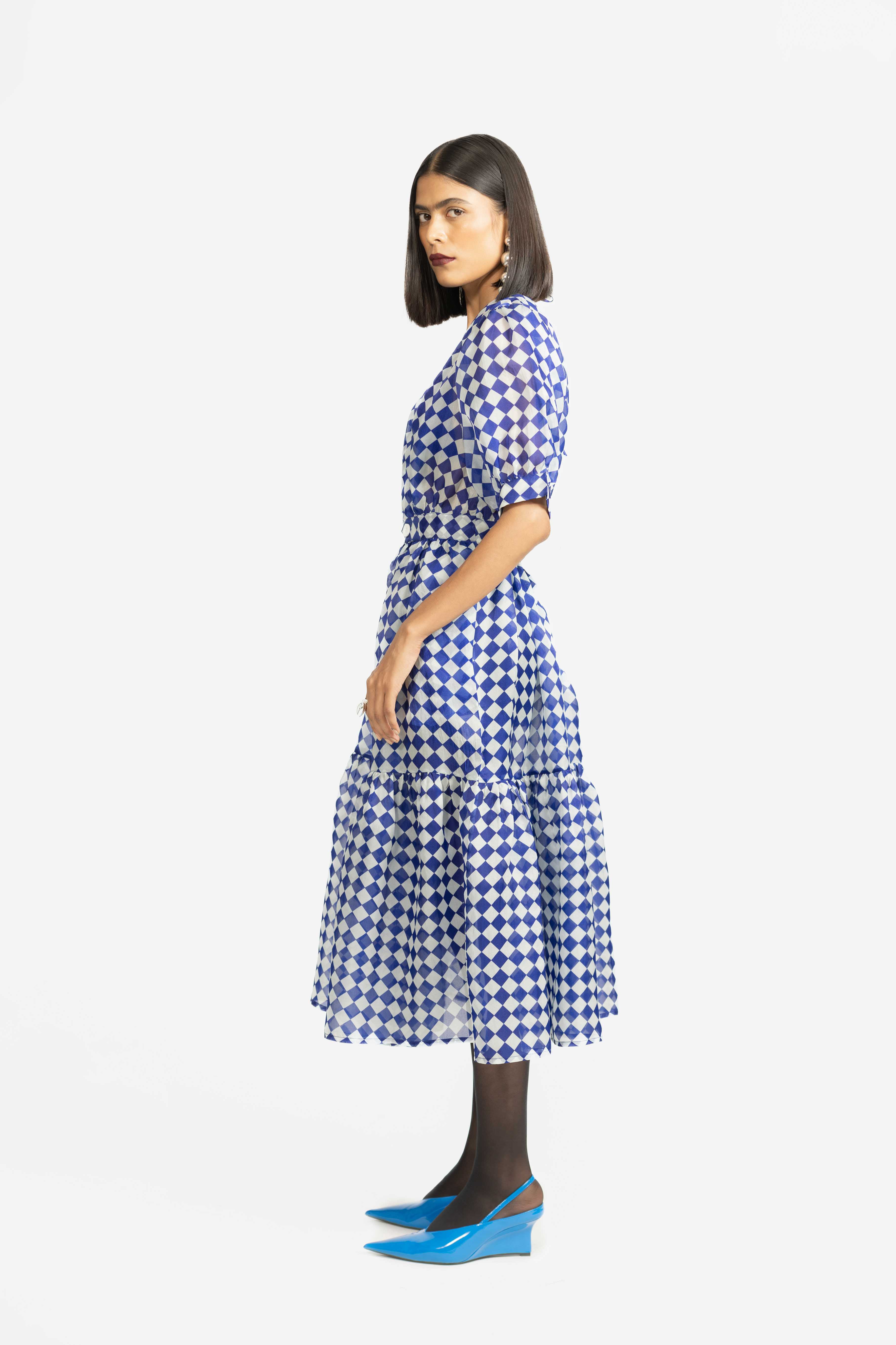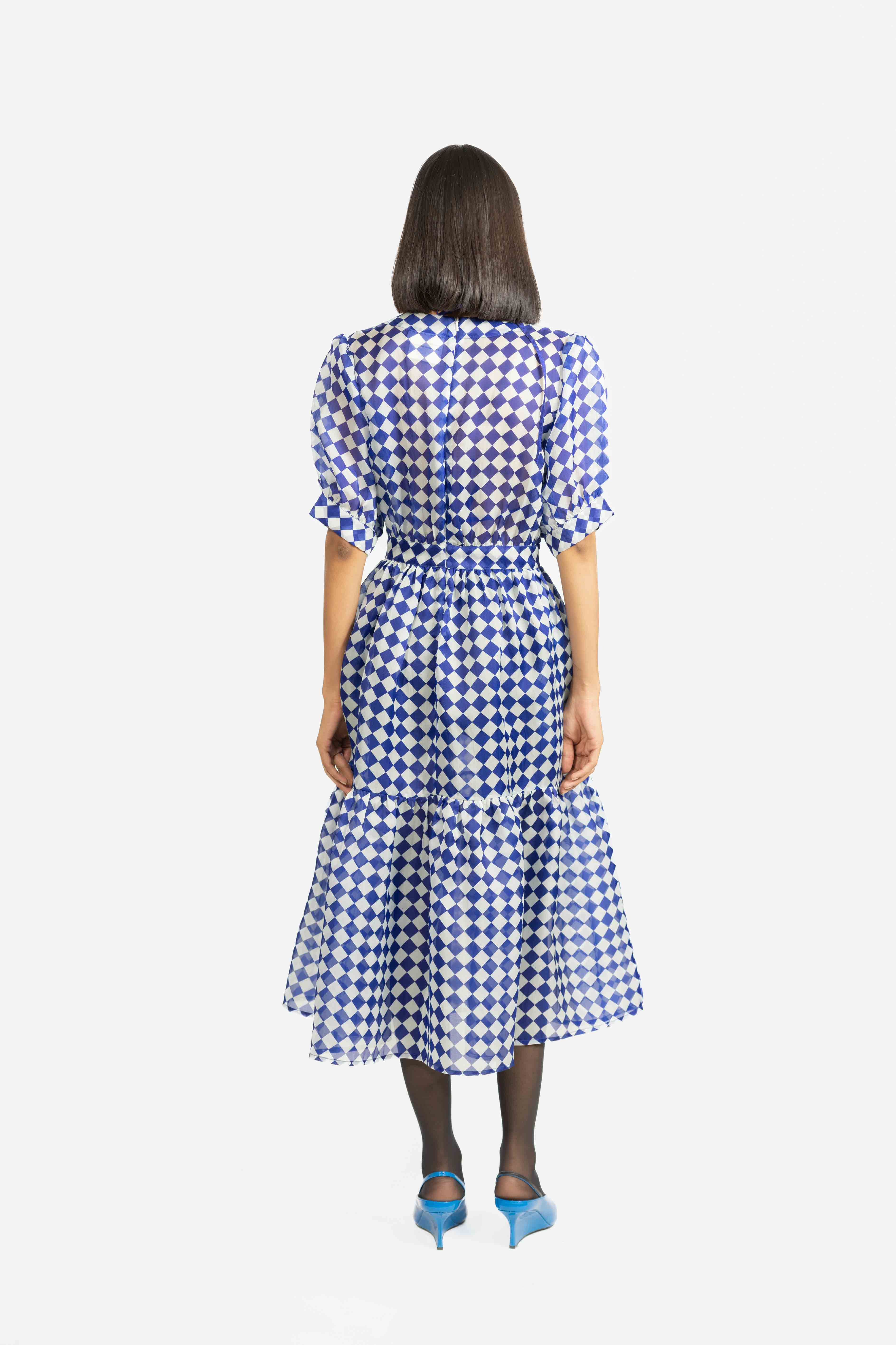 A soft midi dress featuring gentle gathers and a classic check pattern for timeless appeal.