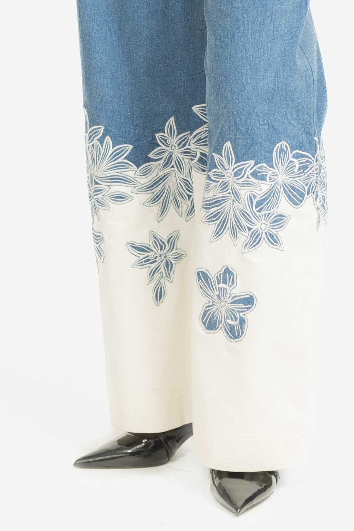 Wide-leg denim pants accented with striking contrast embroidery for a bold, contemporary look. Designed with a relaxed silhouette, they combine comfort with standout detailing.