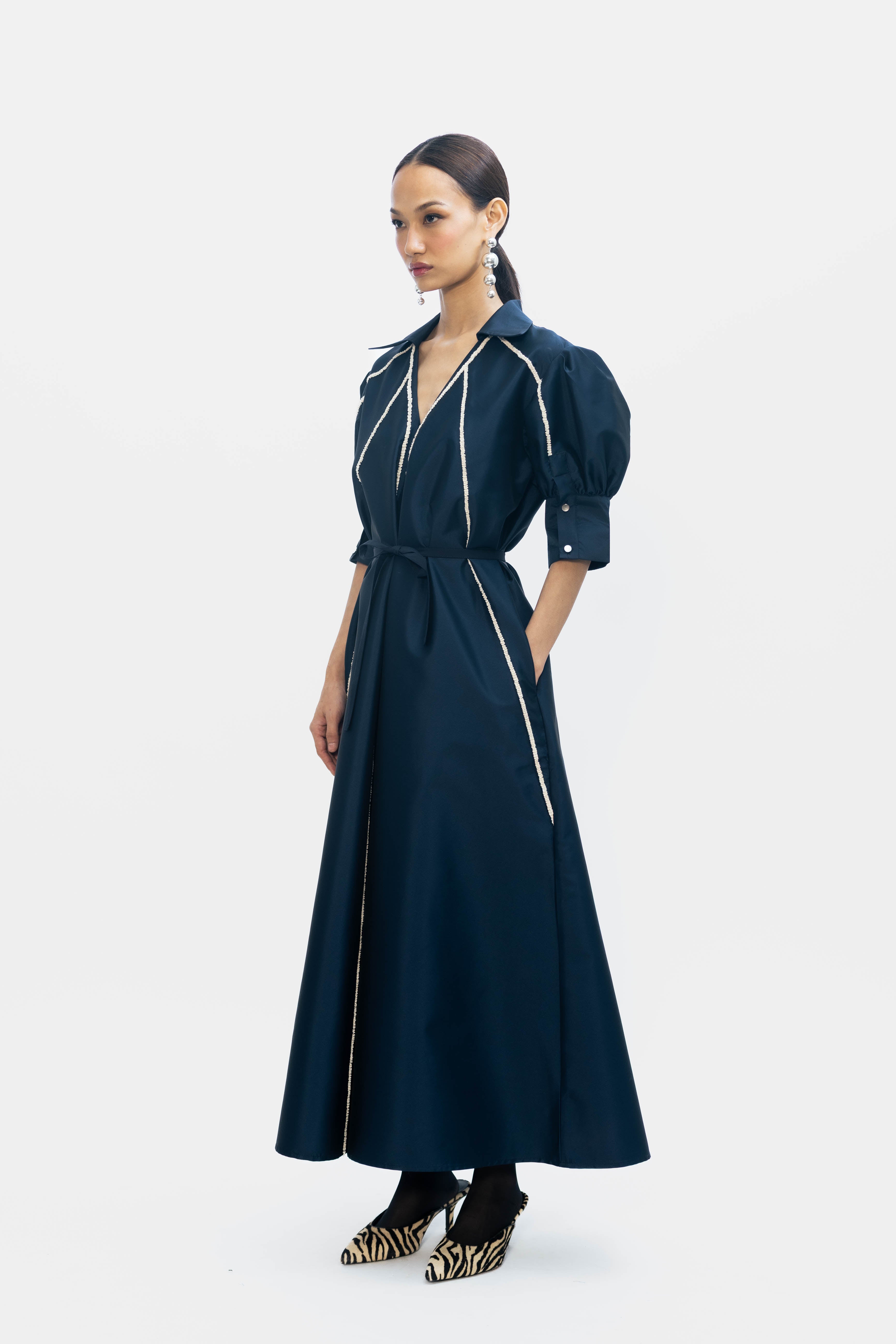 An ankle-length dress with a V-neck and collar, featuring slots all over, offers a blend of elegance and allure. The V-neckline adds a flattering touch, while the collar adds a refined detail. The slots all over the dress provide a unique and eye-catching design element, creating visual interest and movement. With plackets at the sleeves, the dress achieves a structured look. Paired with a belt, it offers versatility in styling and enhances the waistline. This combination creates a sophisticated and chic ensemble suitable for various occasions, from formal events to casual outings.
