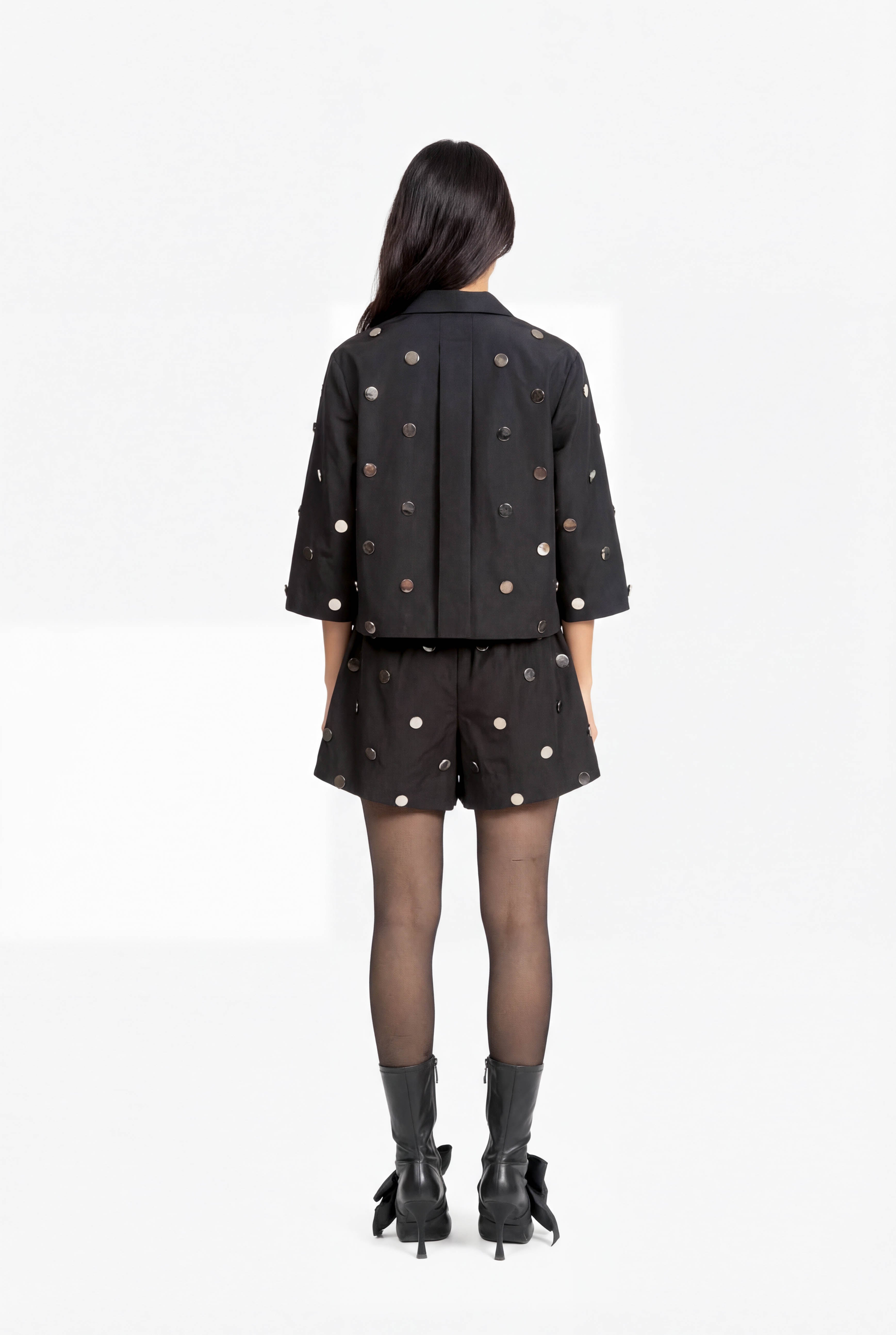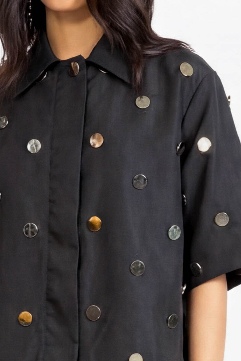 A contemporary boxy shirt adorned with mirror embellishments for a striking, statement finish.