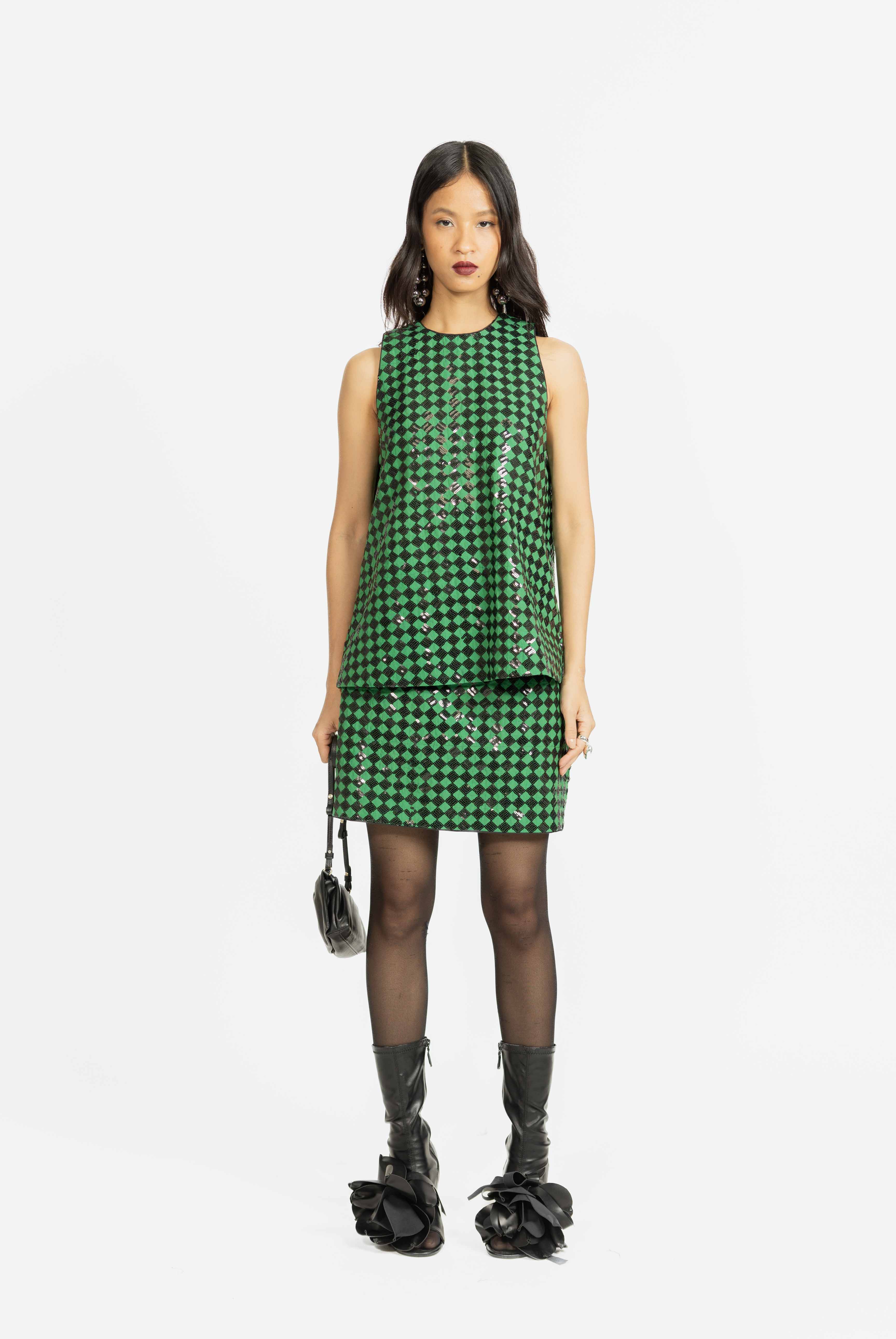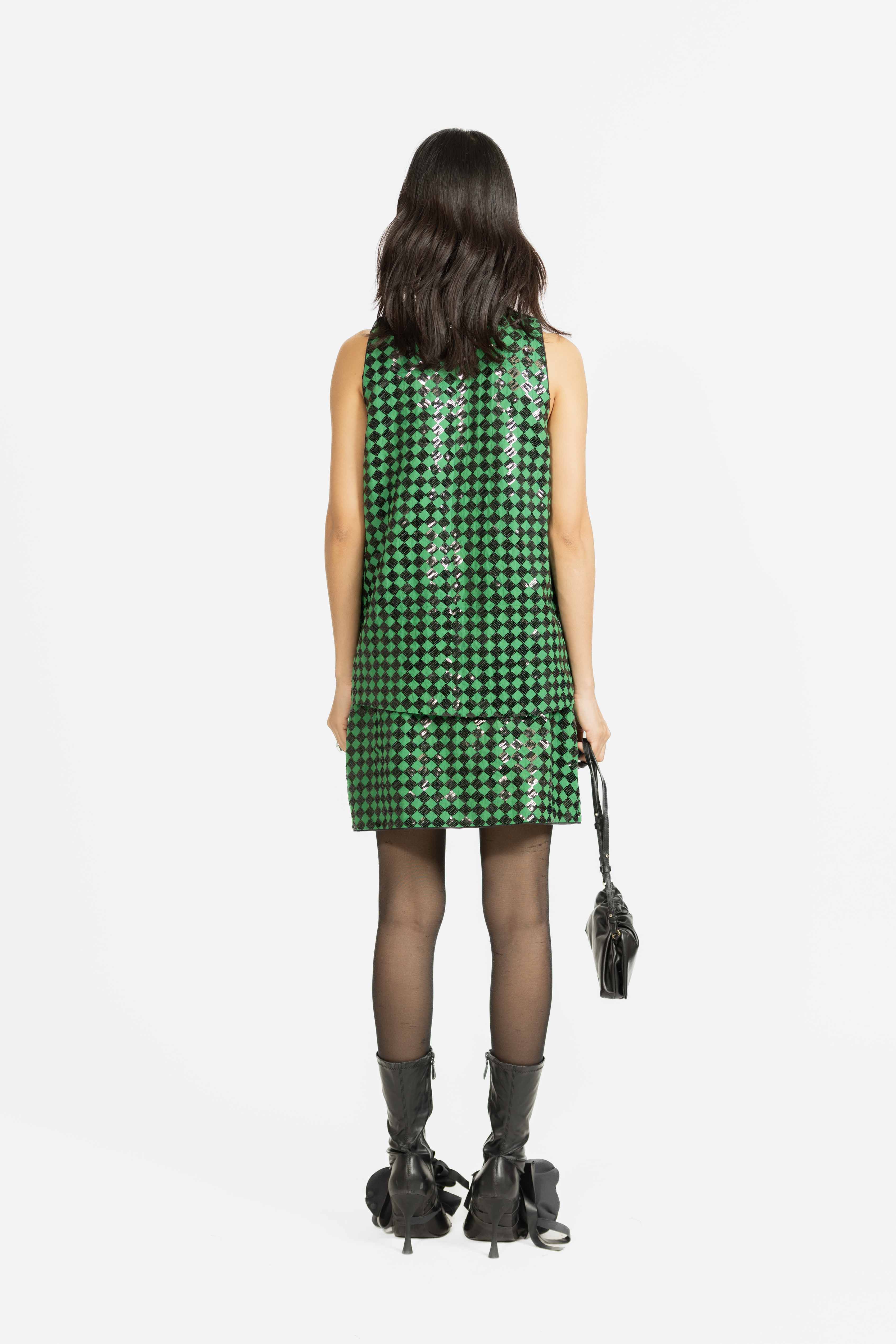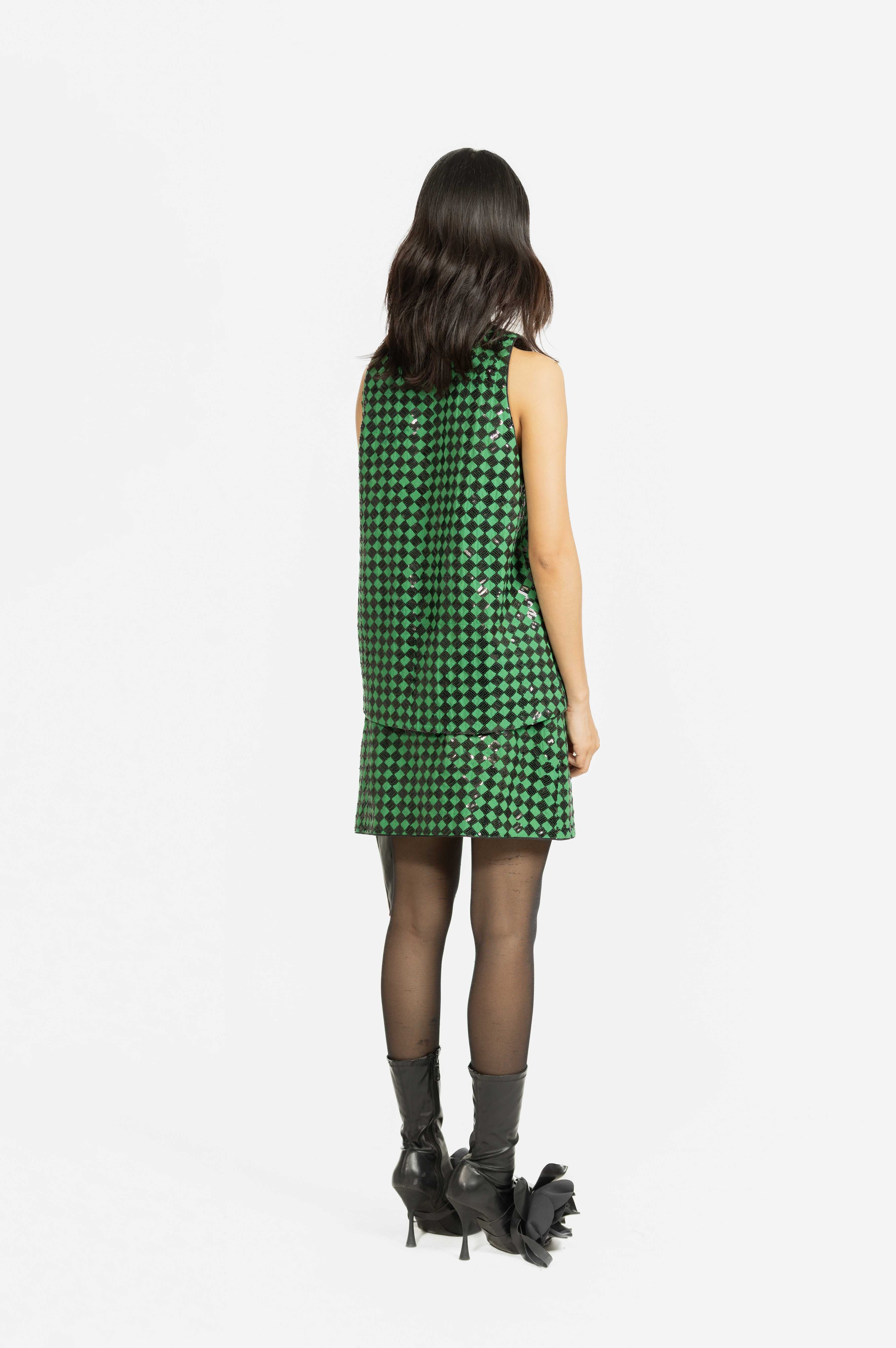 A boxy sleeveless top designed with checkered sequin embroidery, offering a modern silhouette with a subtle sparkle. Perfect for elevating both casual and evening looks with effortless style.