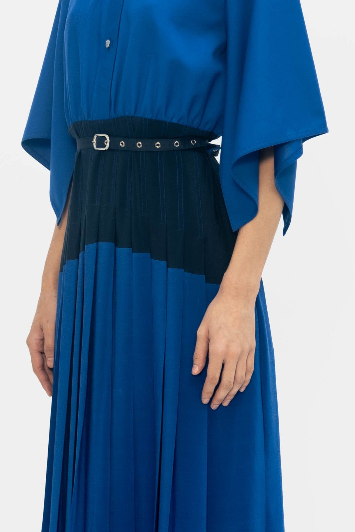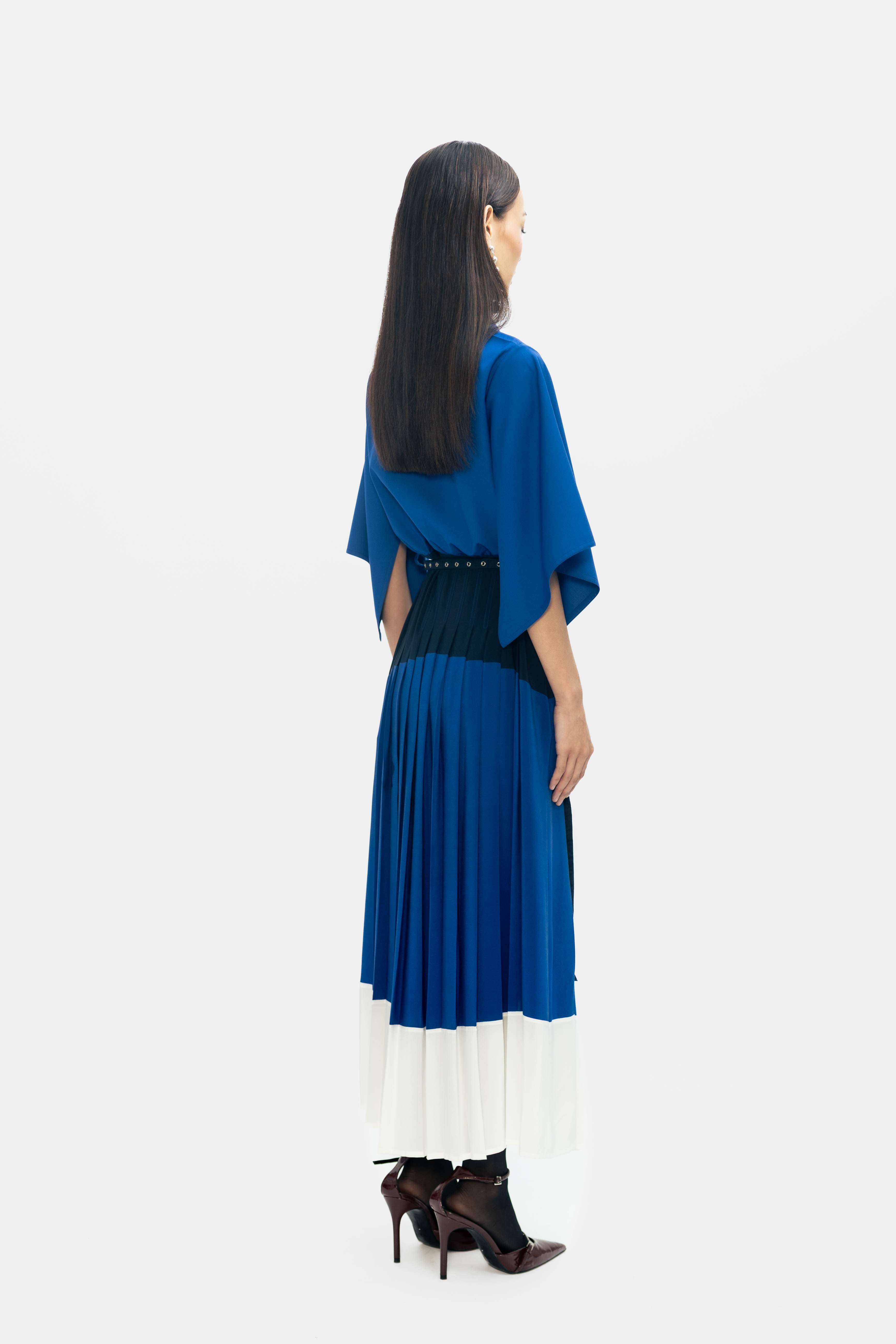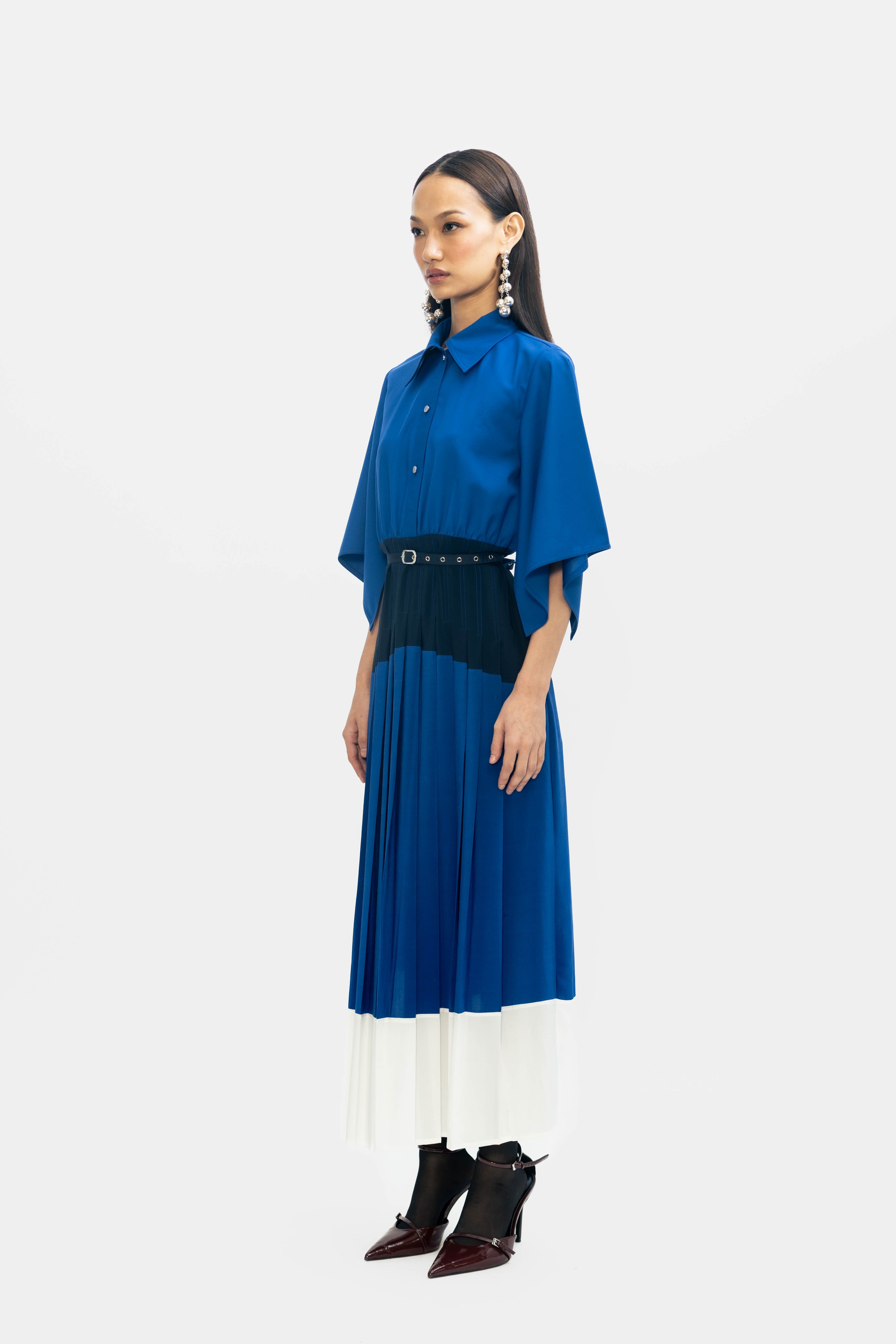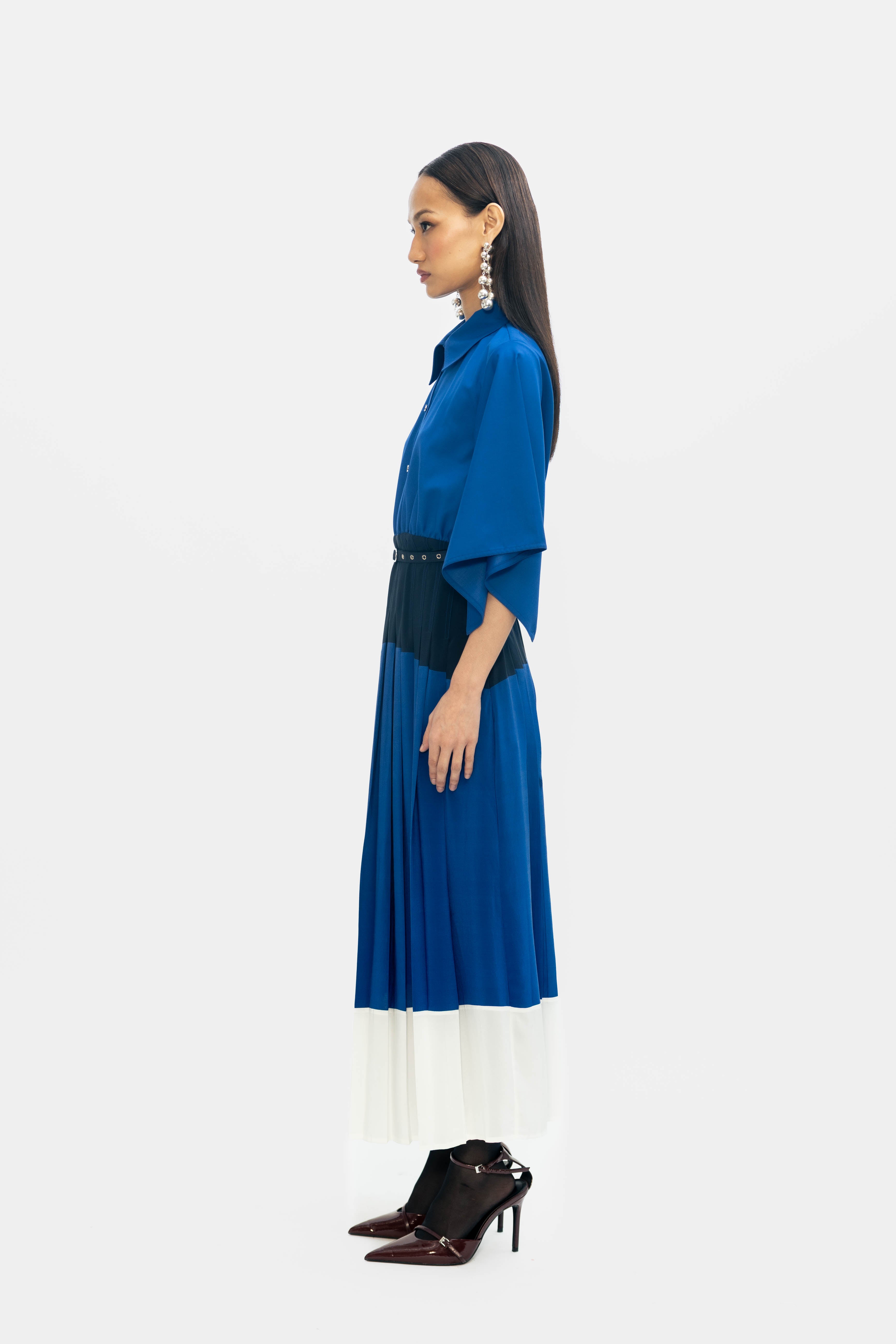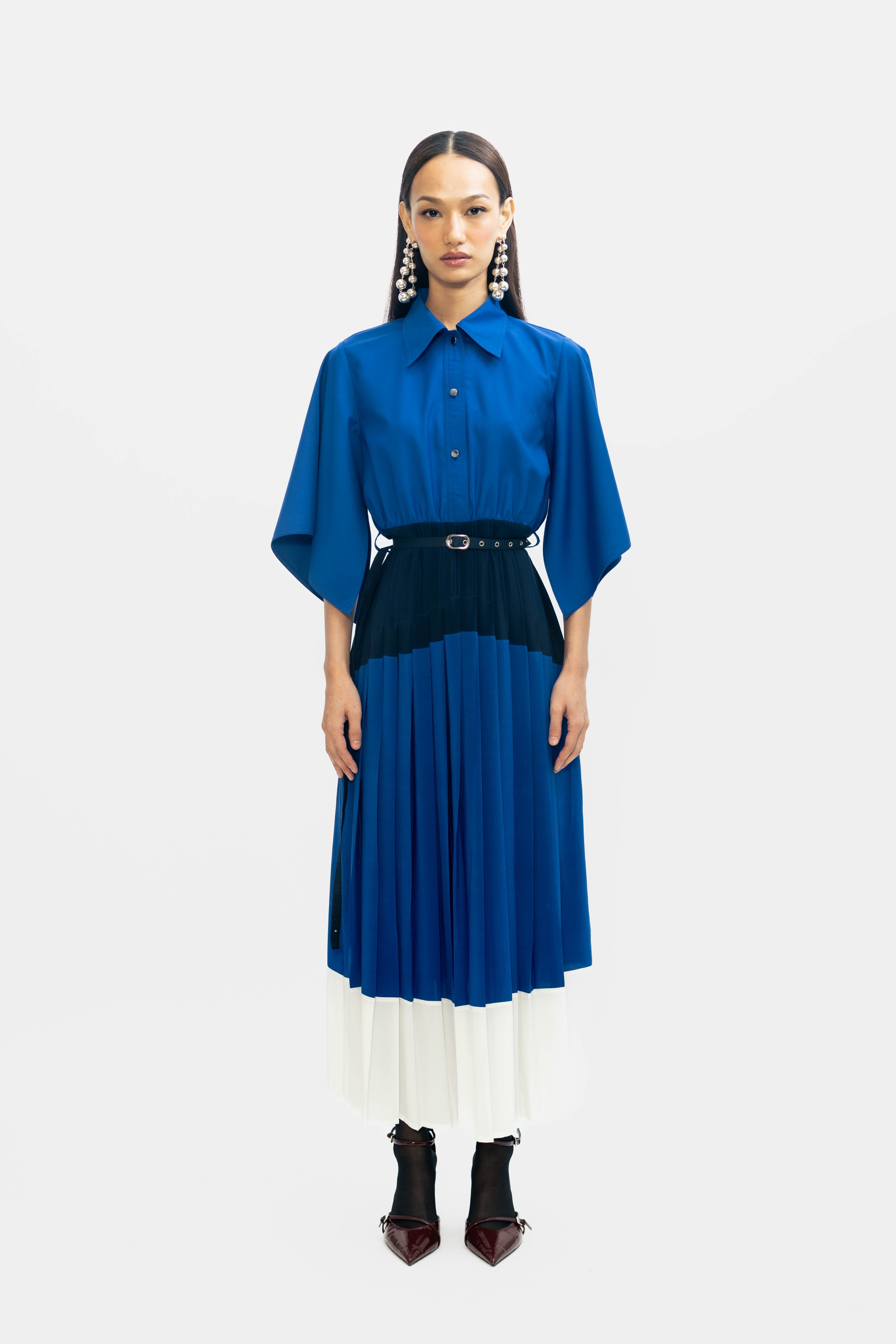 A sophisticated dress featuring a refined three-tone palette with elegantly pleated panels for added movement and depth. Designed with a classic shirt silhouette, it blends structured tailoring with contemporary color blocking for effortless style.