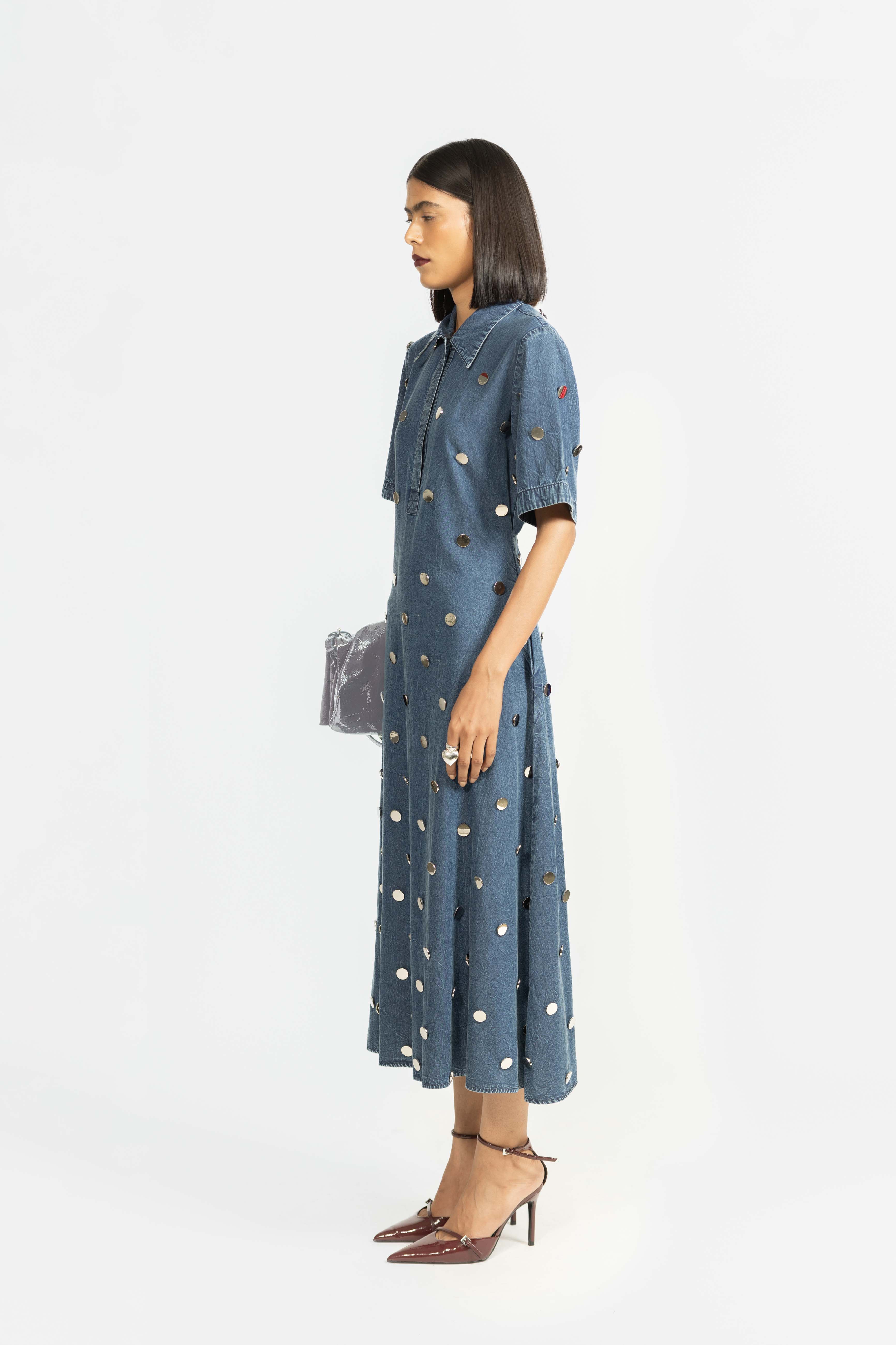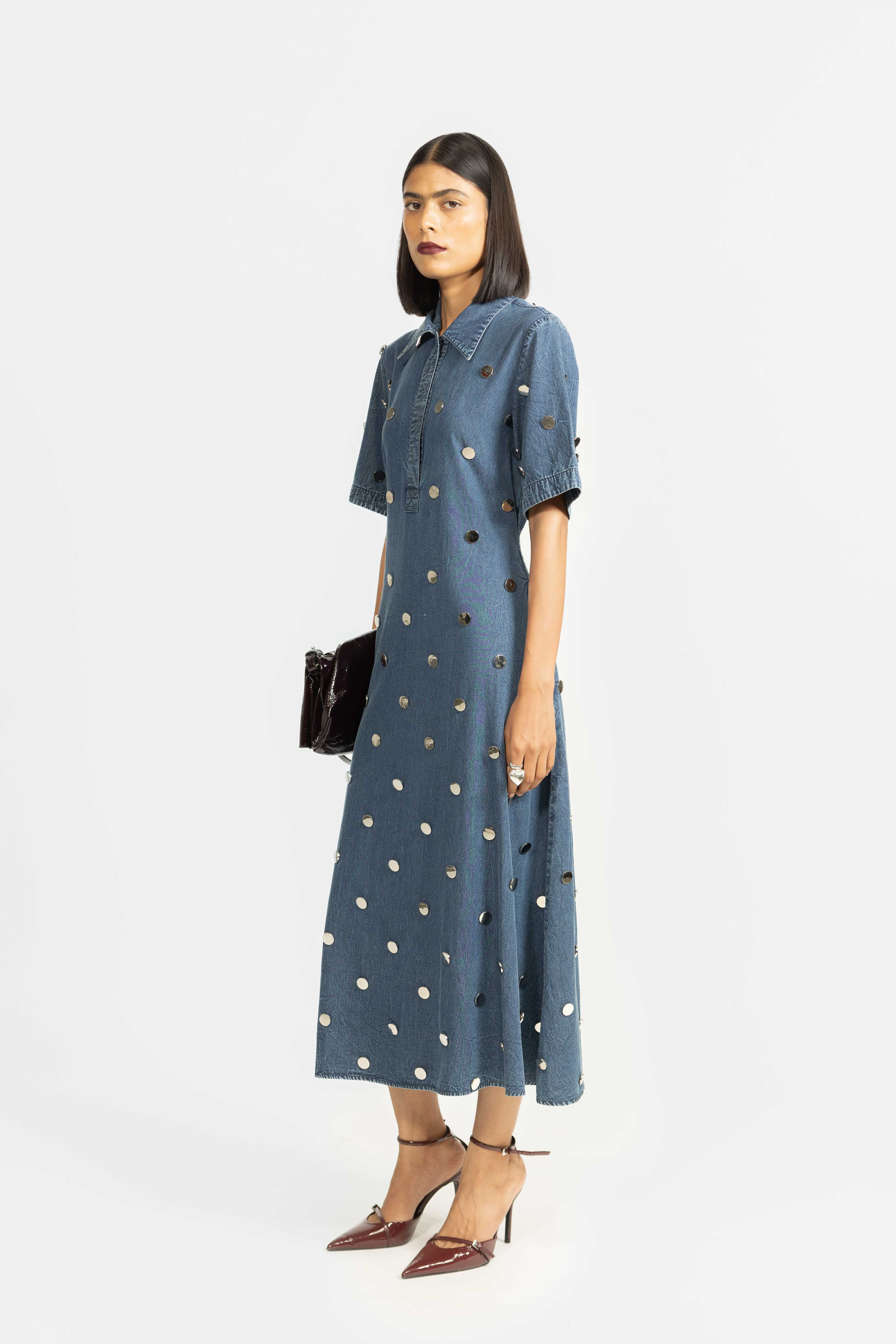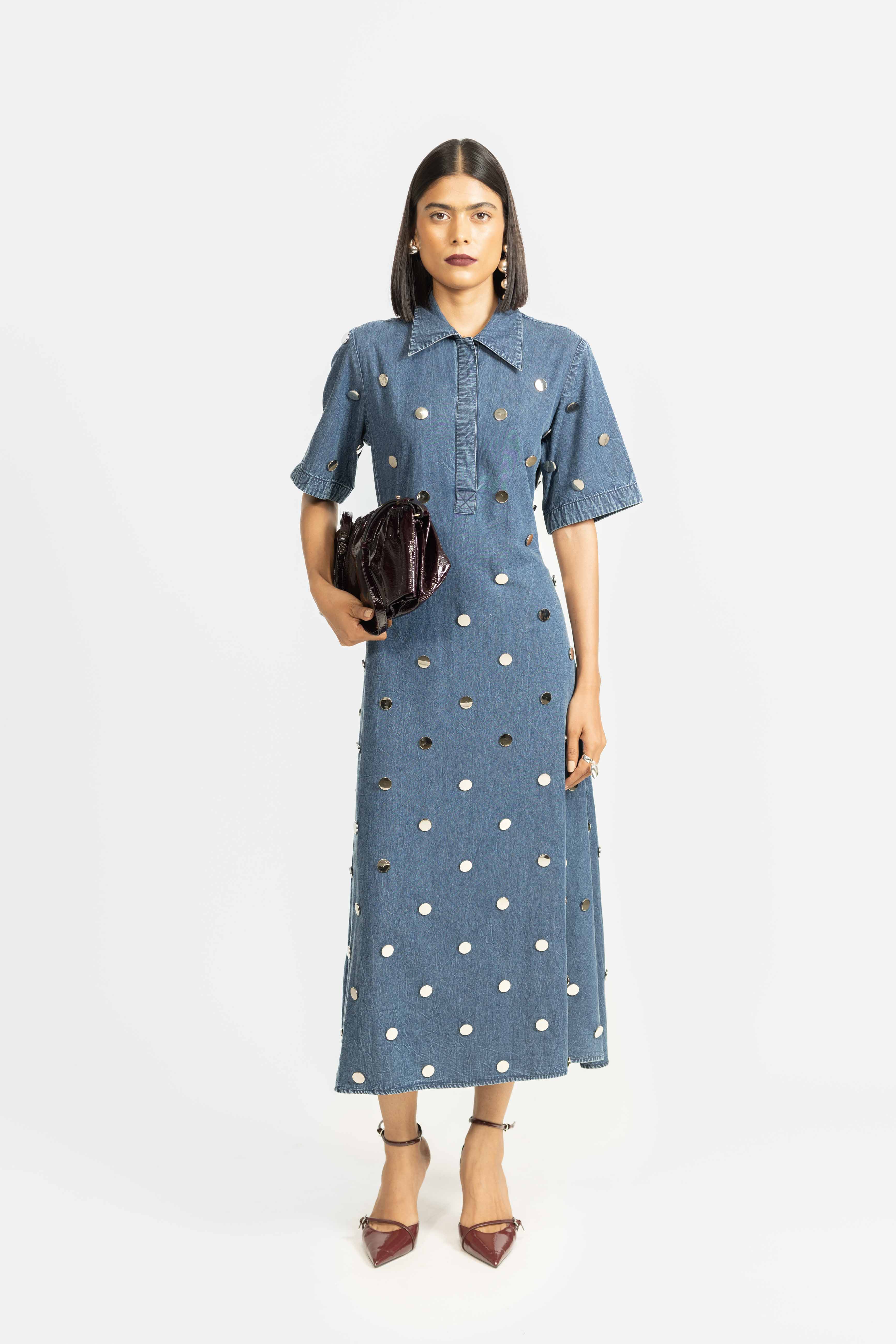 A classic A-line dress crafted in denim, featuring a structured collar and subtle stud detailing. Designed for a comfortable fit with a modern, edgy touch. Perfect for effortless day-to-evening styling.
