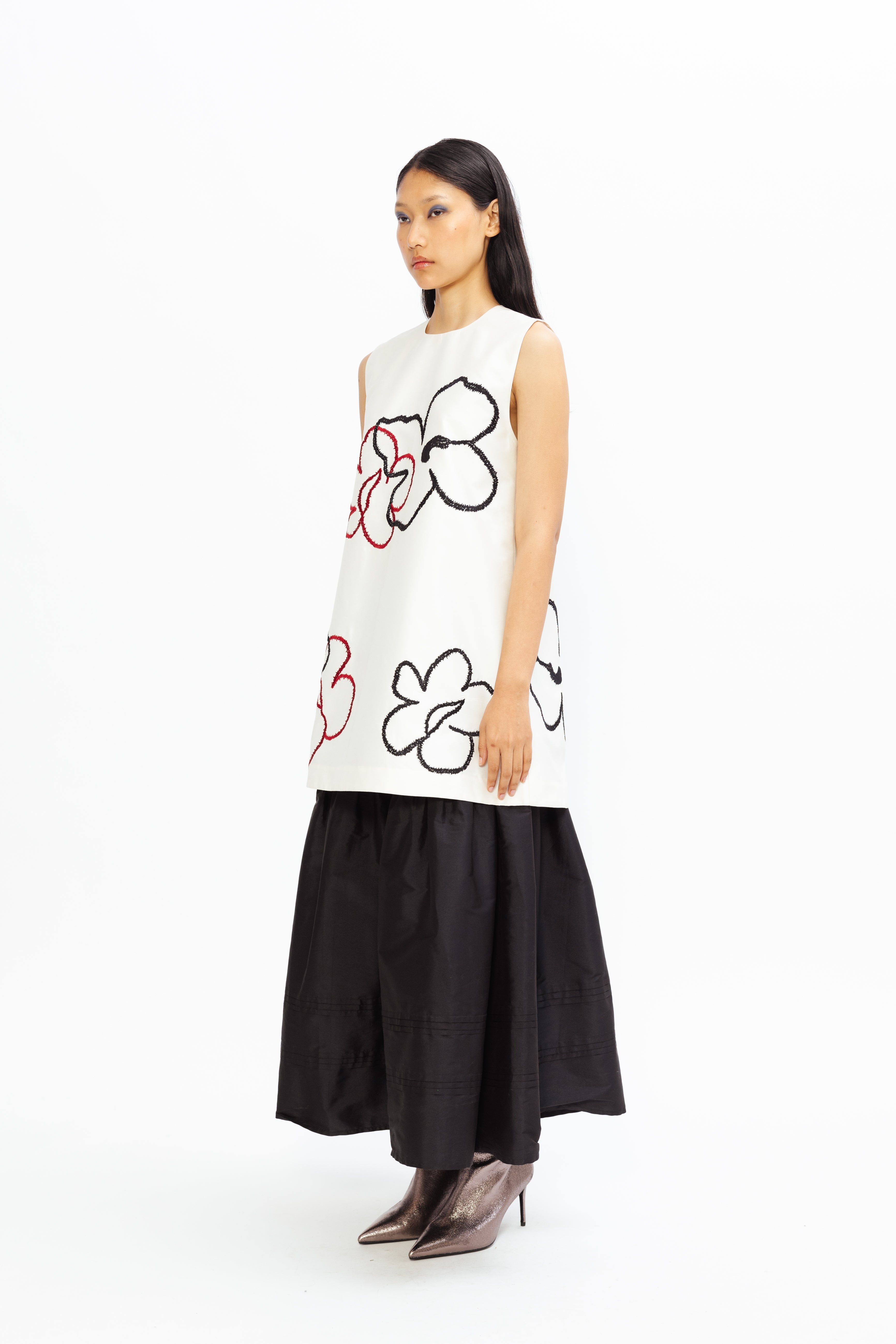 The Contrast Flower Embroidered Shift Dress features delicate floral embroidery that stands out against a clean, contrasting base. Cut in a classic shift silhouette, it offers a relaxed yet refined fit that flatters effortlessly. Perfect for both daytime elegance and evening charm, this dress blends timeless femininity with contemporary detailing.