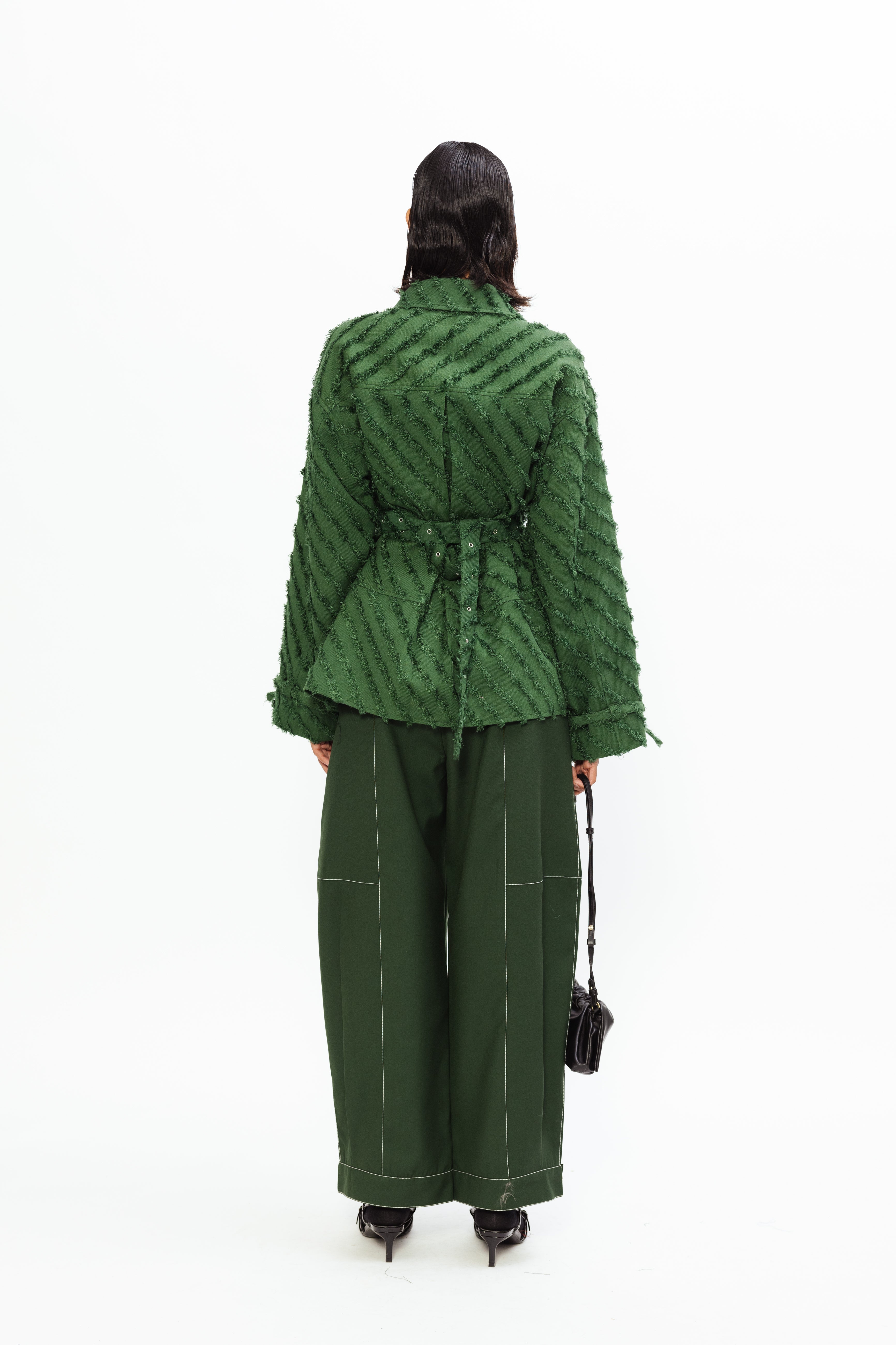 A classic overshirt crafted from extra yarn wool, styled with wide leg trousers, in a rich hunter green hue. The structured yet relaxed design offers warmth and ease, while the premium wool texture adds depth and sophistication, making it a versatile layer for cooler days.