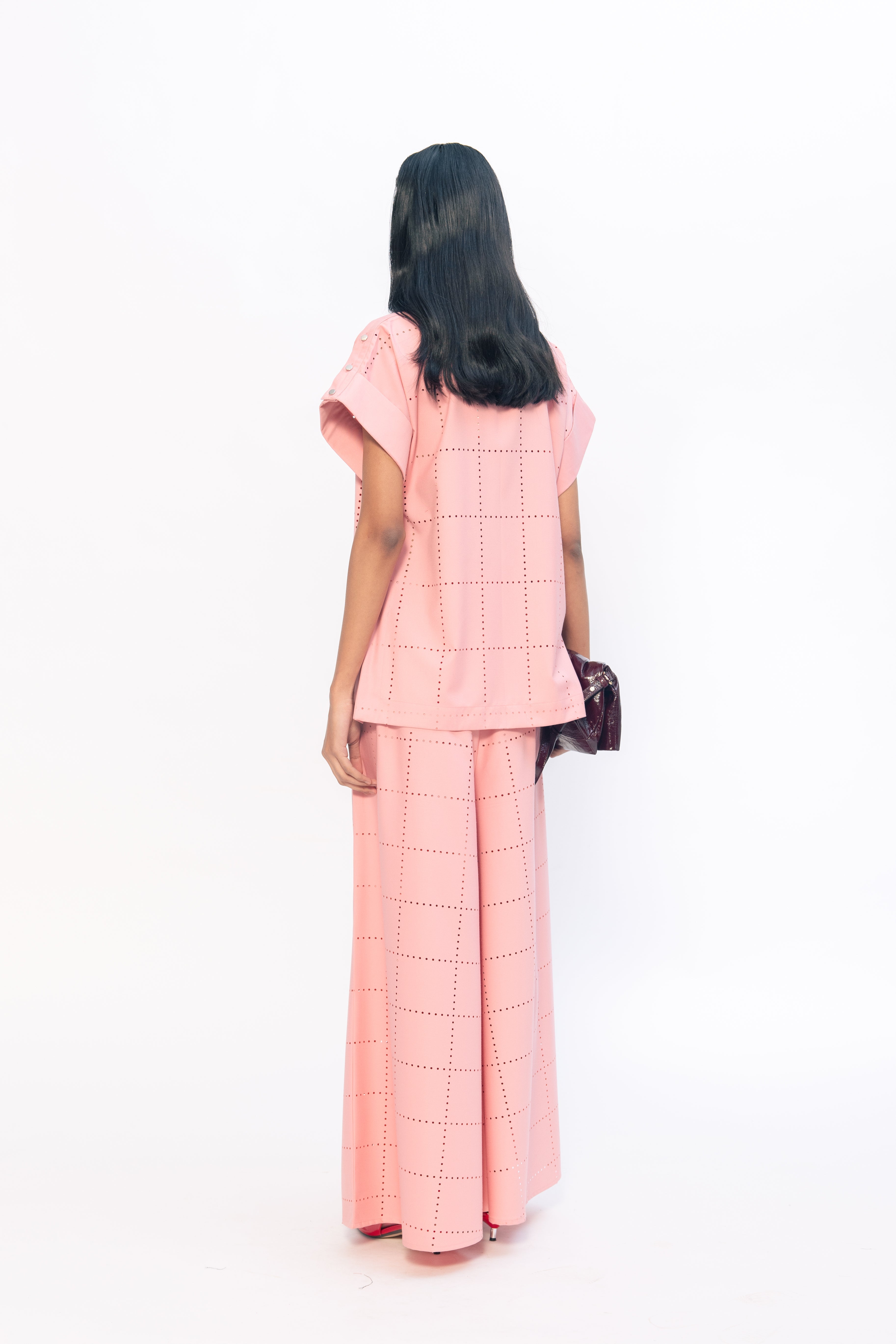 Intricate precision meets modern tailoring in this sharply detailed pairing. Up top, structured elements like the collar and placket ground the delicacy of laser-cut patterns, offering contrast and control. Below, the fluid flare introduces movement, while the fitted waist keeps the look streamlined. Together, they form a cohesive statement—technical, refined, and effortlessly forward.