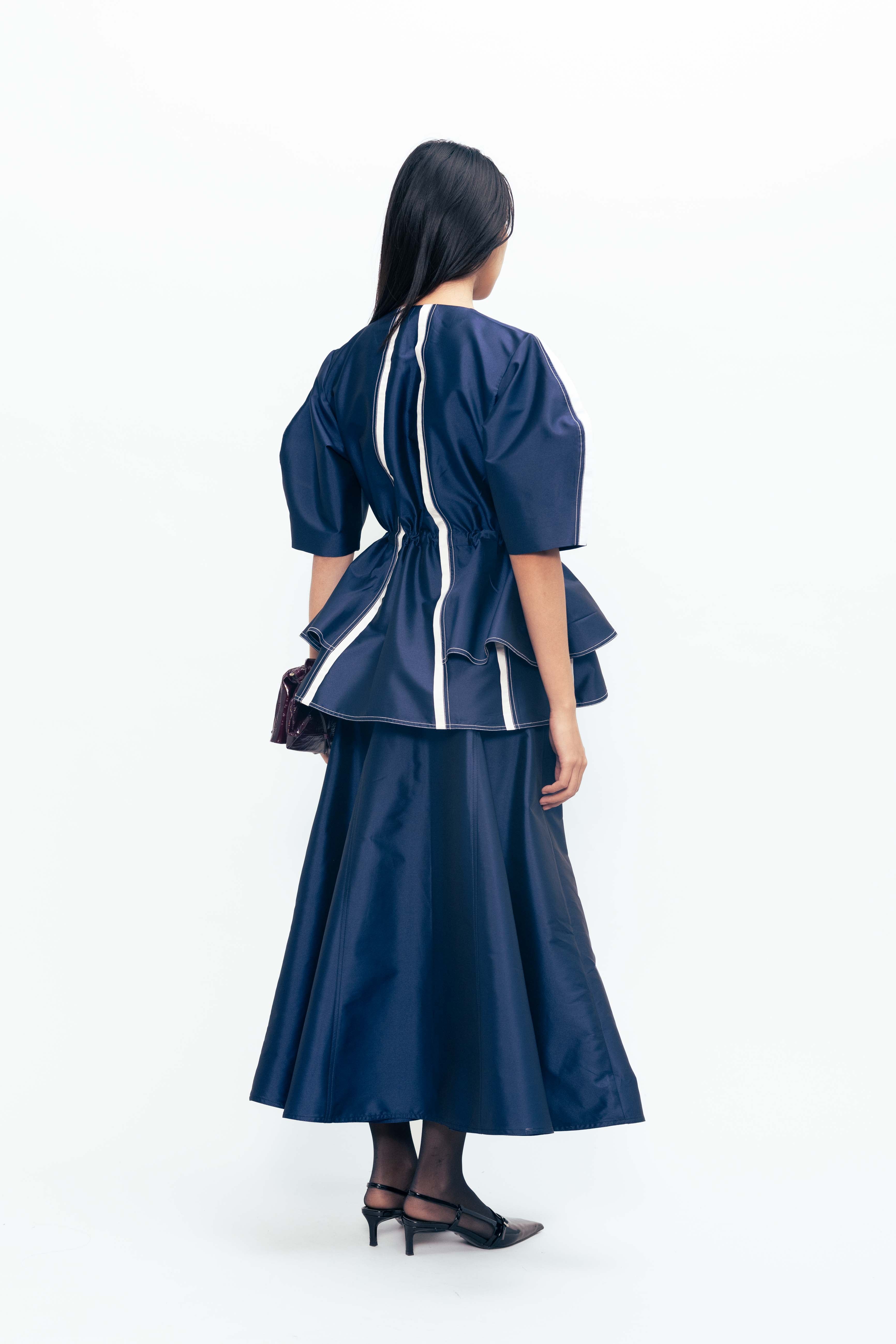 This sculptural co-ord set pairs a bold bubble-sleeve peplum top with a sleek A-line skirt, blending architectural lines with refined femininity. The top features dramatic volume, tailored precision, and modern slot details, while the skirt offers a structured silhouette with a subtle sheen and timeless fit. Crafted from crisp, shape-holding fabric, the set exudes quiet drama and polished sophistication—perfect for standout styling from day to evening