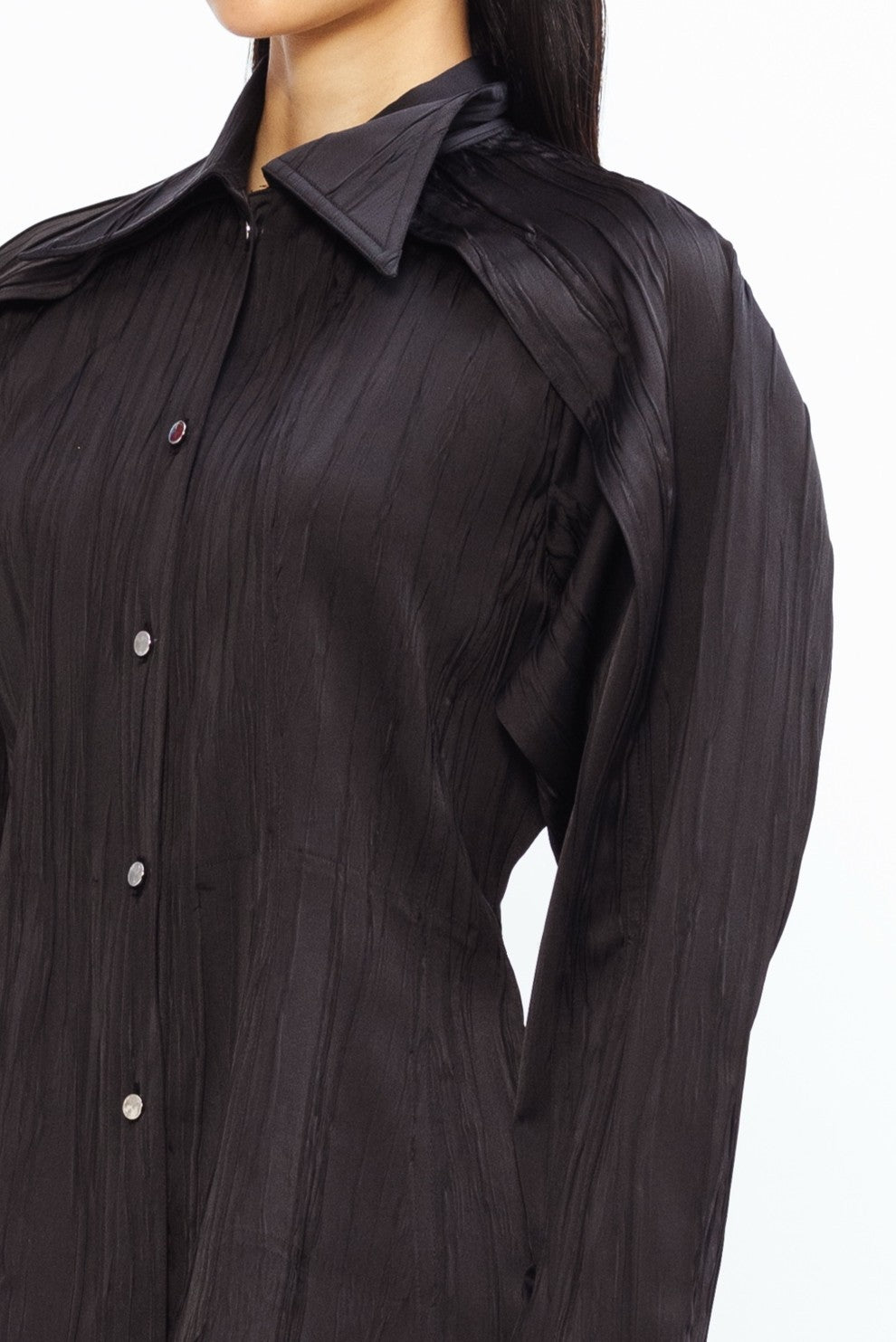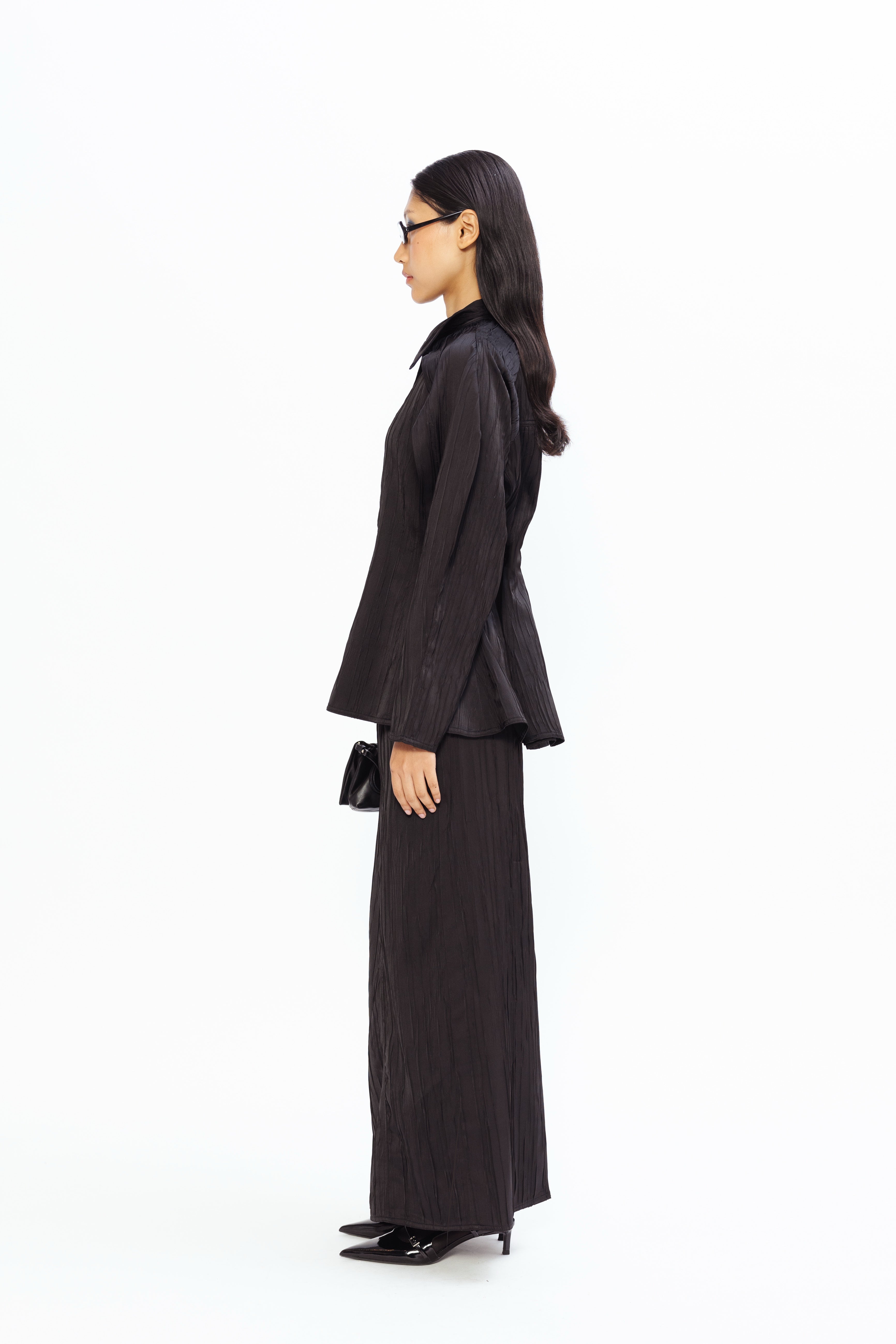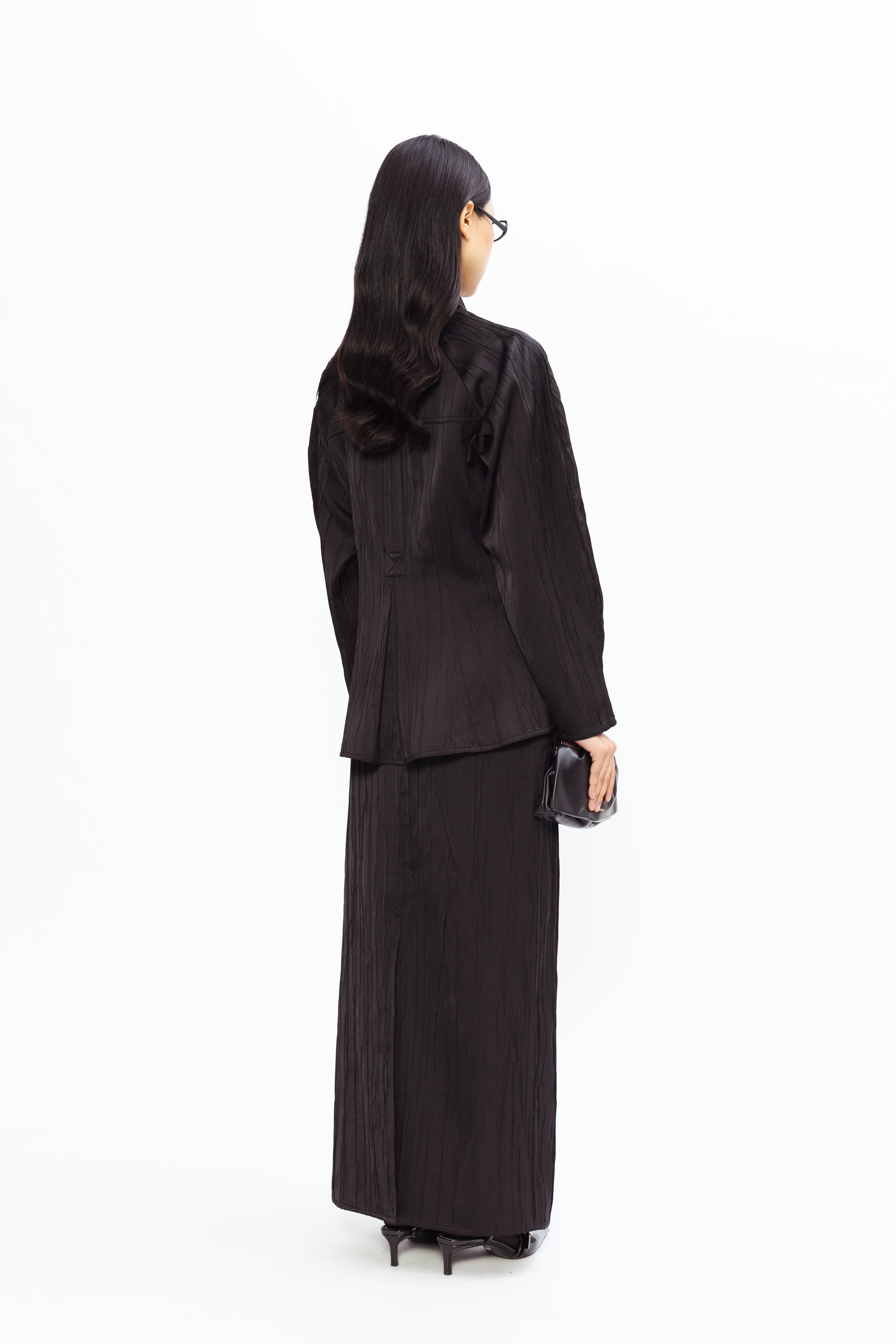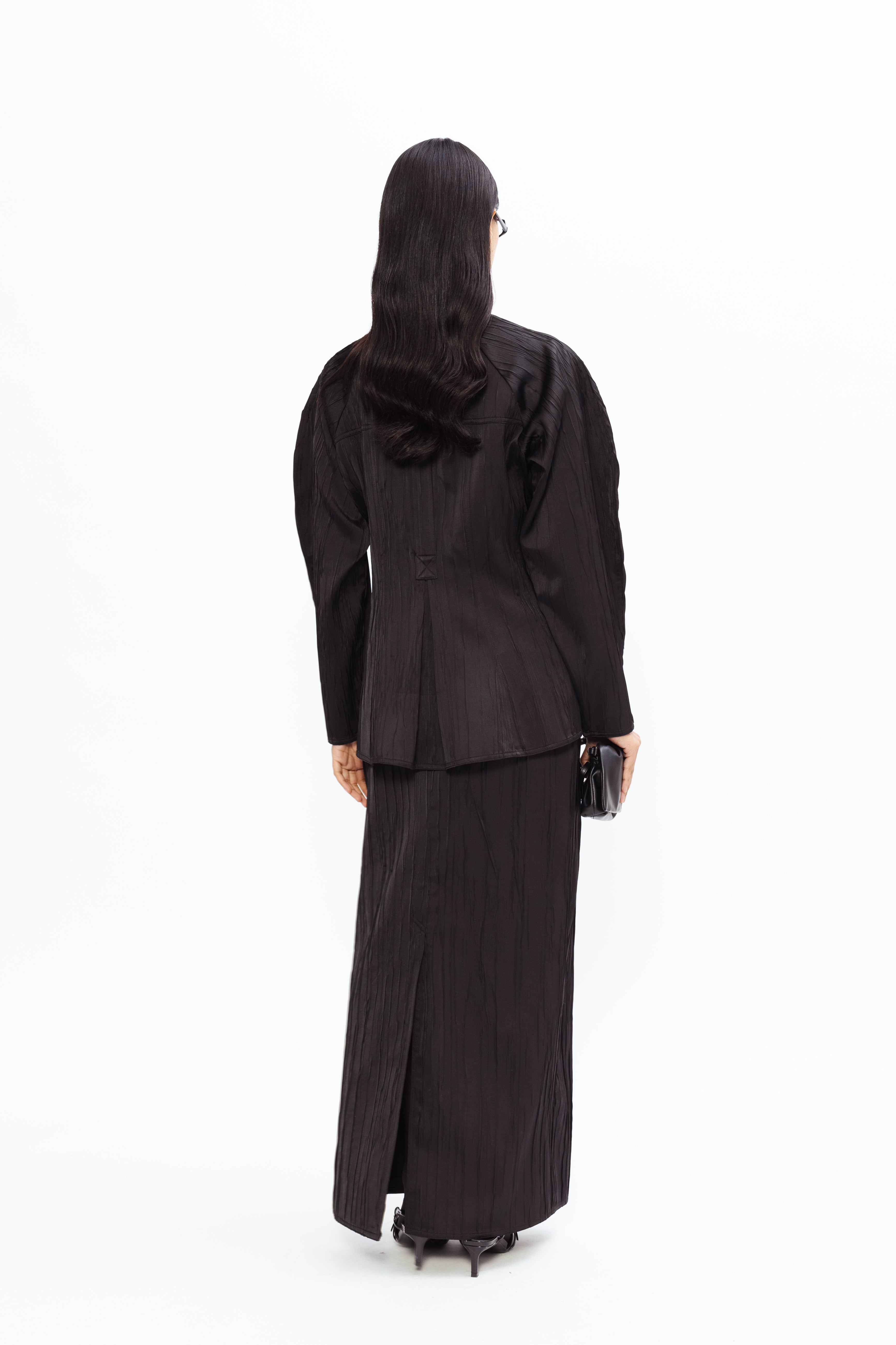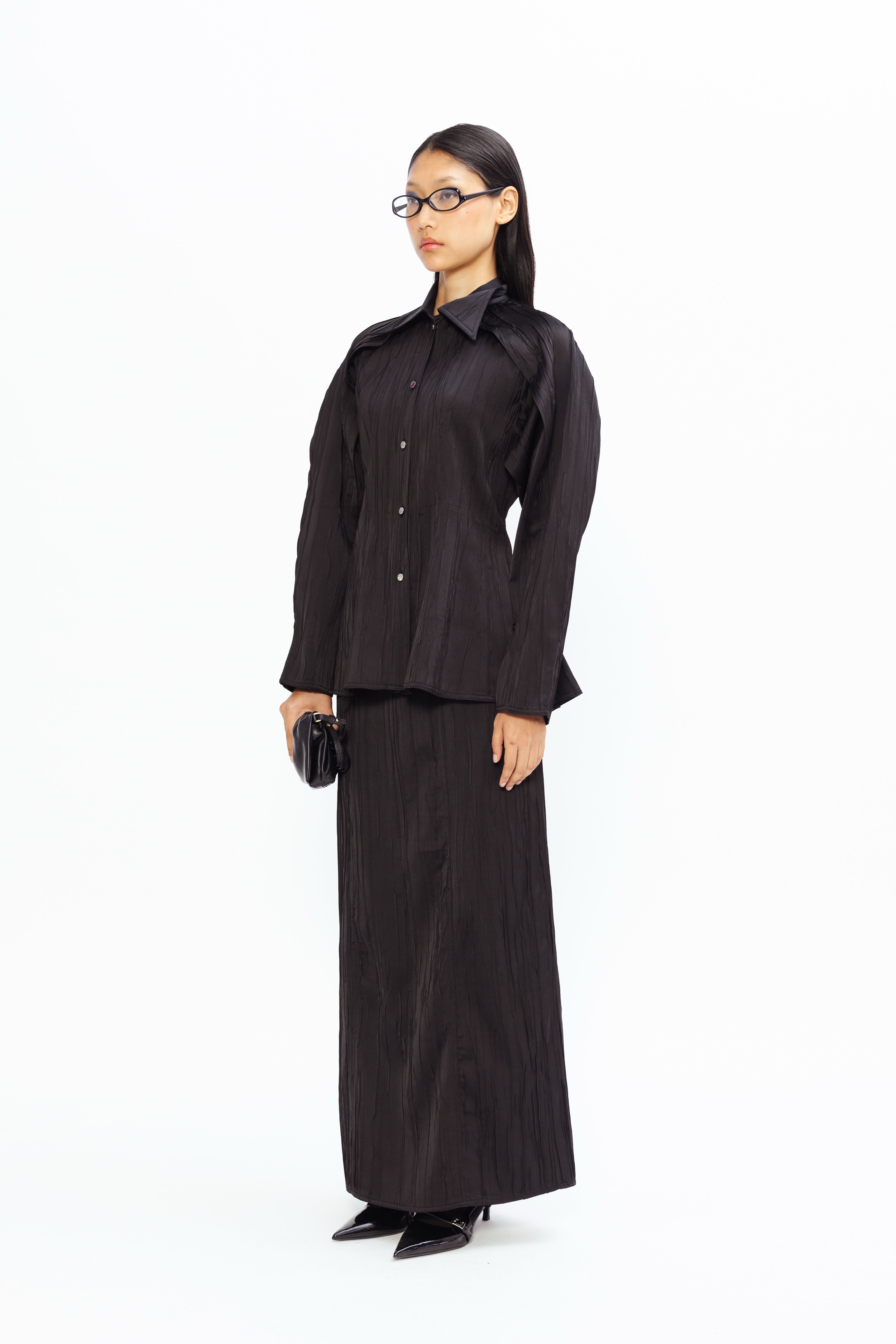 This elegant top paired with floor length skirt, features a textured, crinkled finish that adds depth and character to the fabric. The structured shoulders with a draped, layered effect and voluminous long sleeves create a striking, contemporary silhouette. Slightly tailored at the waist, it offers a subtle hourglass shape that beautifully balances structure and softness.