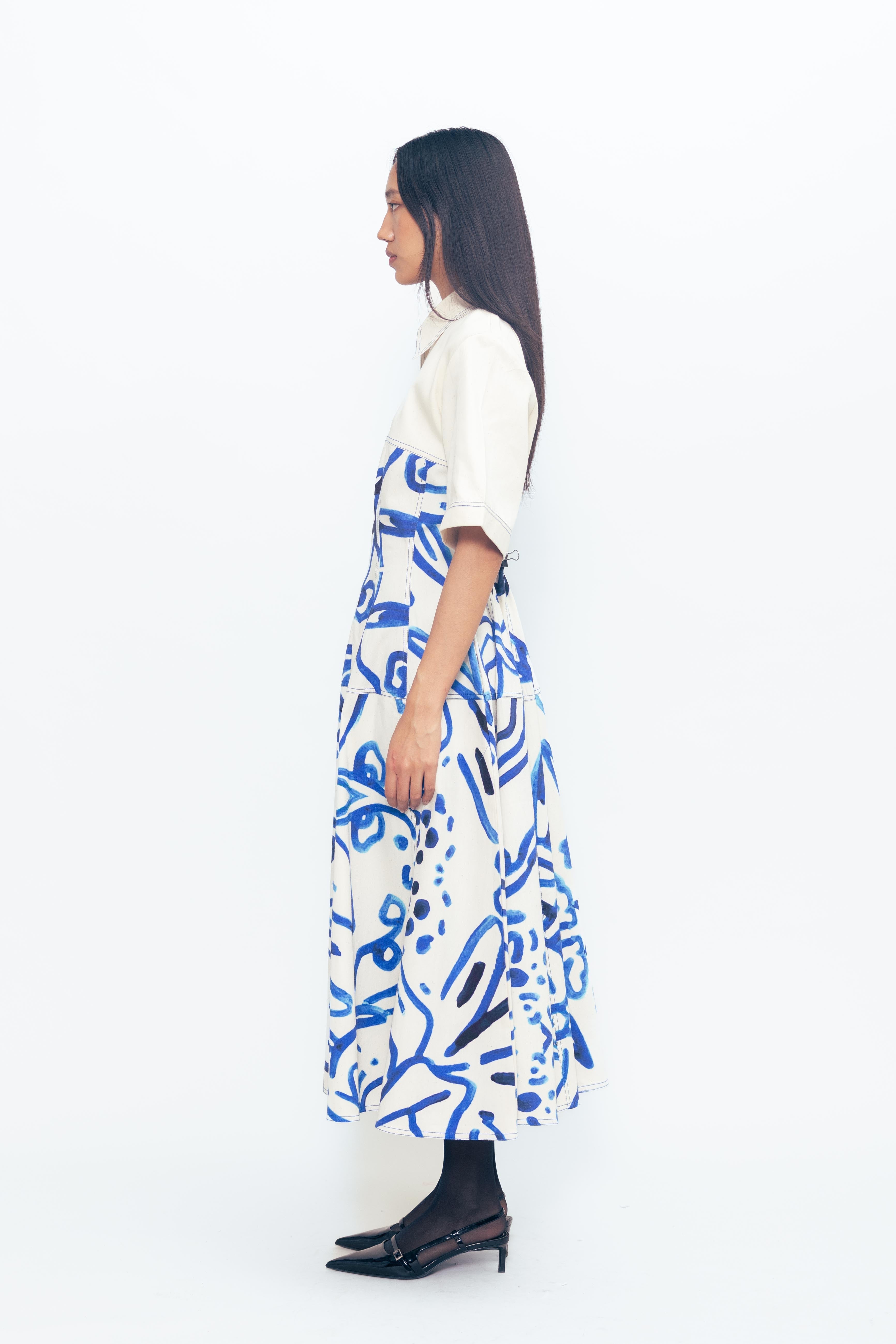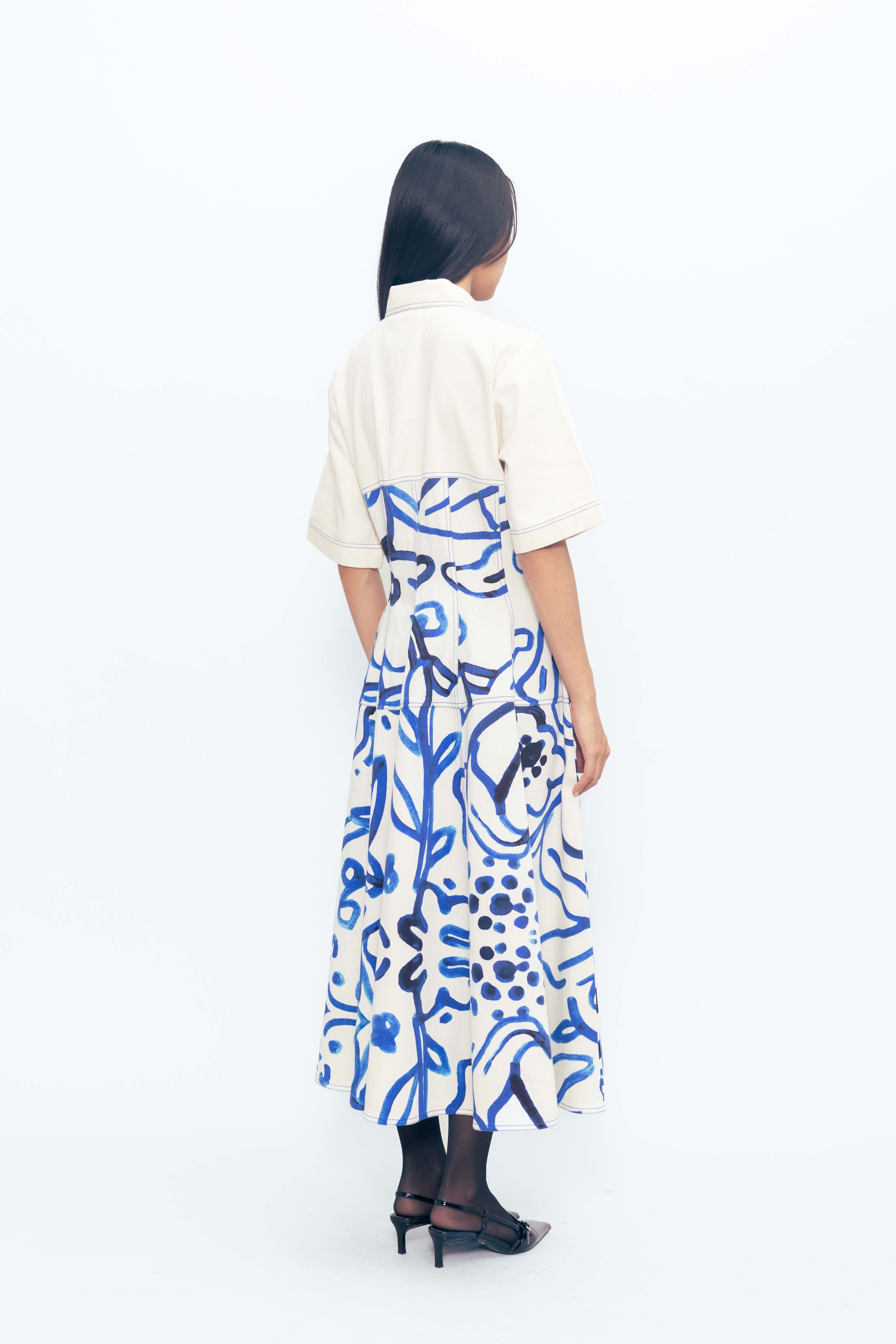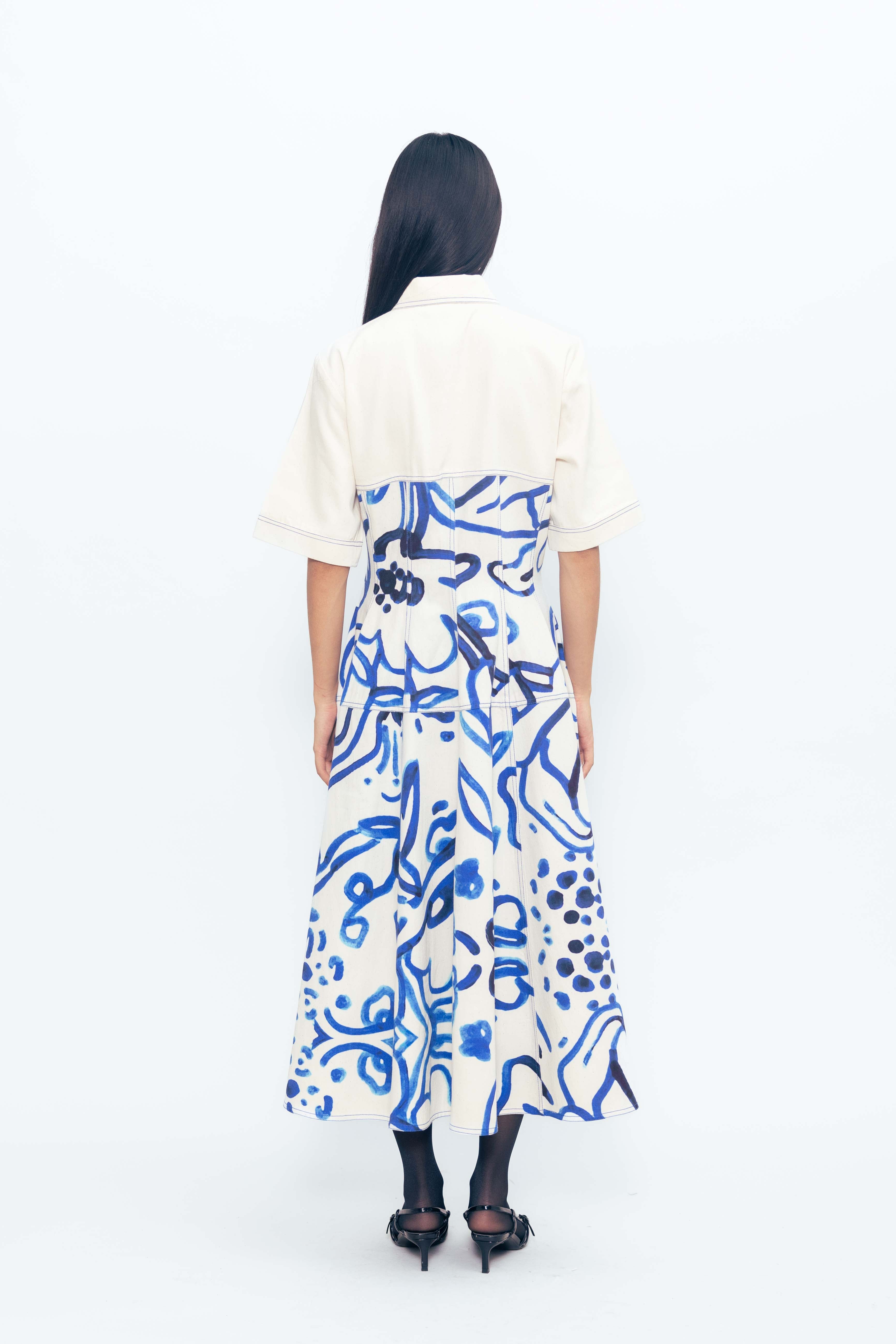 The solid yoke with print paneled midi dress offers a balanced blend of structure and fluidity. Featuring a clean, solid yoke that transitions into artfully arranged printed panels, it creates a striking visual contrast with effortless flow.
