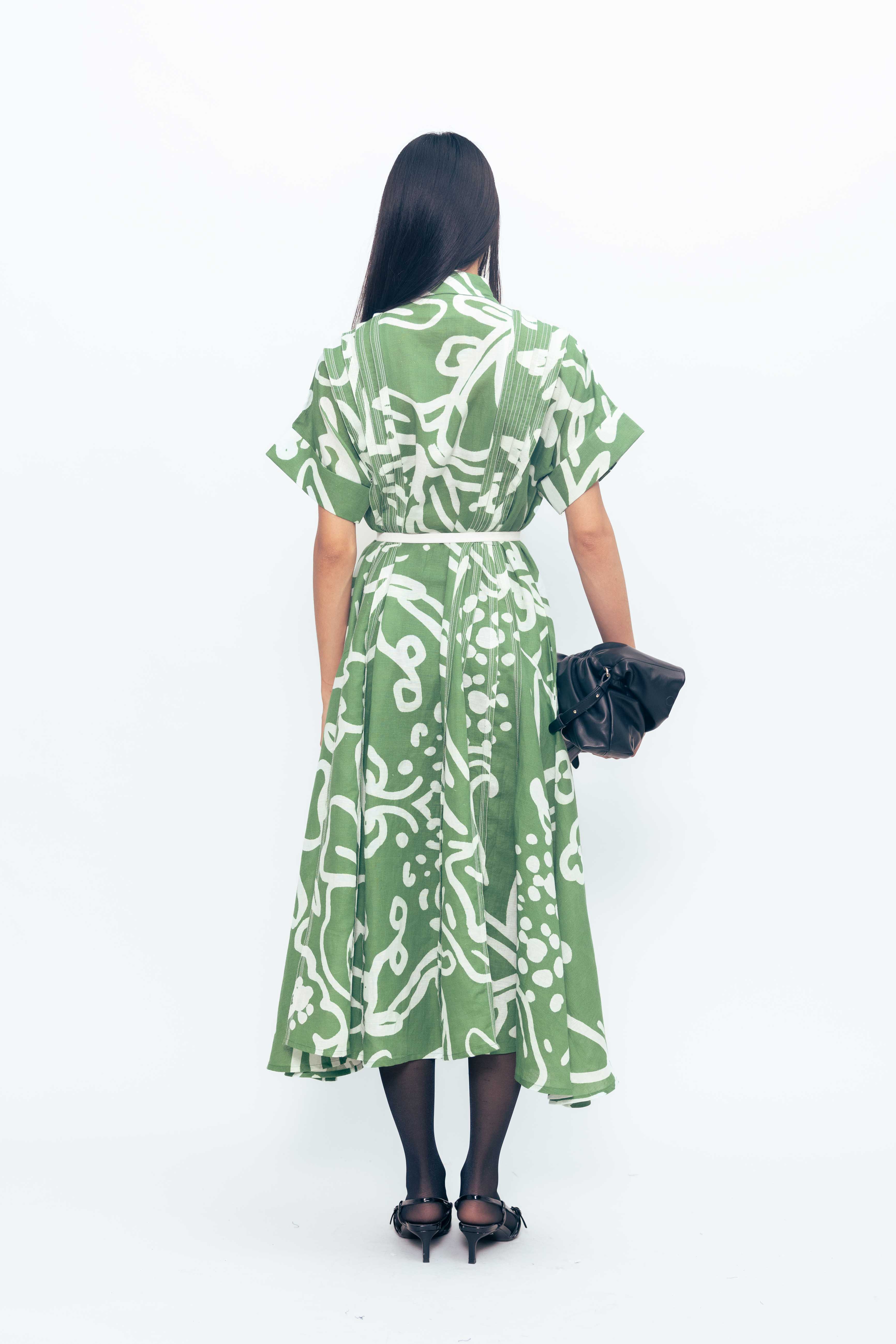 This midi dress blends understated structure with delicate detailing for a quietly refined look. Pintuck accents offer subtle texture, while contrast topstitching highlights the silhouette with thoughtful precision.