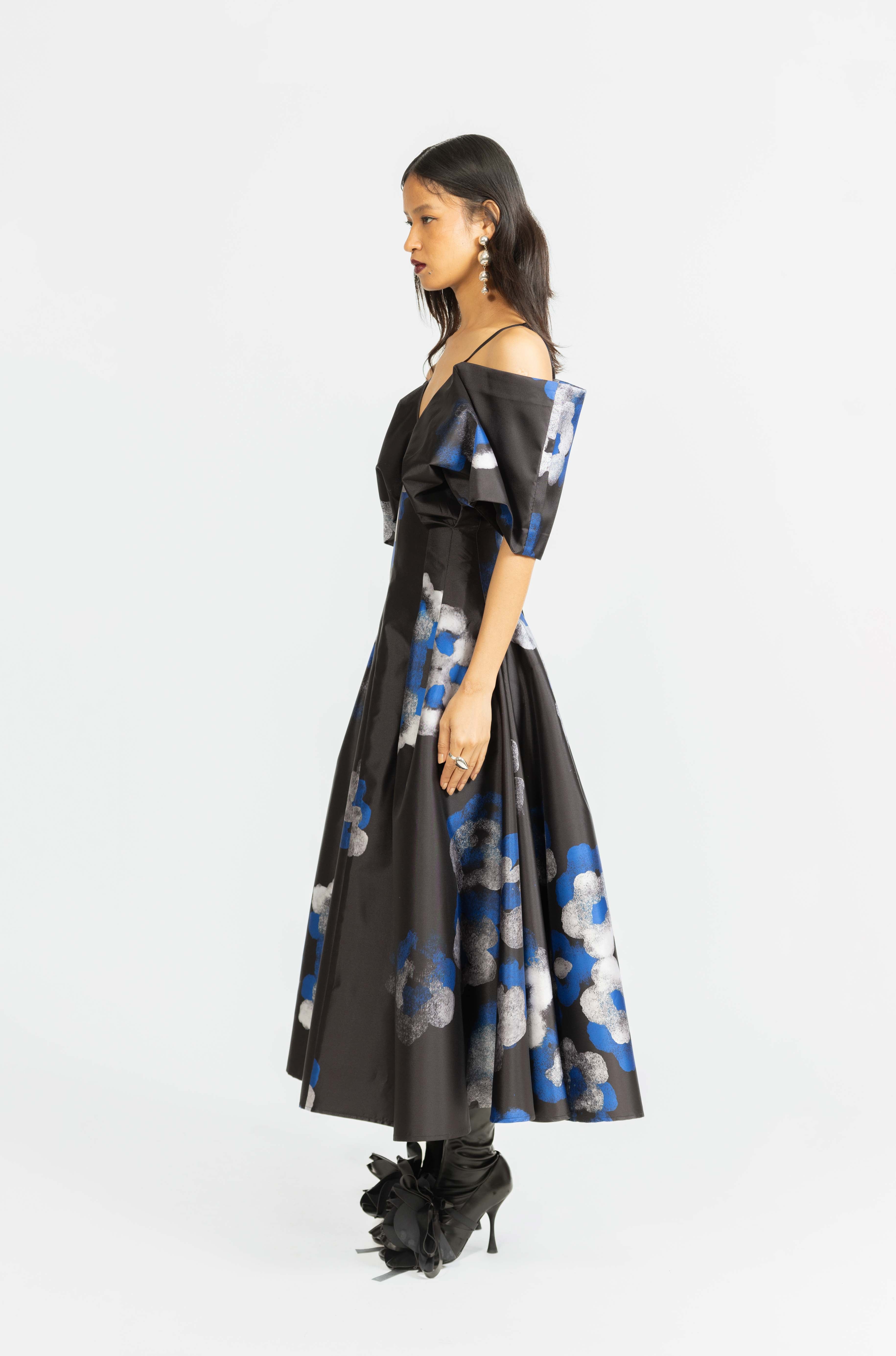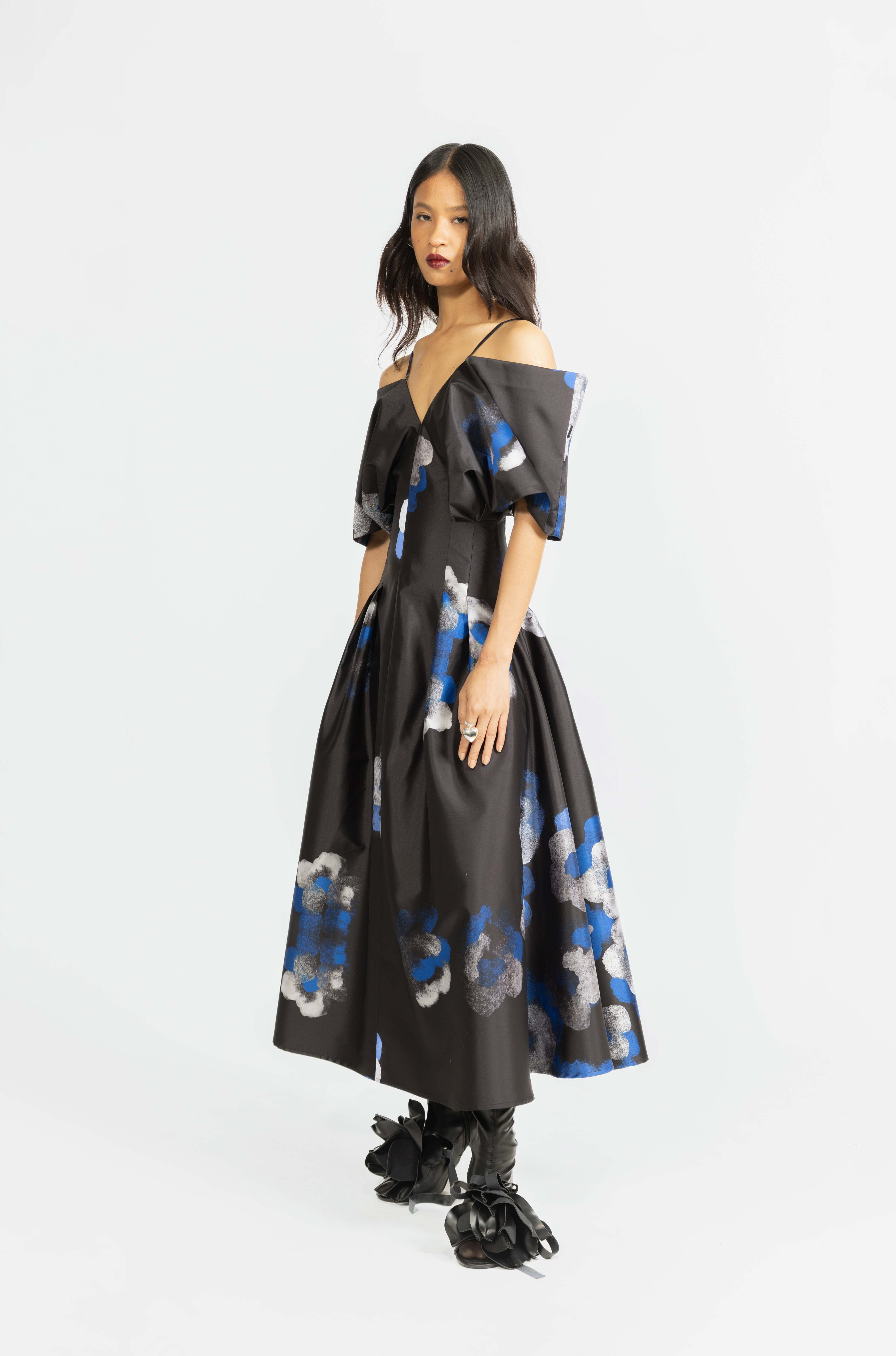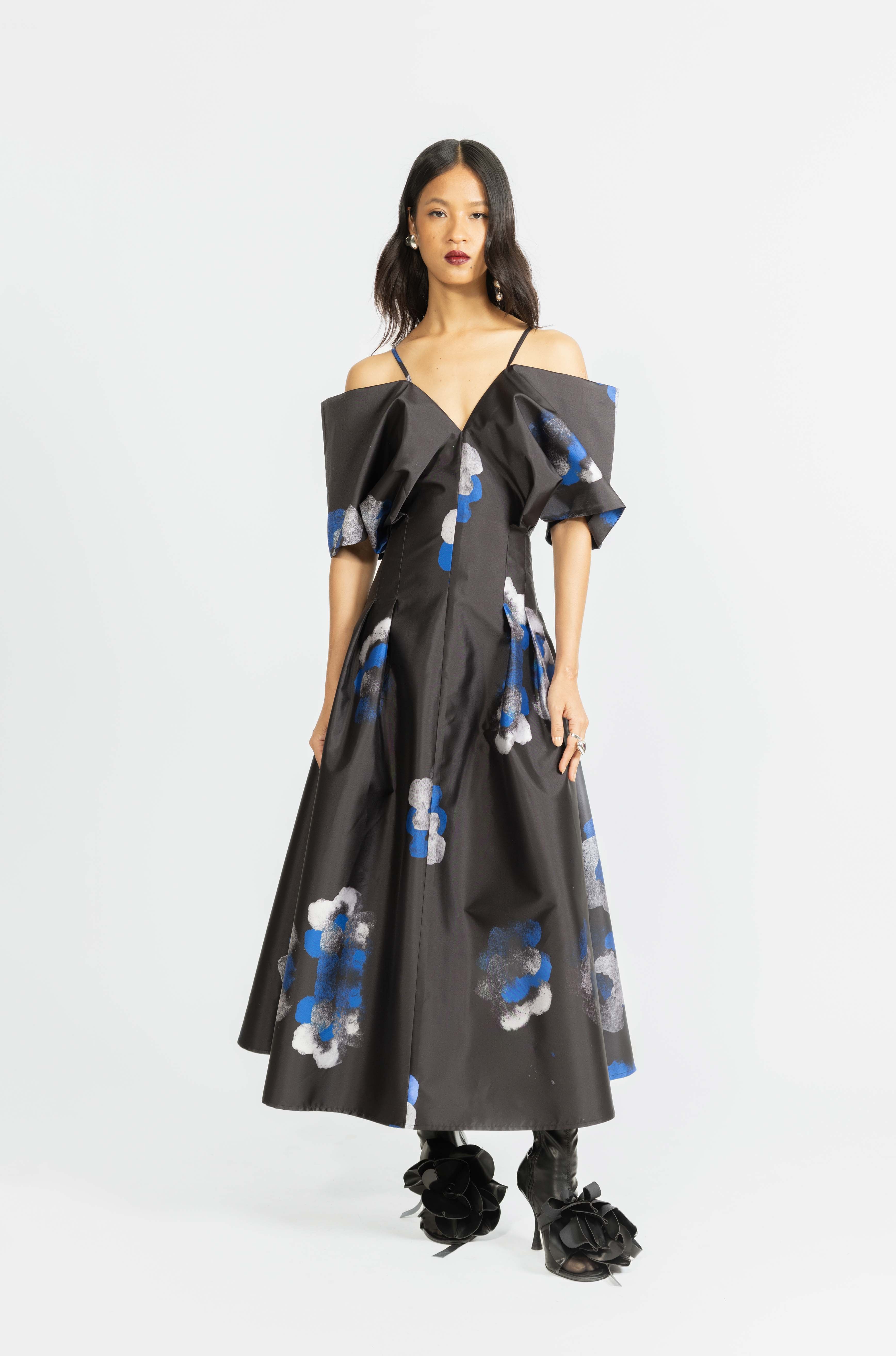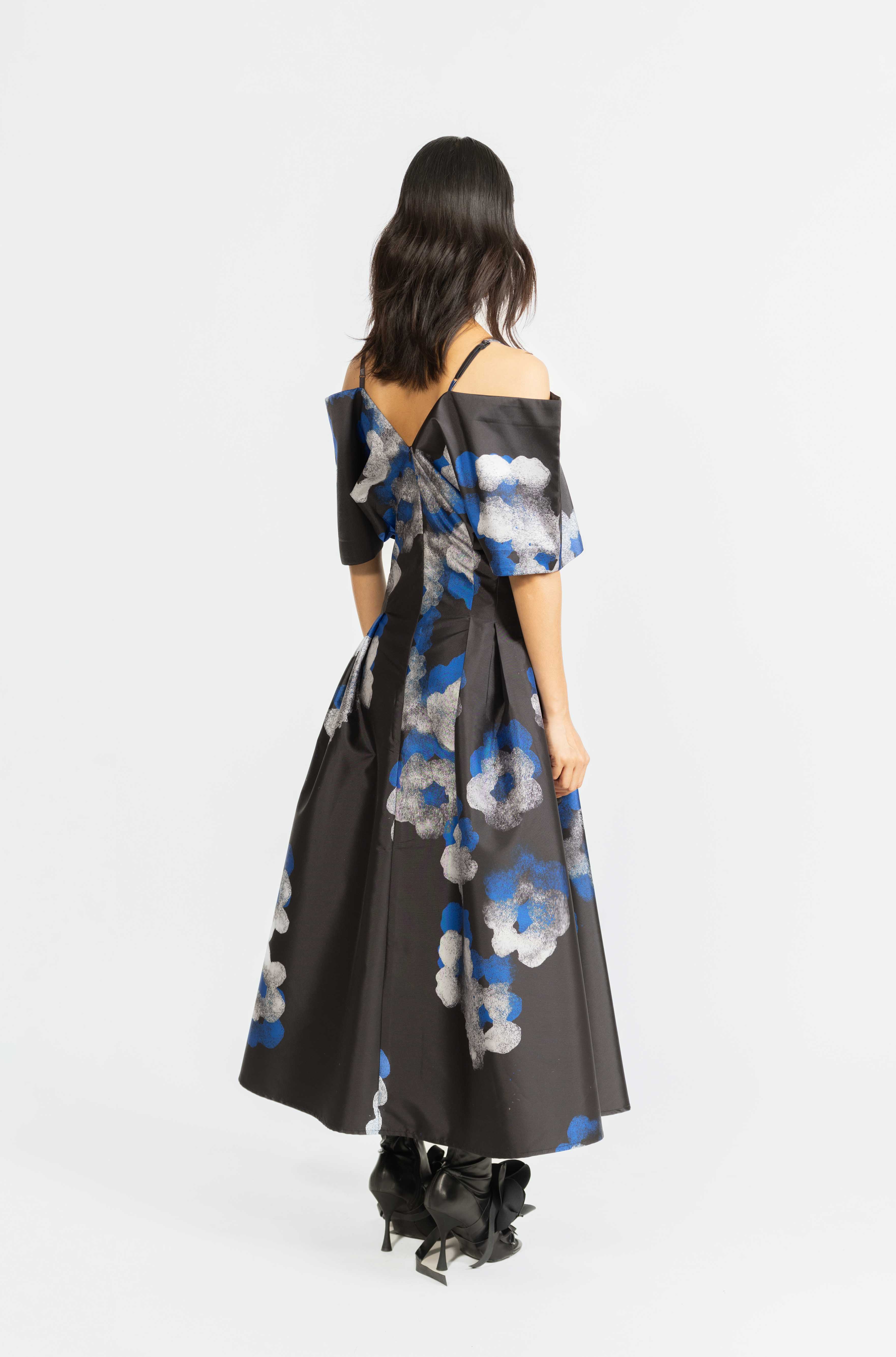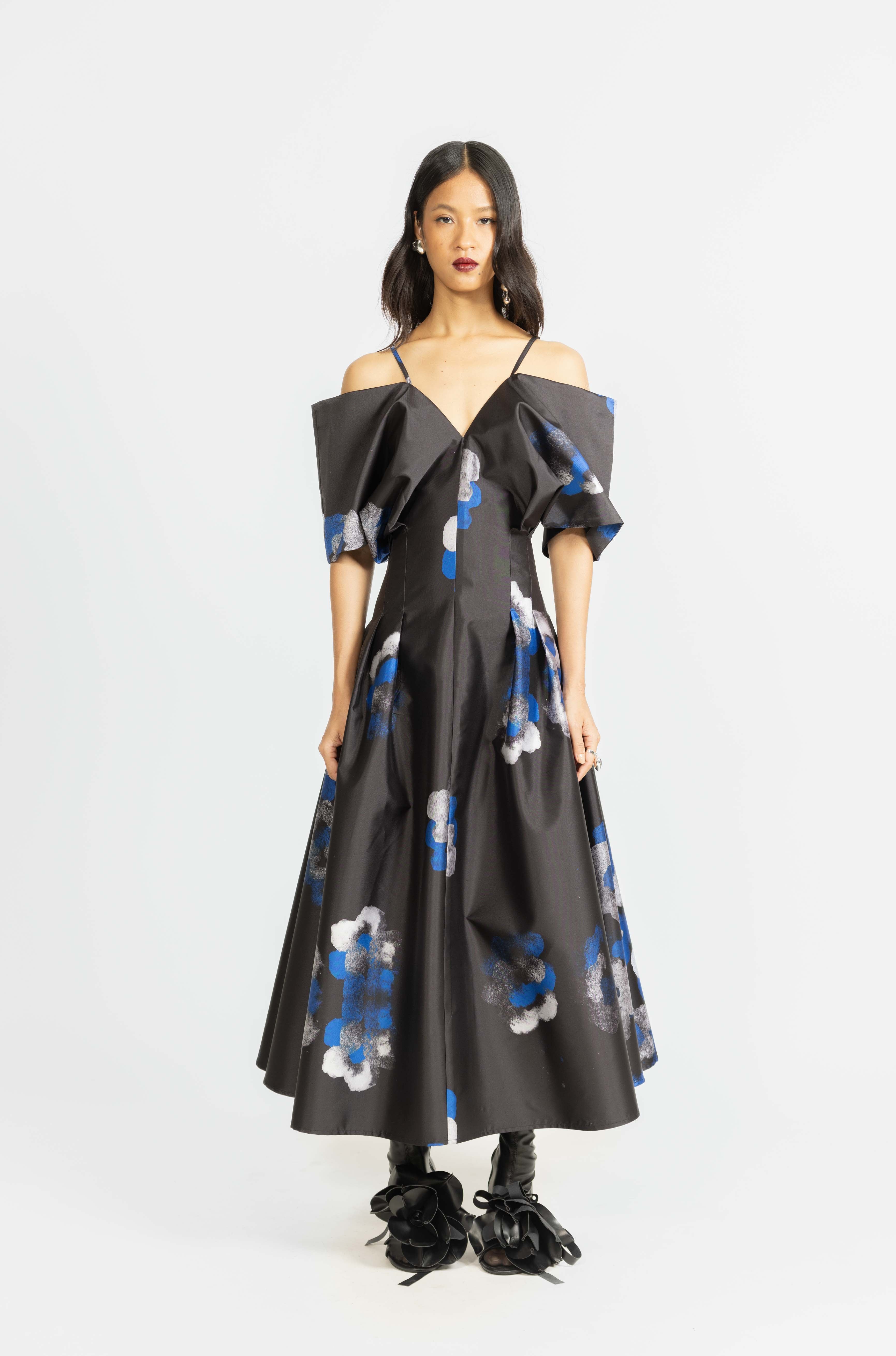 A voluminous silhouette commands attention with bold proportions and sculptural folds. Oversized motifs bring playful contrast to the crisp surface, while the off-shoulder neckline and structured pleats frame the form with intention.