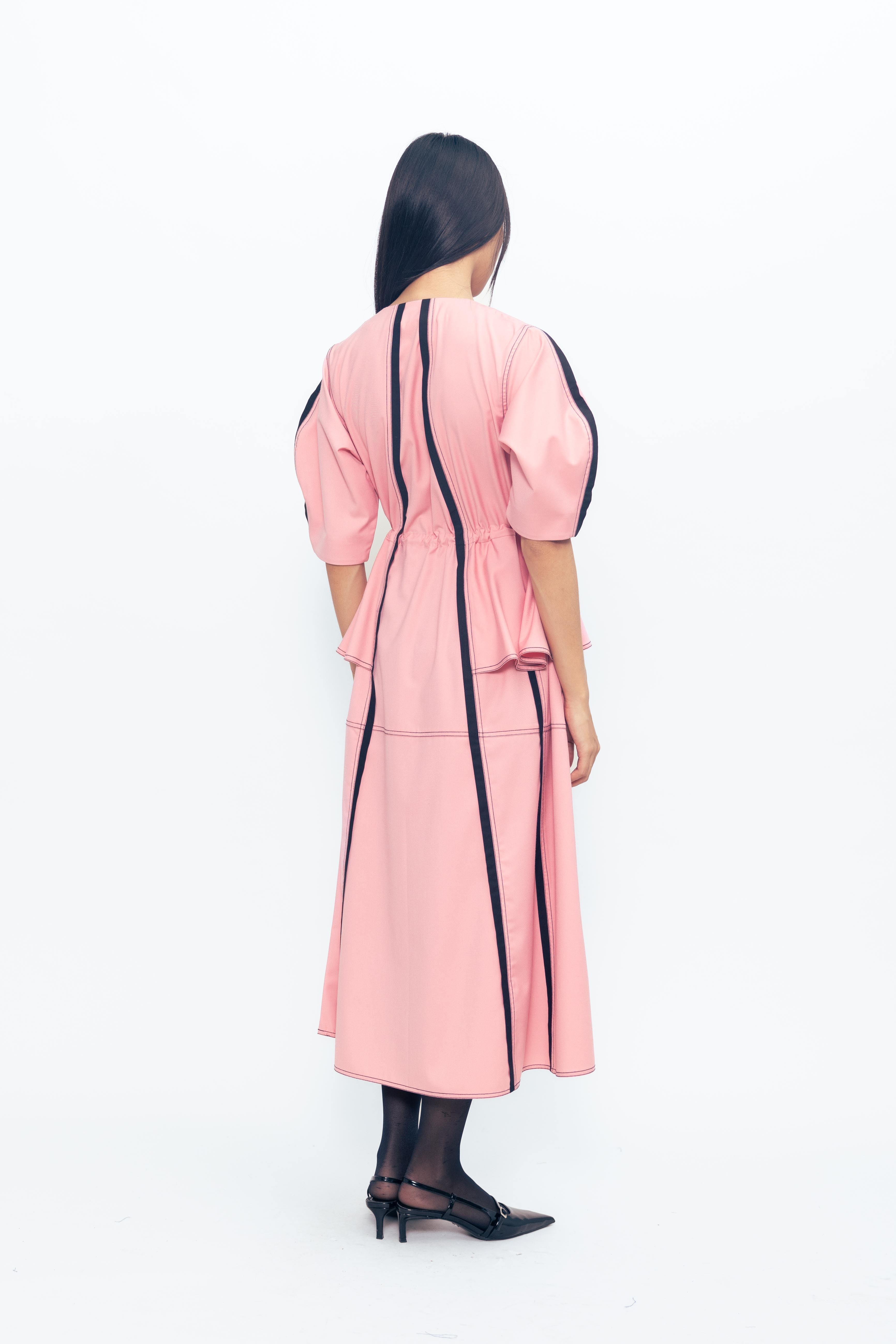 This dress reimagines classic volume with a modern edge through its dramatic leg o' mutton sleeves and clean, structured silhouette. The drawstring detailing allows for subtle shaping, adding versatility to the form. With its smooth drape and bold contrast palette, it strikes a balance between statement-making and effortlessly wearable—ideal for day-to-night transitions with a twist
