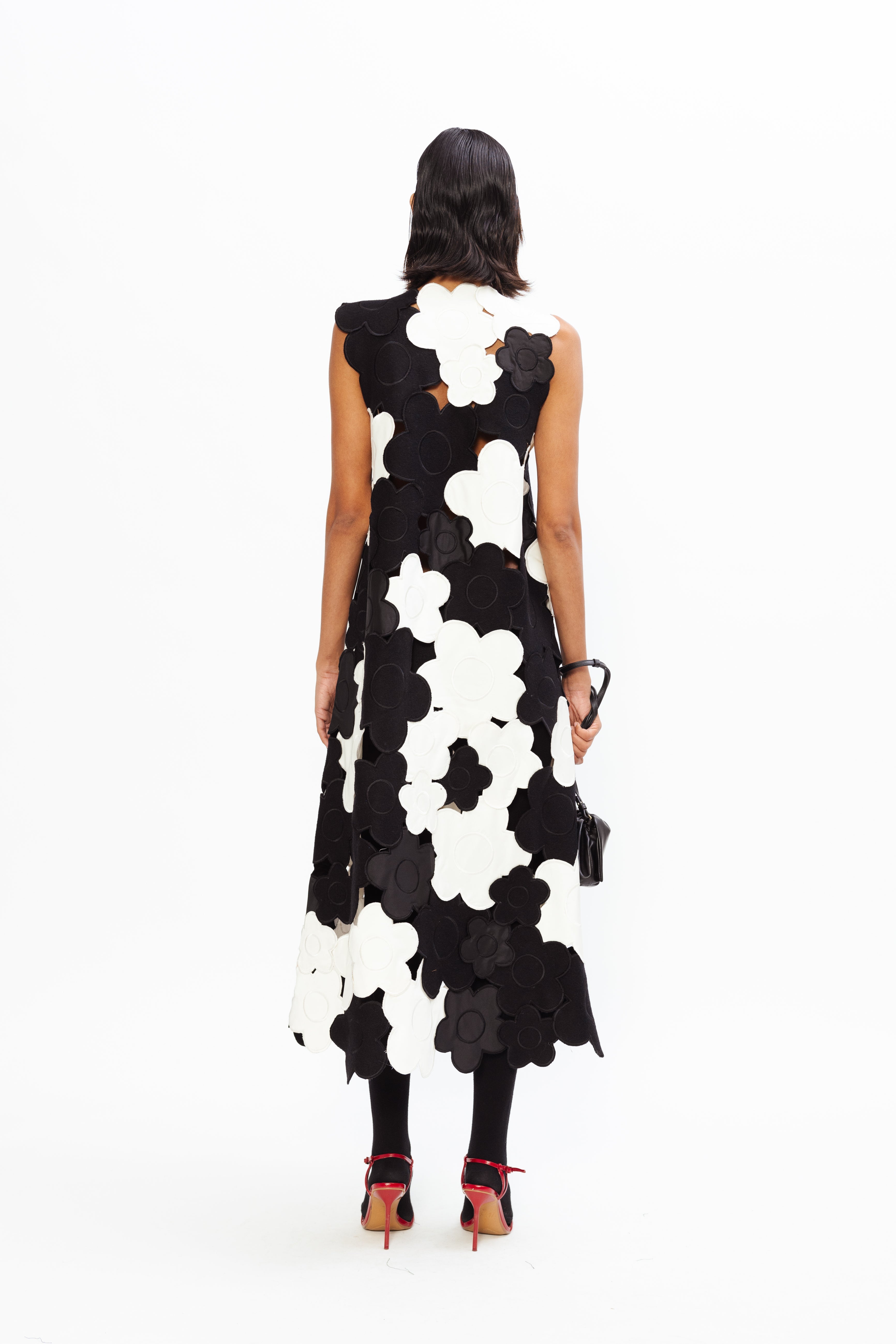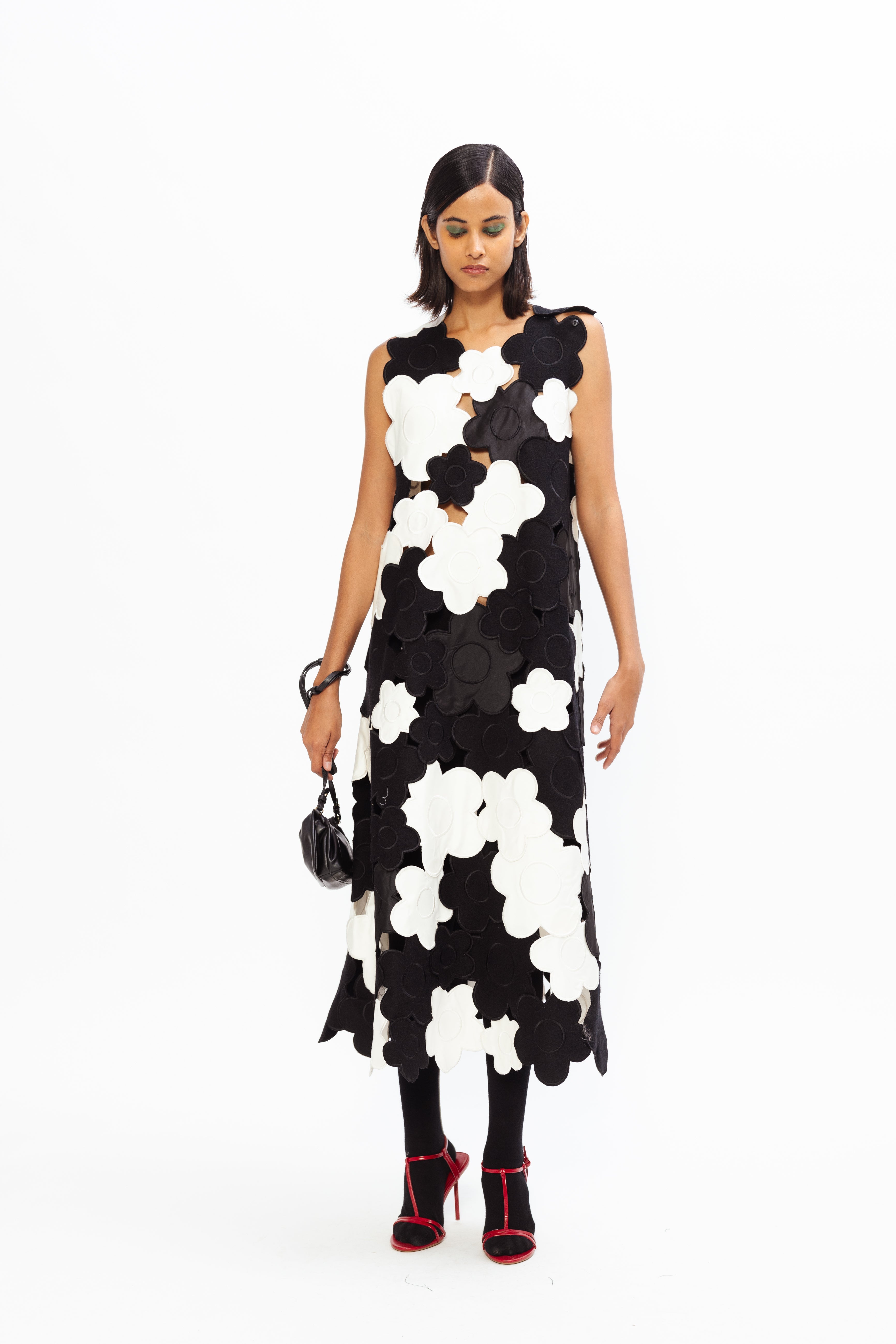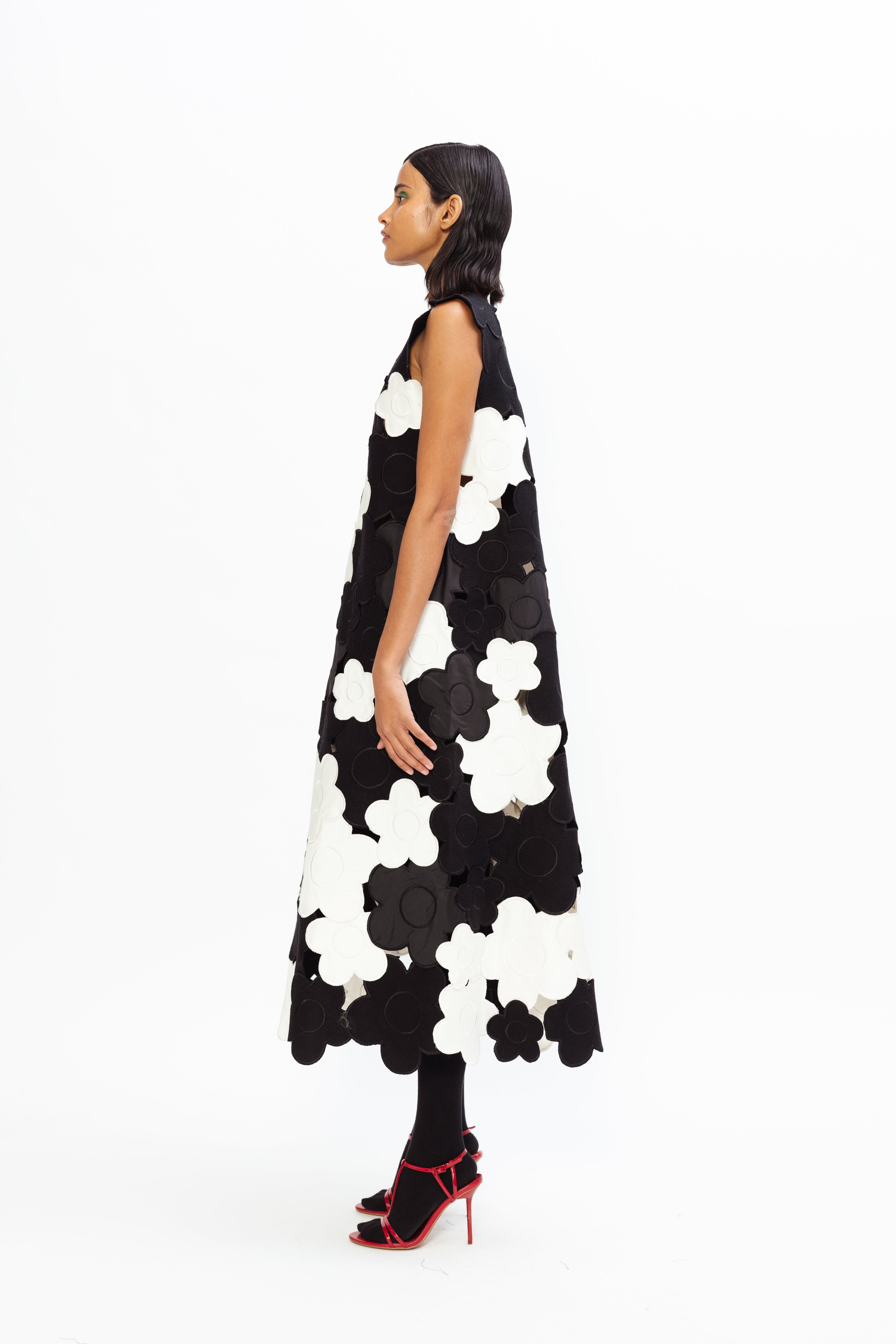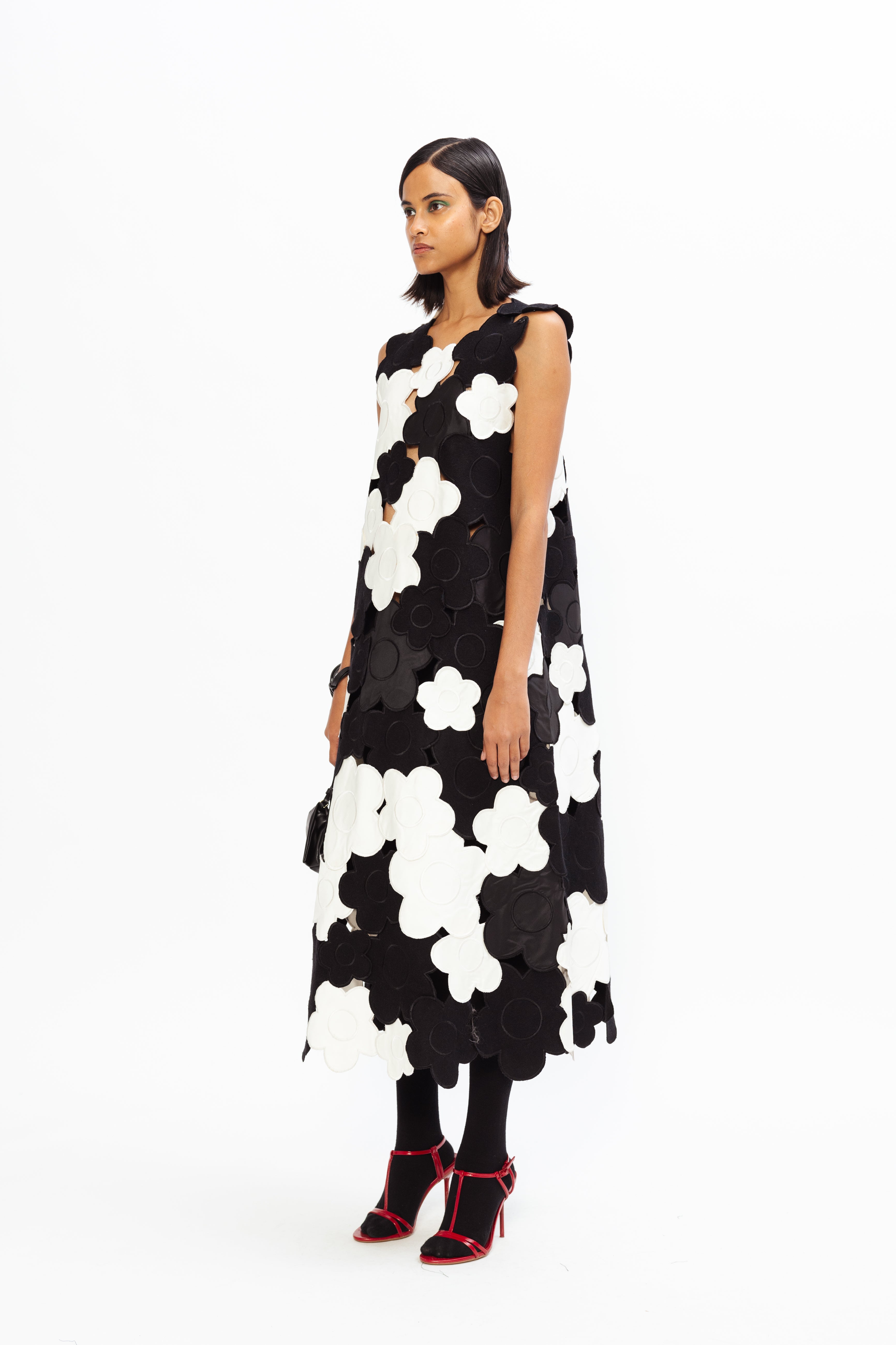 A chic dress featuring an elegant appliqué bloom panelled design. Delicately crafted black and white floral appliqués add a striking contrast, creating a statement look that’s both modern and timeless.