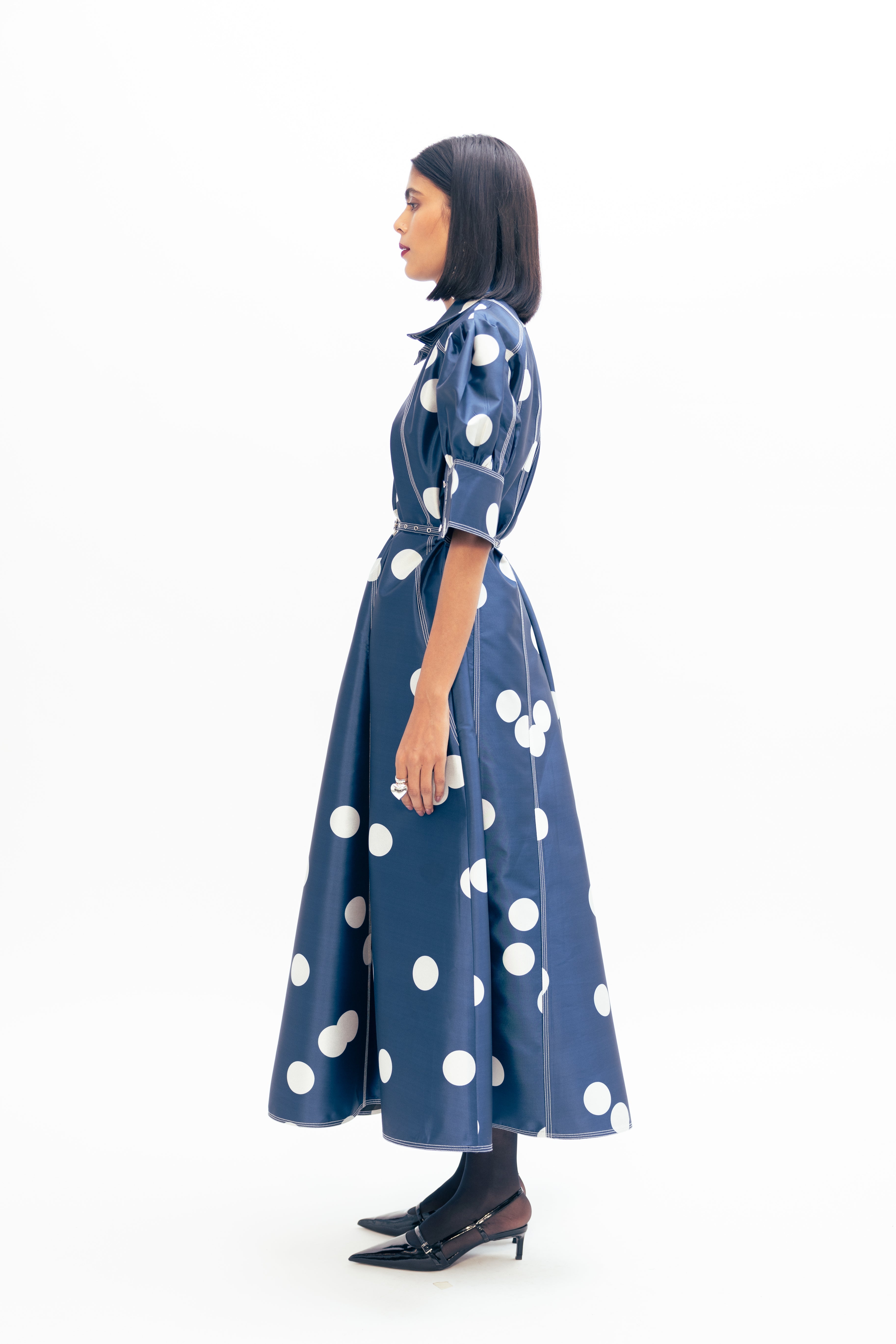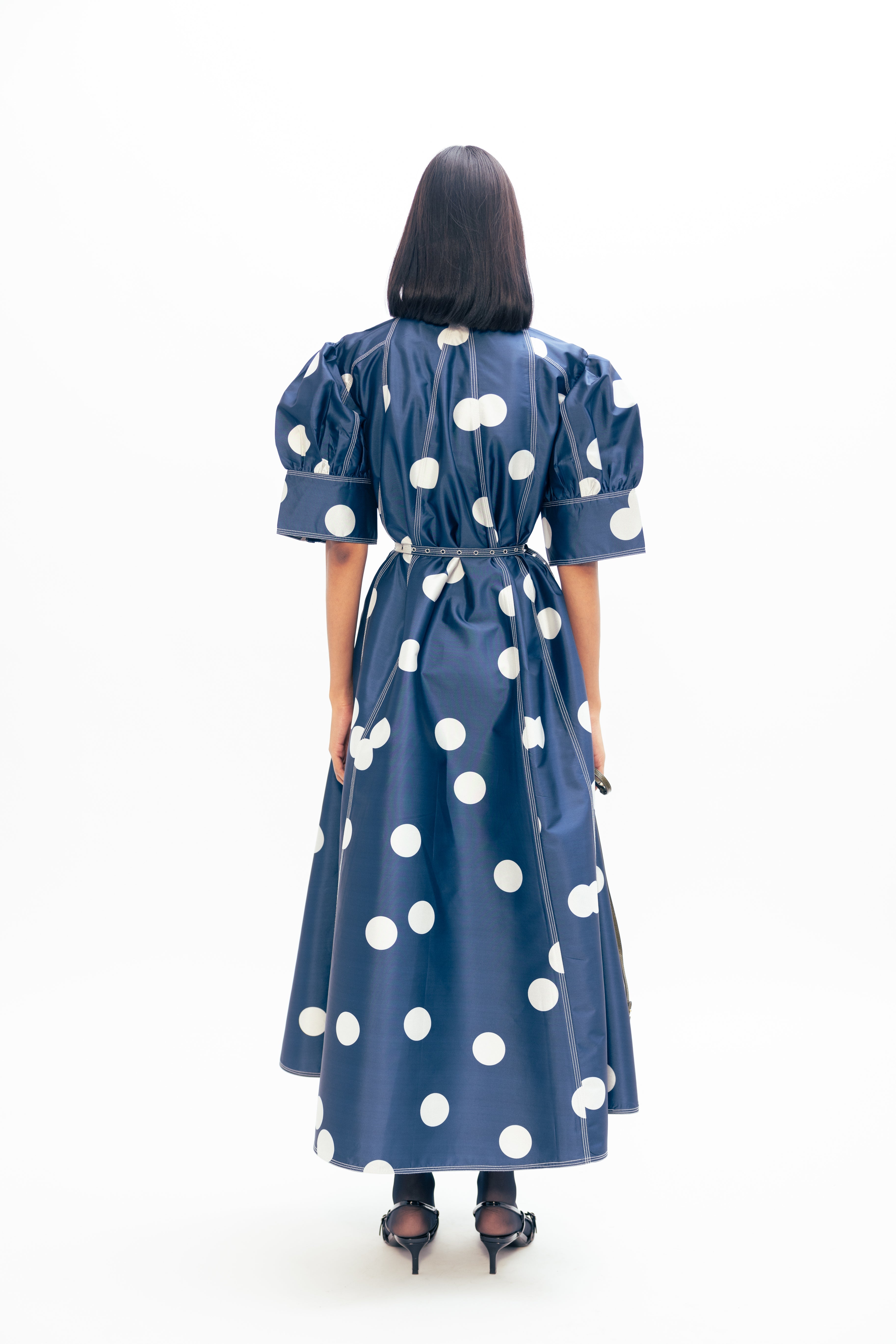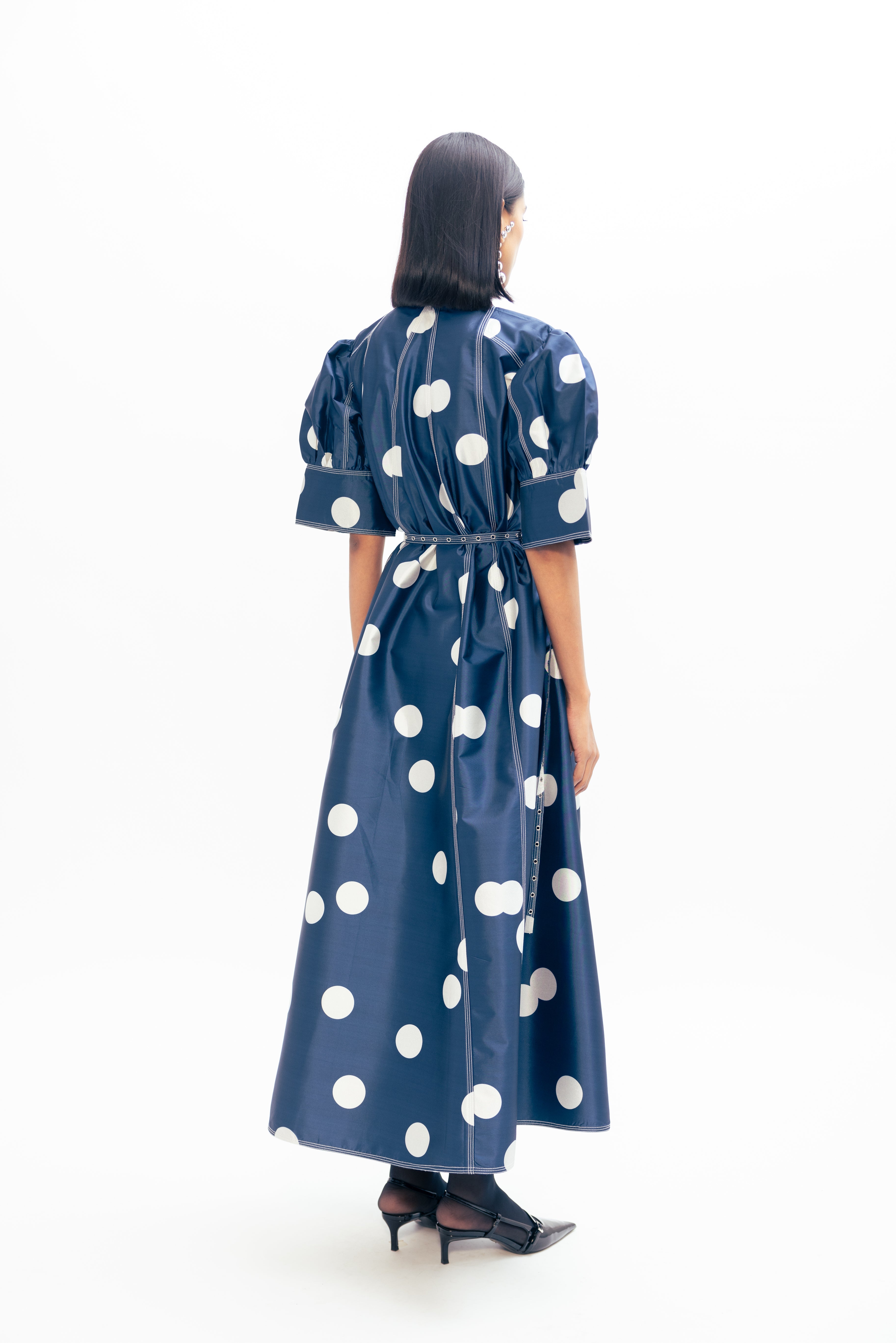 Materials: Taffeta Color: Blue with Ivory Polka