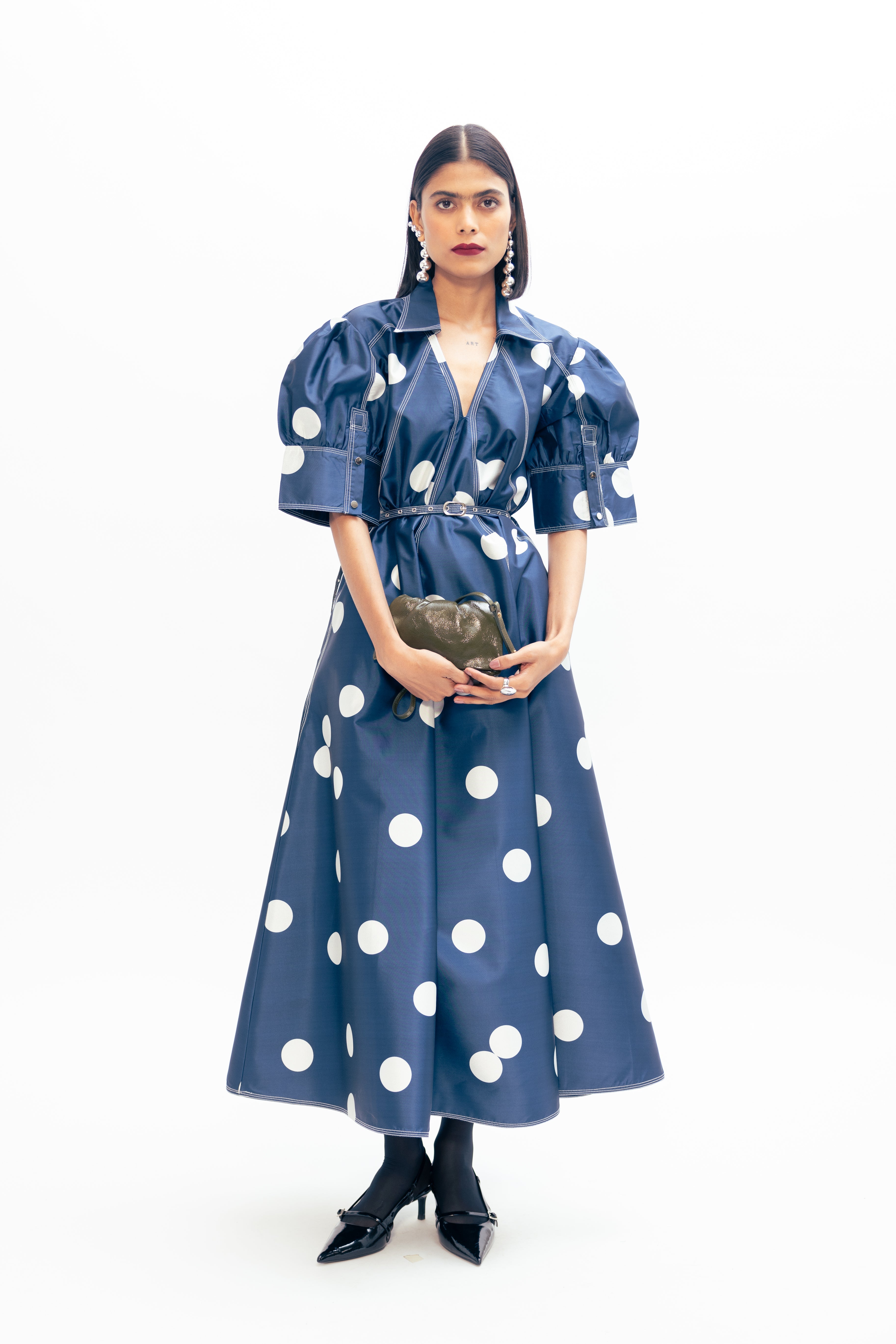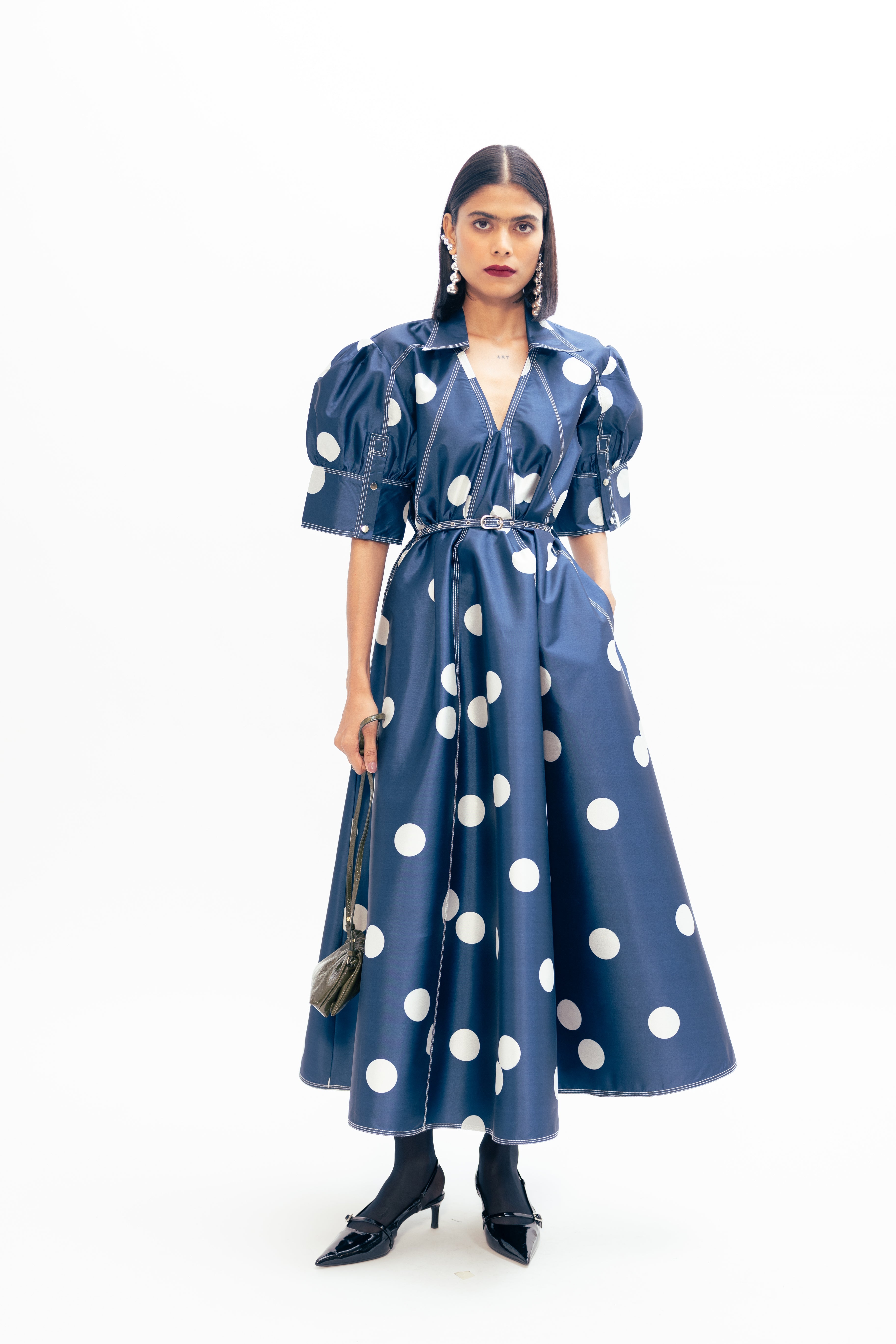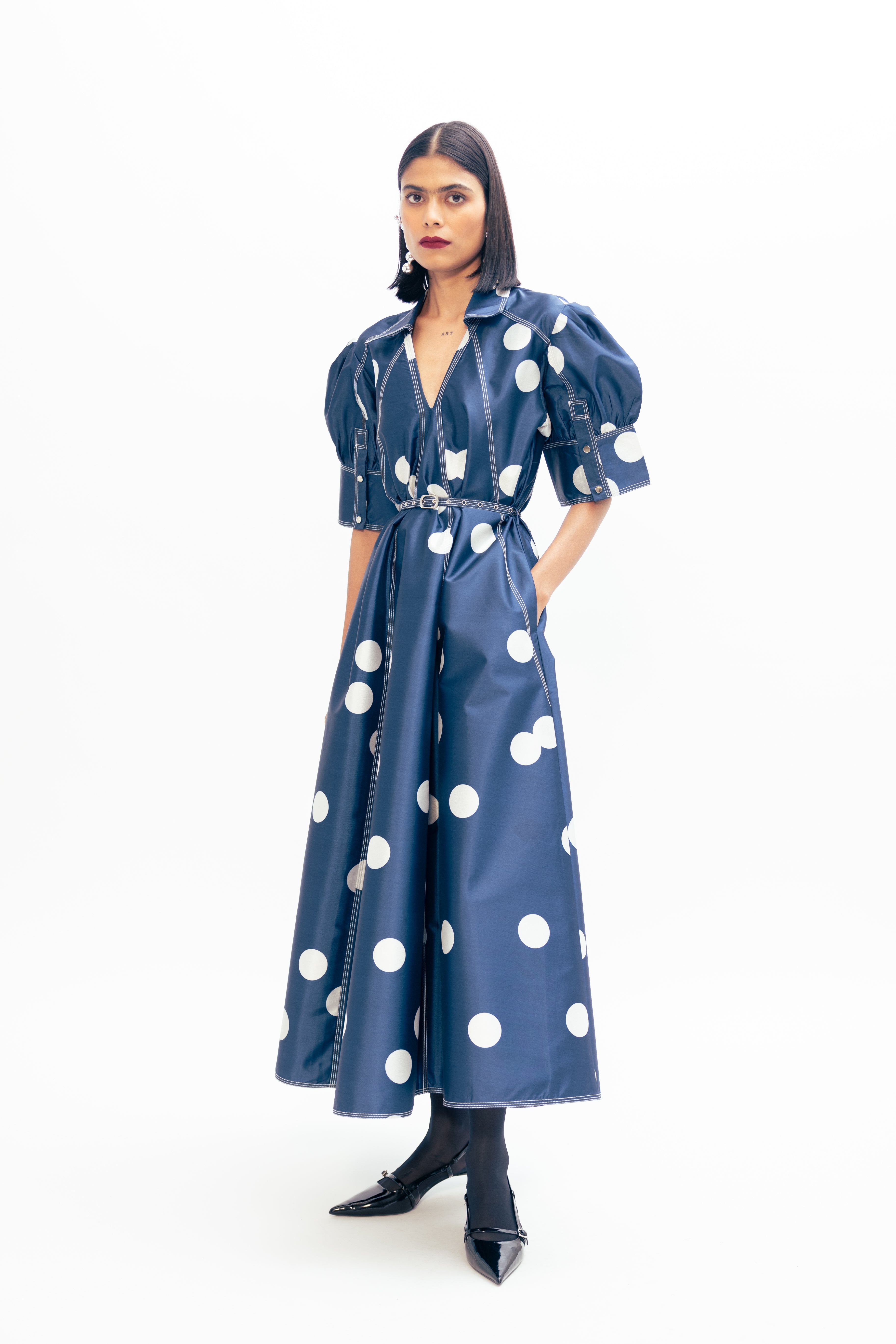 Materials: Taffeta Color: Blue with Ivory Polka