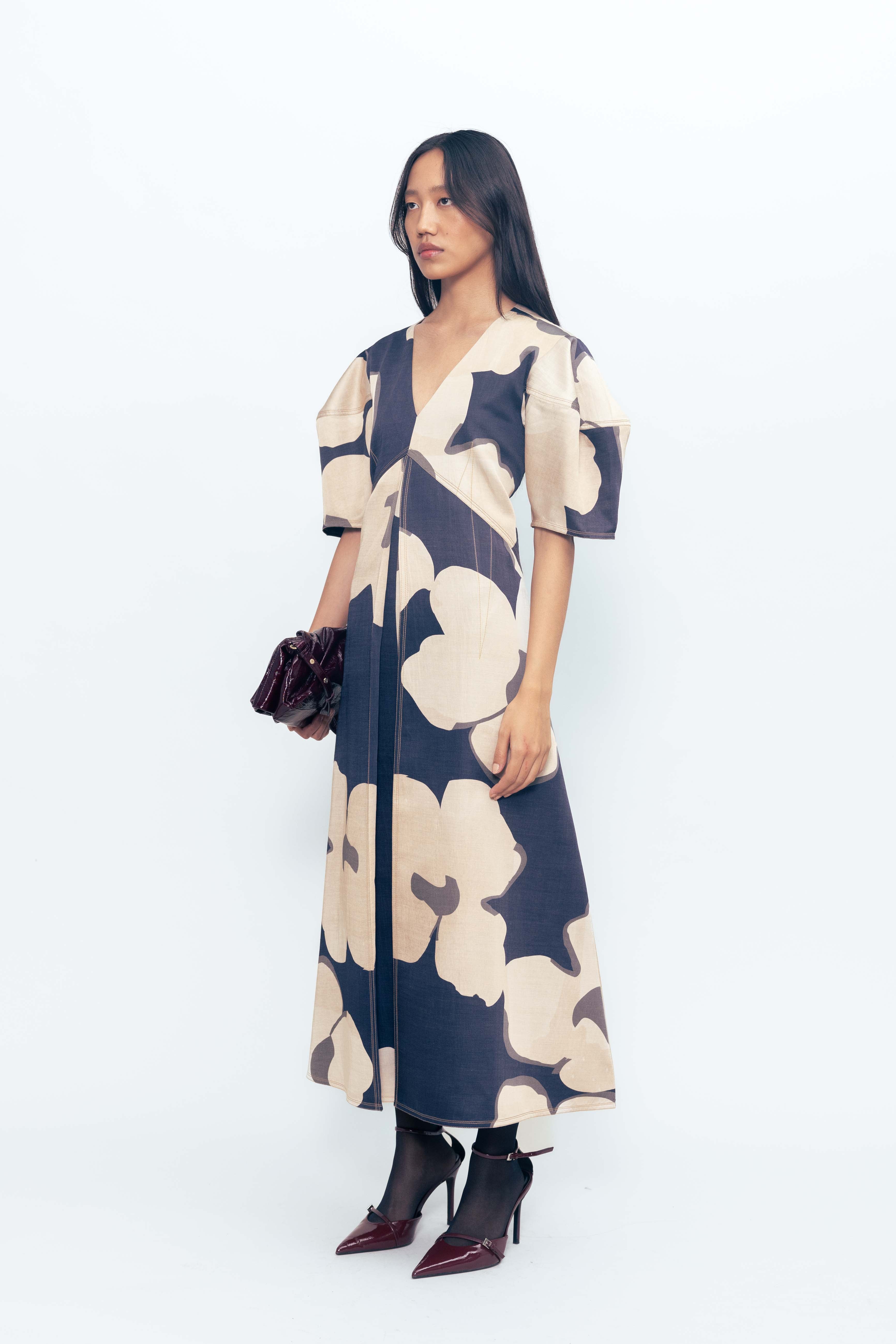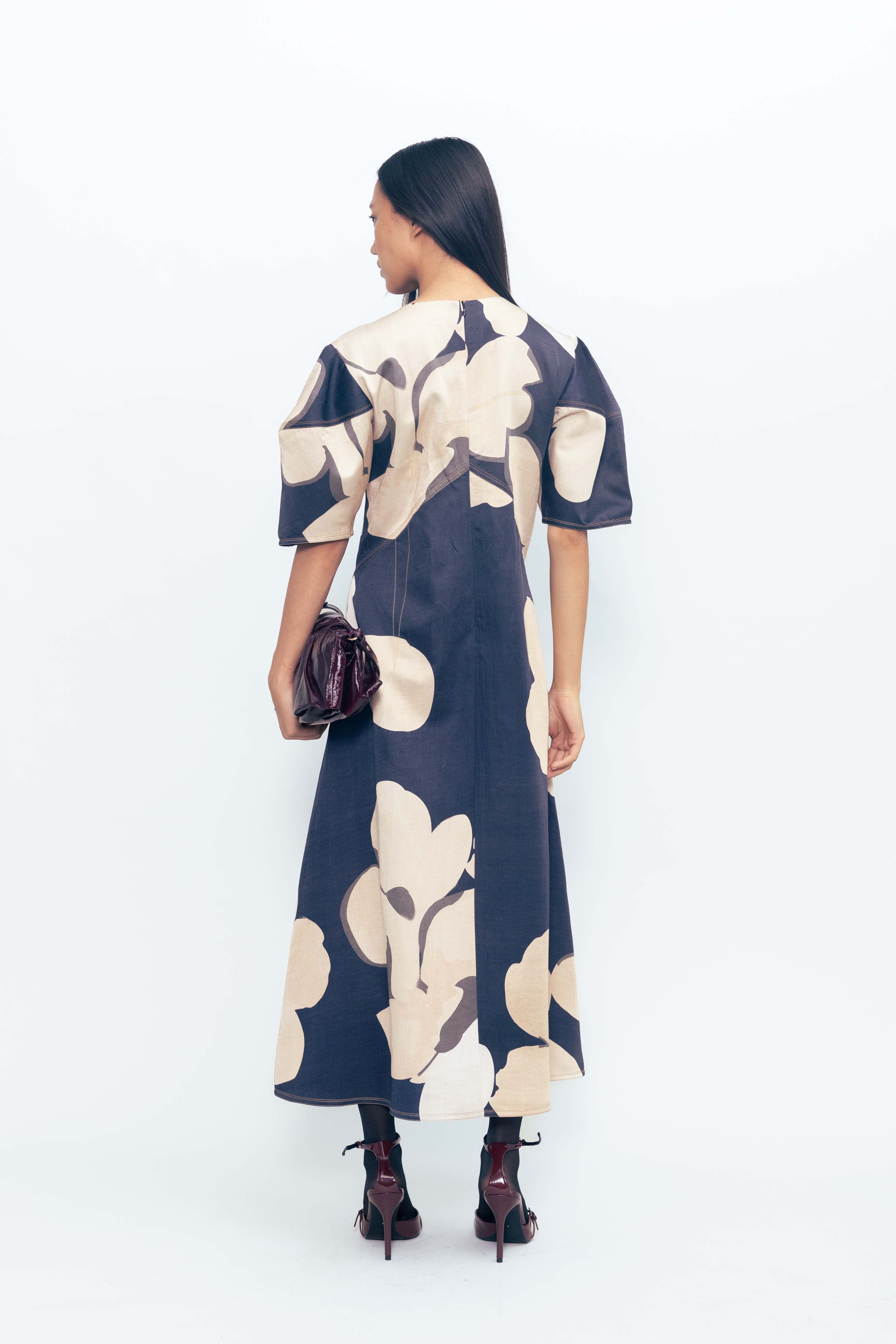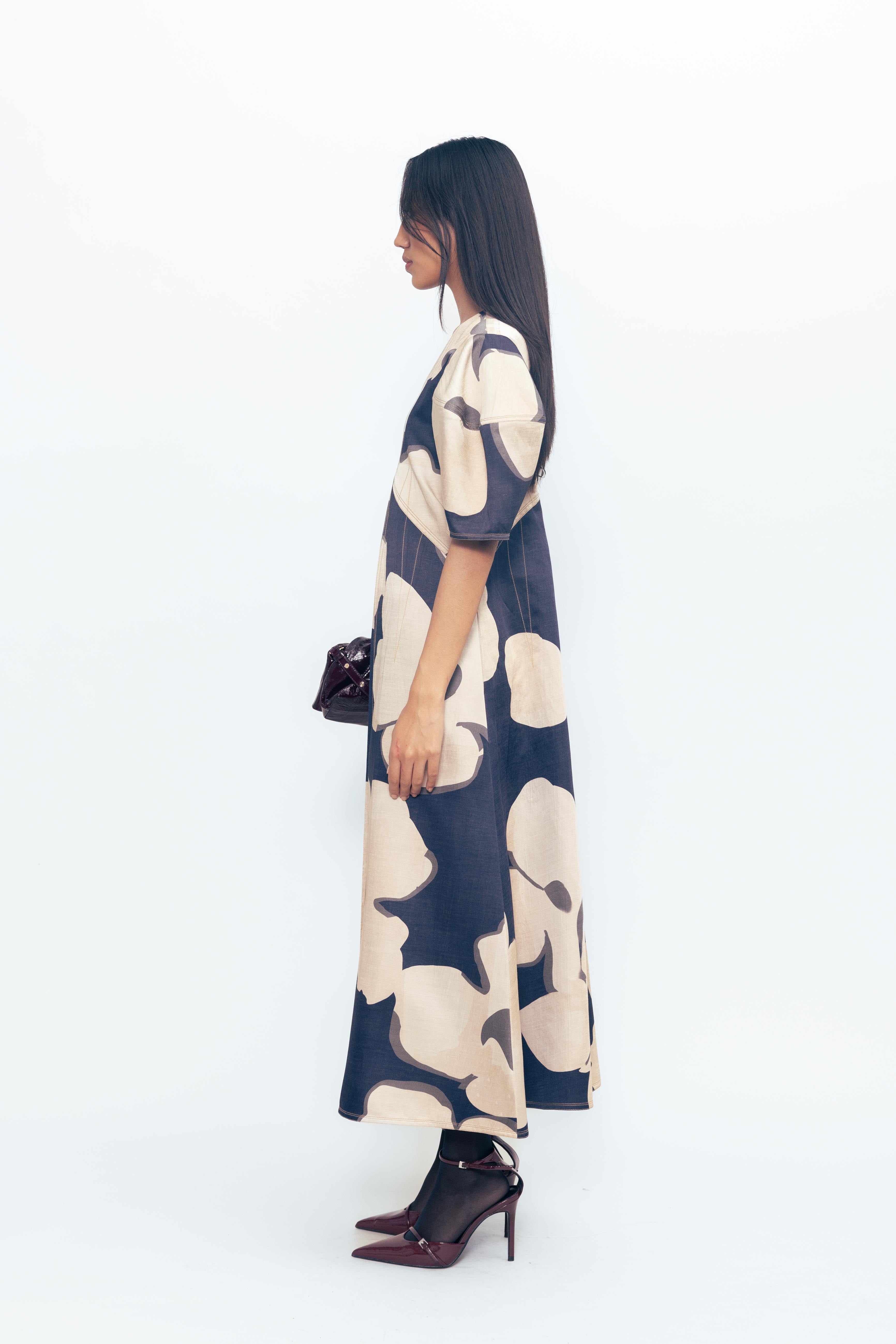 This day dress pairs a flattering fit-and-flare silhouette with a soft, breathable feel that moves with ease. The structured bodice gently defines the waist, while the skirt flows into a relaxed flare for all-day comfort. Featuring an expressive floral print, it brings a touch of artistry to an effortlessly wearable shape—perfect for both casual days and elevated moments.