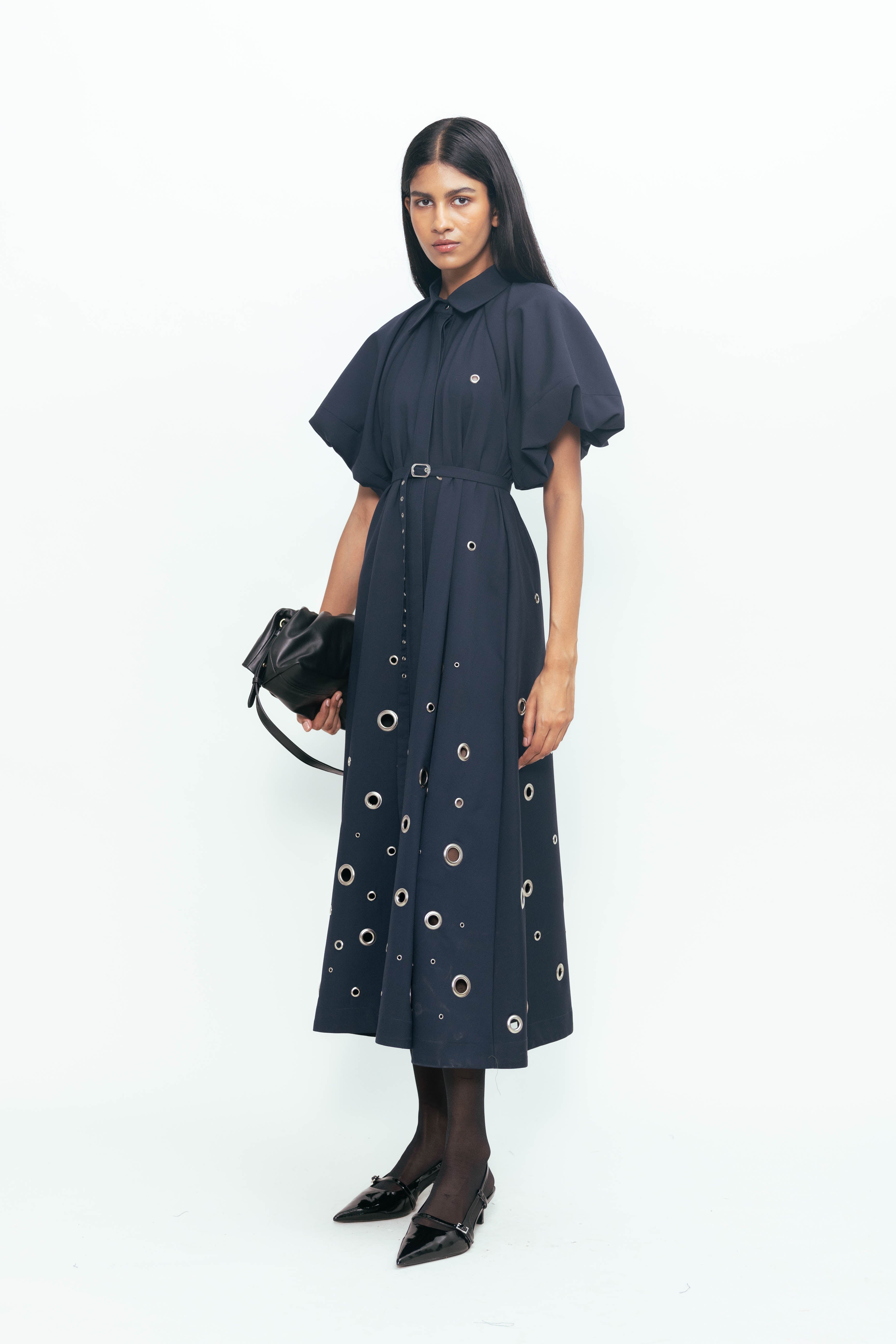 This dress combines classic volume with modern edge through its structured puff sleeves and striking rivet burst detailing. The smooth, tailored silhouette offers a clean foundation, while the metallic accents add bold texture and visual contrast. Refined yet expressive, it’s a standout piece that balances feminine shape with industrial-inspired finishes.