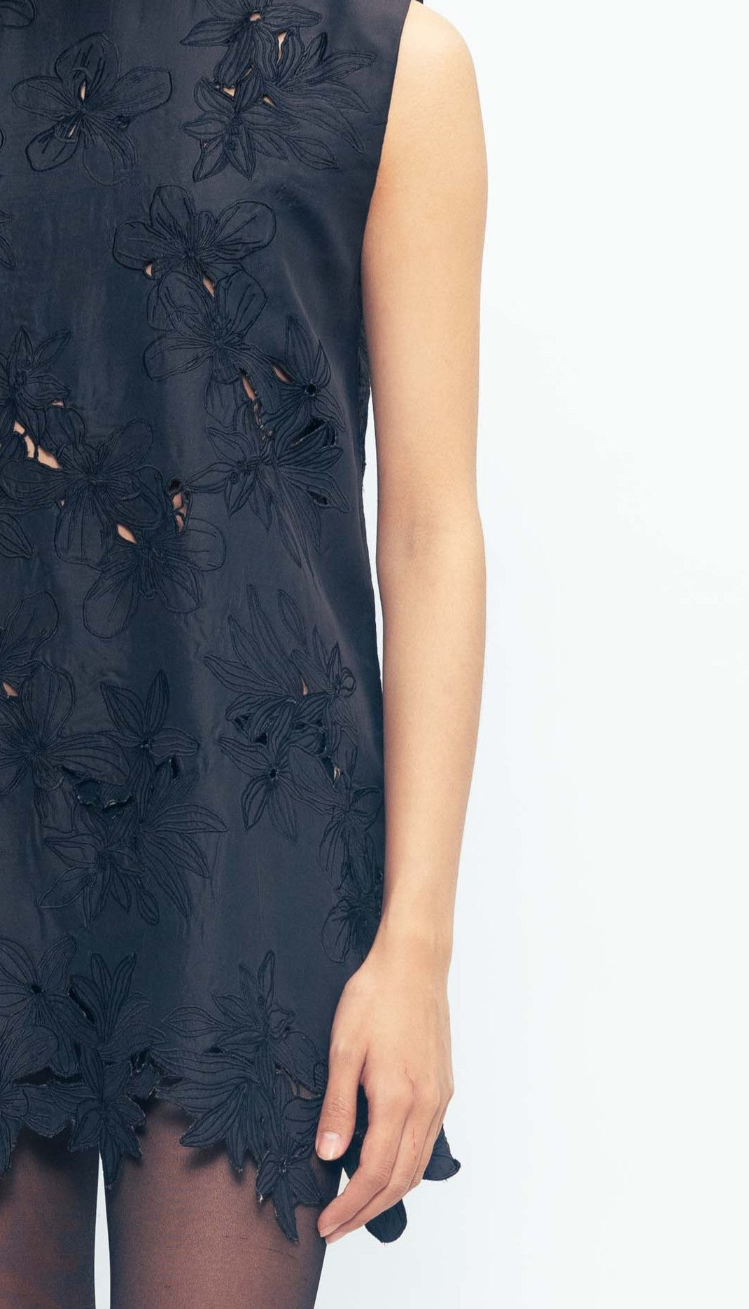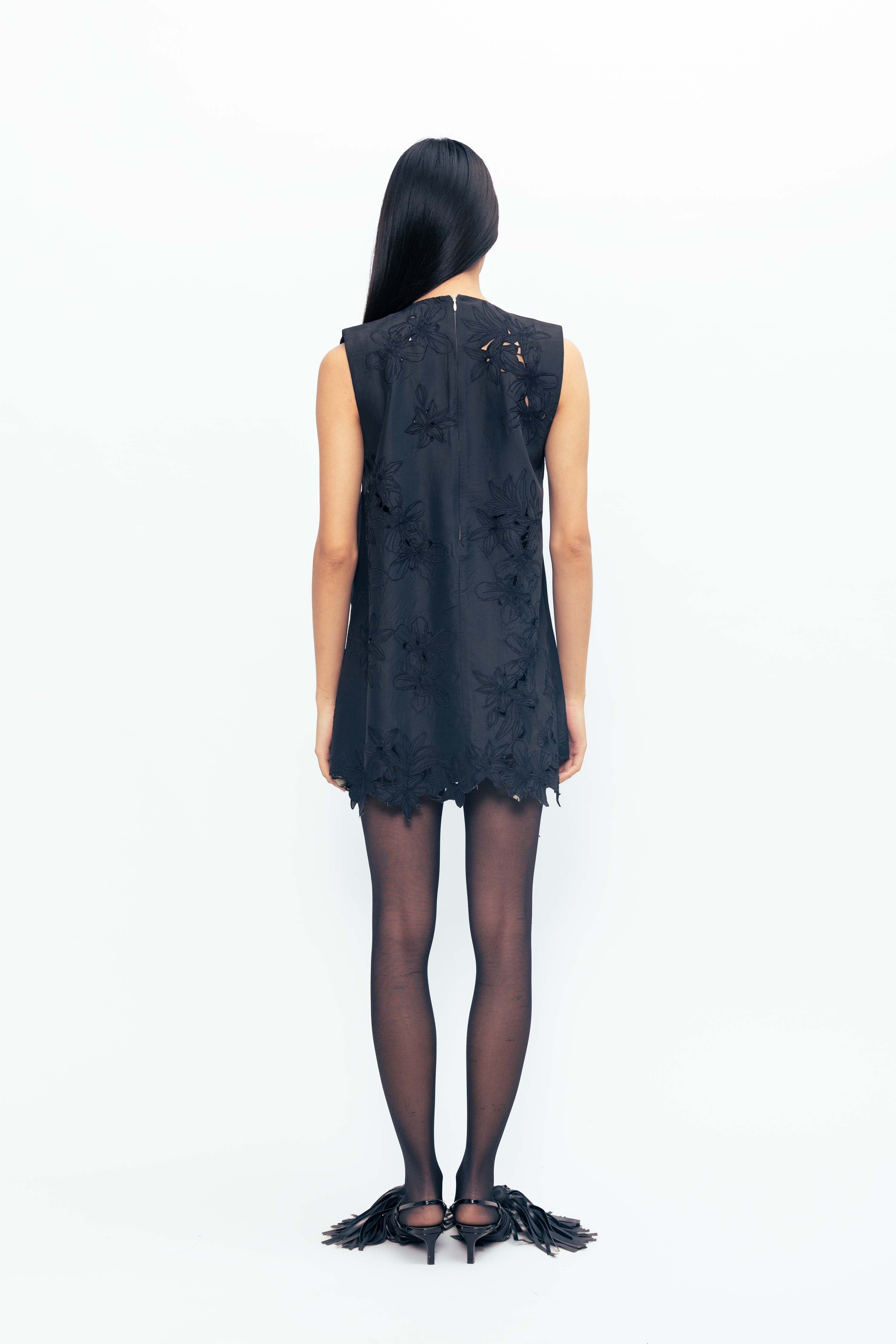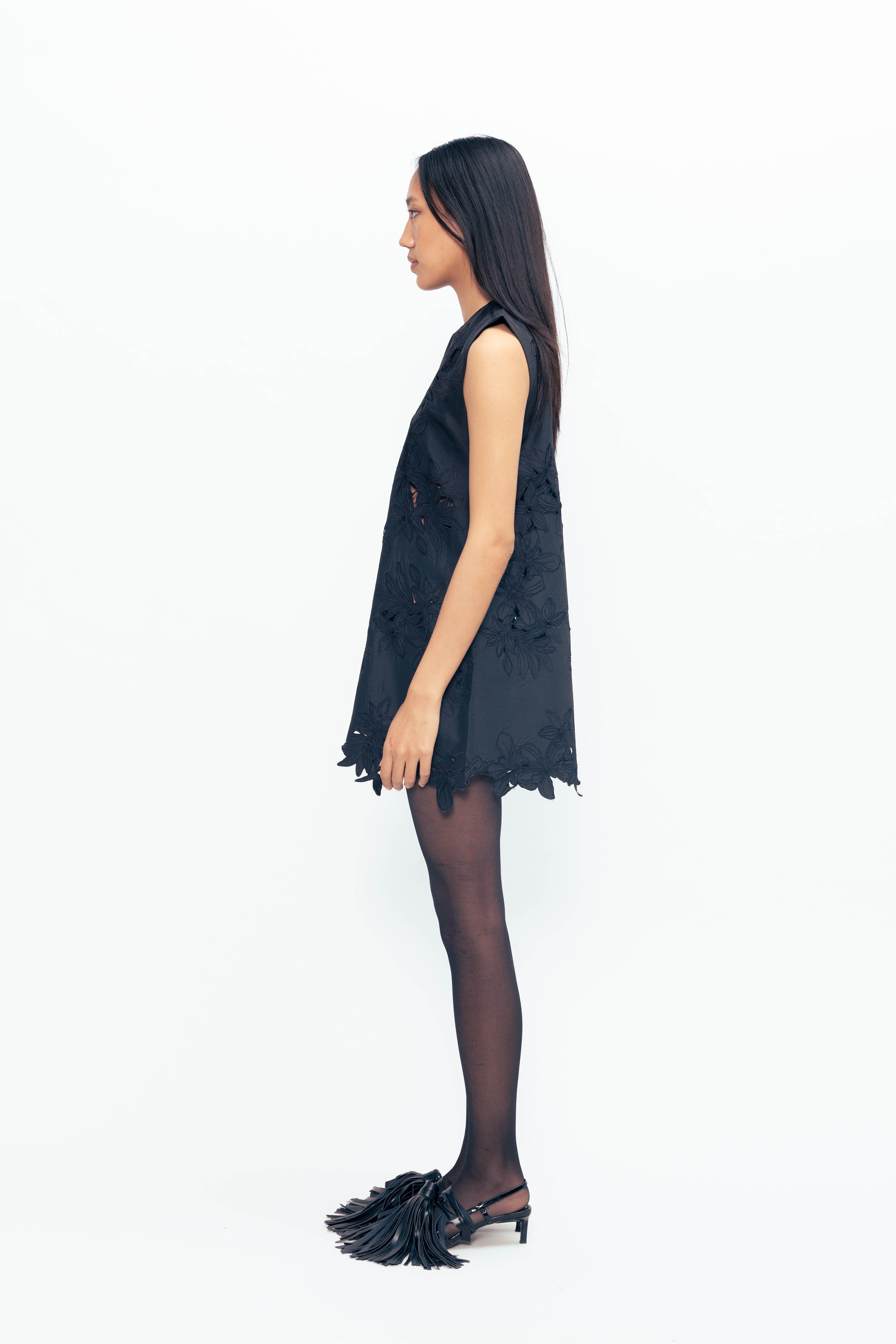 A study in shadow and intricacy, this piece is defined by its openwork surface—delicate yet deliberate. Negative space becomes pattern, with every cut and curve revealing just enough. Its form is fluid, shaped to follow the body with quiet elegance, while the surface shifts between opacity and air. A bold softness runs through it, offering both strength and lightness in one considered gesture.
