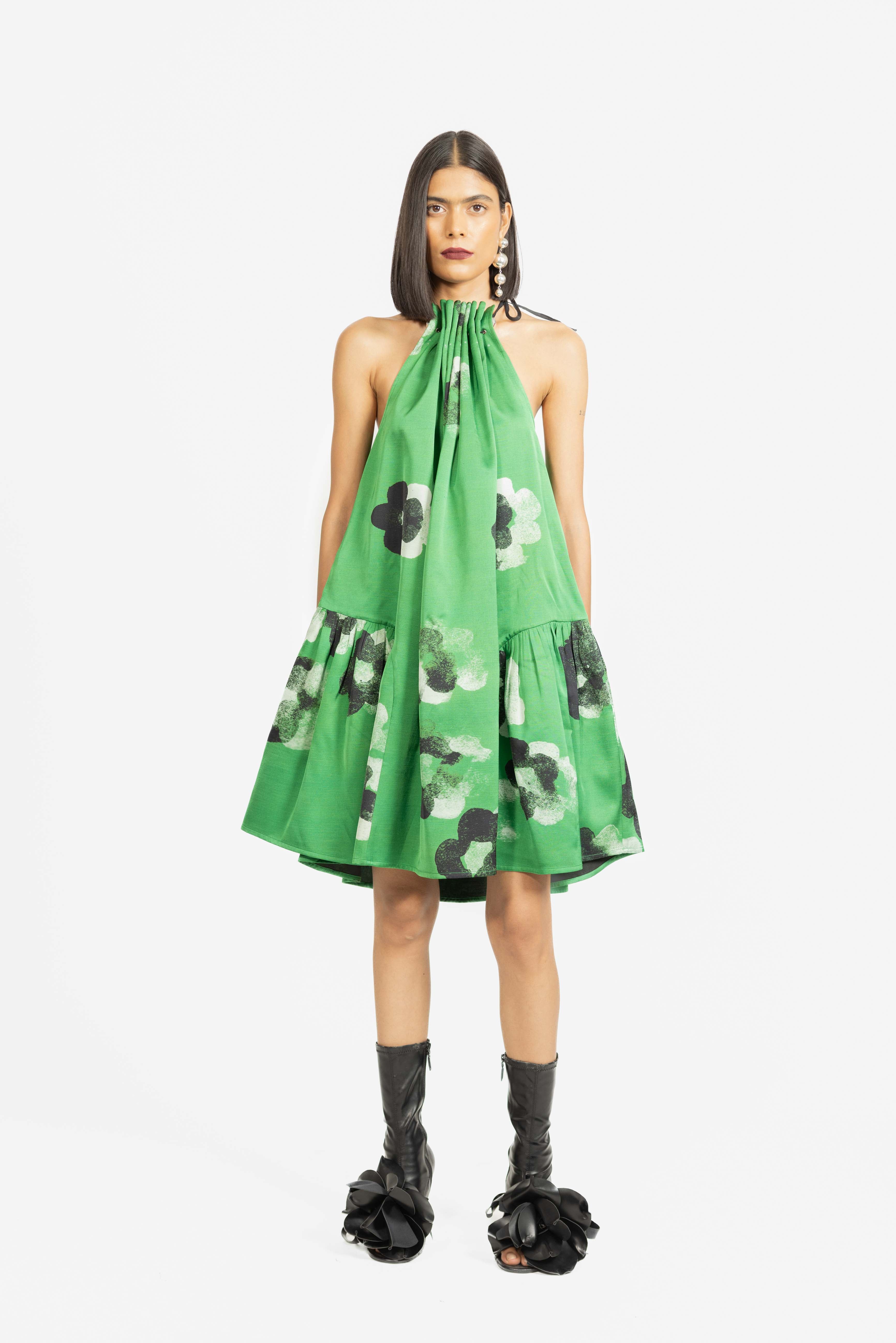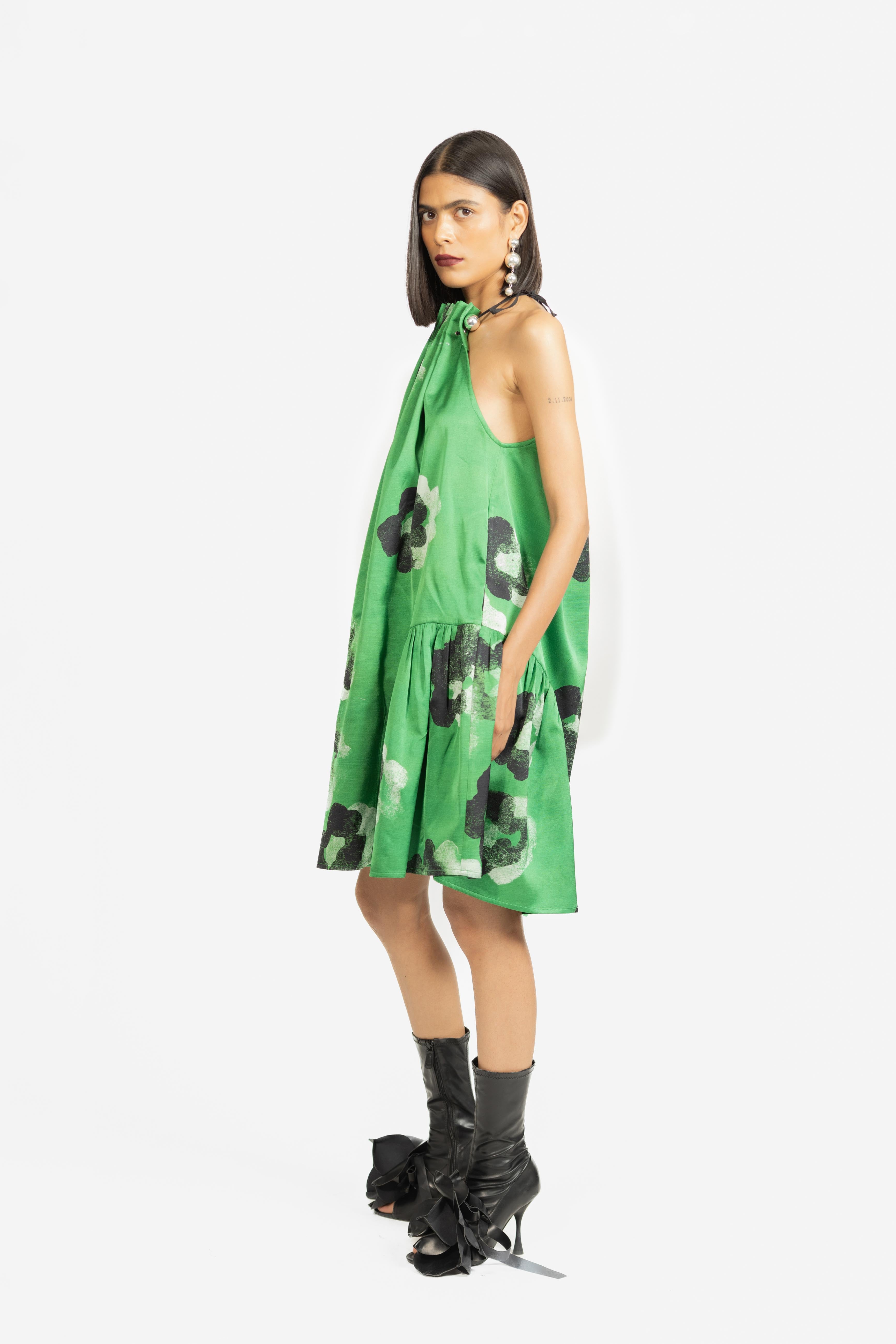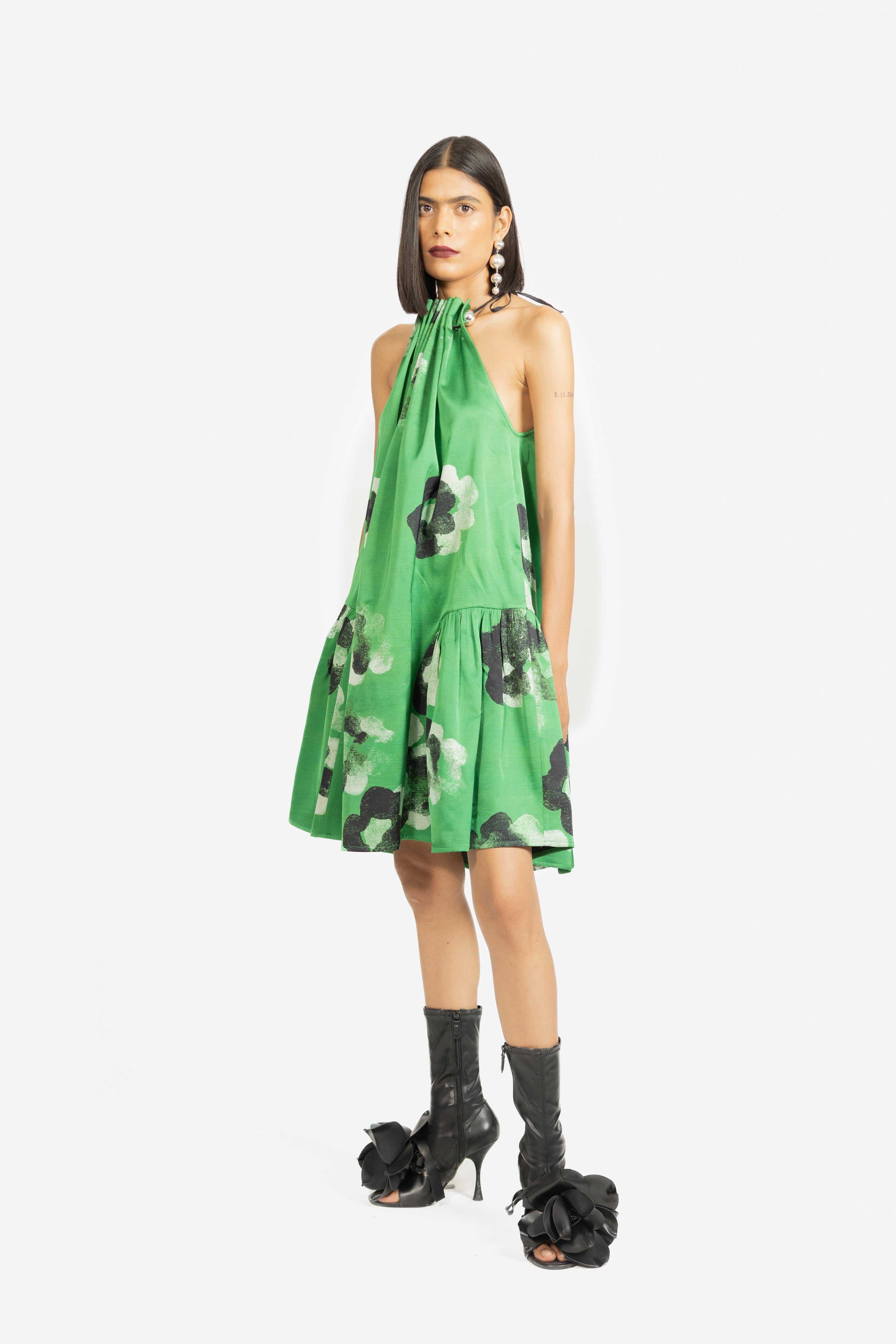A playful mini dress designed with a gathered halter neckline that adds texture and charm.
