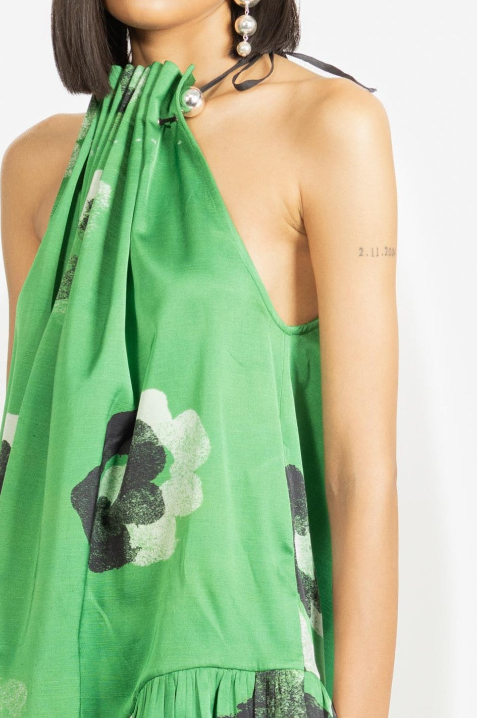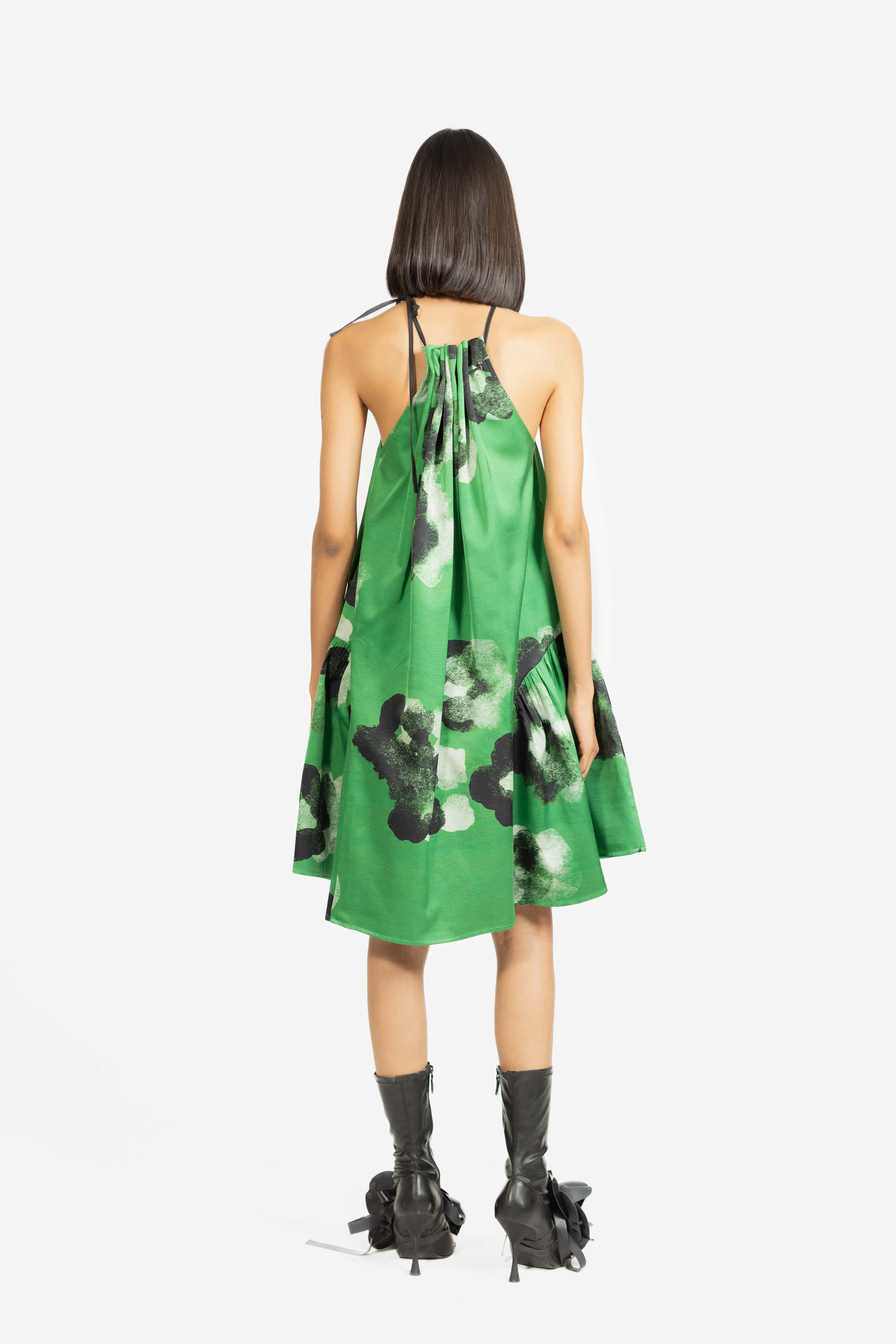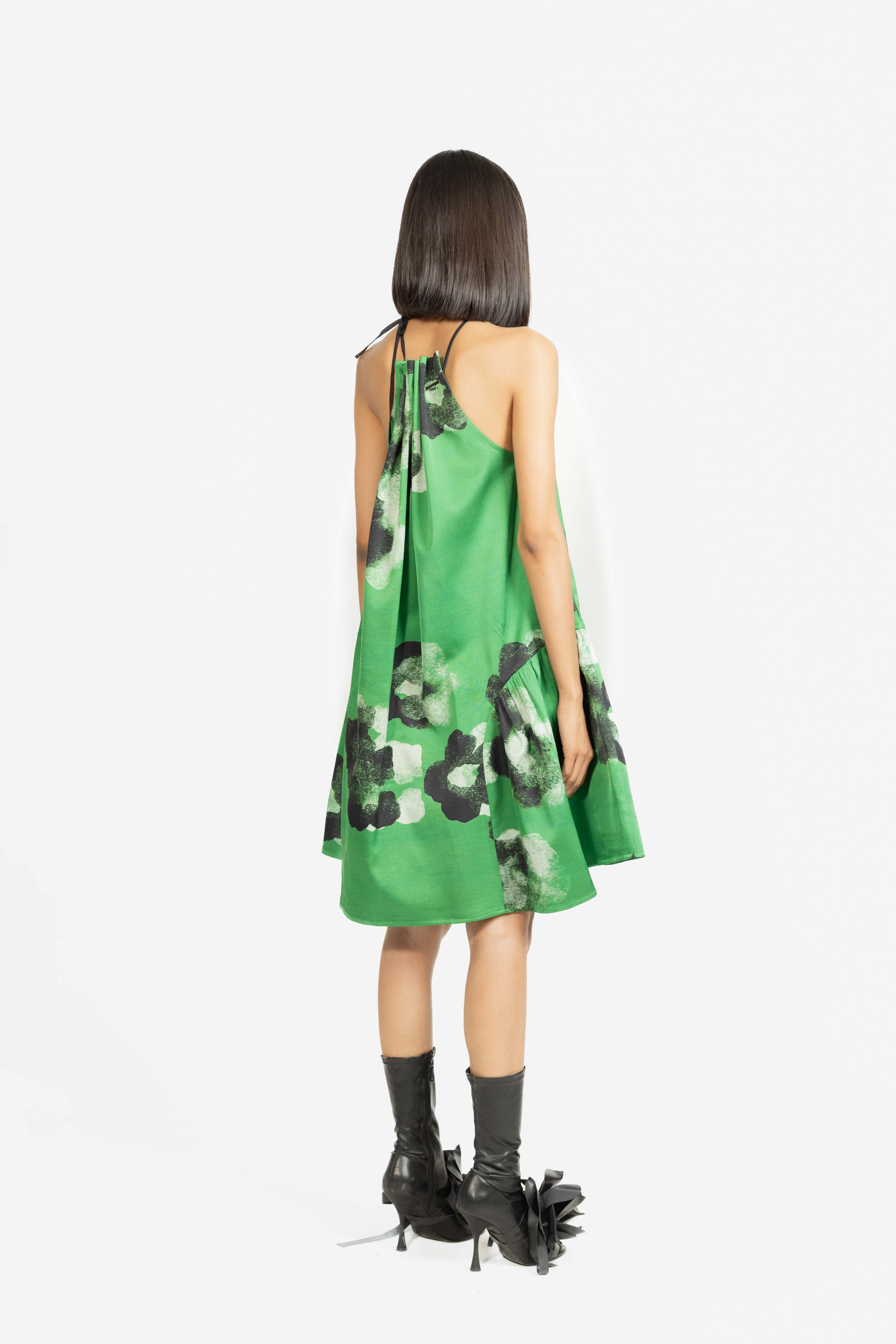 A playful mini dress designed with a gathered halter neckline that adds texture and charm.