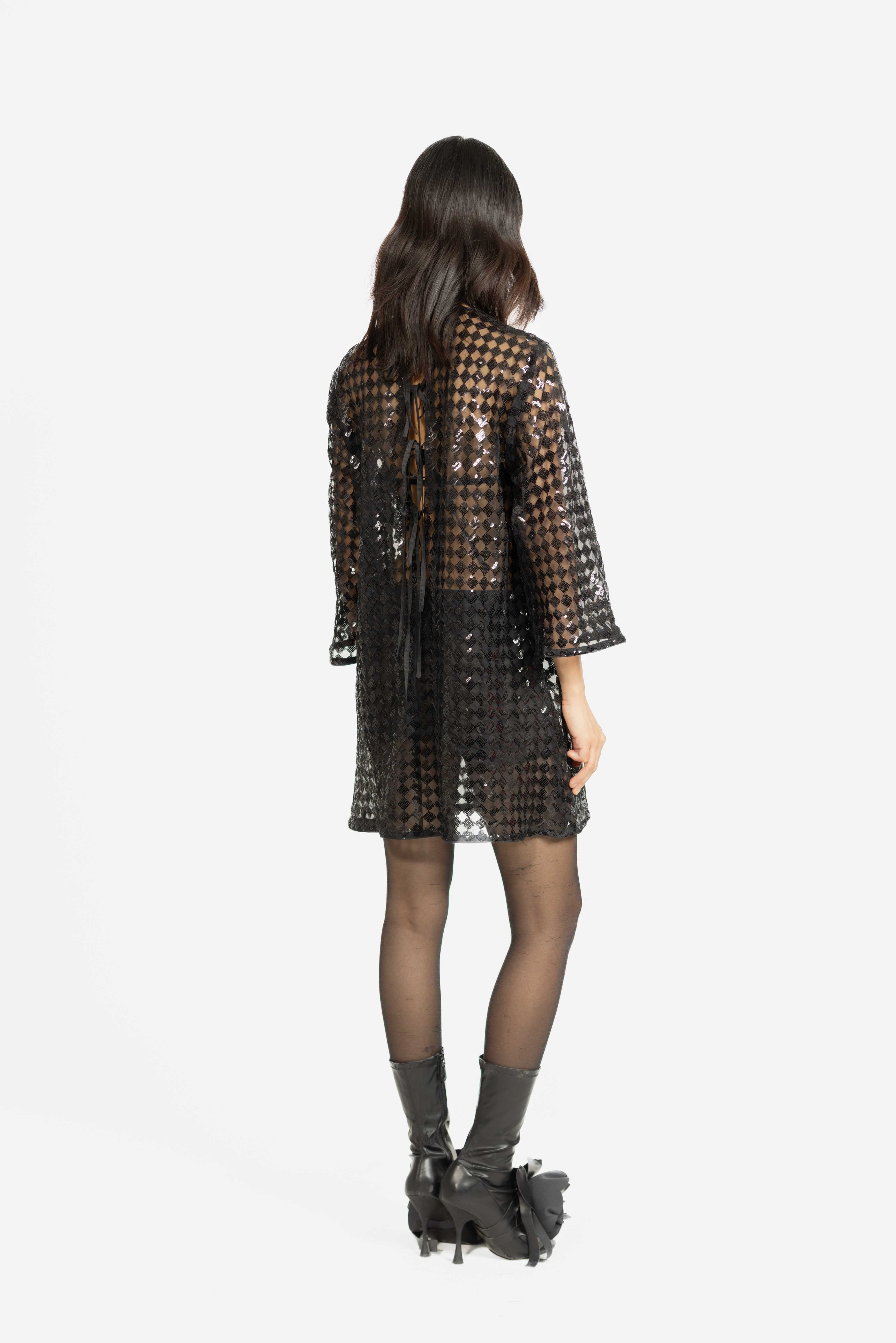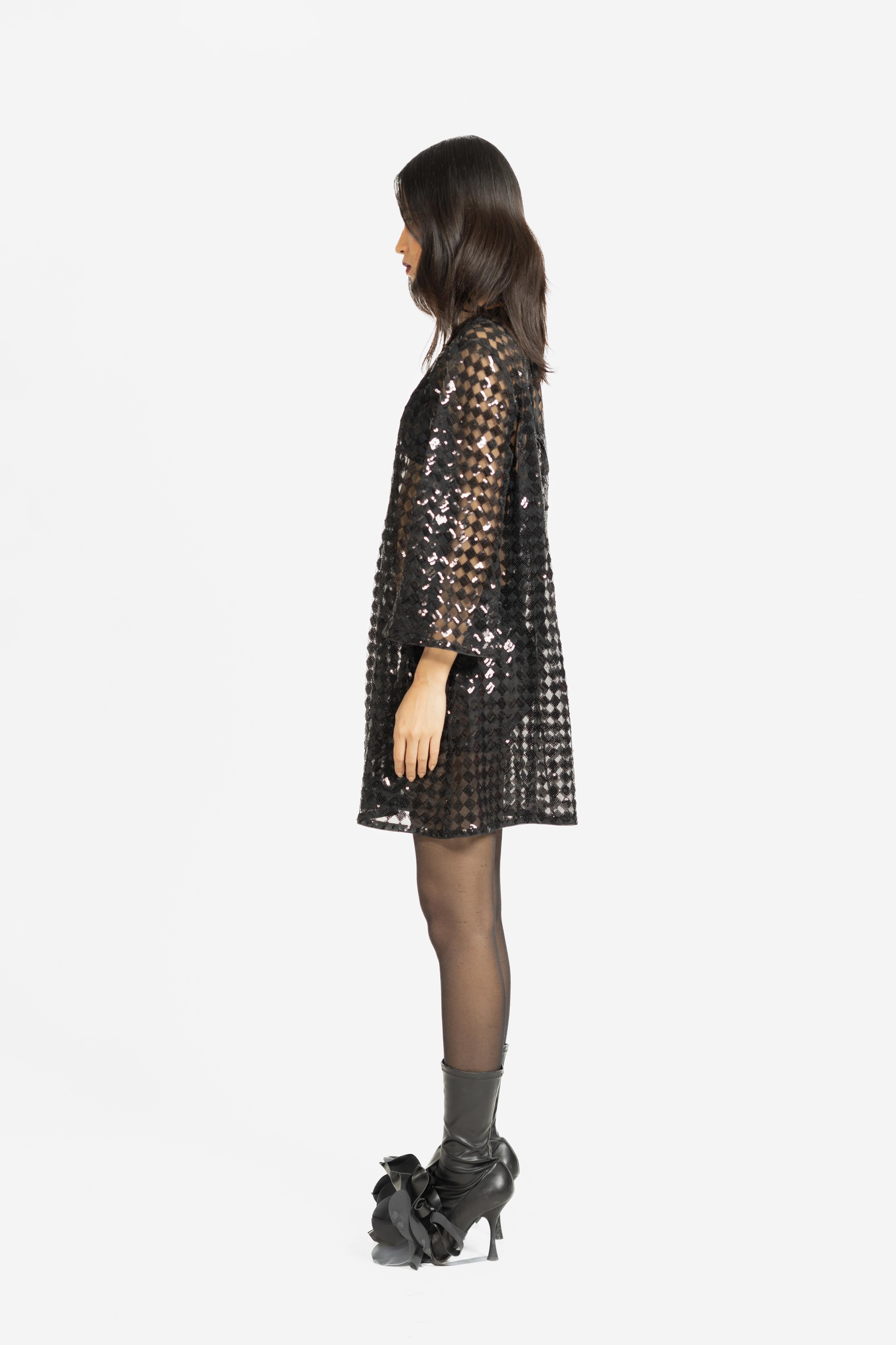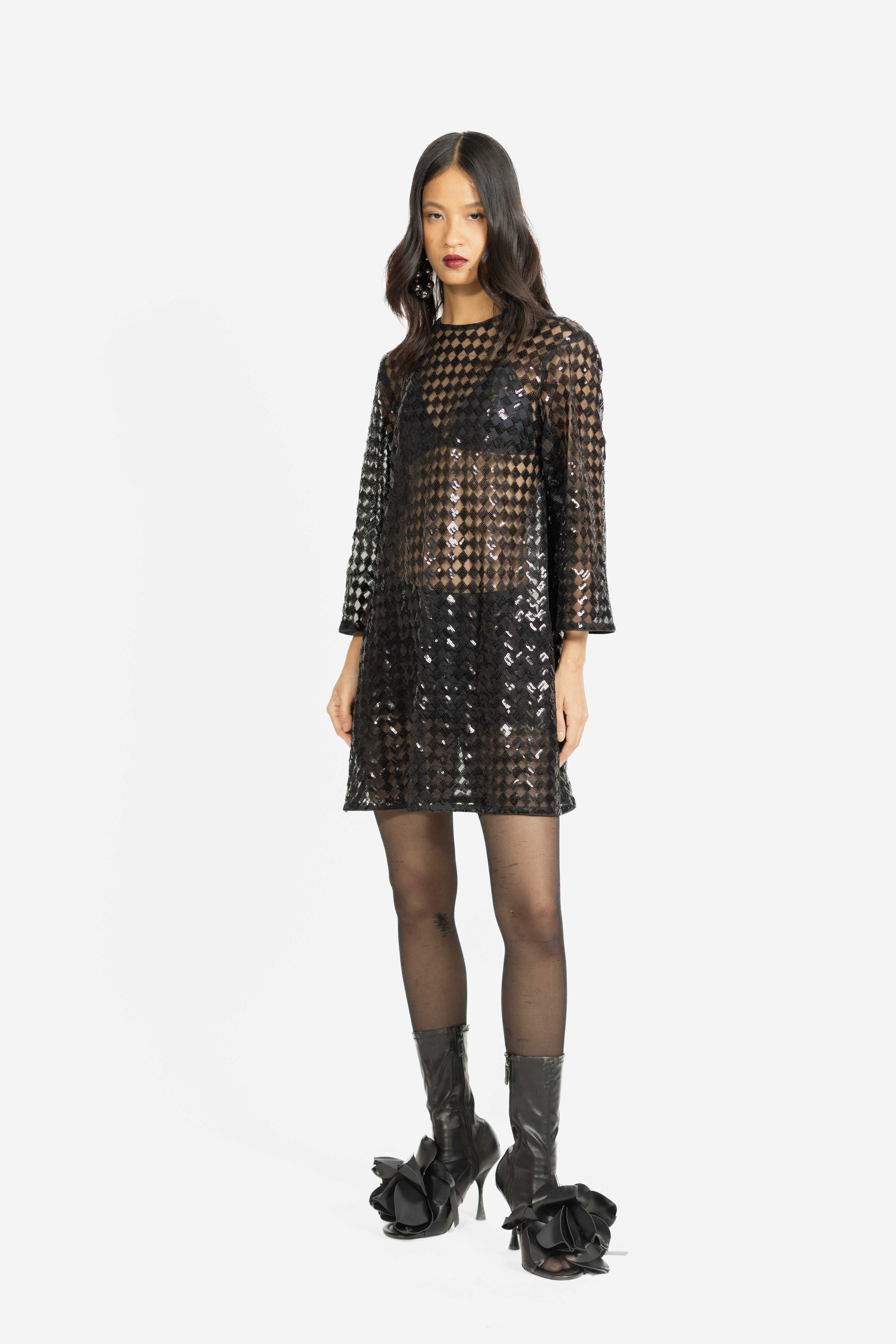 A sheer shift dress embellished with shimmering sequins for a statement look.