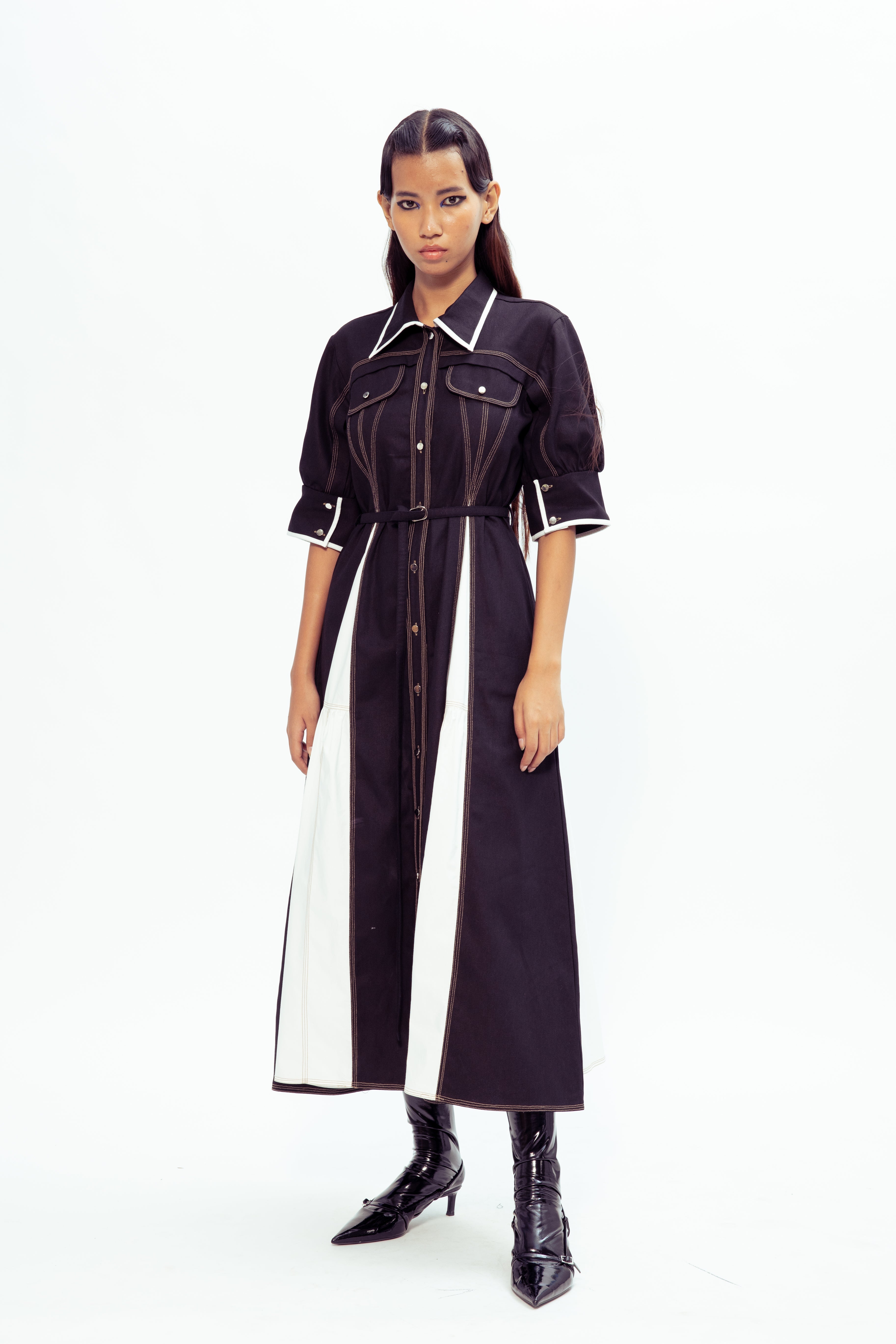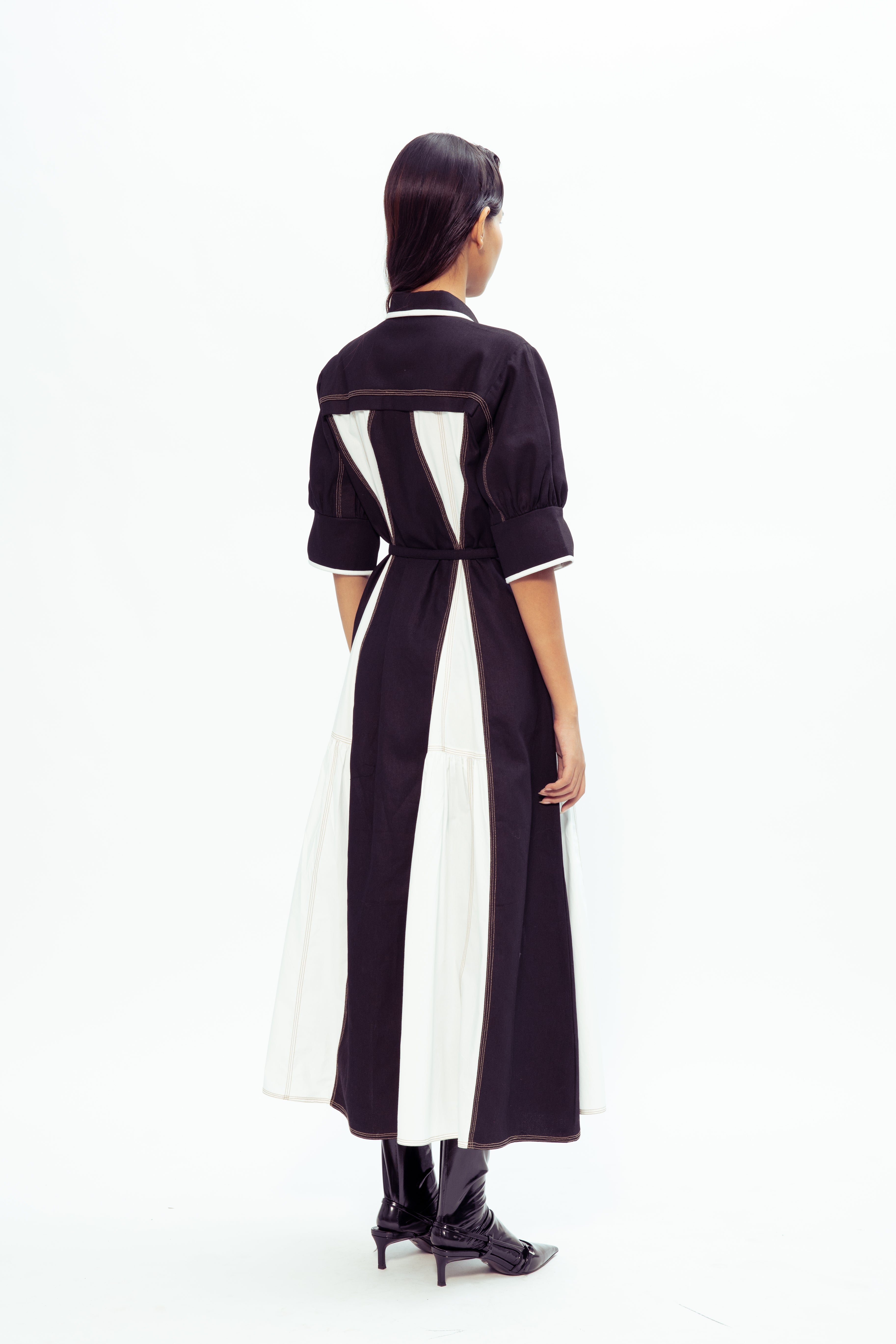 A refined silhouette with a modern twist, this godet dress features contrast top-stitching that highlights its tailored structure and flowing panels. The flared godet inserts add movement and grace, while the stitching detail brings a bold, contemporary touch.