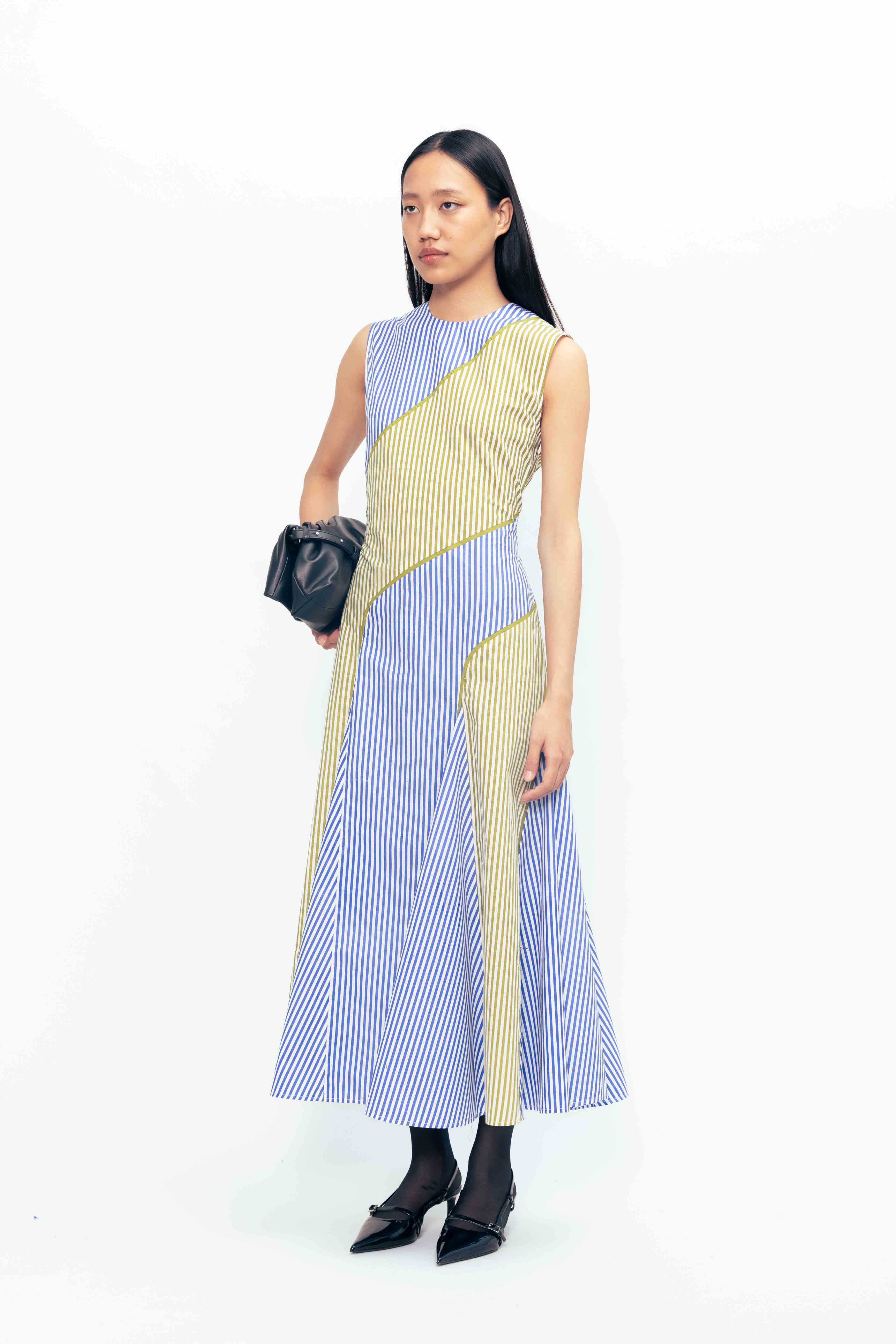 This fit-and-flare dress blends classic structure with dynamic detailing. Featuring slotted godet inserts, it offers subtle volume and movement while maintaining a tailored silhouette. The linear print adds rhythm and visual interest, enhancing the clean lines. Lightweight and breathable, it’s a refined piece that transitions effortlessly from daytime polish to evening ease.