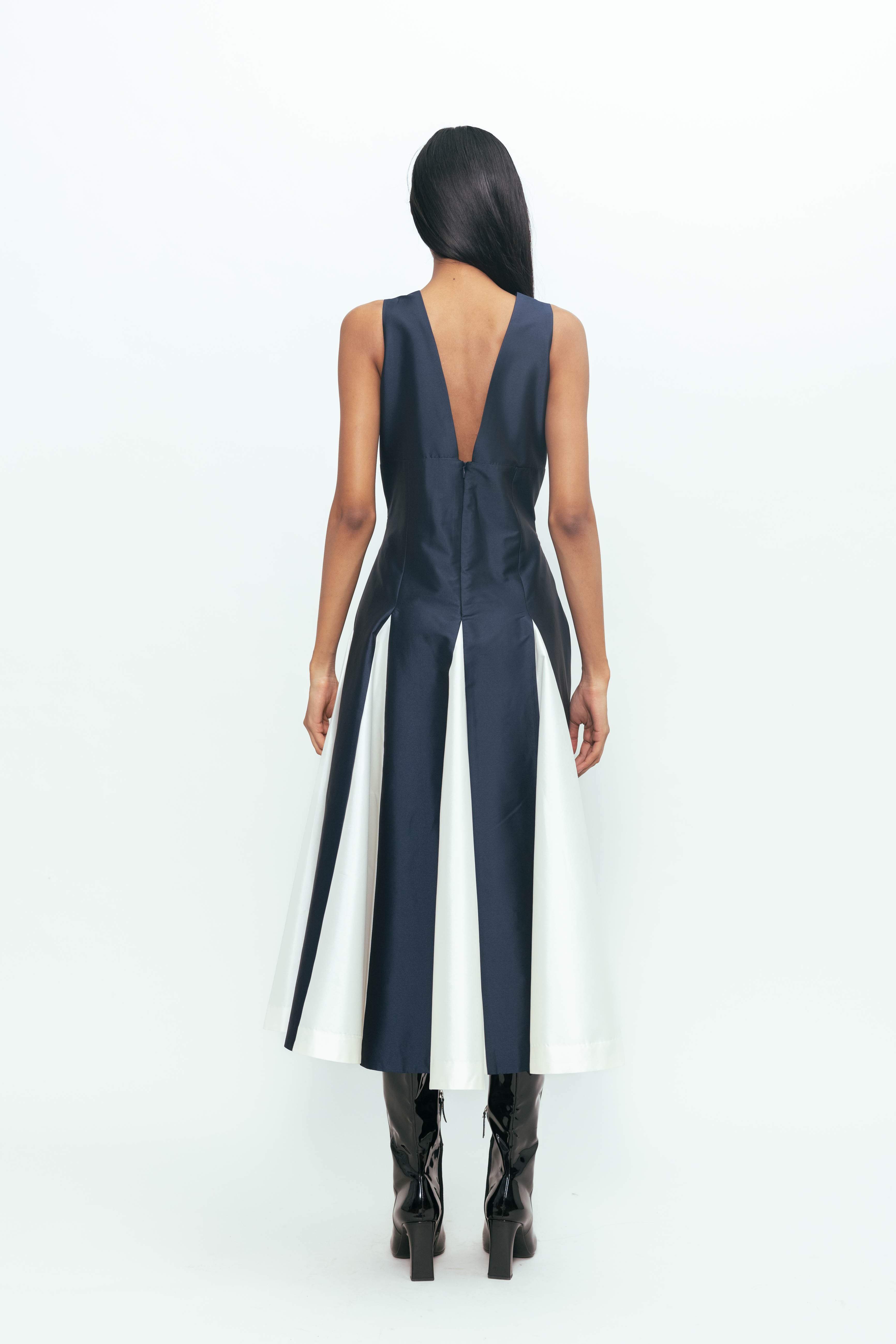 The Fit & Flare Dress with Contrast Godet features a flattering silhouette that hugs the waist before flowing into a flared skirt. Contrast godet panels add a pop of color and extra movement, creating a dynamic and stylish look.