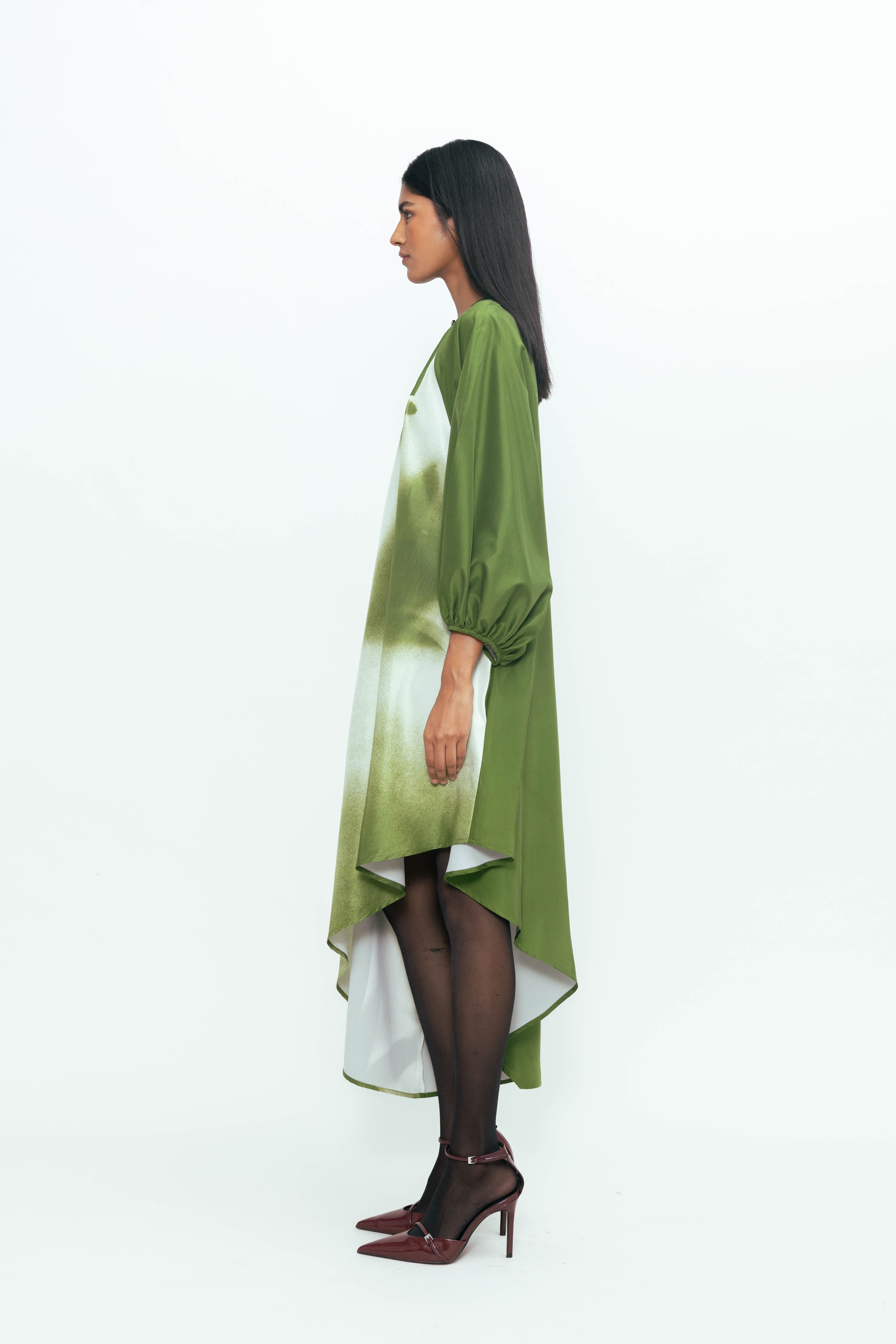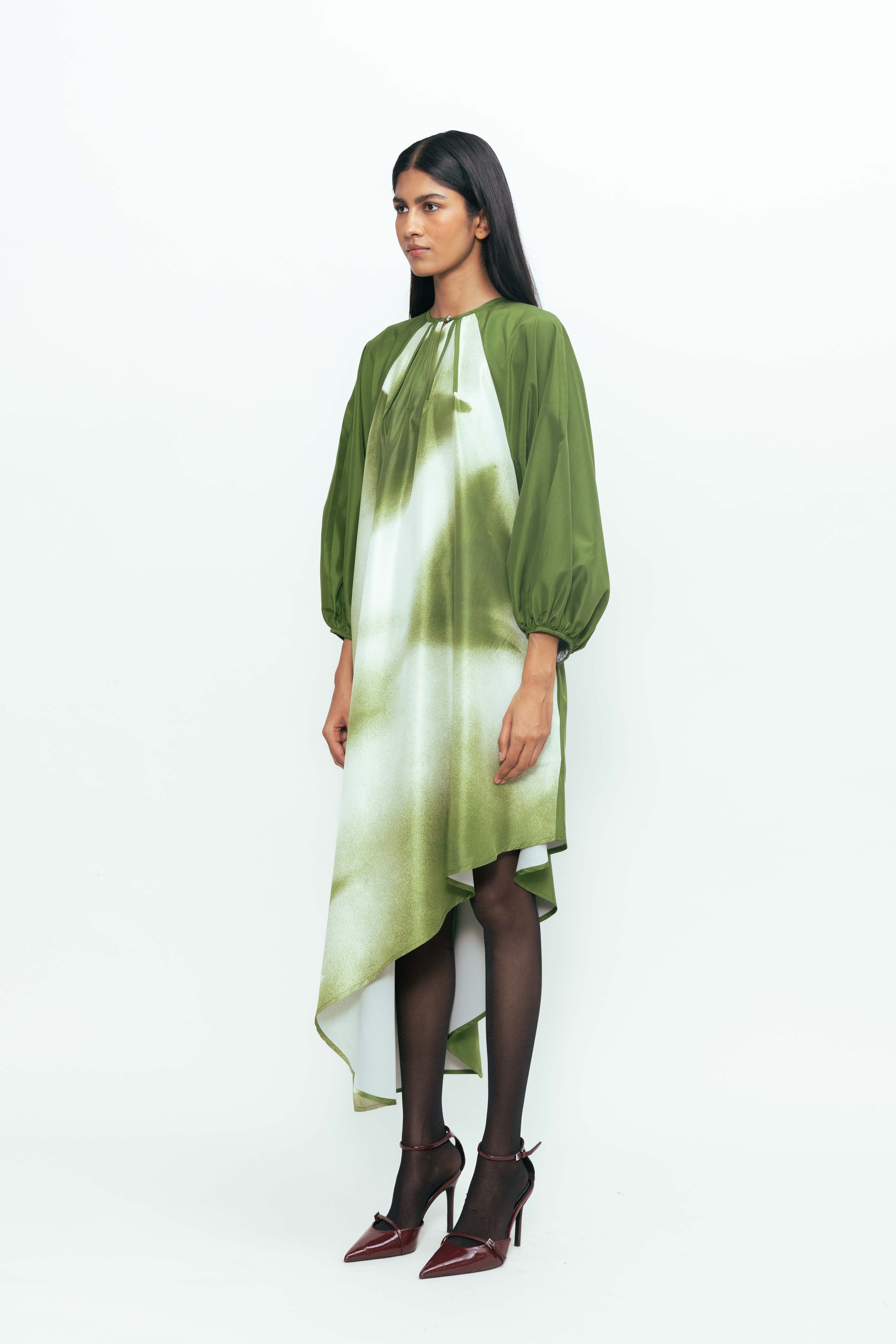 This eye-catching asymmetrical dress is crafted from luxurious silk, featuring color blocked raglan sleeves and a vibrant tie-dye pattern that adds a lively flair. The keyhole detail at the neck offers a subtle touch of allure, while the puff raglan sleeves enhance the overall silhouette. Perfect for making a bold statement, this dress beautifully combines unique design with playful elegance.