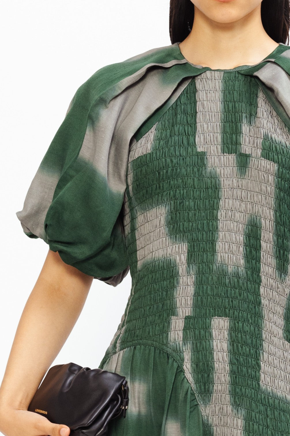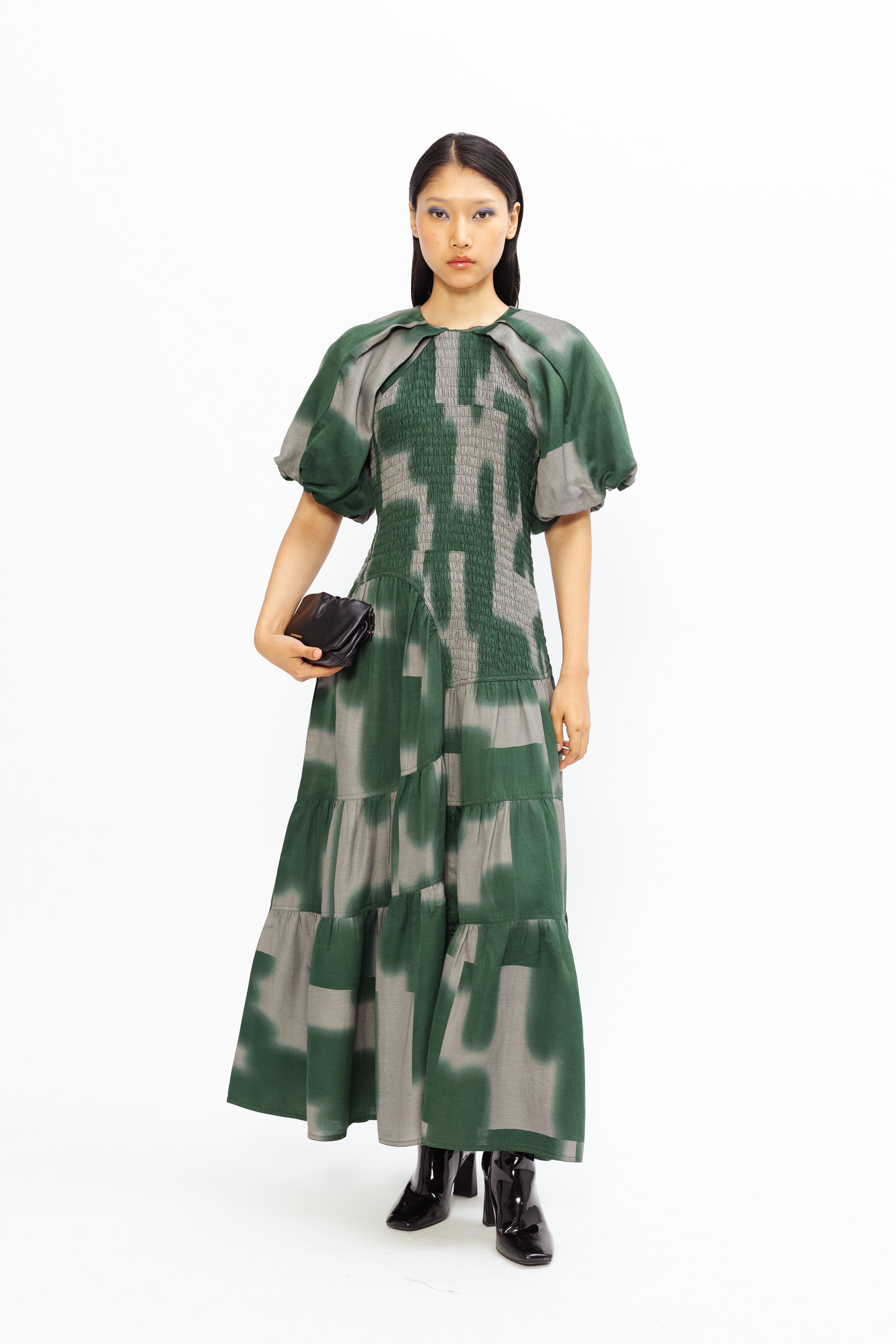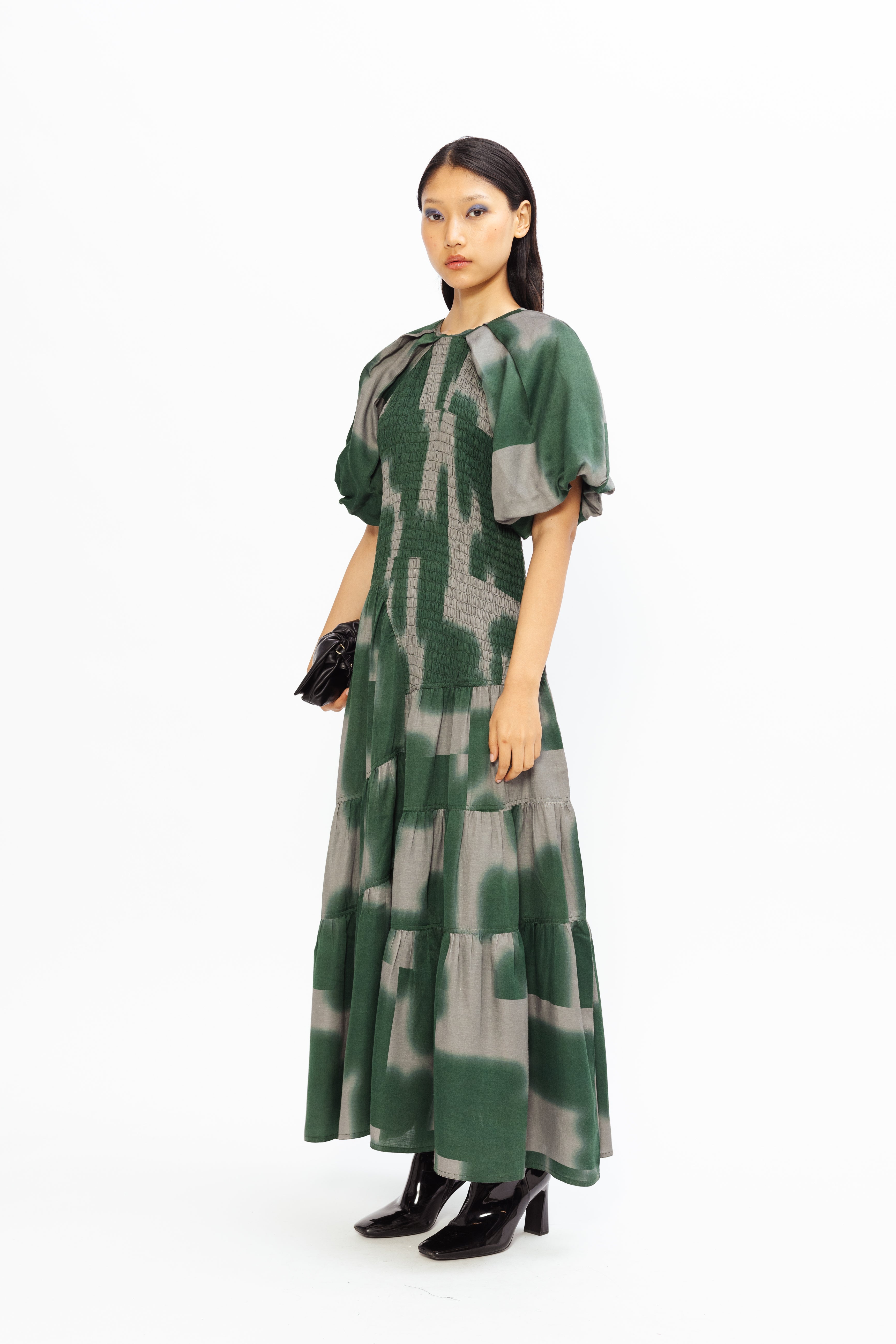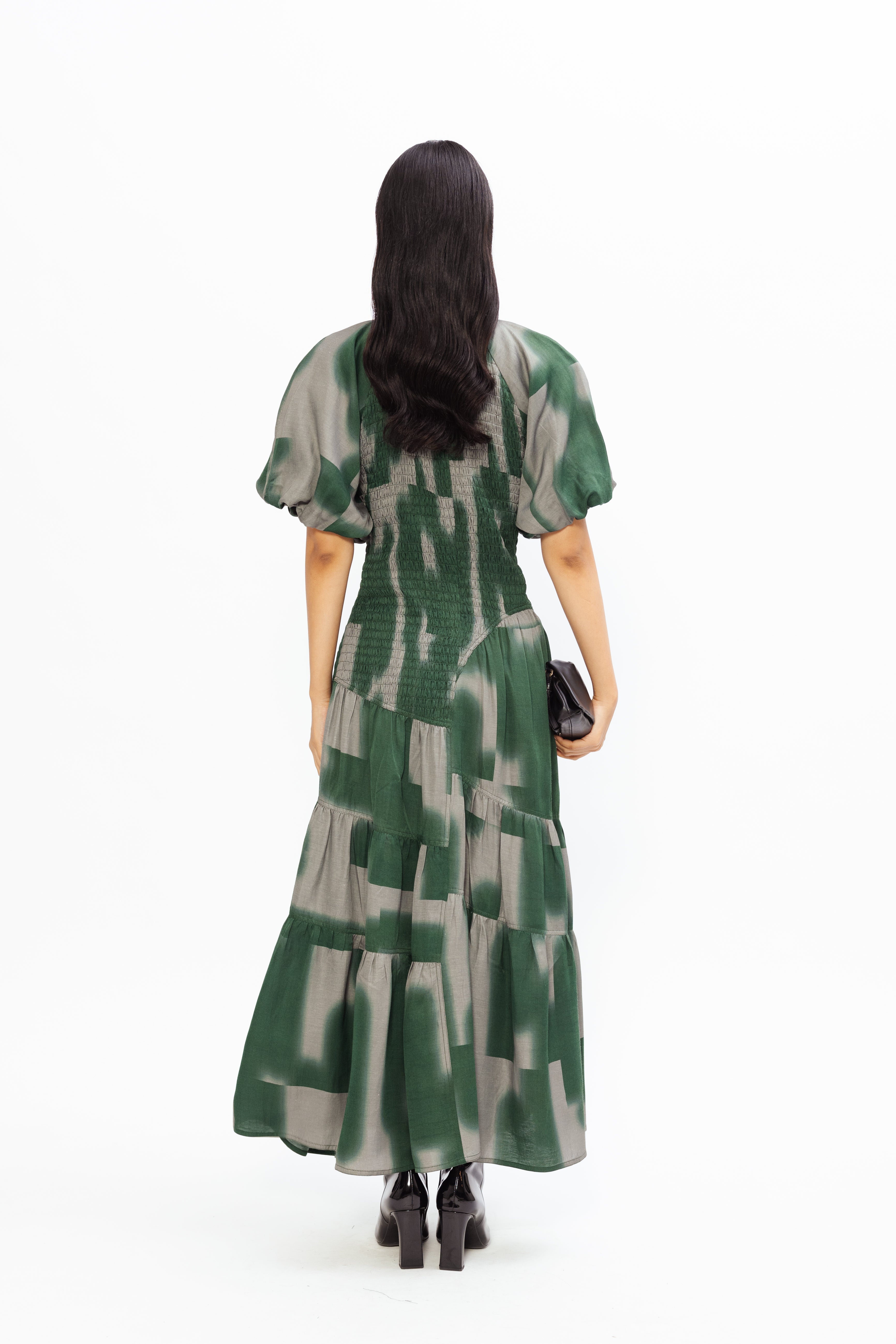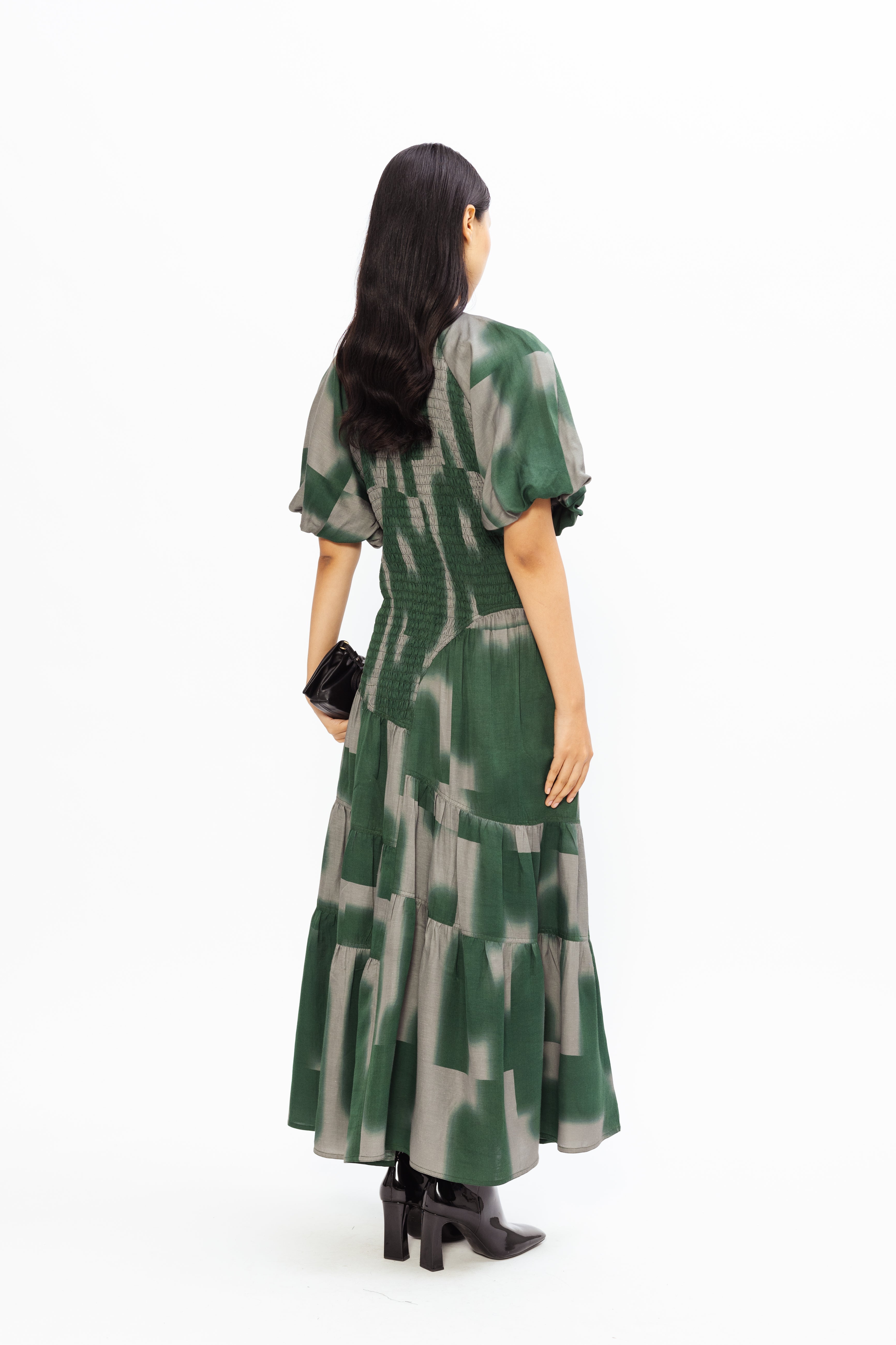 This puff sleeve dress is both stylish and flattering with shirring from the neck to the hip, creating a fitted yet comfortable bodice. The asymmetrical tiers cascade gracefully to the hem, adding movement and visual interest. Perfect for making a statement at any event or occasion.