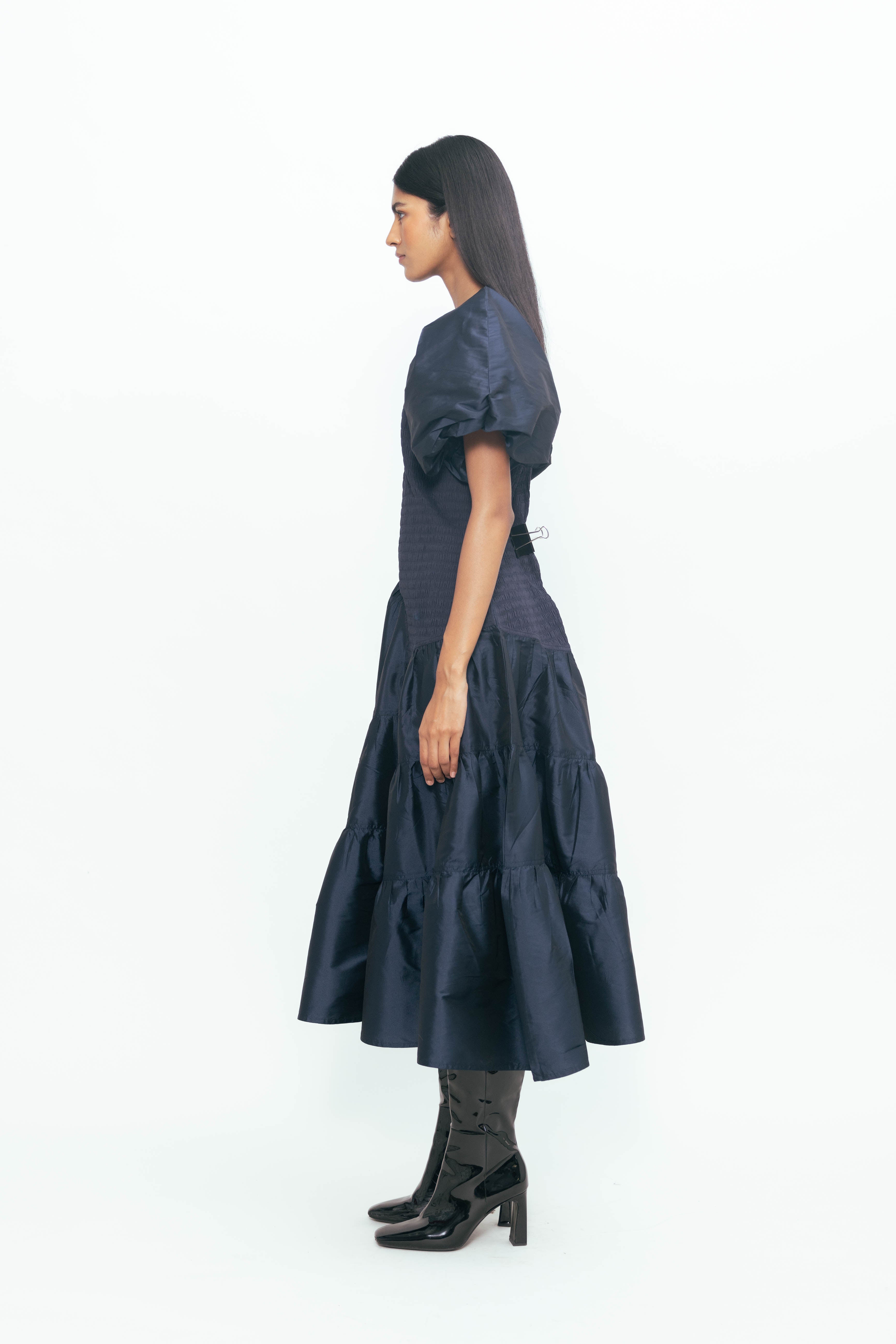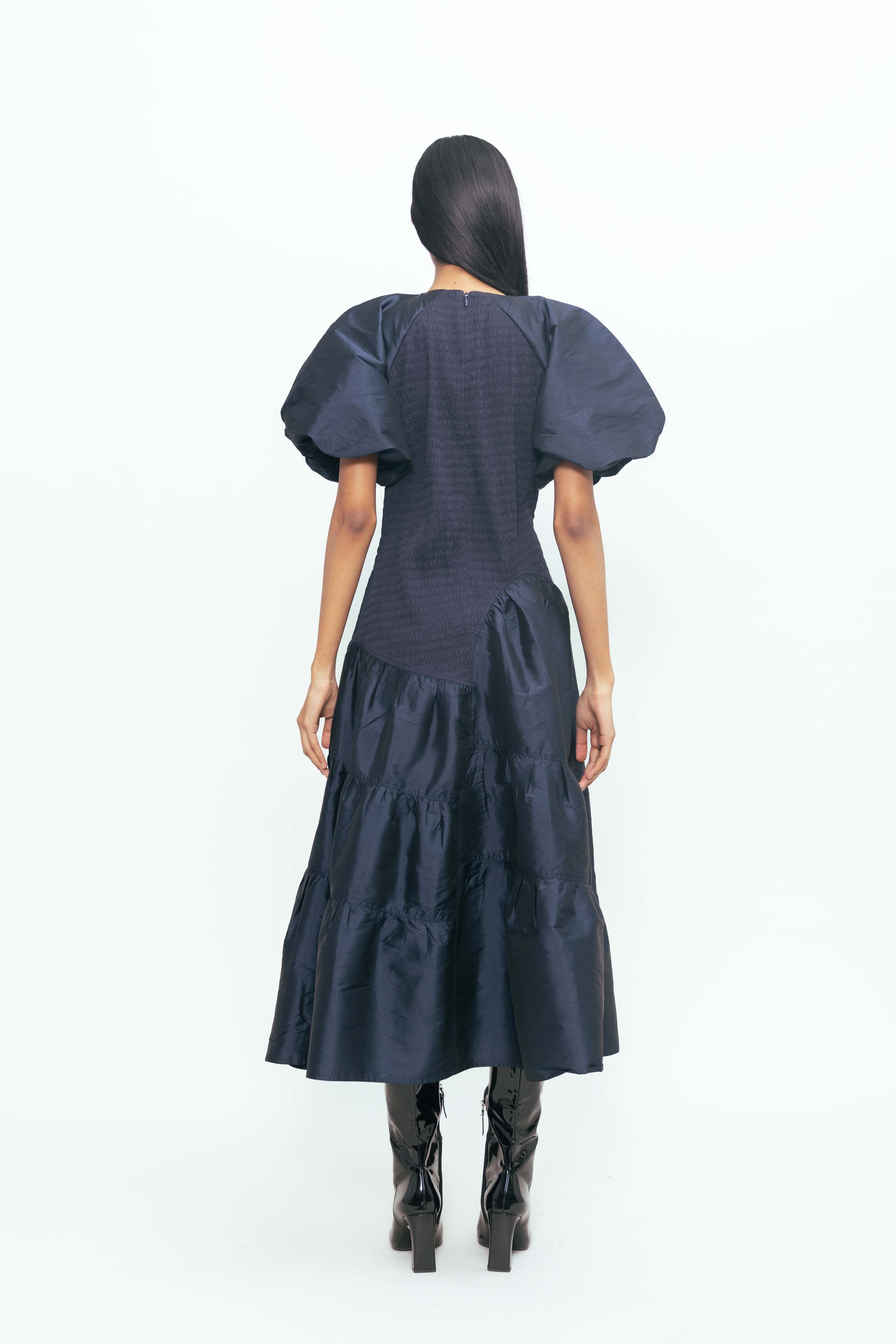This puff sleeve dress is both stylish and flattering with shirring from the neck to the hip, creating a fitted yet comfortable bodice. The asymmetrical tiers cascade gracefully to the hem, adding movement and visual interest. Perfect for making a statement at any event or occasion.