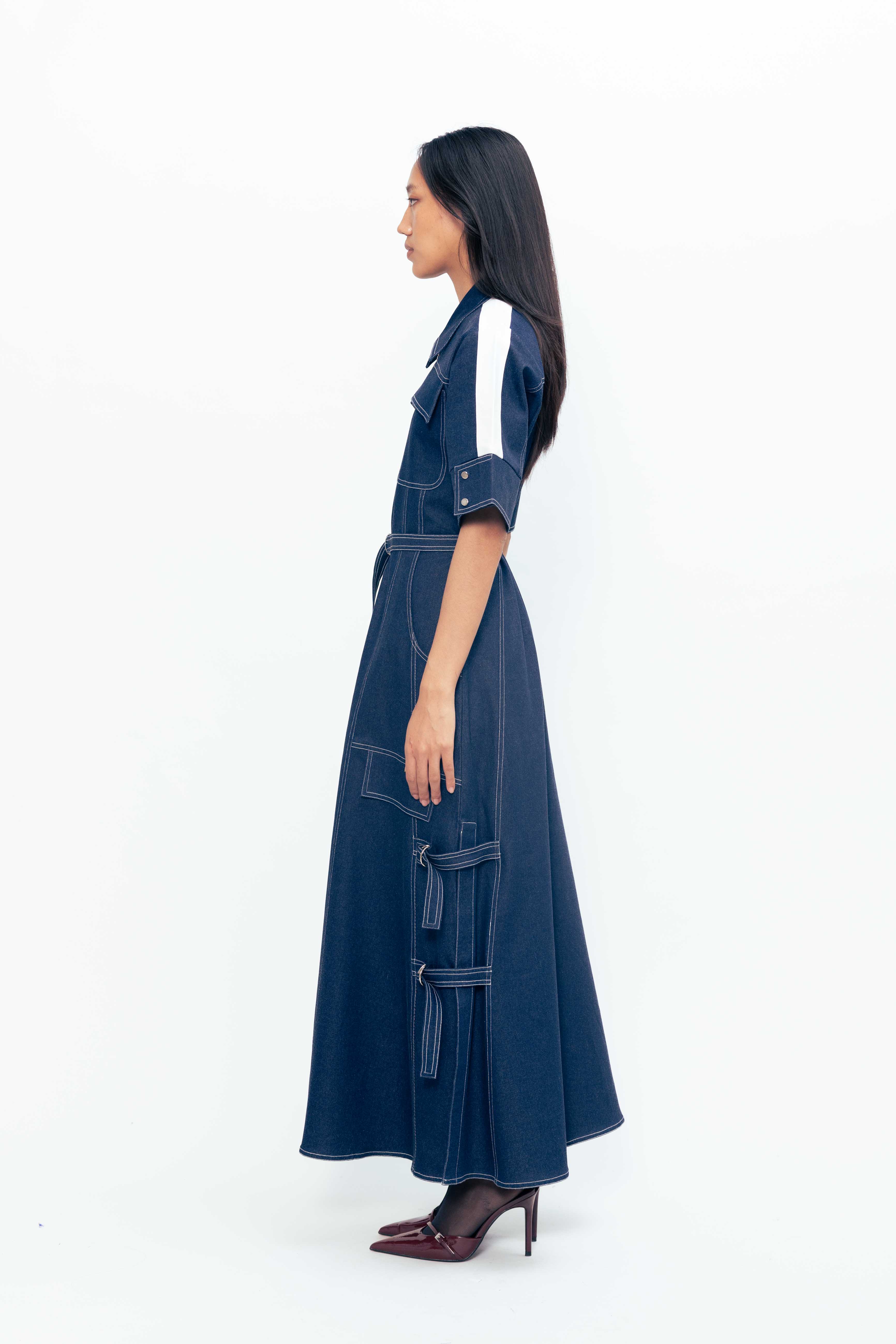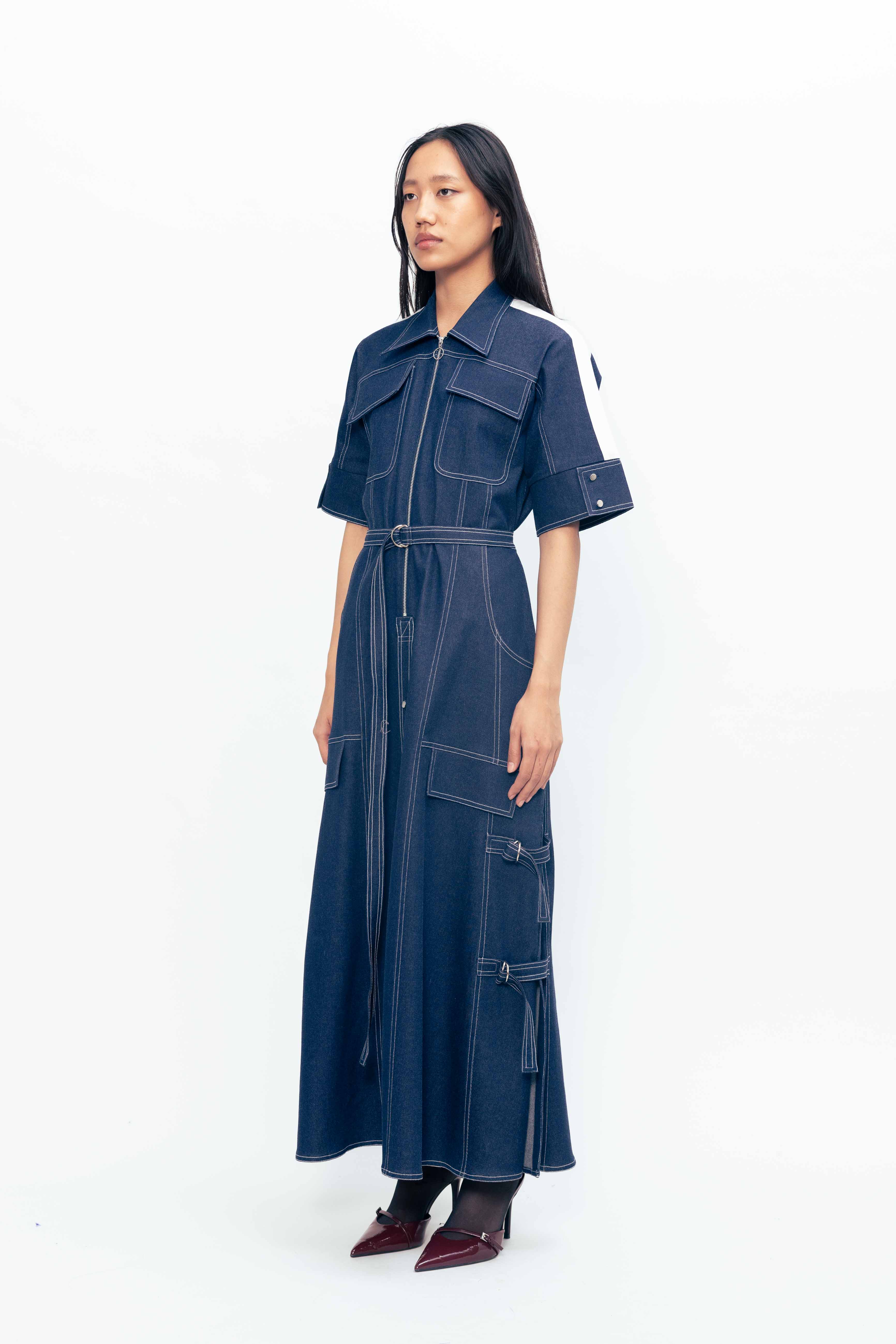 This utility-inspired dress brings together the rugged appeal of denim with refined contrast detailing. Designed with clean lines and functional elements, it features sharp ivory panels that highlight the structure and add visual depth. The sturdy yet comfortable feel makes it ideal for all-day wear, while the contrast design lends a modern, utilitarian edge to a timeless silhouette.
