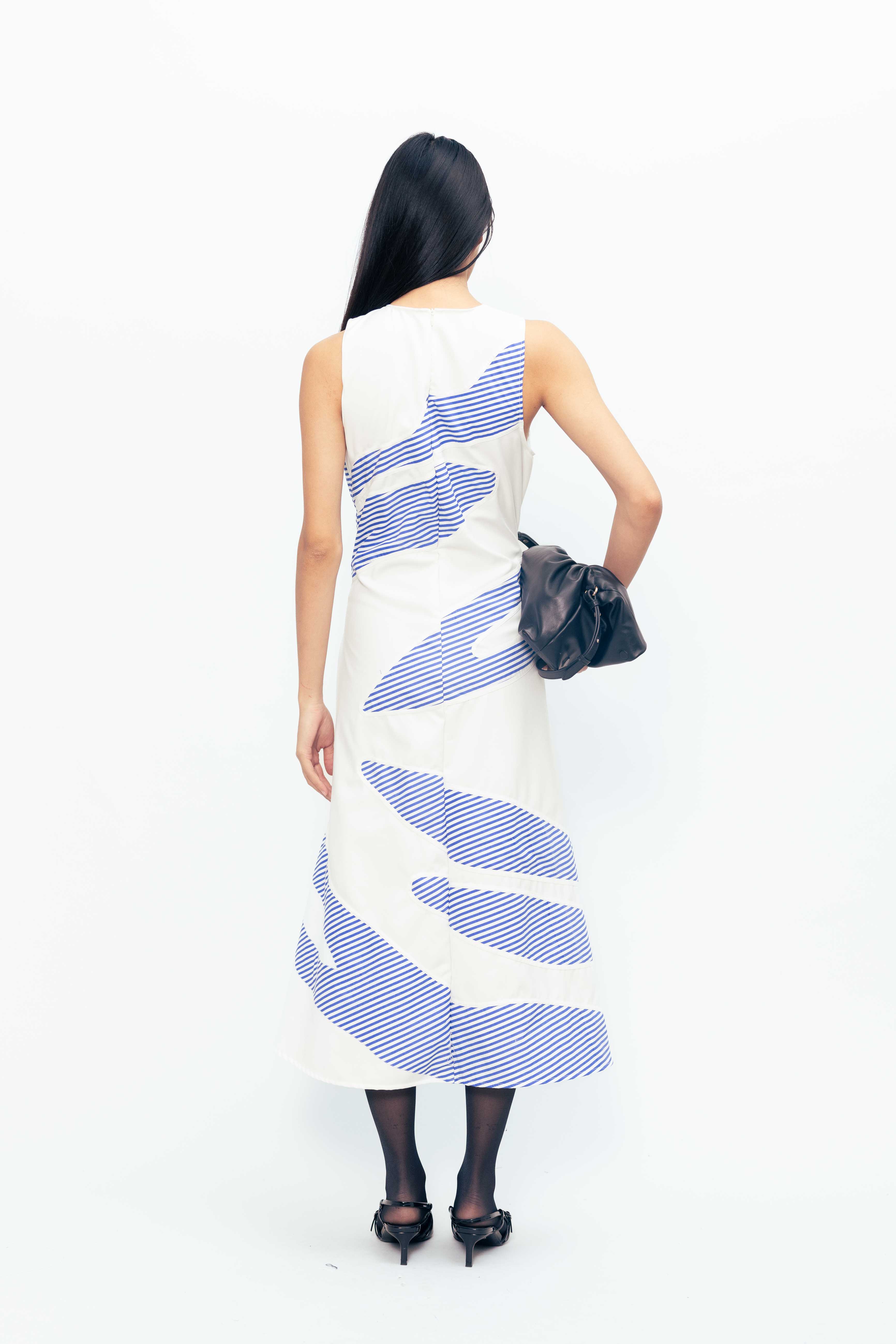 The flared patchwork midi dress brings together clean lines and soft volume in a striking, modern composition. Its structured yet breathable feel enhances the silhouette, while the linear patchwork detailing adds depth and visual rhythm.