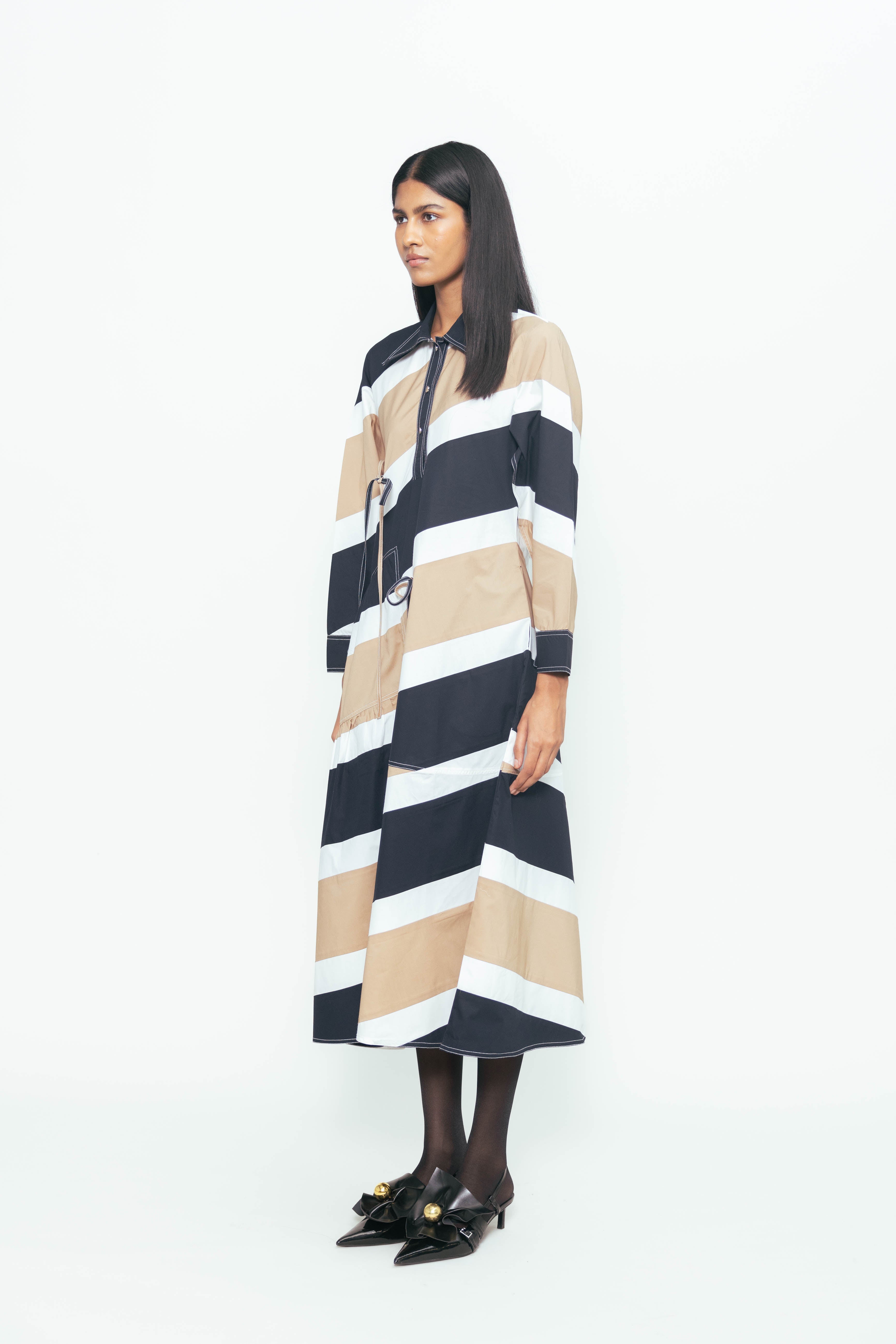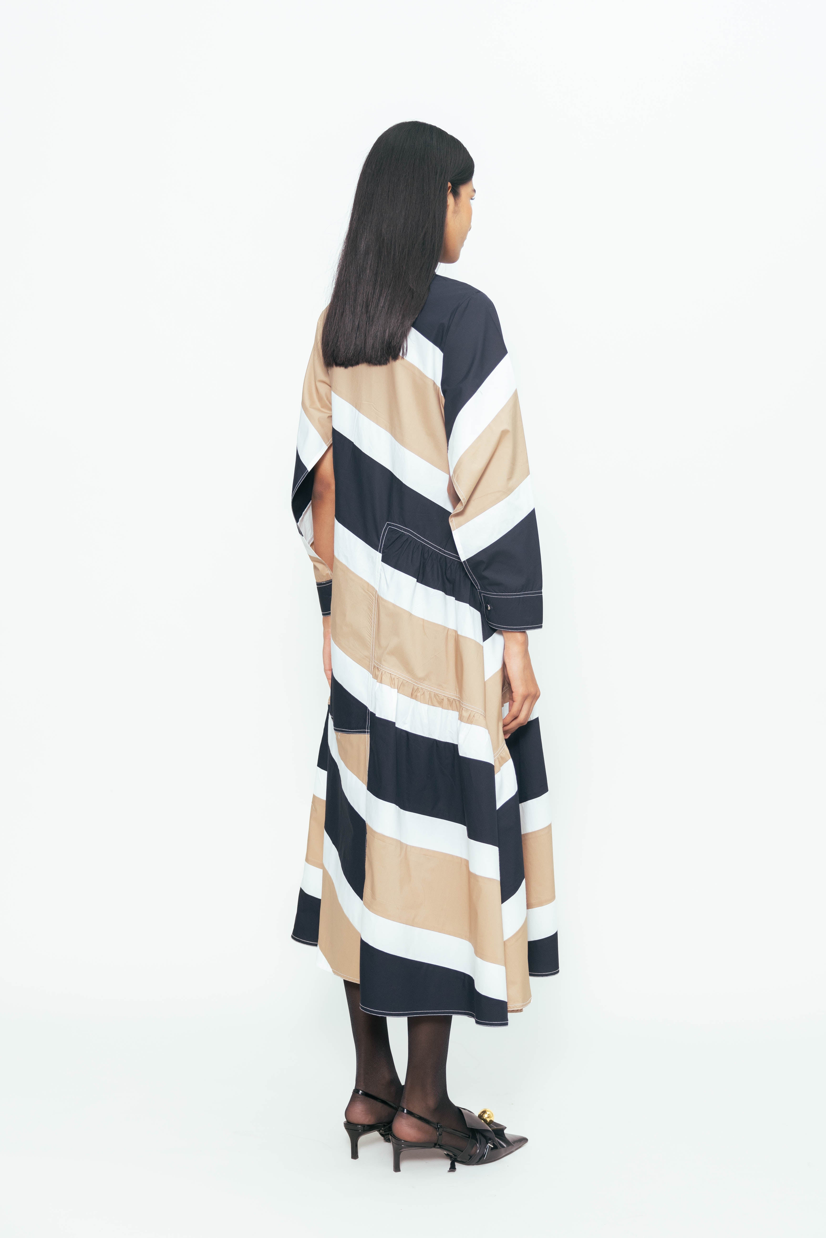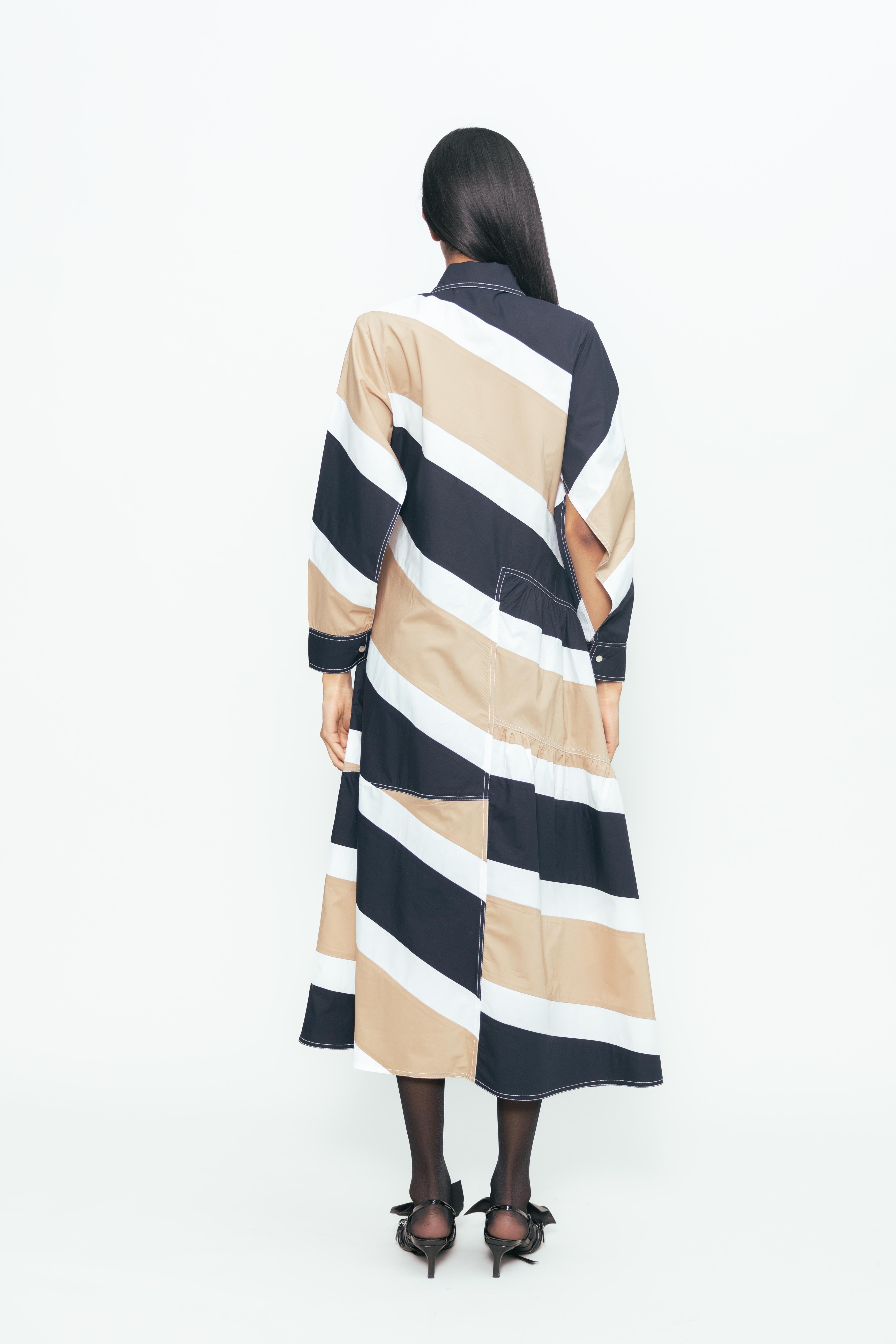 This slant color-blocked midi dress with tie-knot detail is a fresh take on modern minimalism. Featuring bold diagonal color blocking and a soft tie-knot at the waist, it flatters the figure while adding a touch of movement.