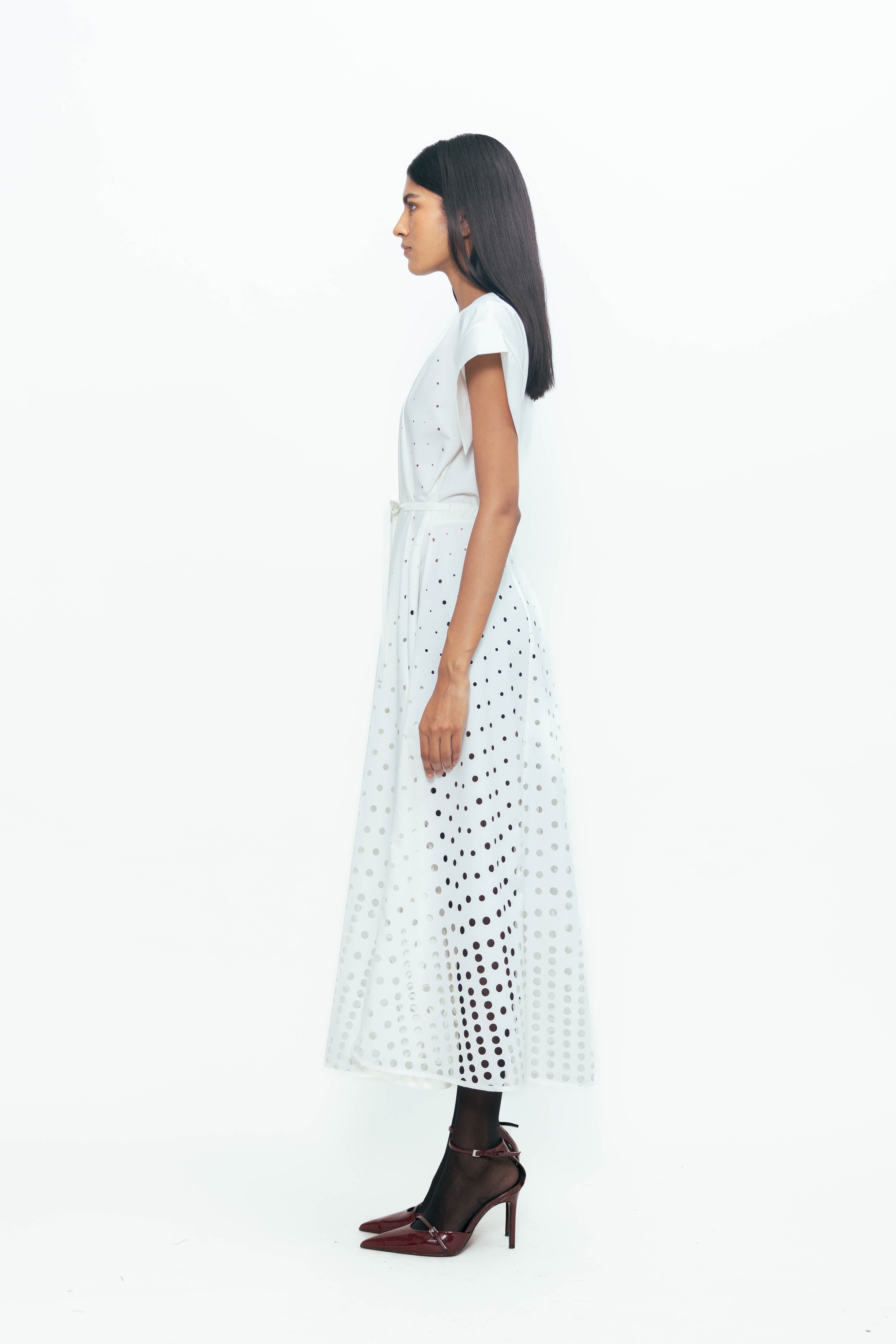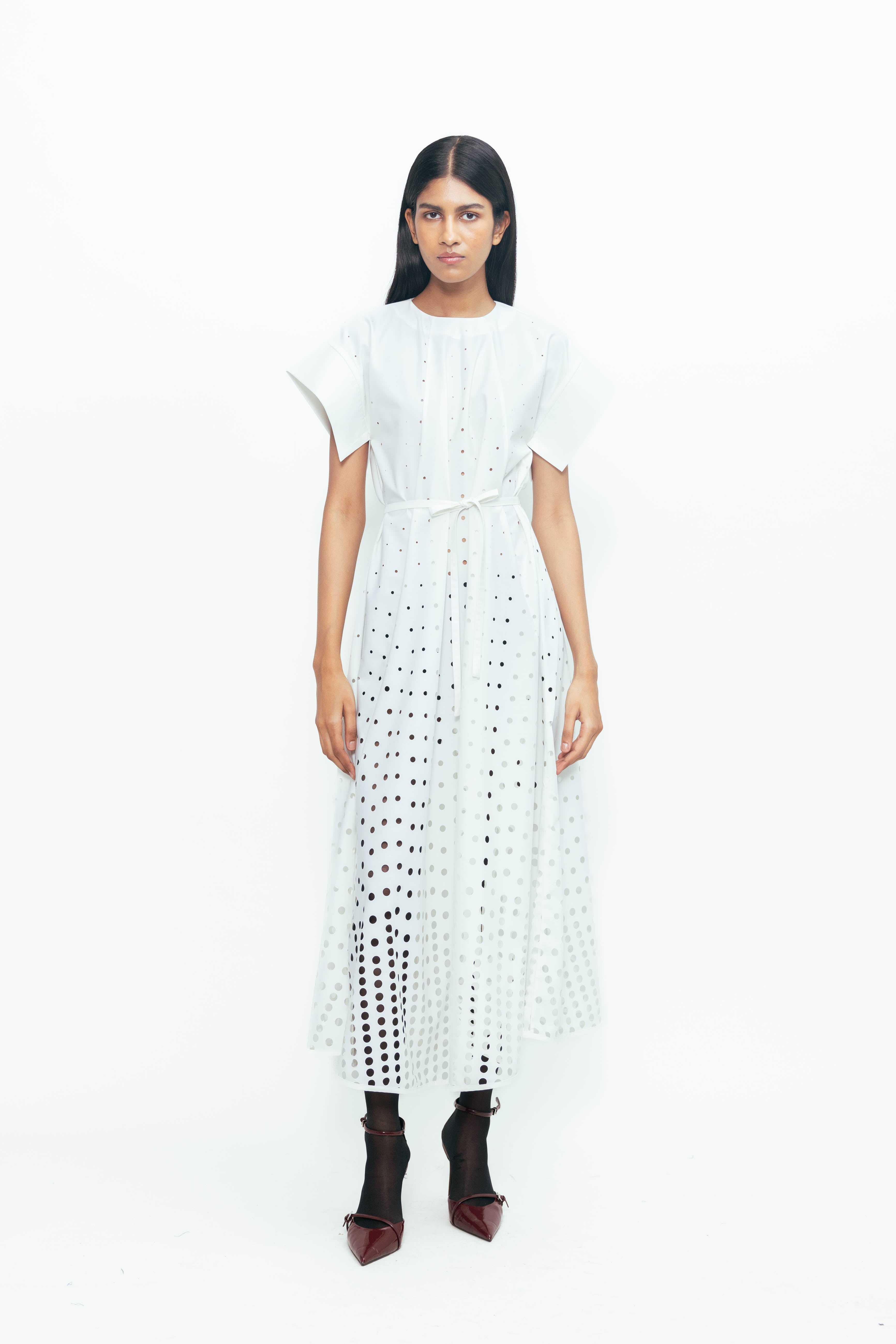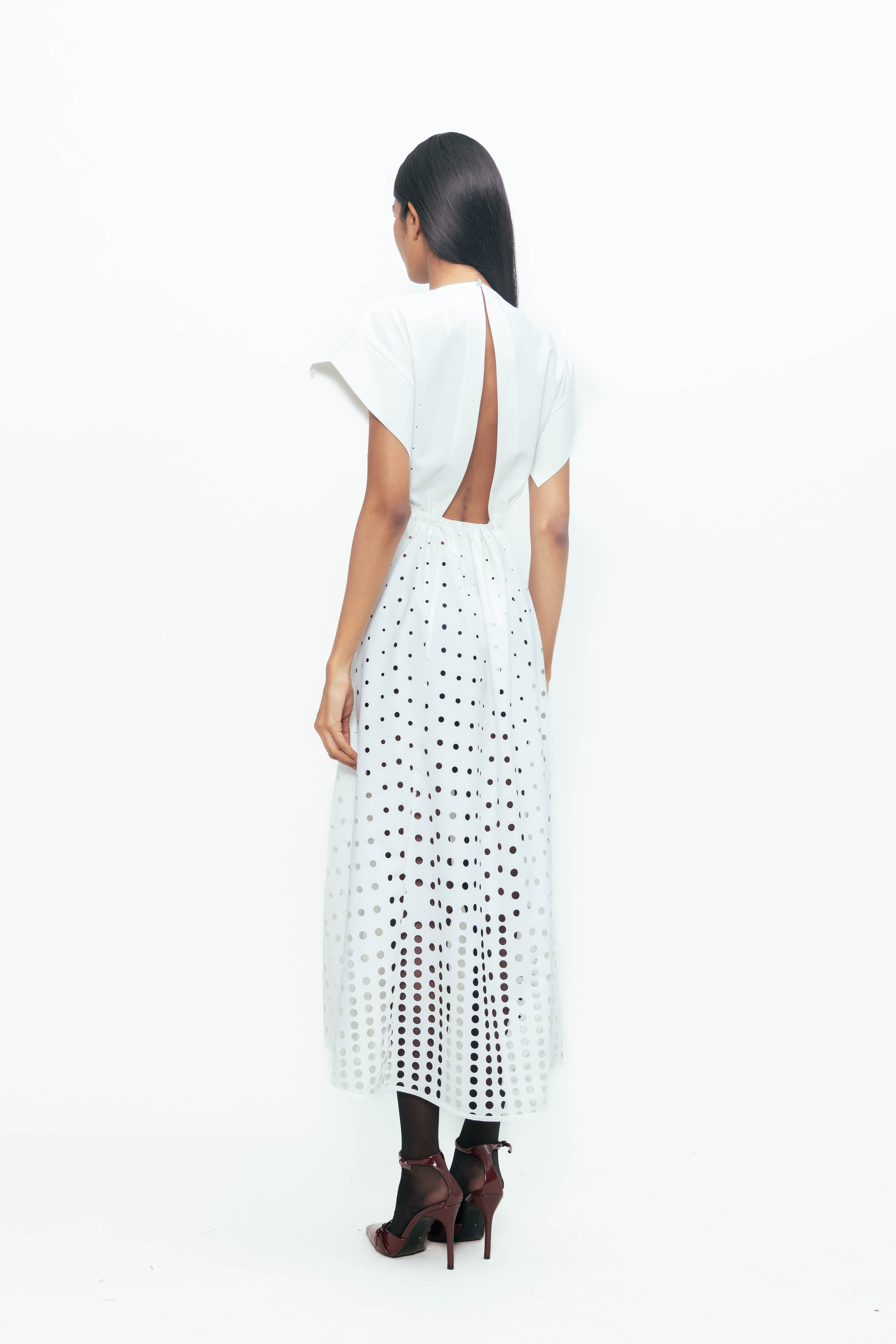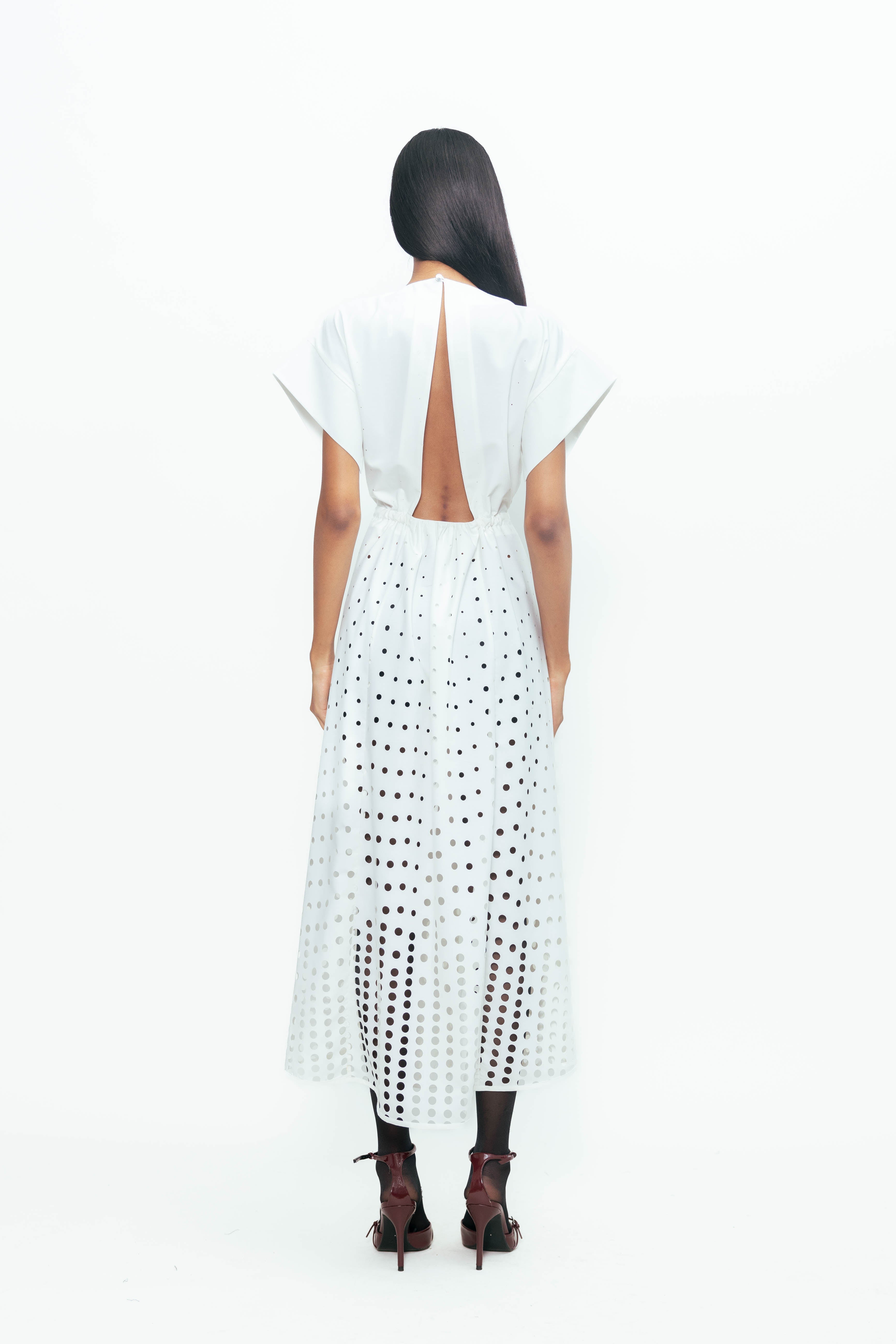 This dress features a laser-cut mesh fabric that creates a lightweight, breathable feel, perfectly balanced with an open back design for a bold, modern look.