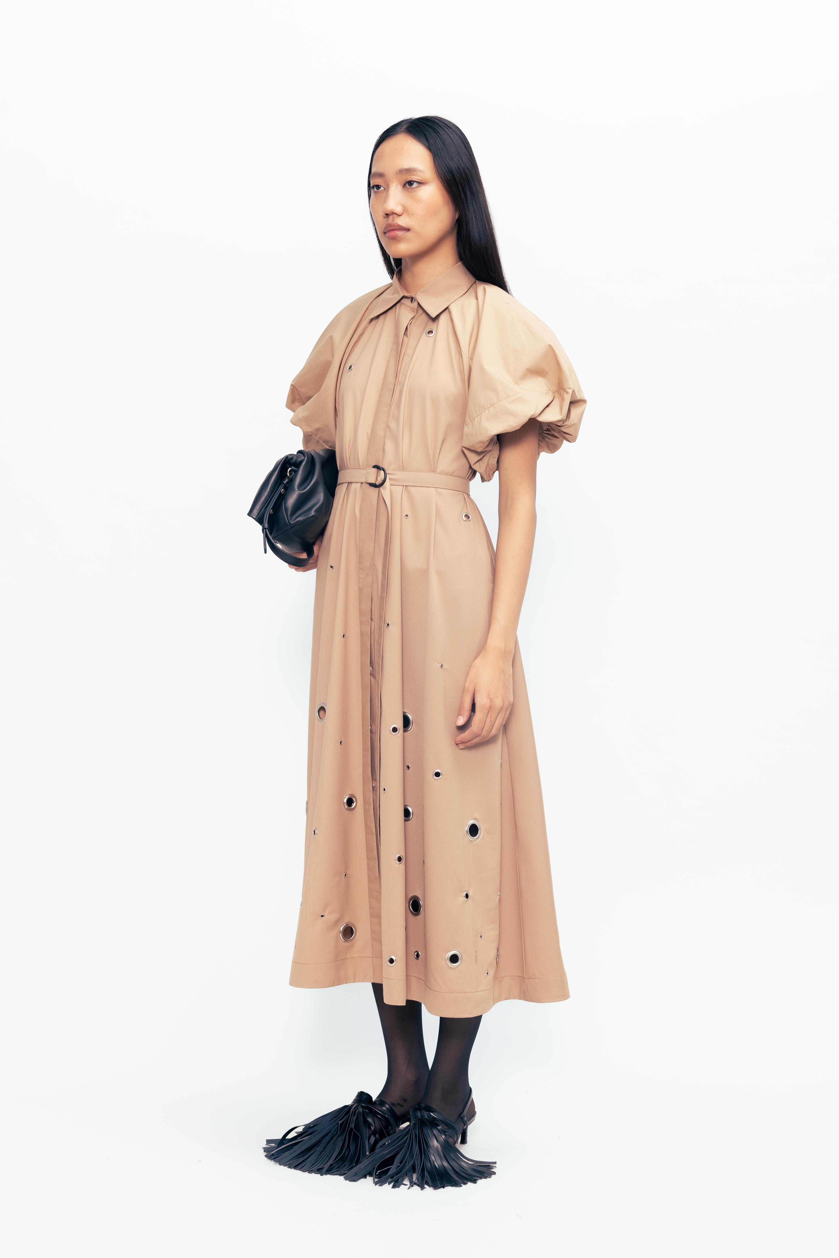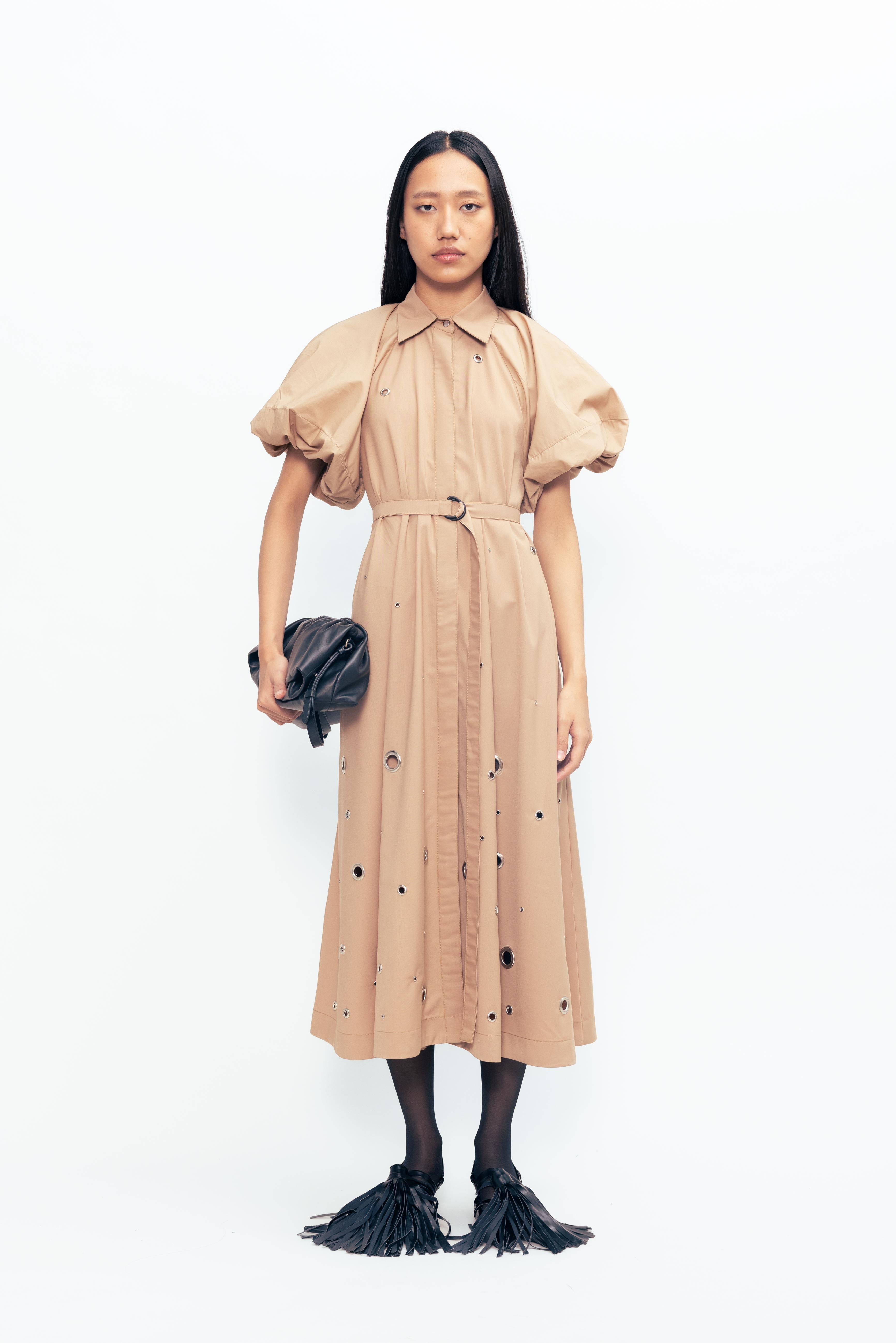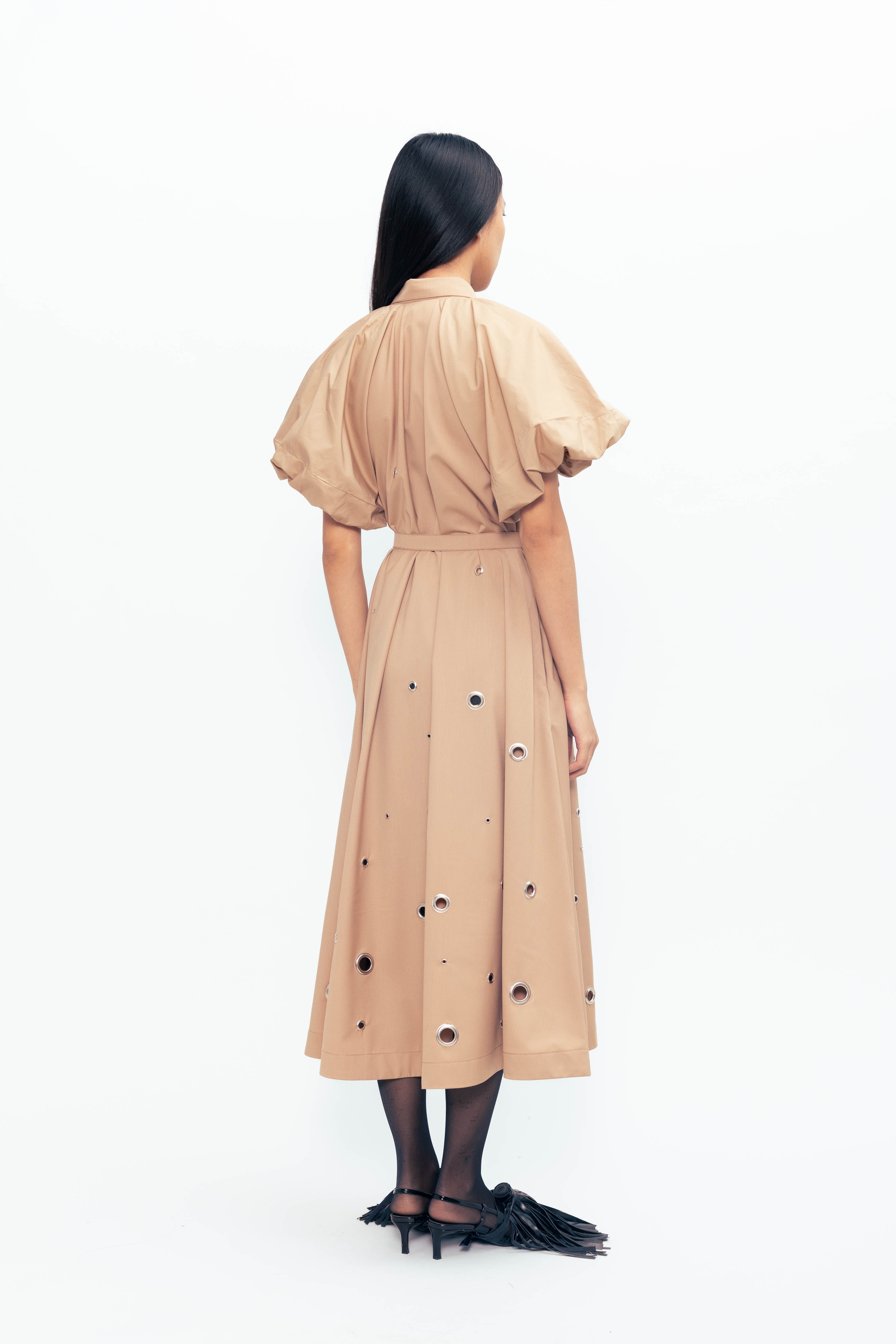 This puff-sleeved maxi dress blends romantic volume with a touch of edge. The soft, dramatic sleeves add a feminine silhouette, while metallic rivet detailing introduces a modern, structured contrast.
