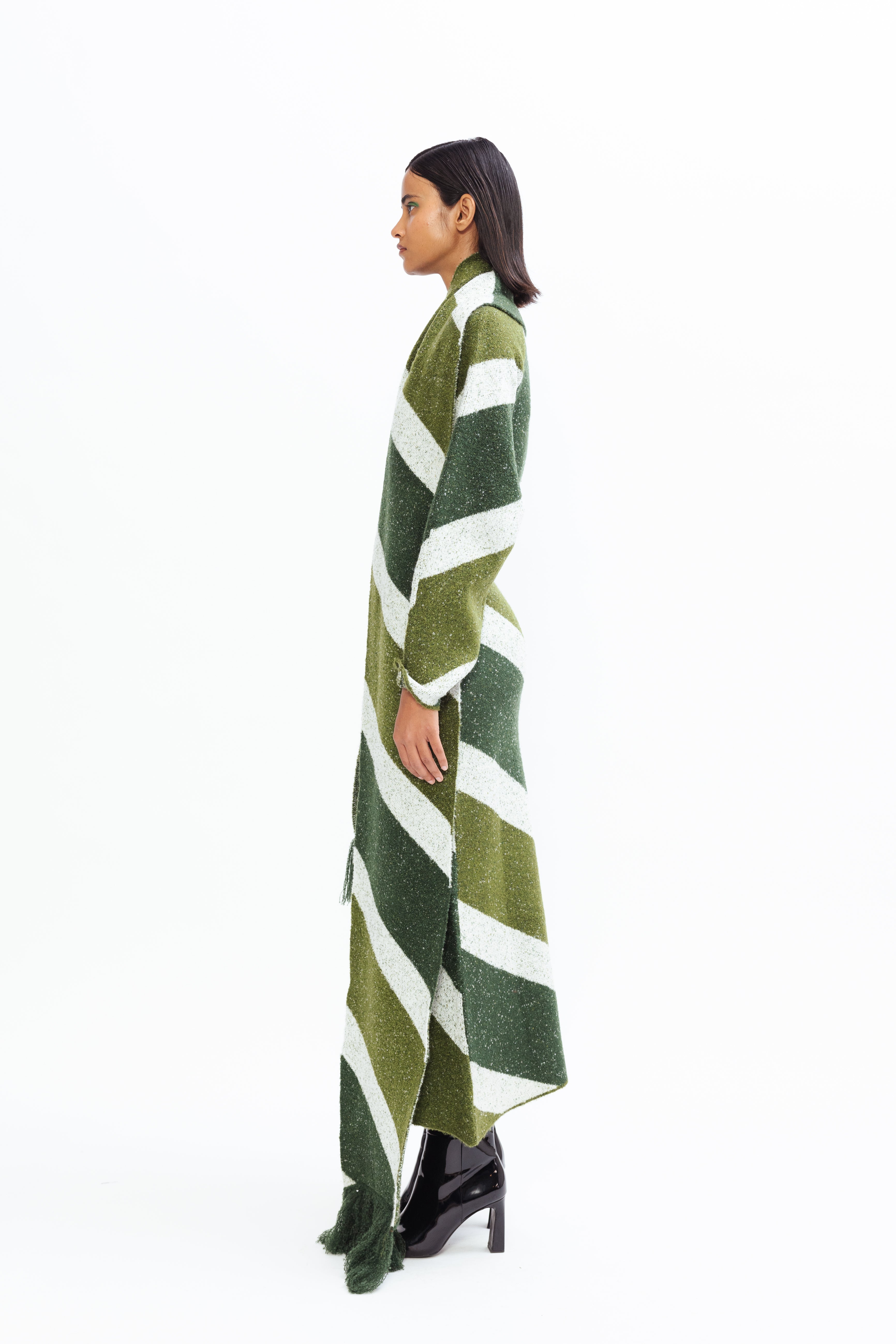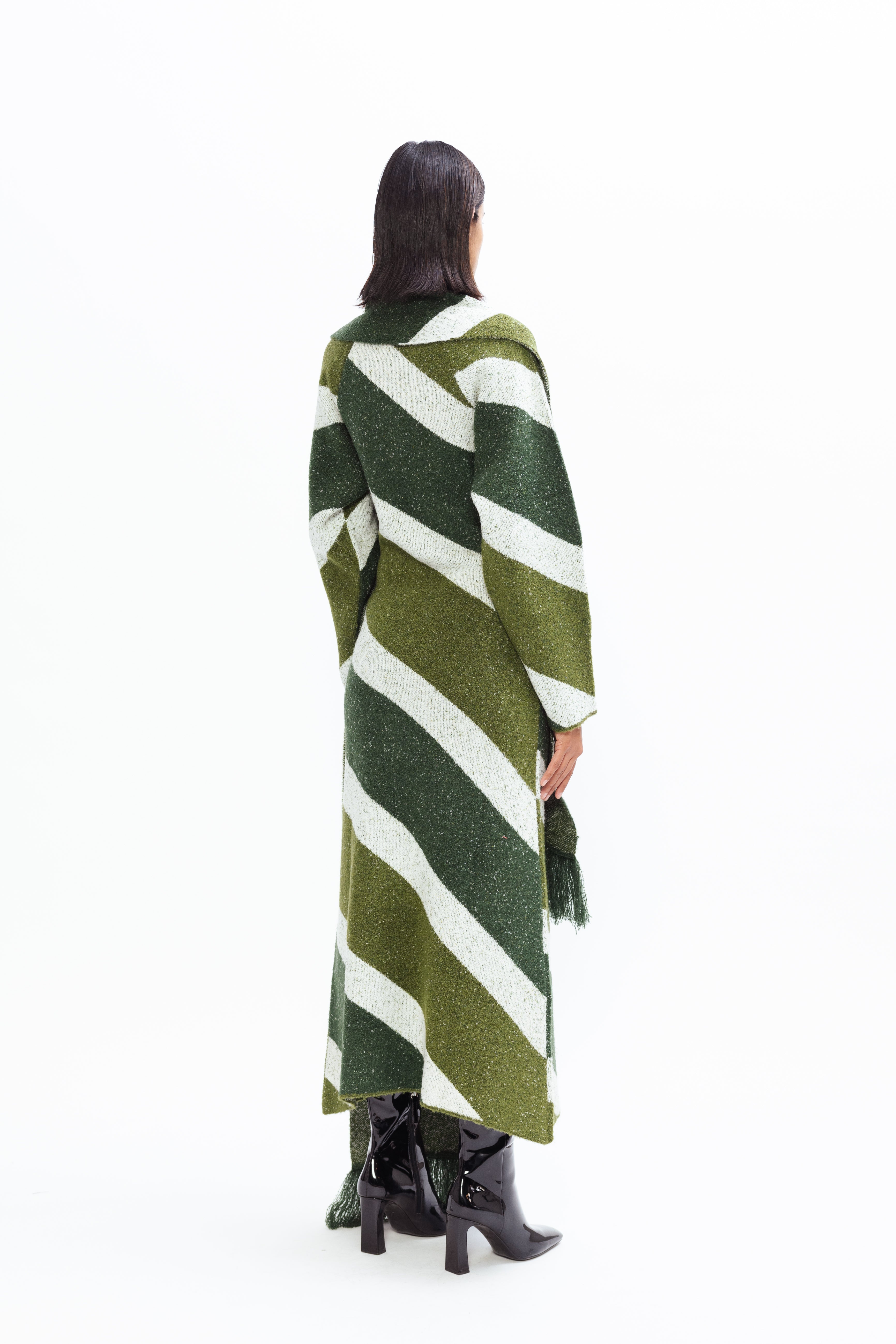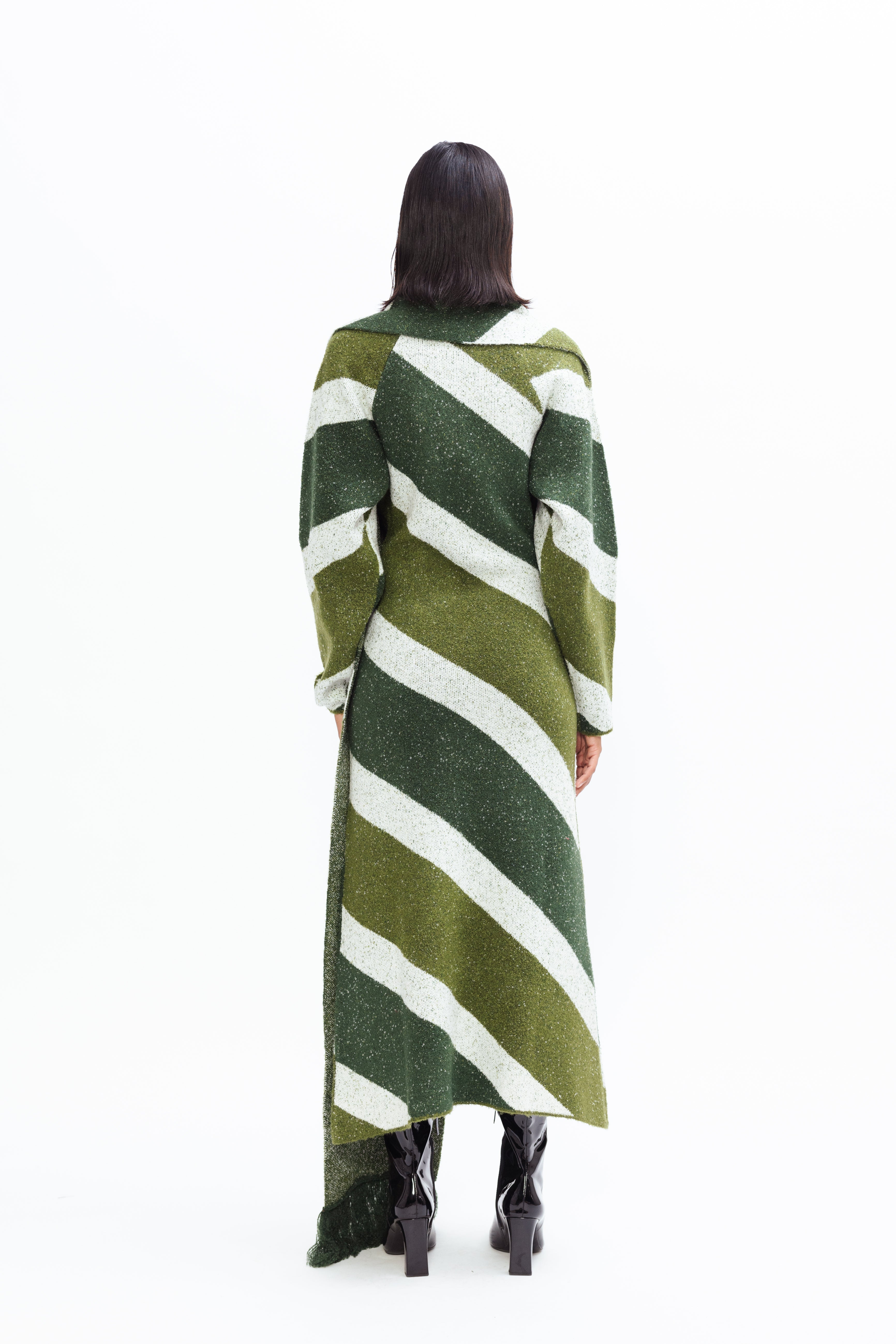 A knit polo dress featuring full sleeves and a striking stripe pattern in hunter green, olive, and ivory. The soft, textured fabric provides comfort while the classic polo collar and tailored silhouette offer a polished, versatile look suitable for casual outings or refined daytime events.