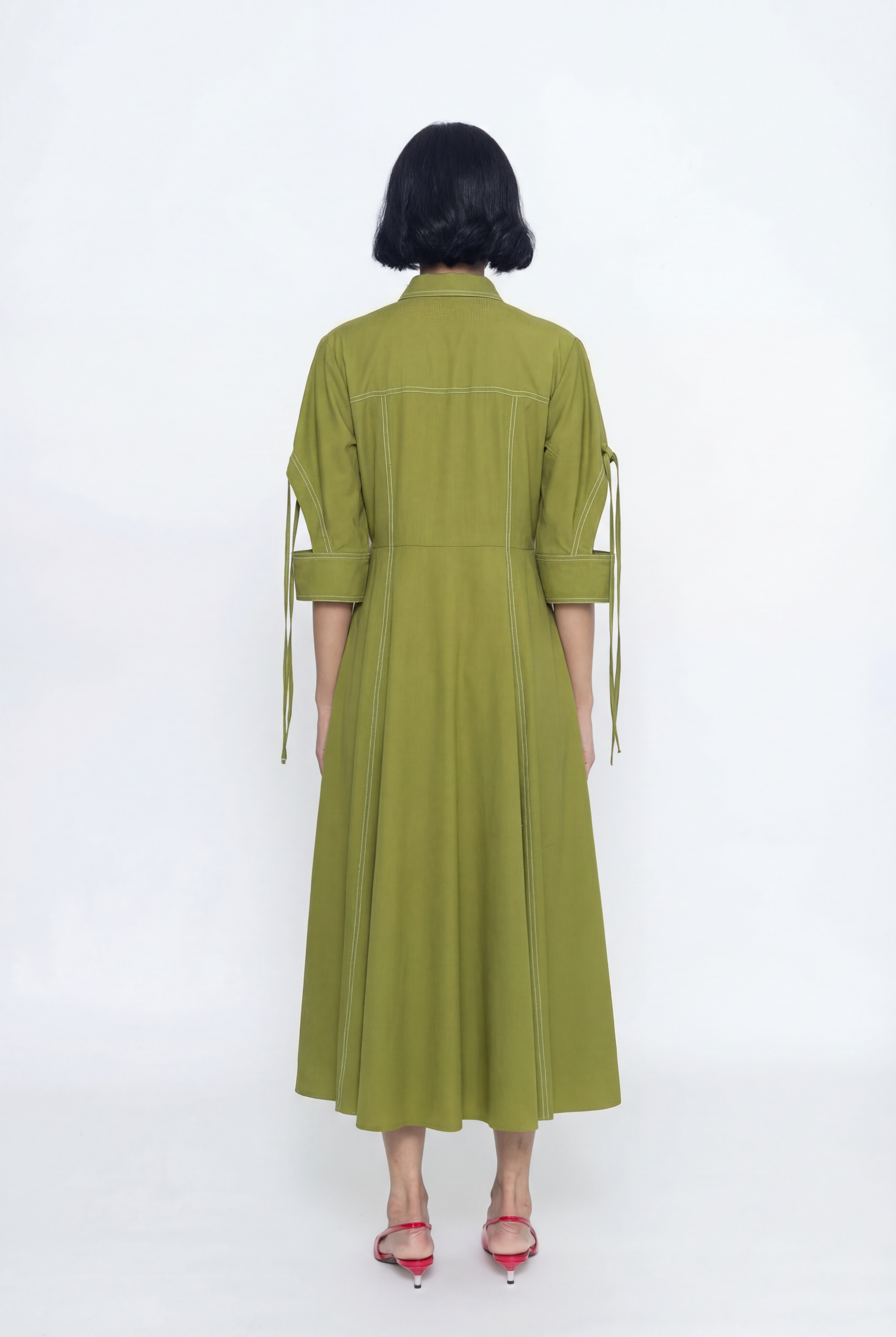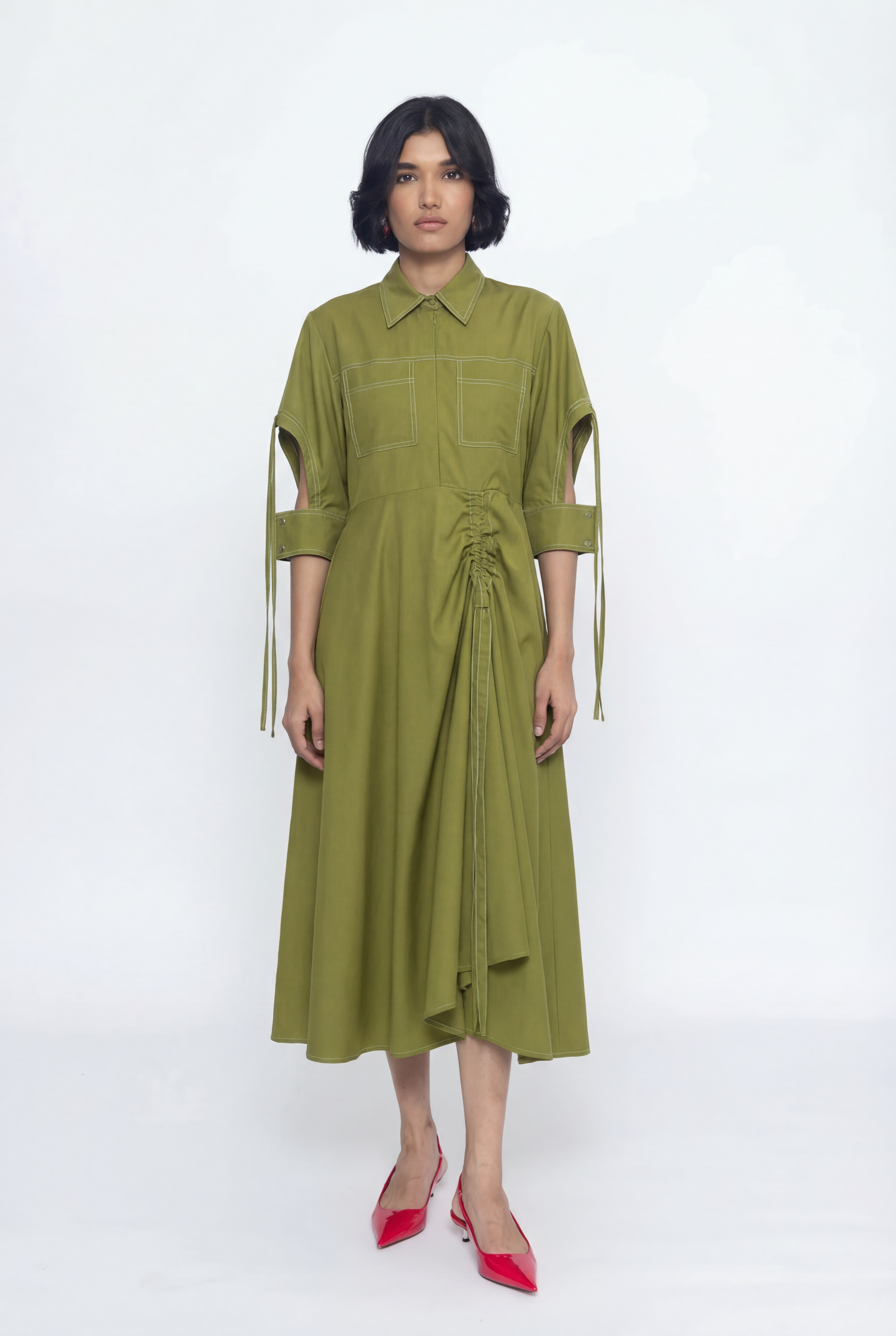 A mid-length dress with contrast top stitching, bust pockets cut out, and tying details at the sleeves exudes a blend of sophistication and playful charm. The contrast topstitching adds visual interest and highlights the dress's silhouette. Bust pockets with cut-out details offer a modern twist on a classic design element. Tying details at the sleeves add a touch of femininity and versatility. Additionally, tying detail below the waist enhances the dress's silhouette and offers a flattering fit. This combination of features creates a stylish and unique ensemble suitable for various occasions, from casual outings to more formal events.