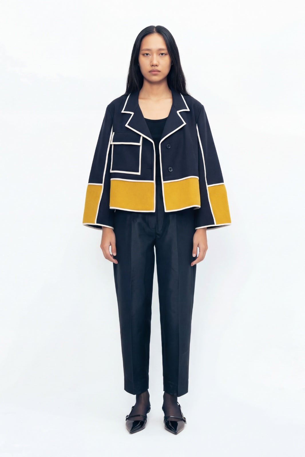 The woolen color block jacket combines warm, cozy wool with a dynamic design featuring distinct color blocks. Its contrast binding highlights the edges, adding a sharp detail that elevates the overall look. A convenient pocket enhances its practicality, making it perfect for everyday wear. This jacket blends comfort with a modern aesthetic, making it an ideal choice for chilly weather while maintaining a stylish flair.