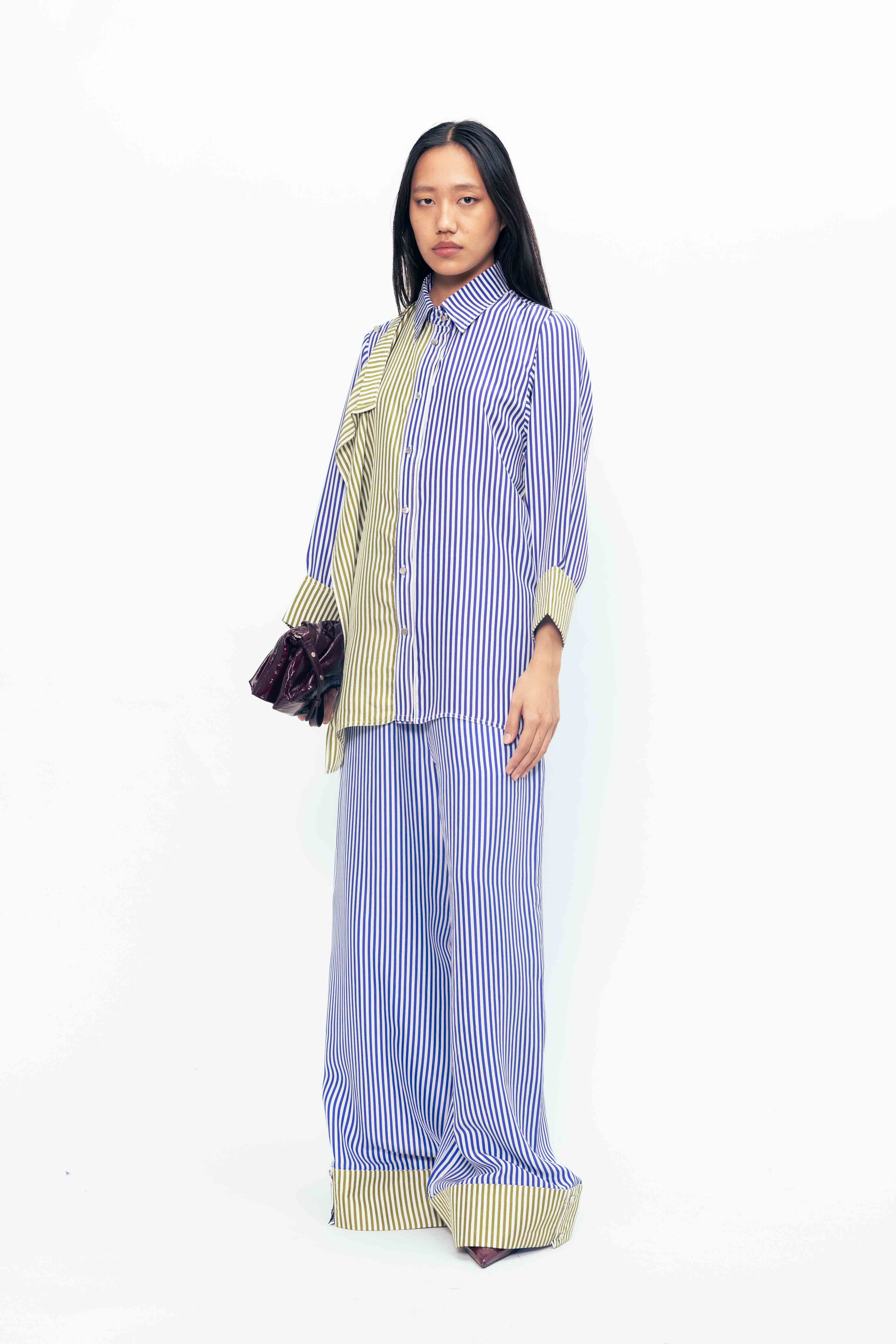 The classic juxtaposed button-down flap shirt offers a fresh spin on timeless shirting. Designed with asymmetrically placed flaps and a clean button-down front, it plays with proportion while maintaining a flowy, soft silhouette.