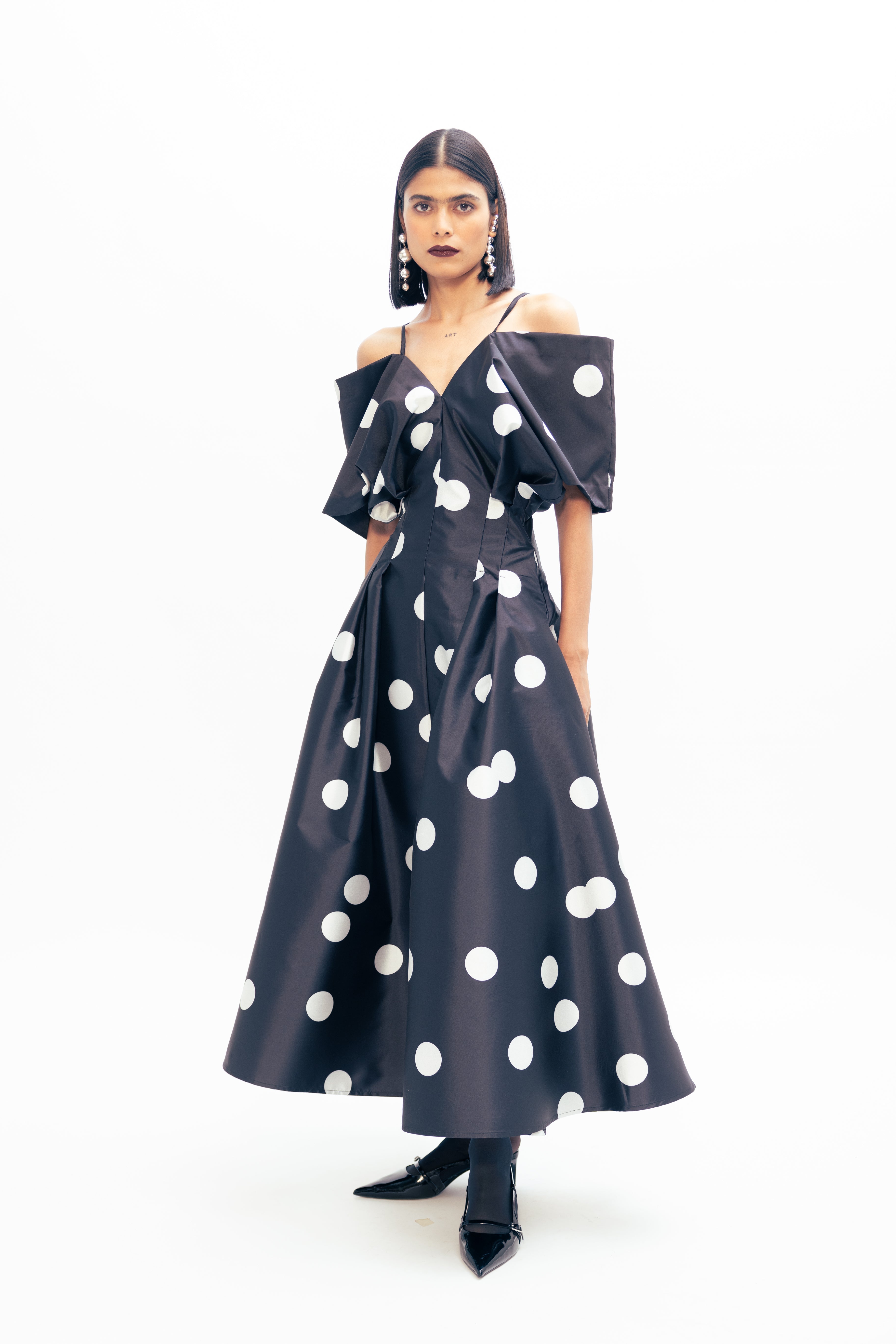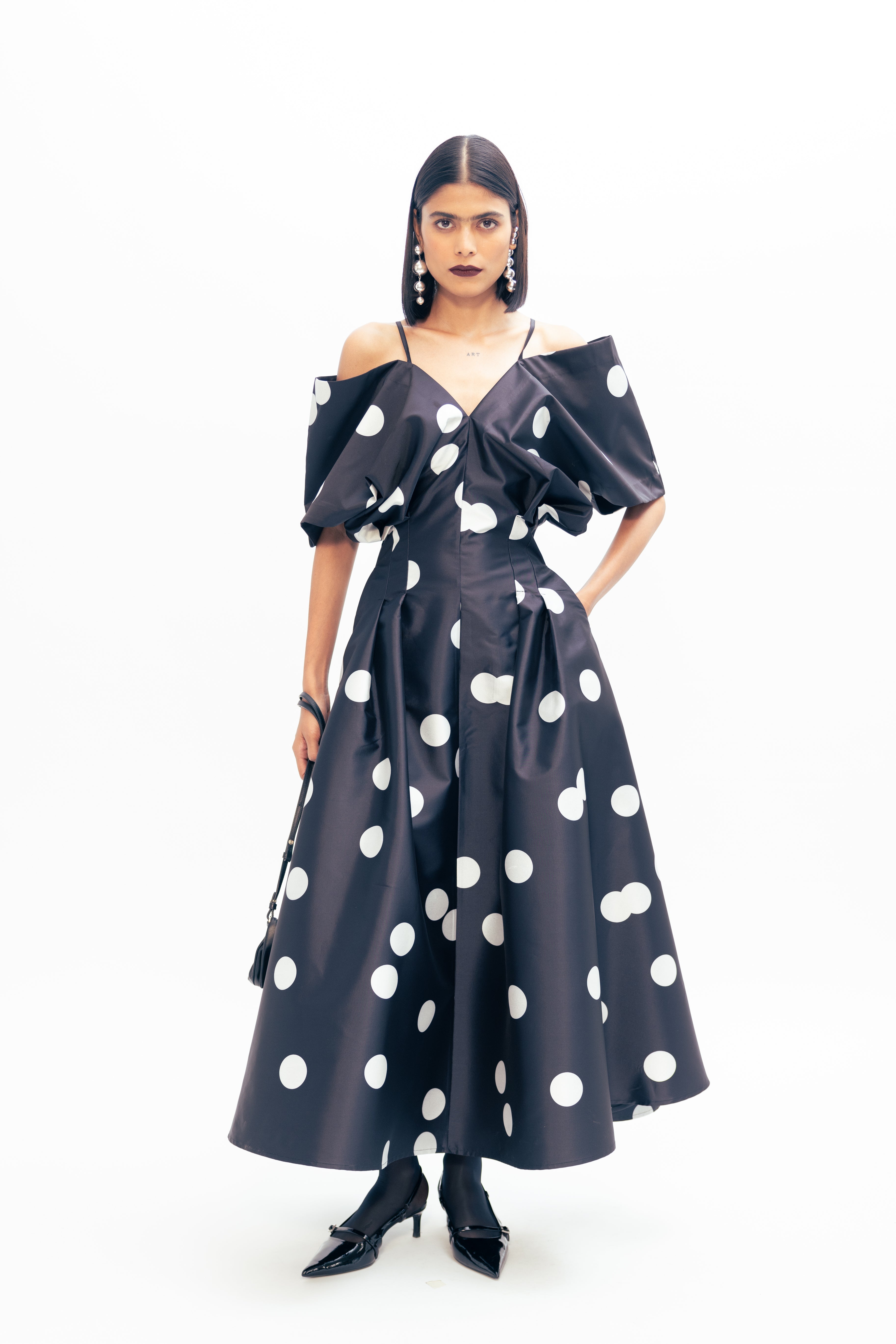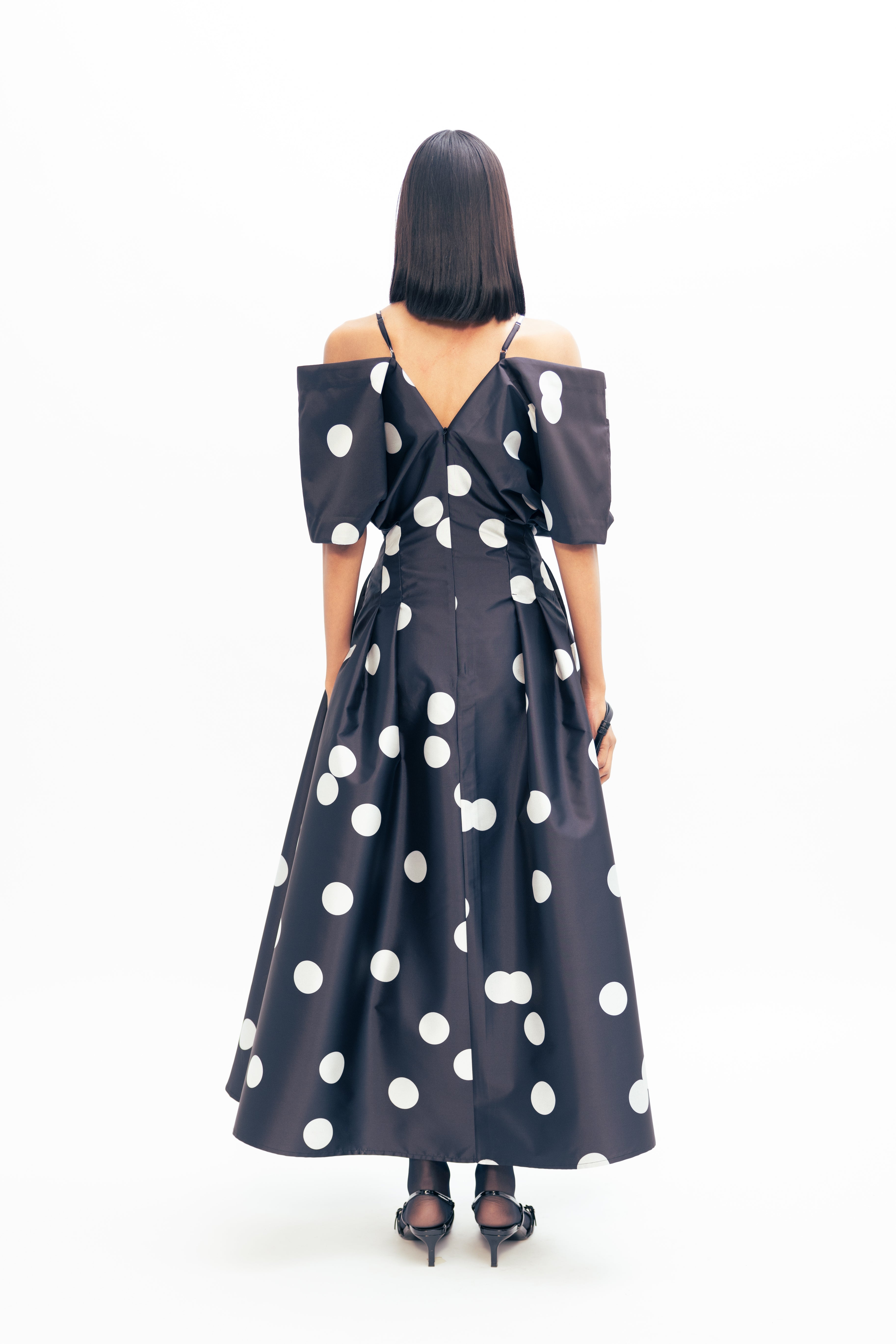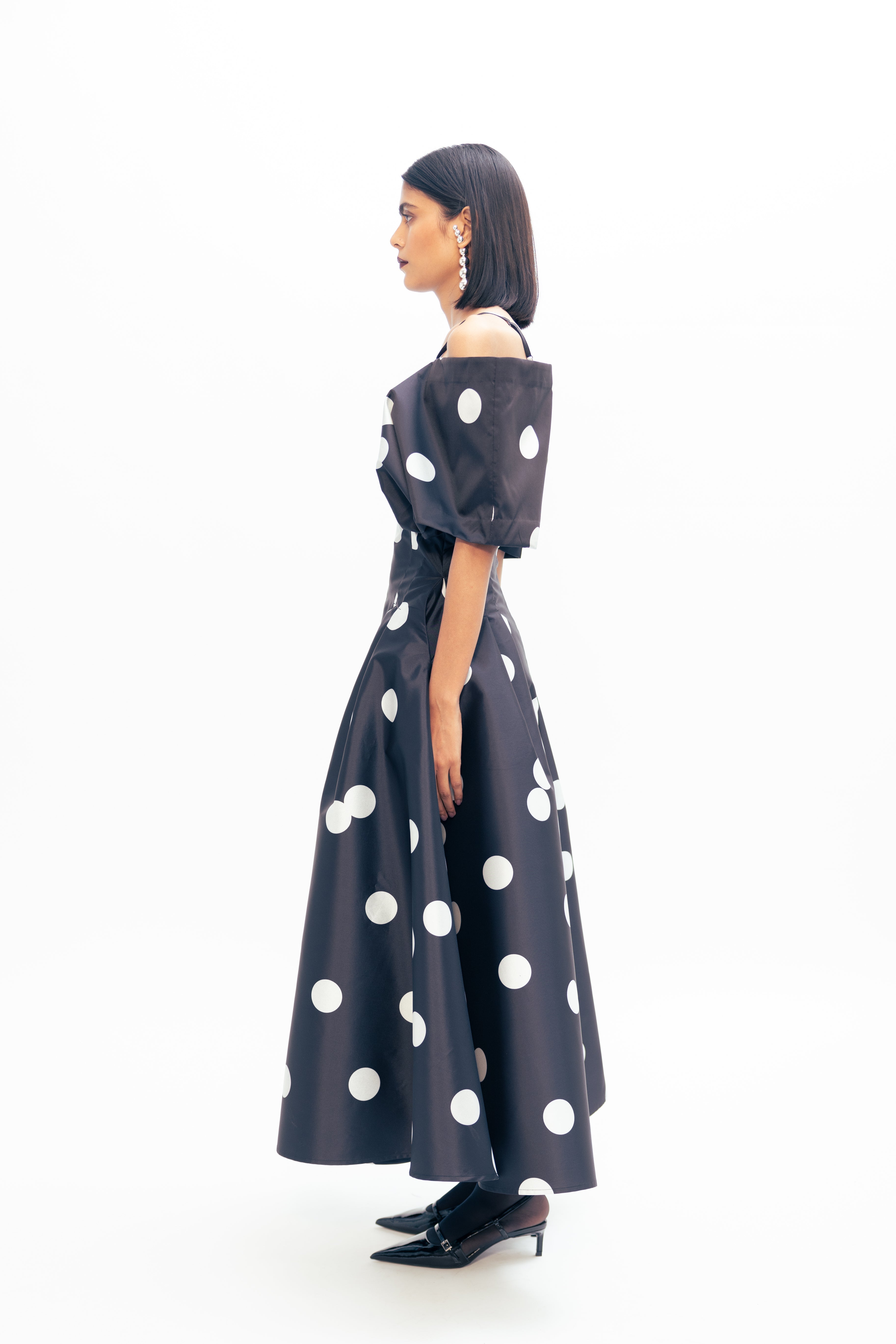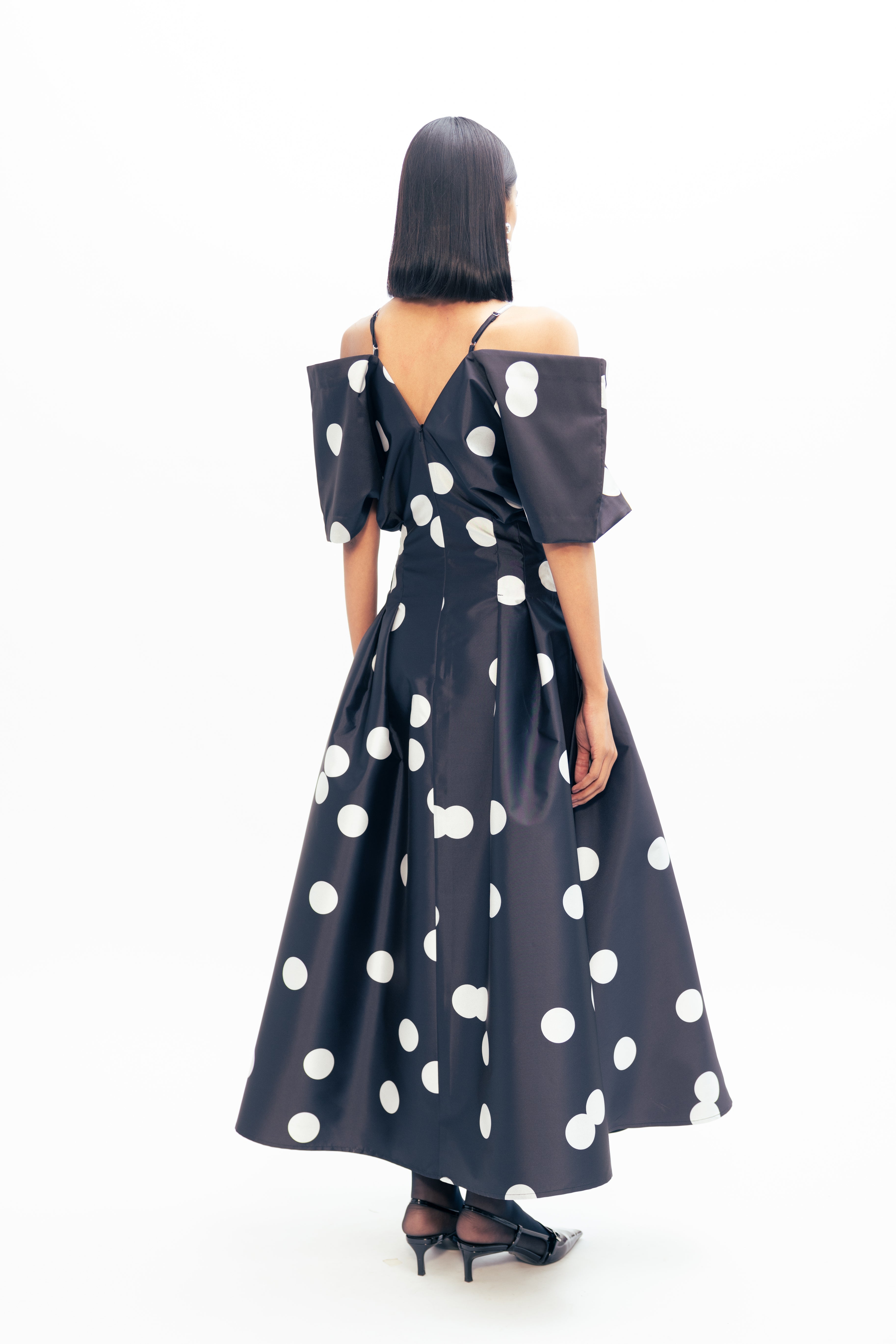 A voluminous silhouette commands attention with bold proportions and sculptural folds. Oversized circular motifs bring playful contrast to the crisp surface, while the off-shoulder neckline and structured pleats frame the form with intention. Subtle sheen and fluidity add movement, creating a striking interplay of elegance and drama. Finished with delicate straps and a cinched waist, this piece transforms presence into statement.