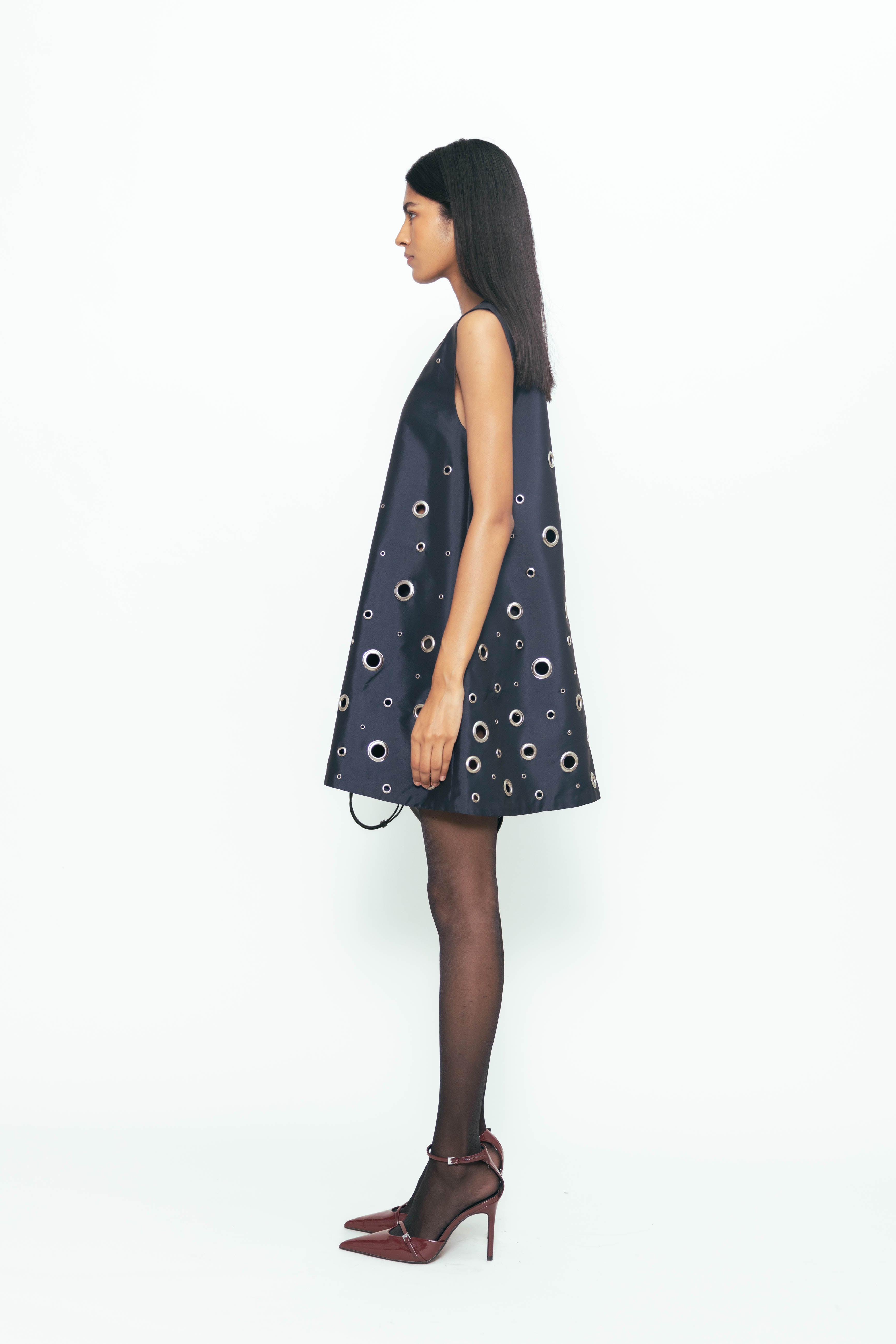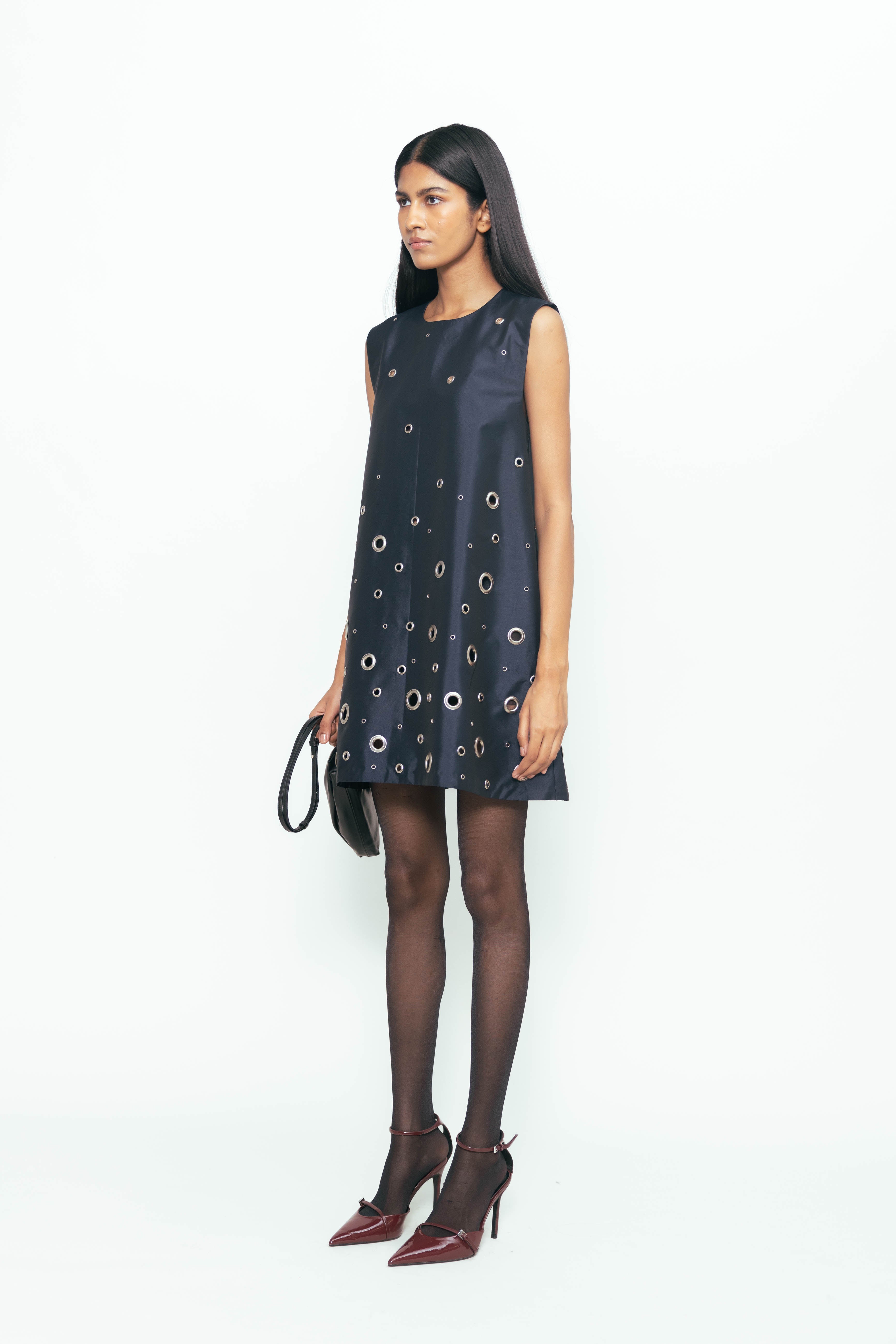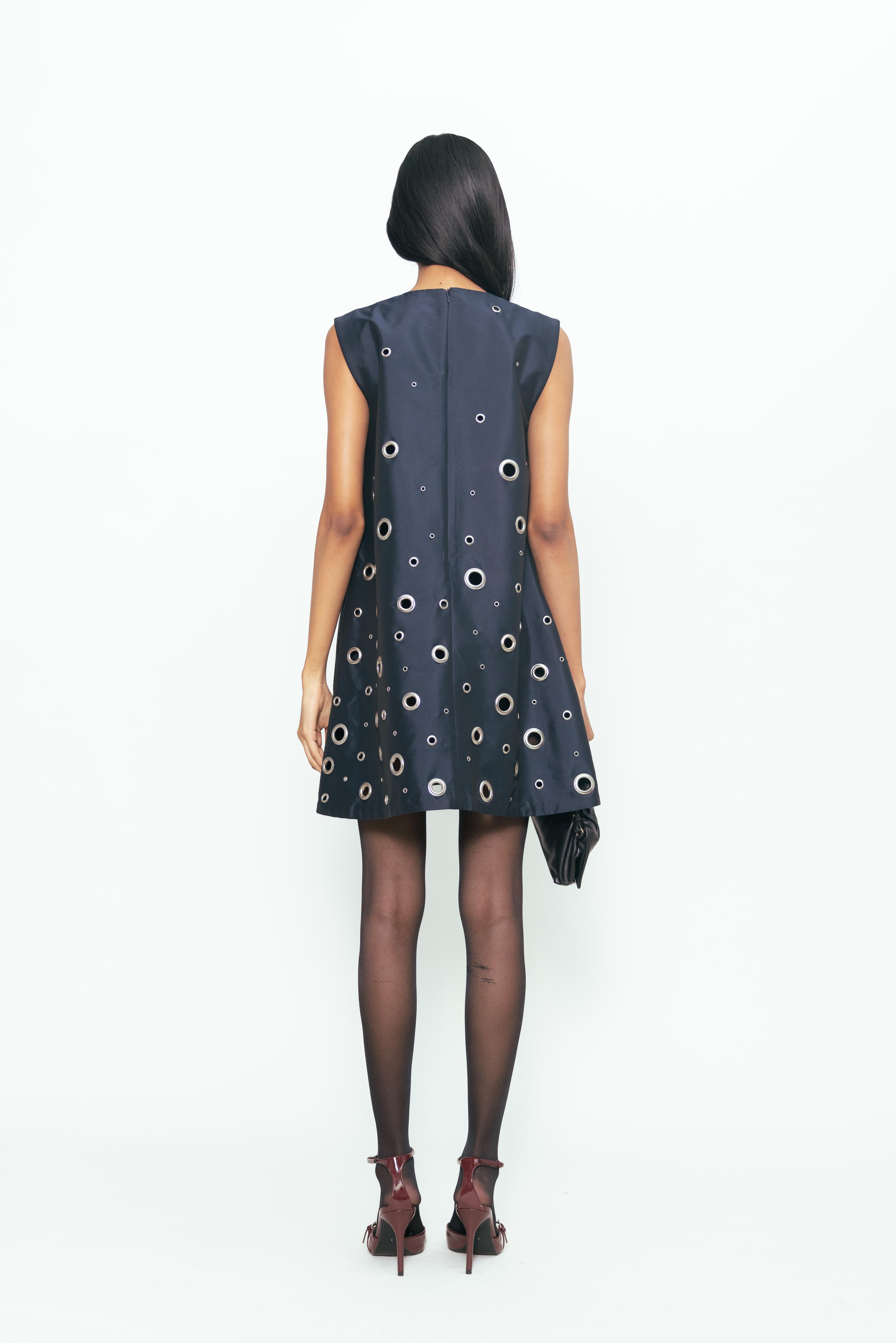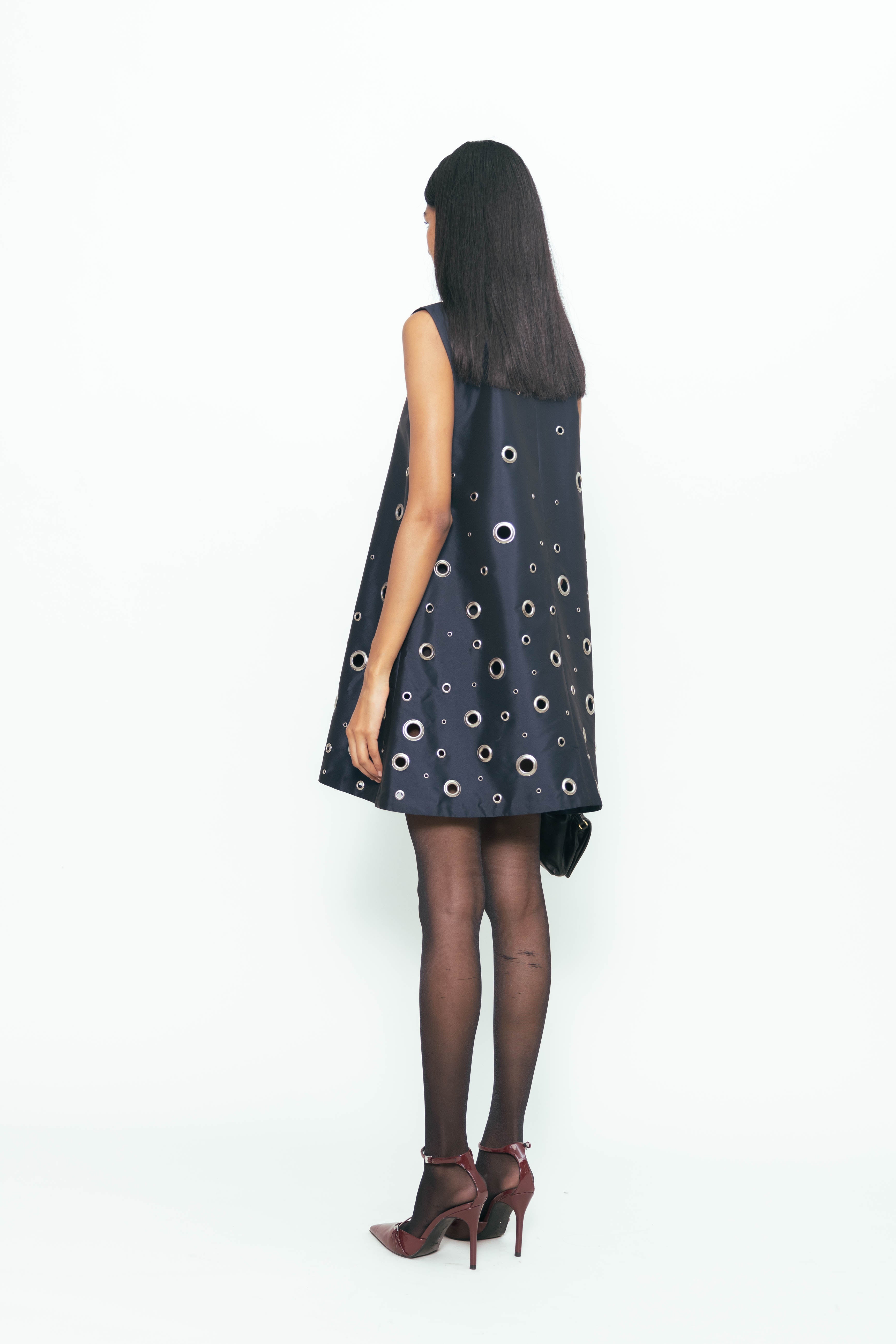 This Cocktail Dress with Rivets Burst features a sleek, body-contouring fit with a bold rivet burst design across the bodice. Crafted in Taffeta, it offers both comfort and structure for evening wear.