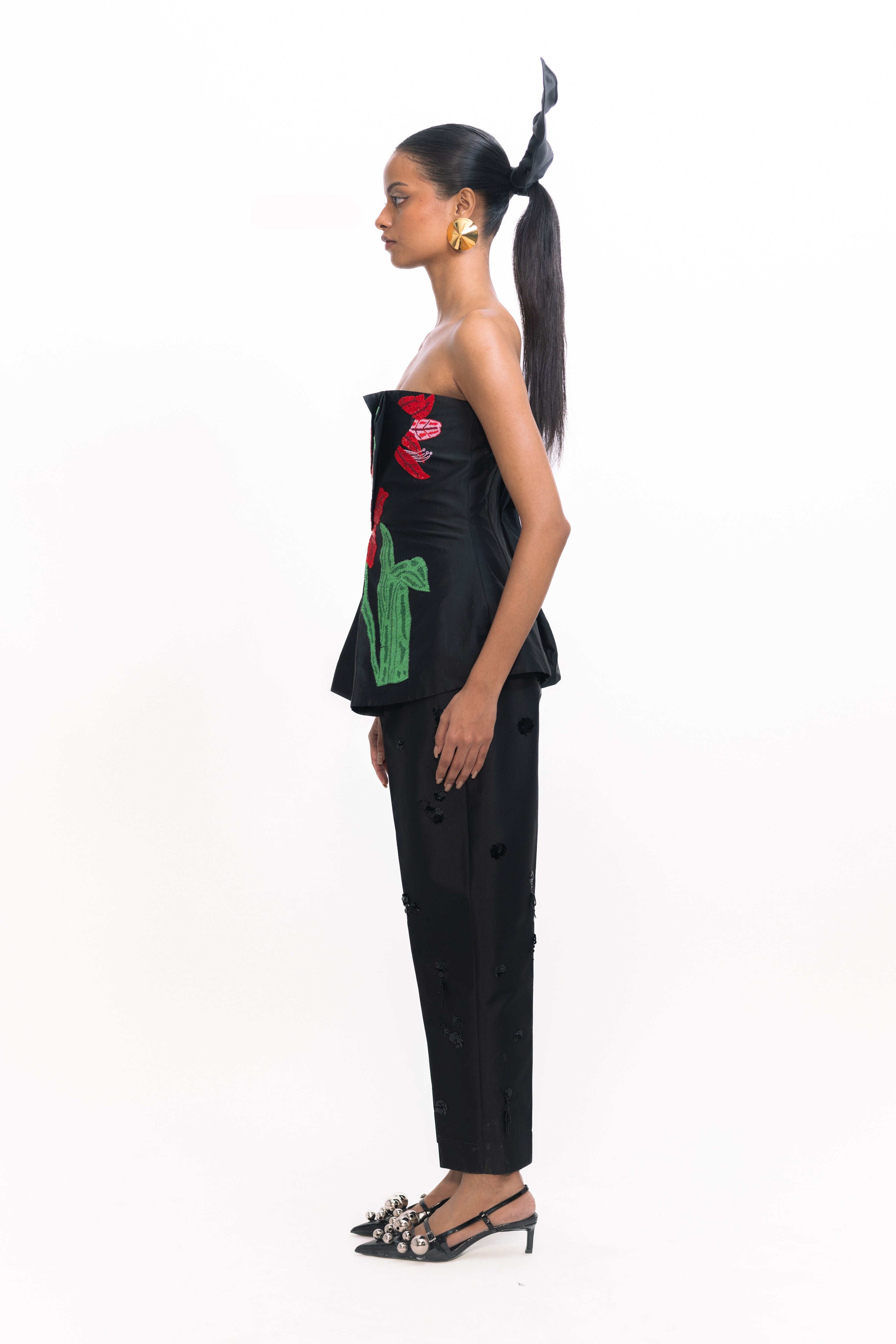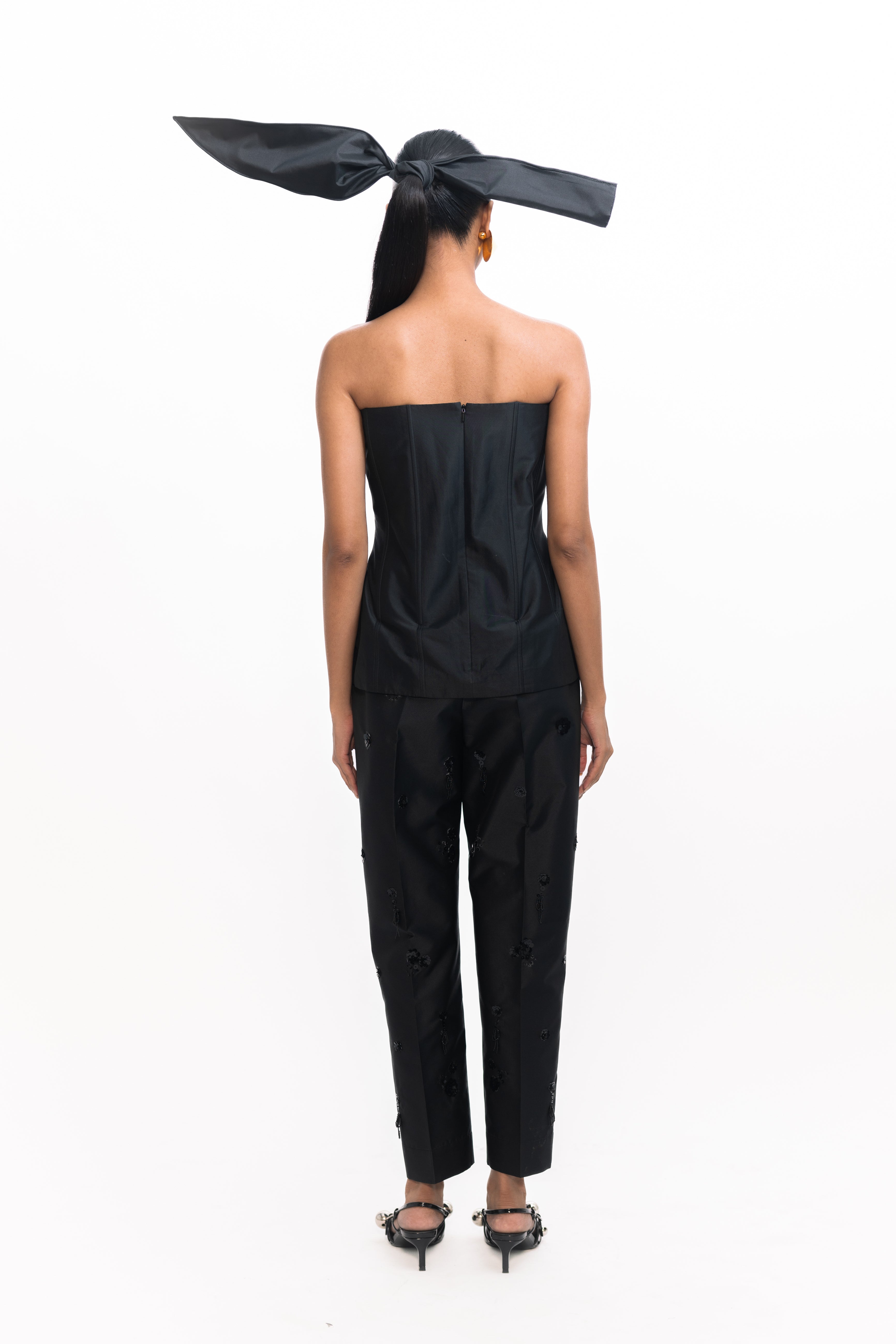 This fitted corset tube top combines sleek structure with delicate romance. The sculpted bodice is adorned with intricate floral embroidery accented by subtle sequins, adding a soft shimmer and textural detail. Perfect for pairing with high-waisted skirts or tailored trousers for an elevated evening look.