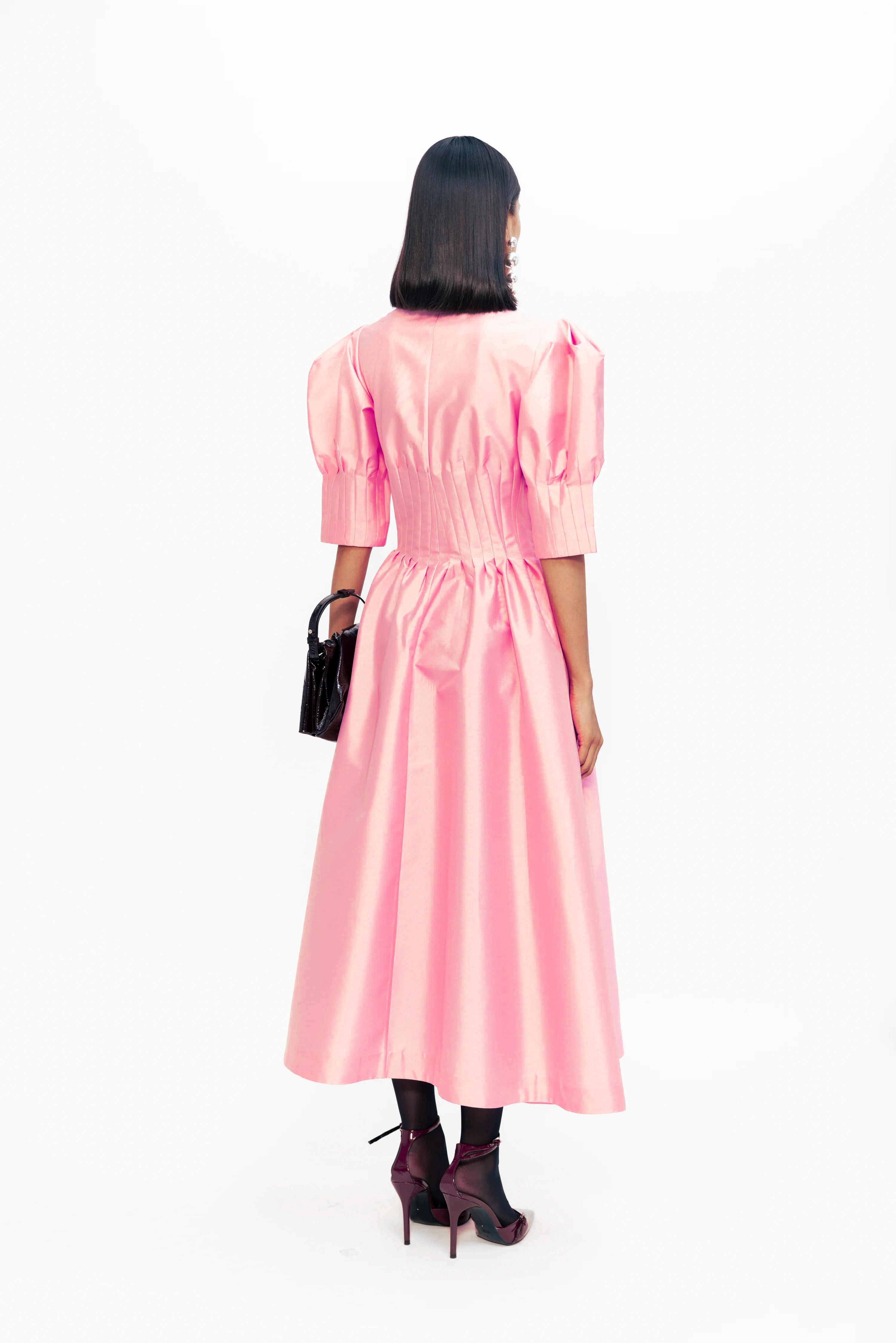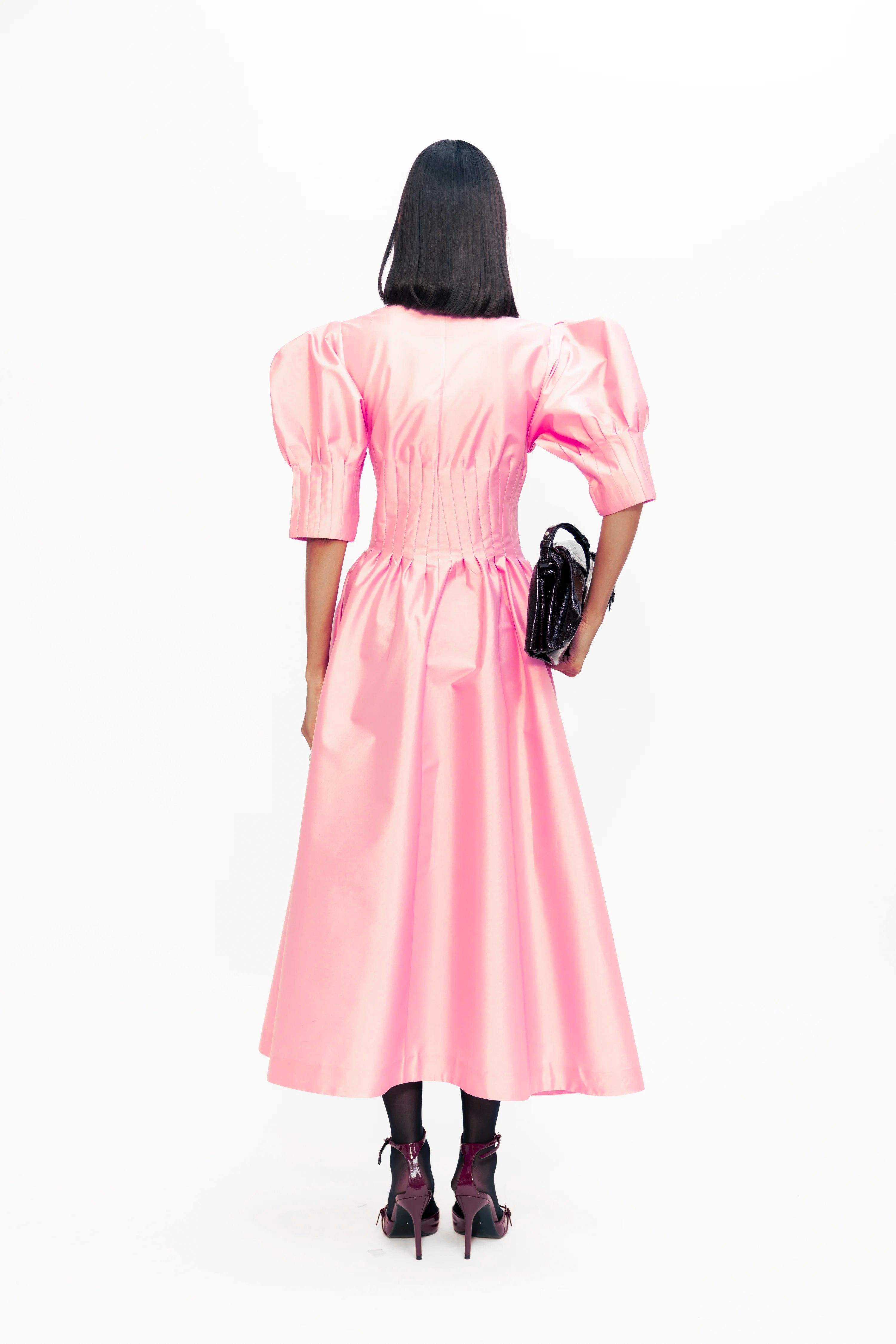 This midi shirt dress features a classic design cinched at the waist for a flattering silhouette. It boasts stylish puff sleeves with cuffs that add a touch of elegance and volume. The dress falls gracefully to a midi length, making it versatile for both casual and semi-formal occasions. Its combination of structure and softness offers a chic yet comfortable look.