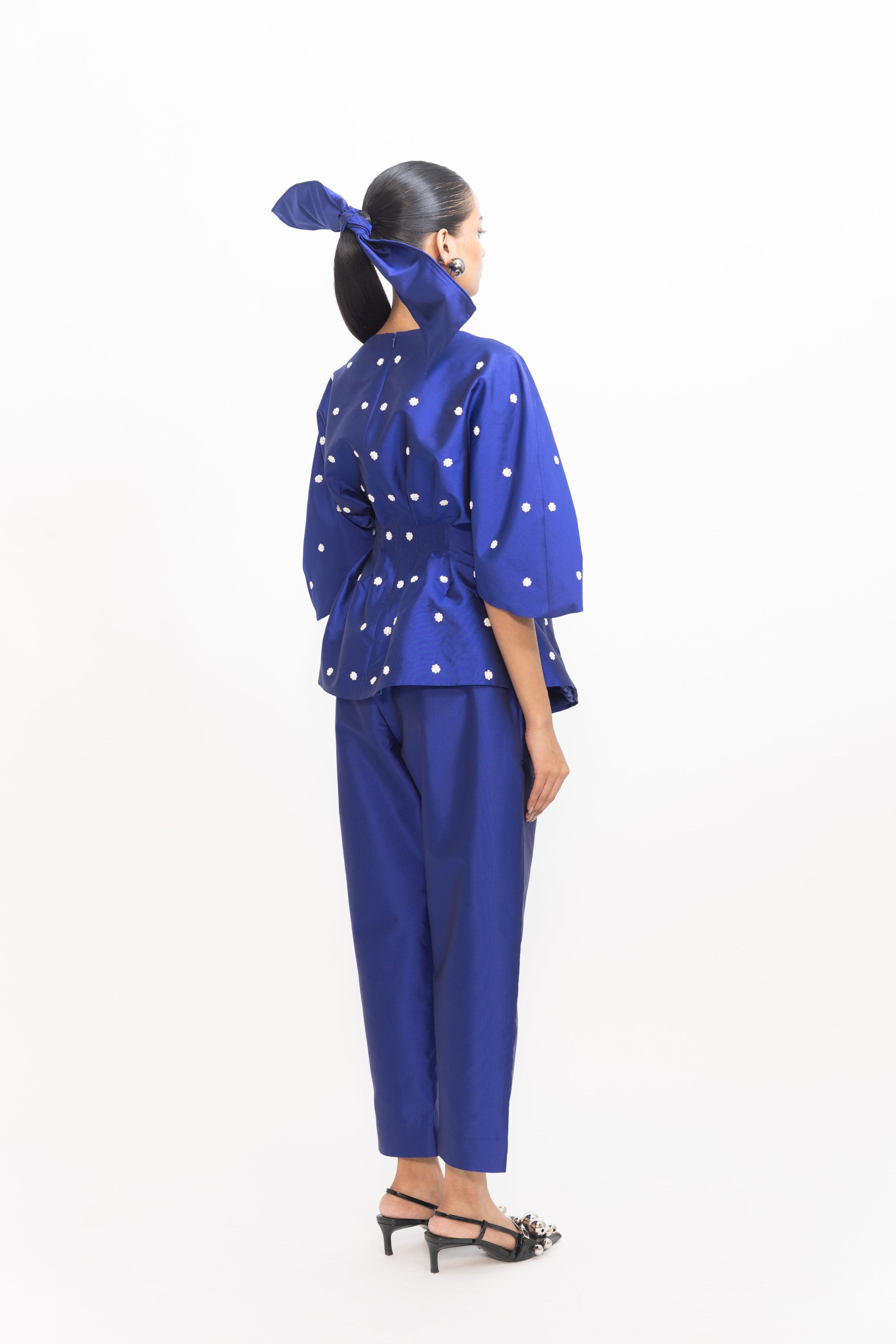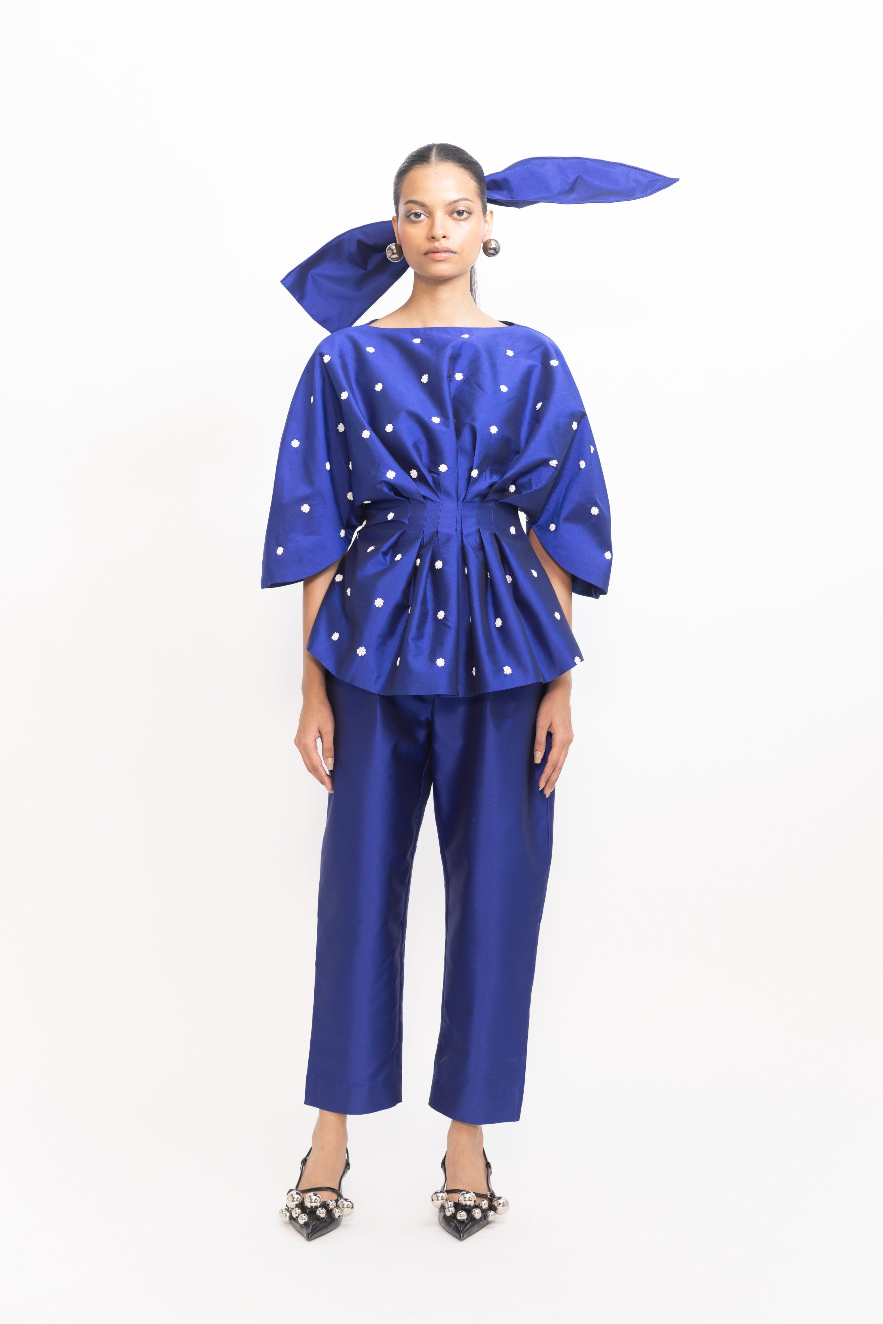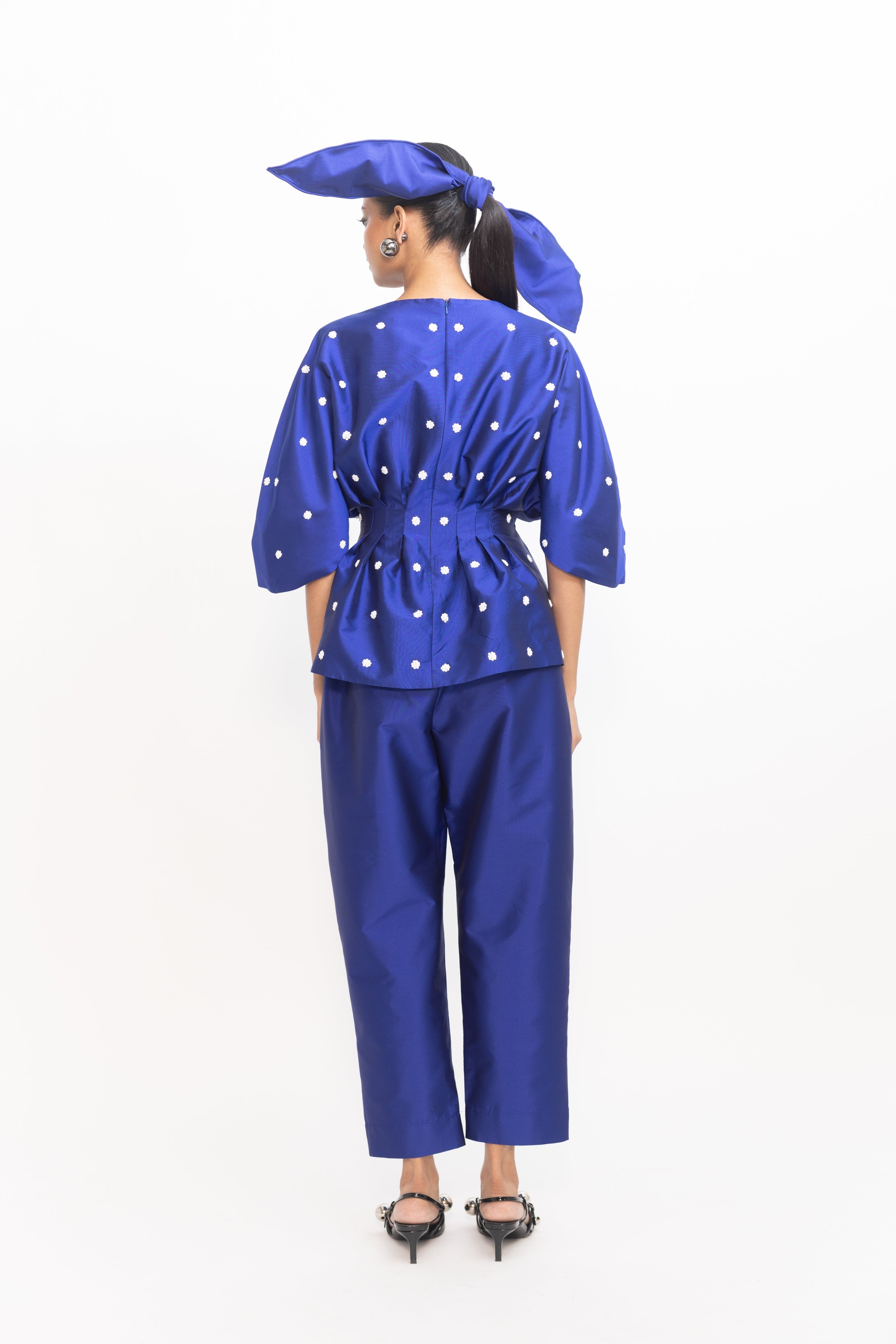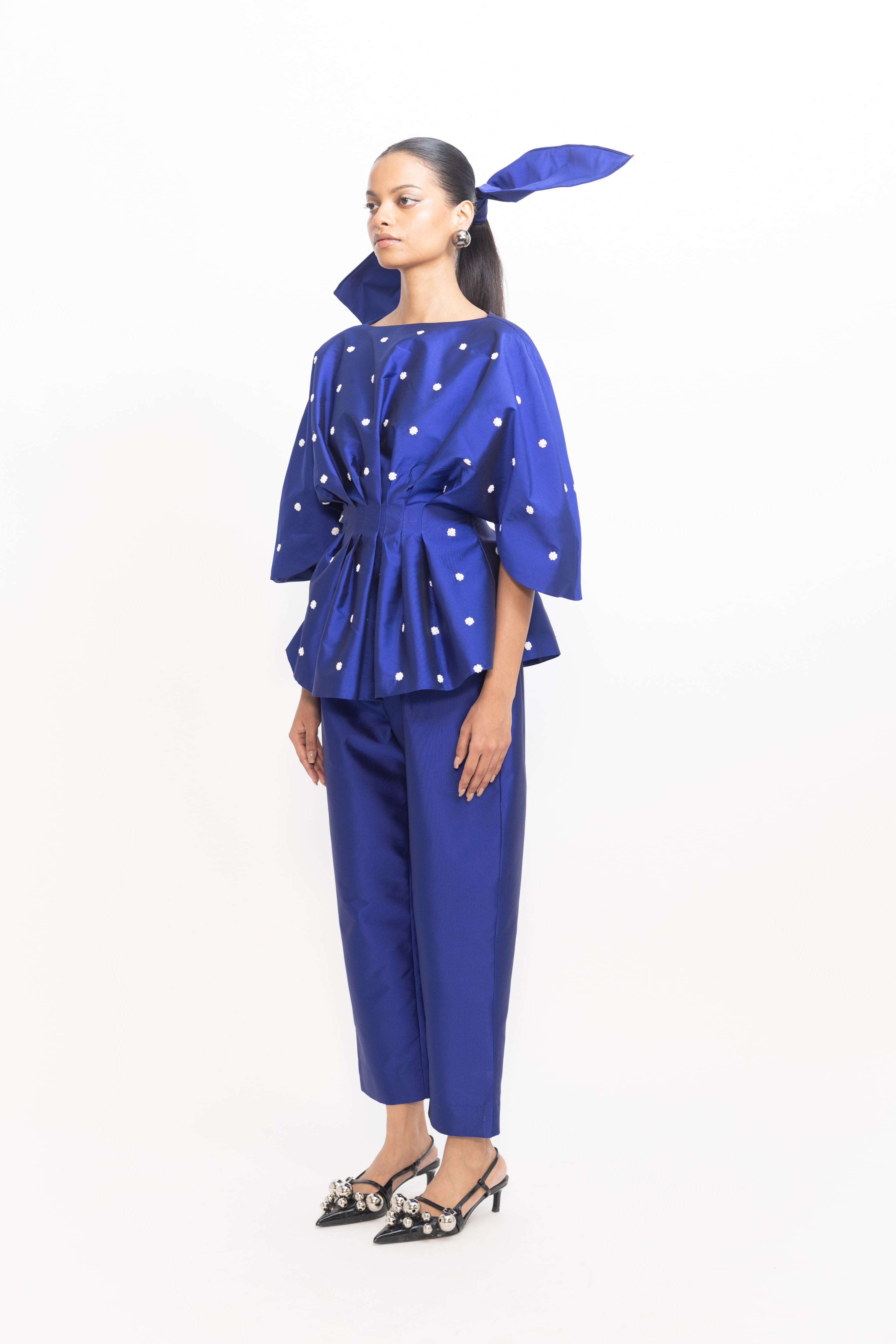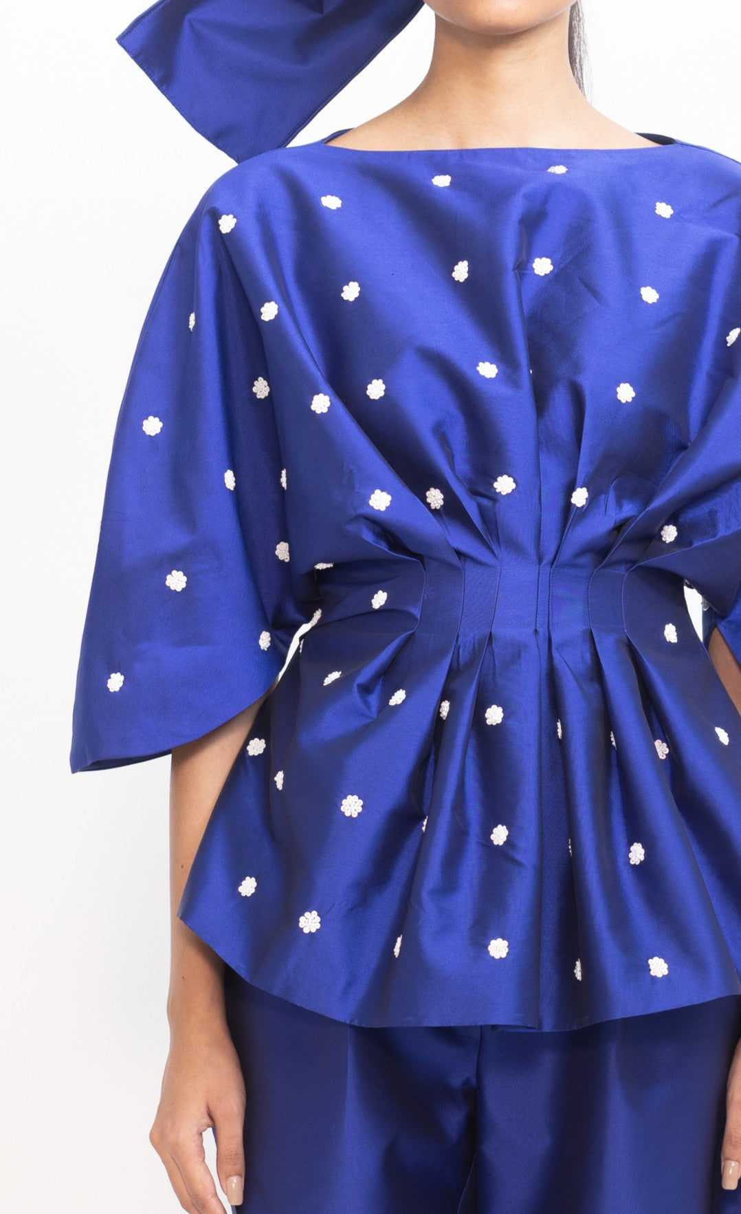 A timeless look with modern details, this top features intricate pleating at the waist for a subtle corset effect that beautifully defines the silhouette. Delicate floral sequins add a touch of shimmer and texture, while buttoned sleeves lend a refined finish—perfect for both daytime celebrations and evening occasions.