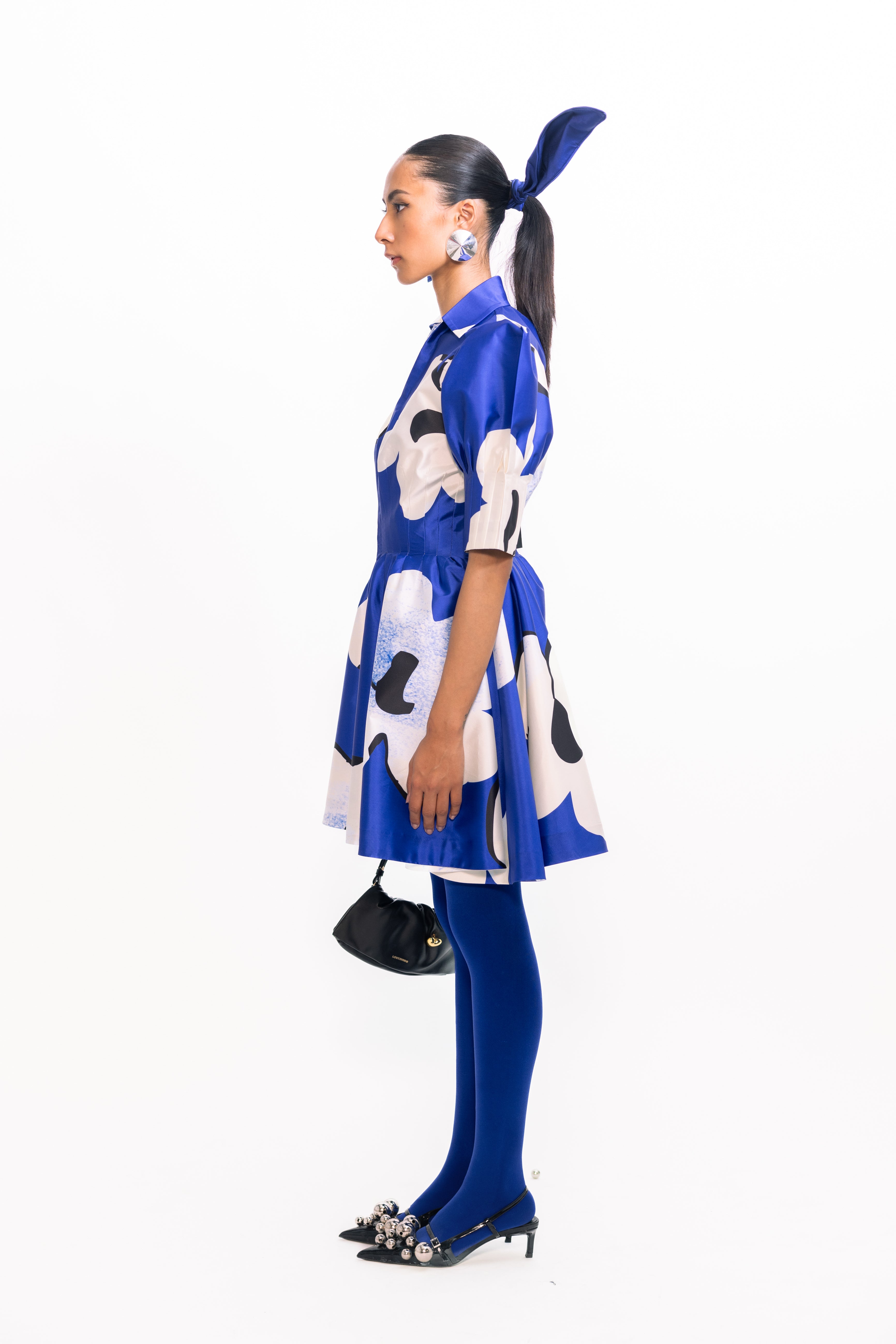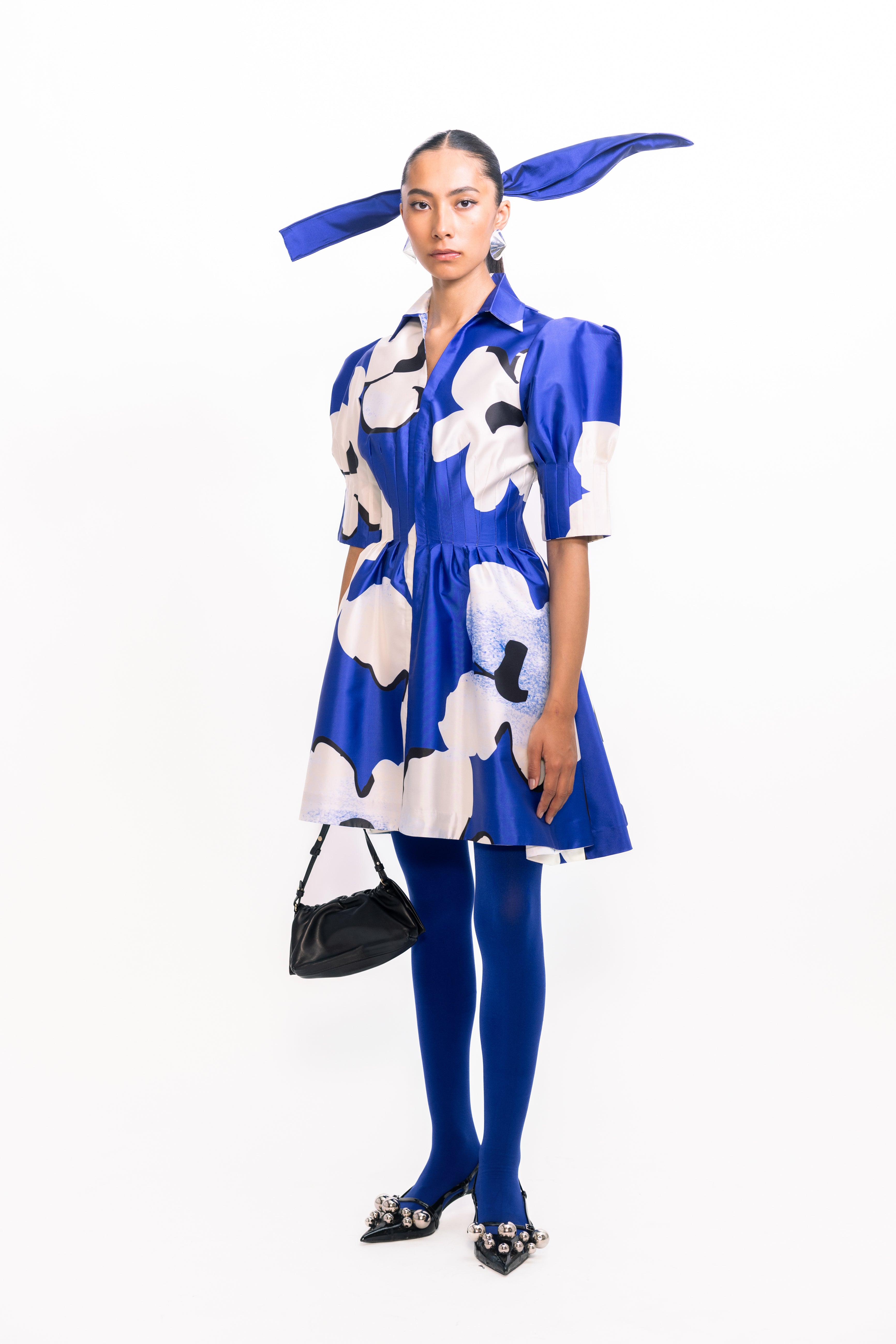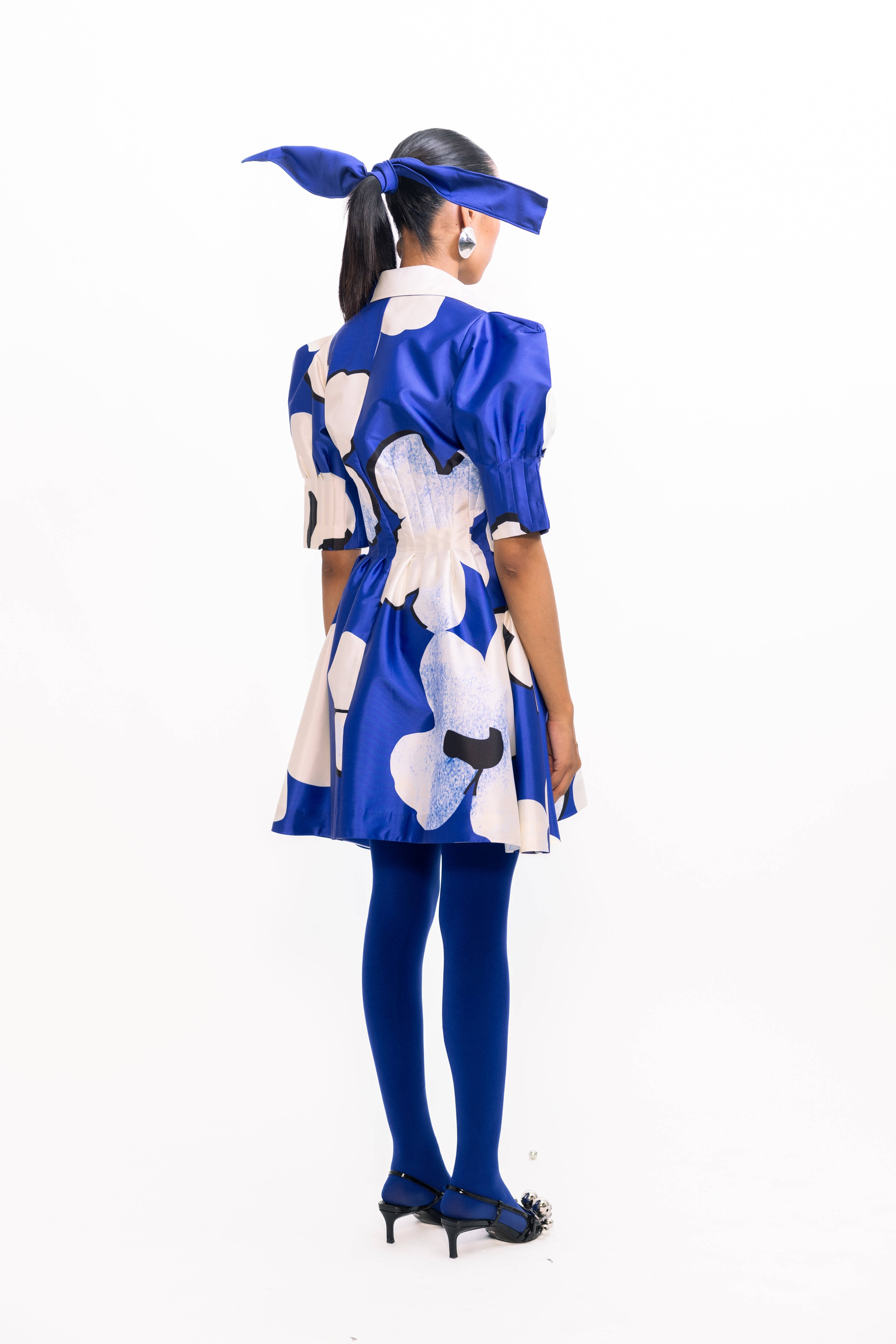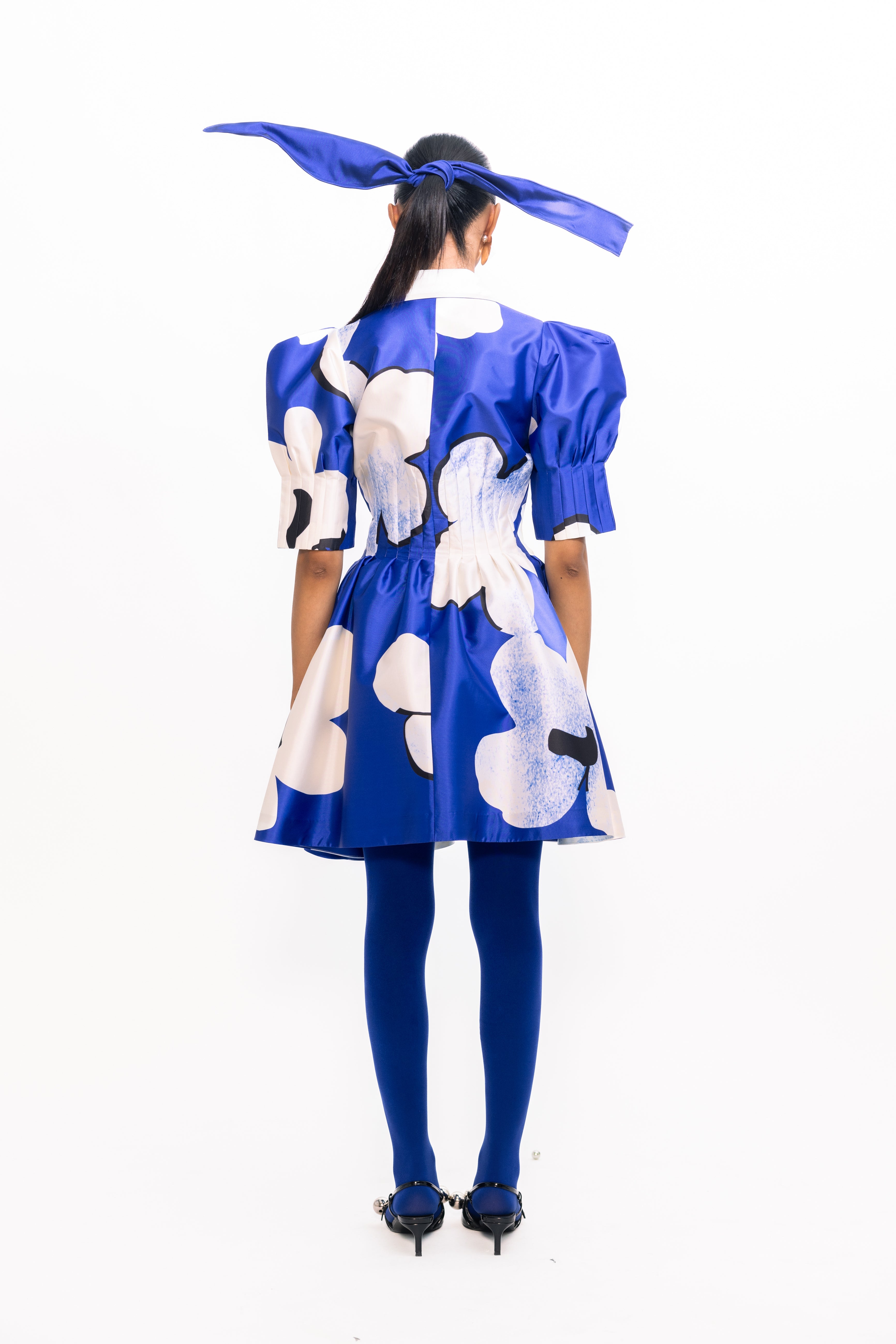 A bold silhouette softened by bloom-like detailing, this piece holds its shape with quiet drama. The sleeves lift gently, creating volume that contrasts with a closely darted bodice—structured, yet easy. The surface comes alive with vivid florals, scattered across a crisp, luminous base that catches light with every movement. Striking but not loud, it carries presence with refined confidence.